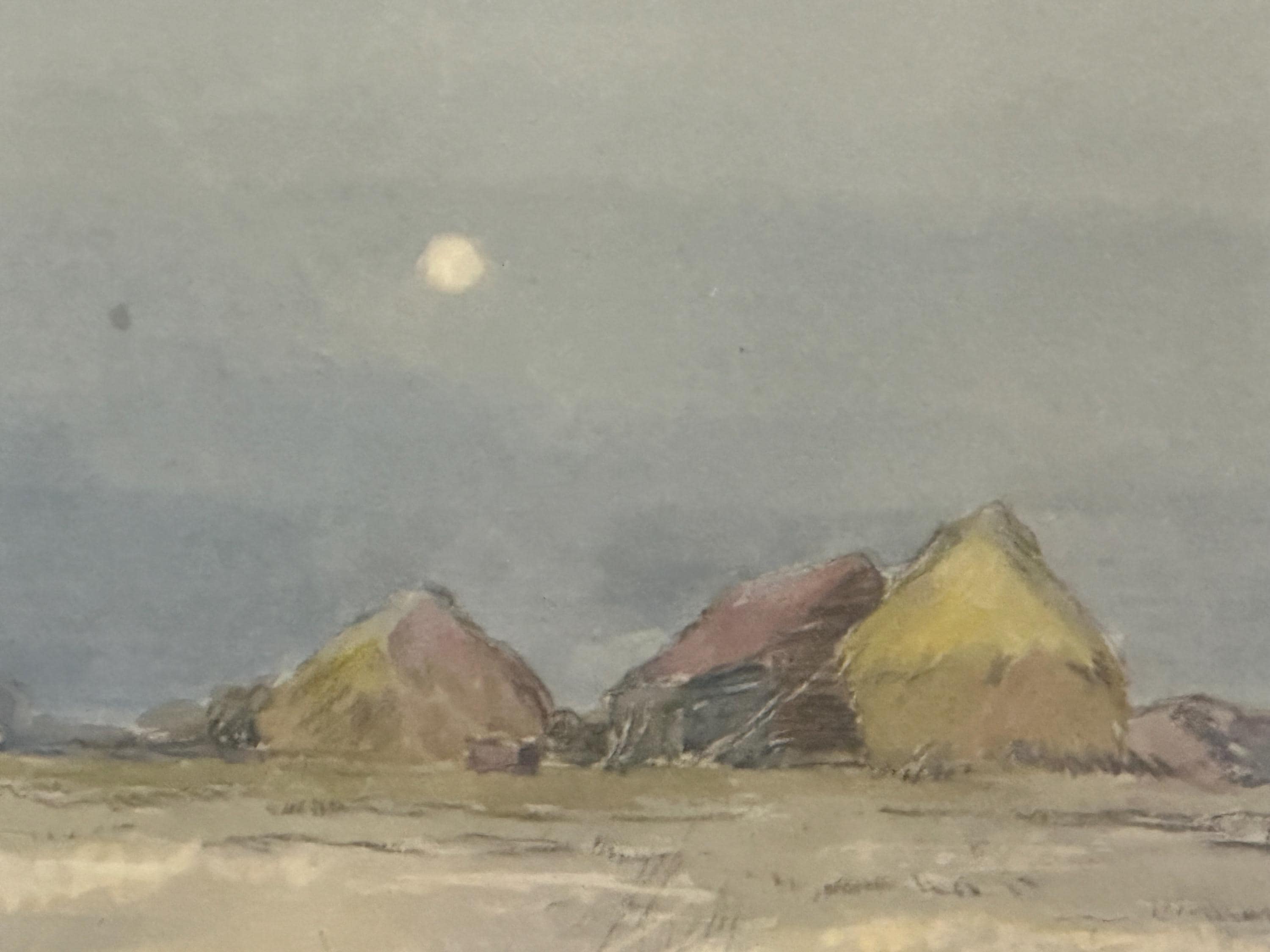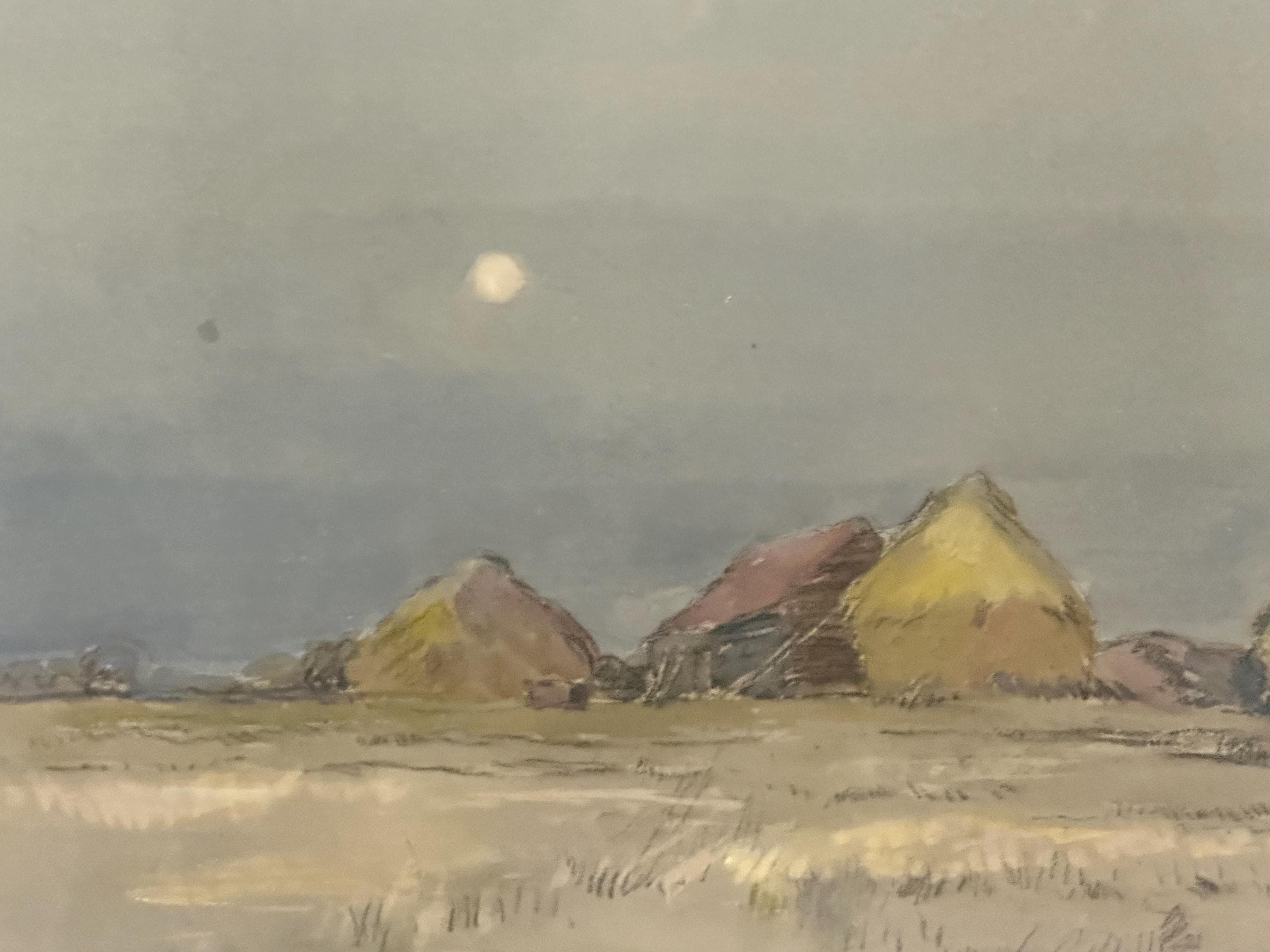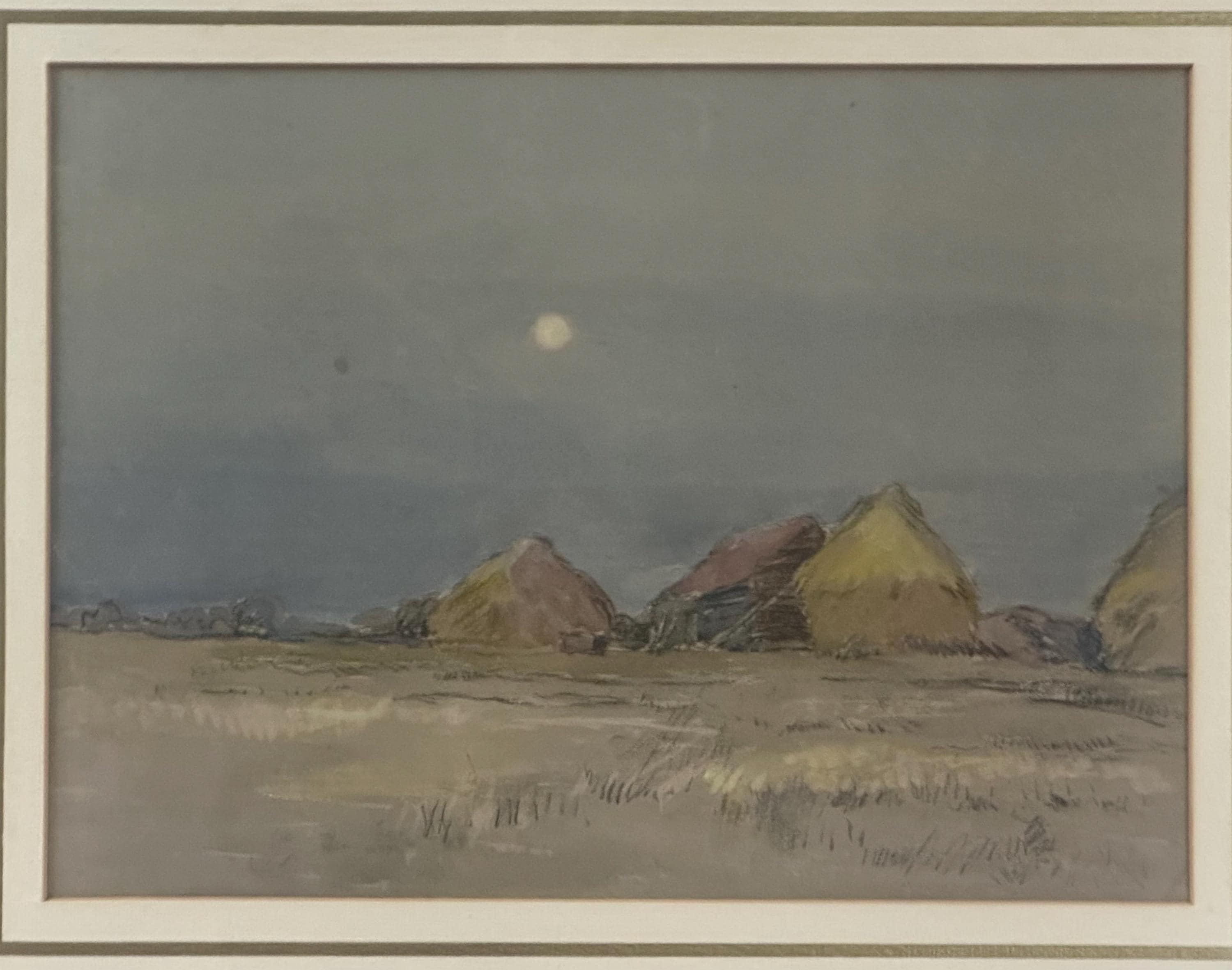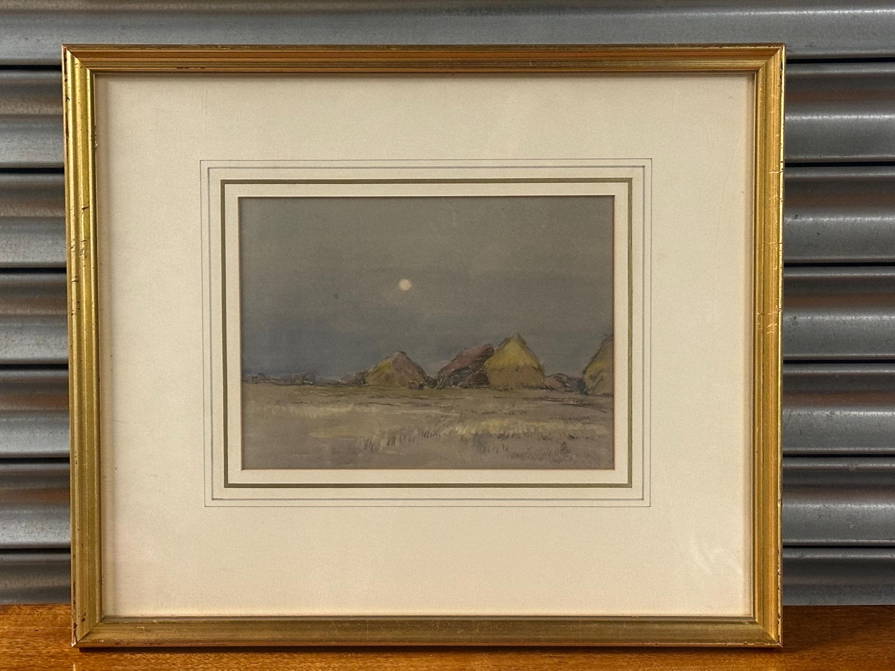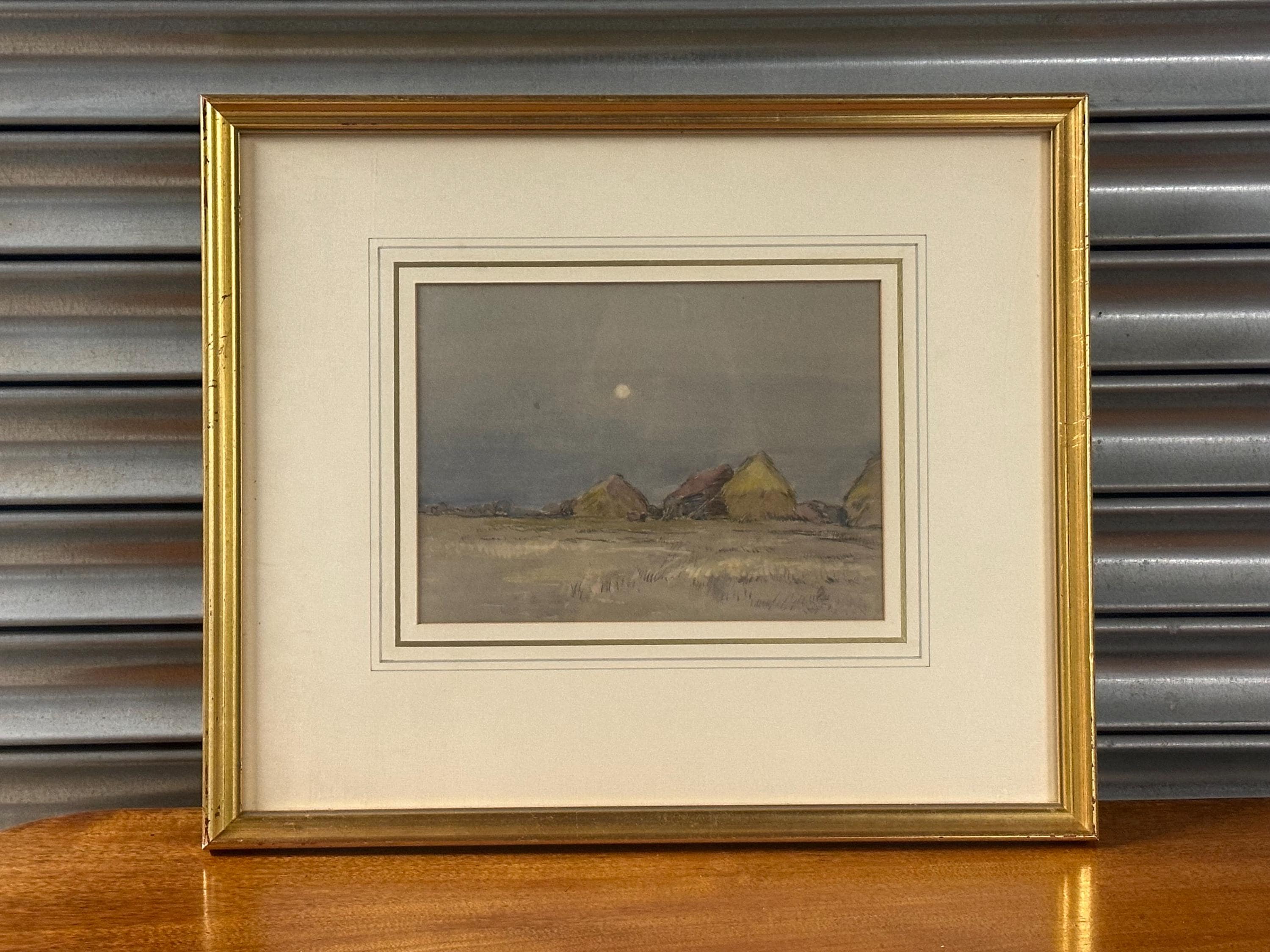 This beautiful original by Robert G. D. Alexander (1875–1945) shows Eagles Farm near Walton-on-the-Naze, with soft moonlight over the fields and farm buildings.