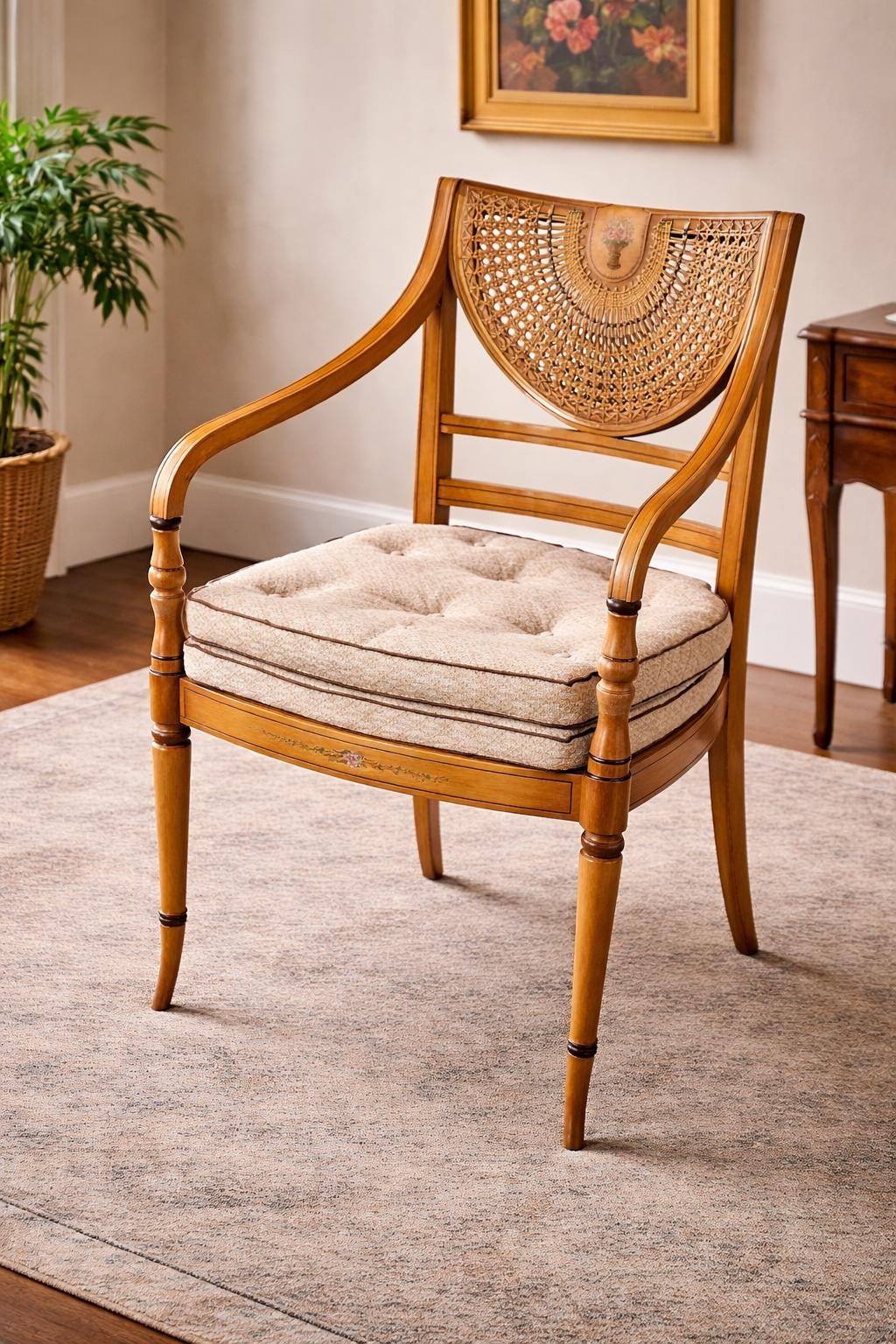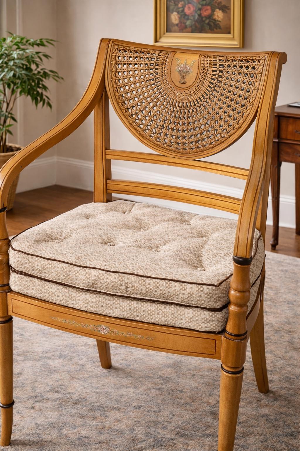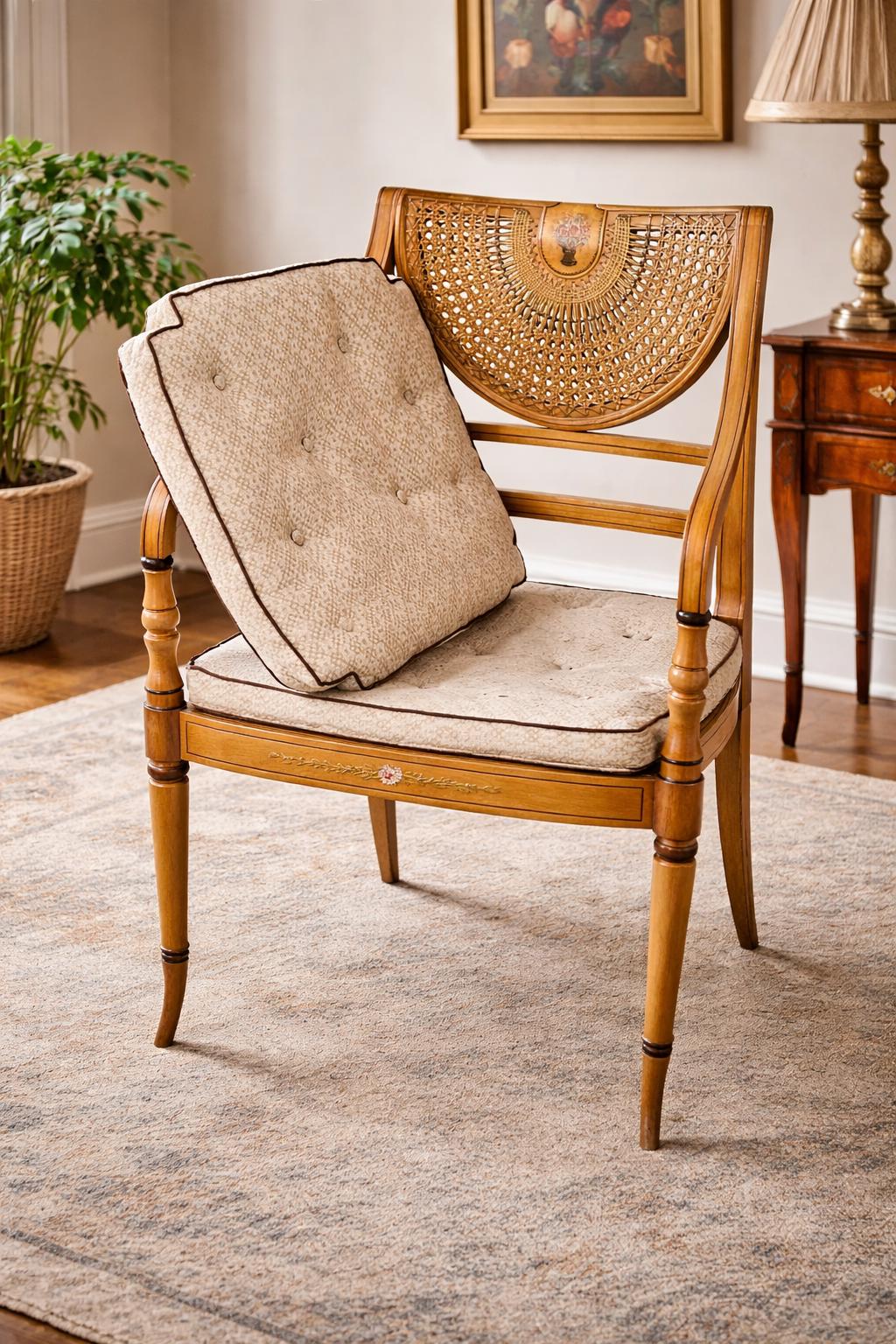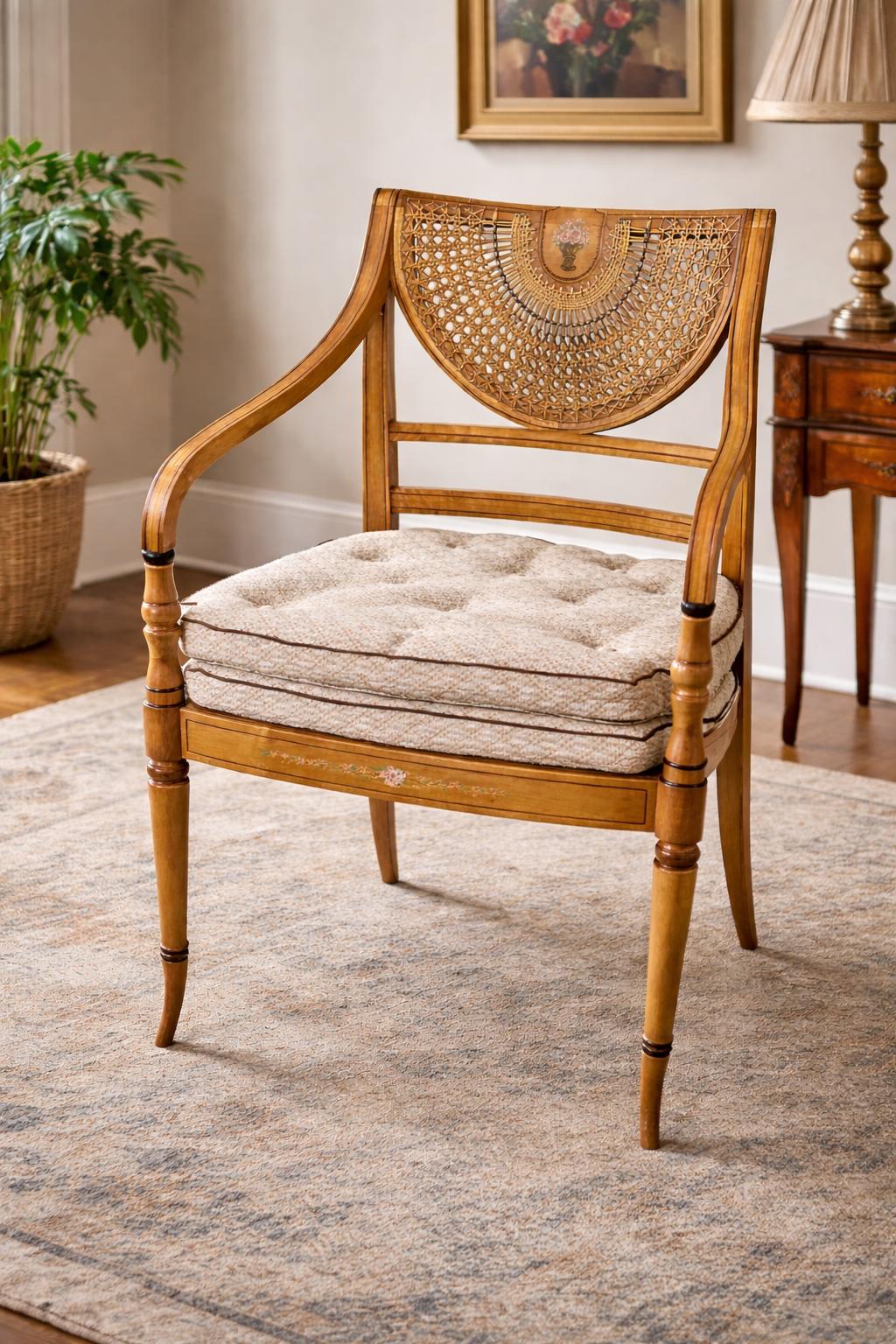 This attractive chair features a bergère (caned) back, finely woven in a decorative lattice pattern, centred with a shaped panel displaying a painted floral urn motif—a classic nod to Regency neoclassical design.
