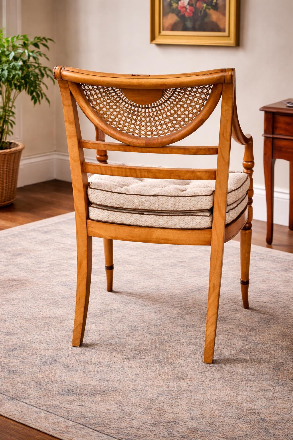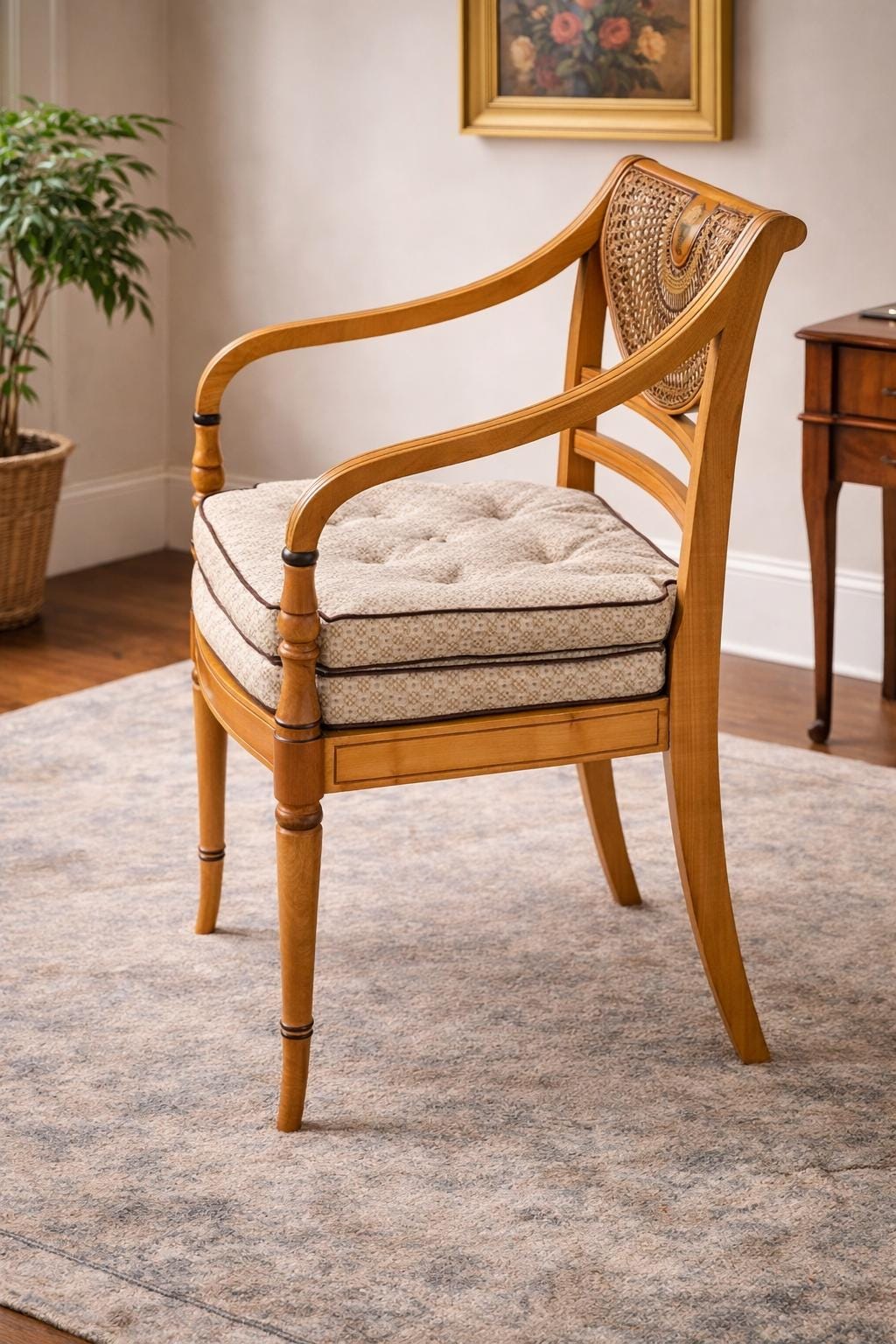 Finished in a warm satinwood-style tone, the chair has a bright and elegant presence.