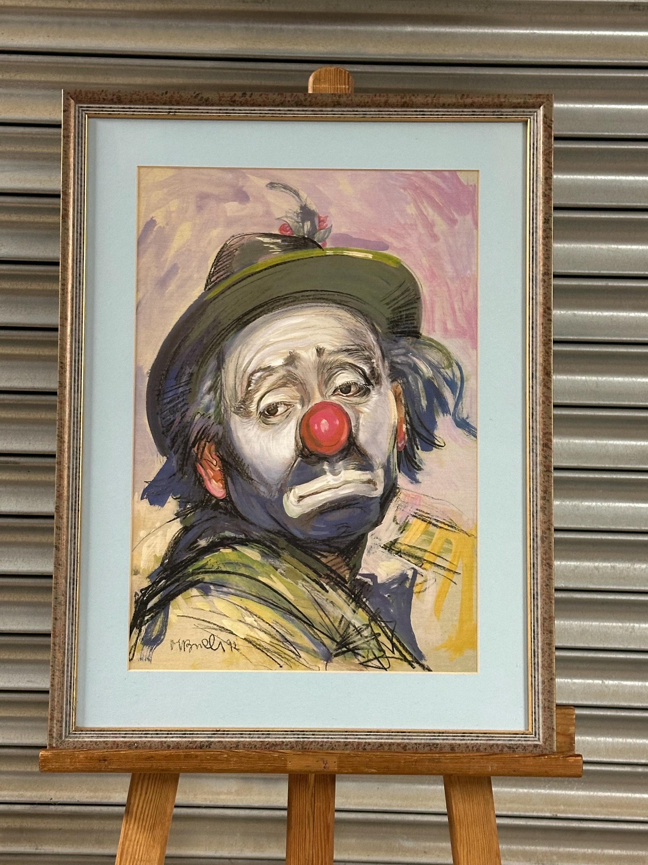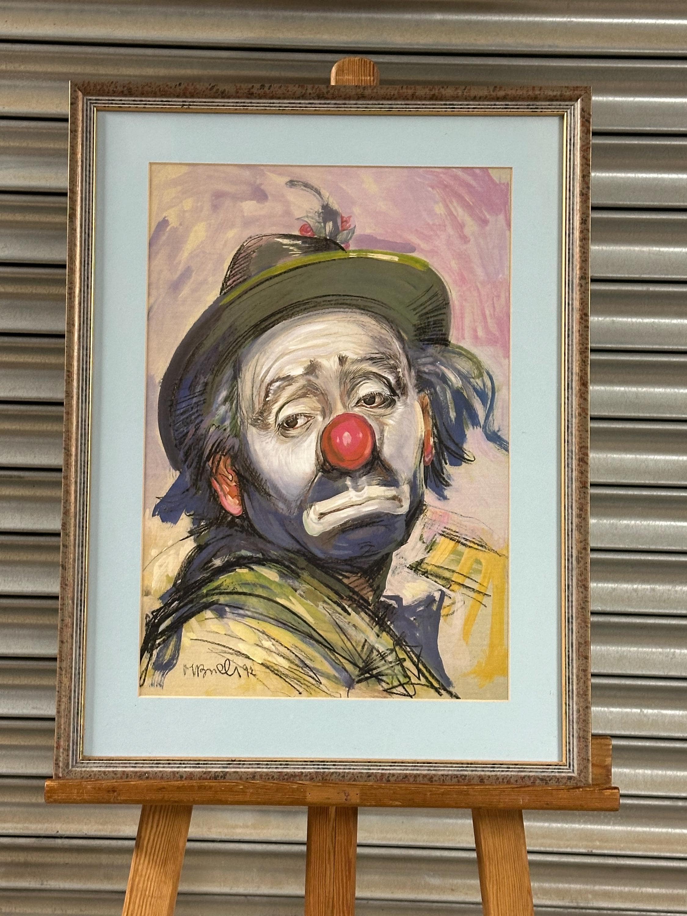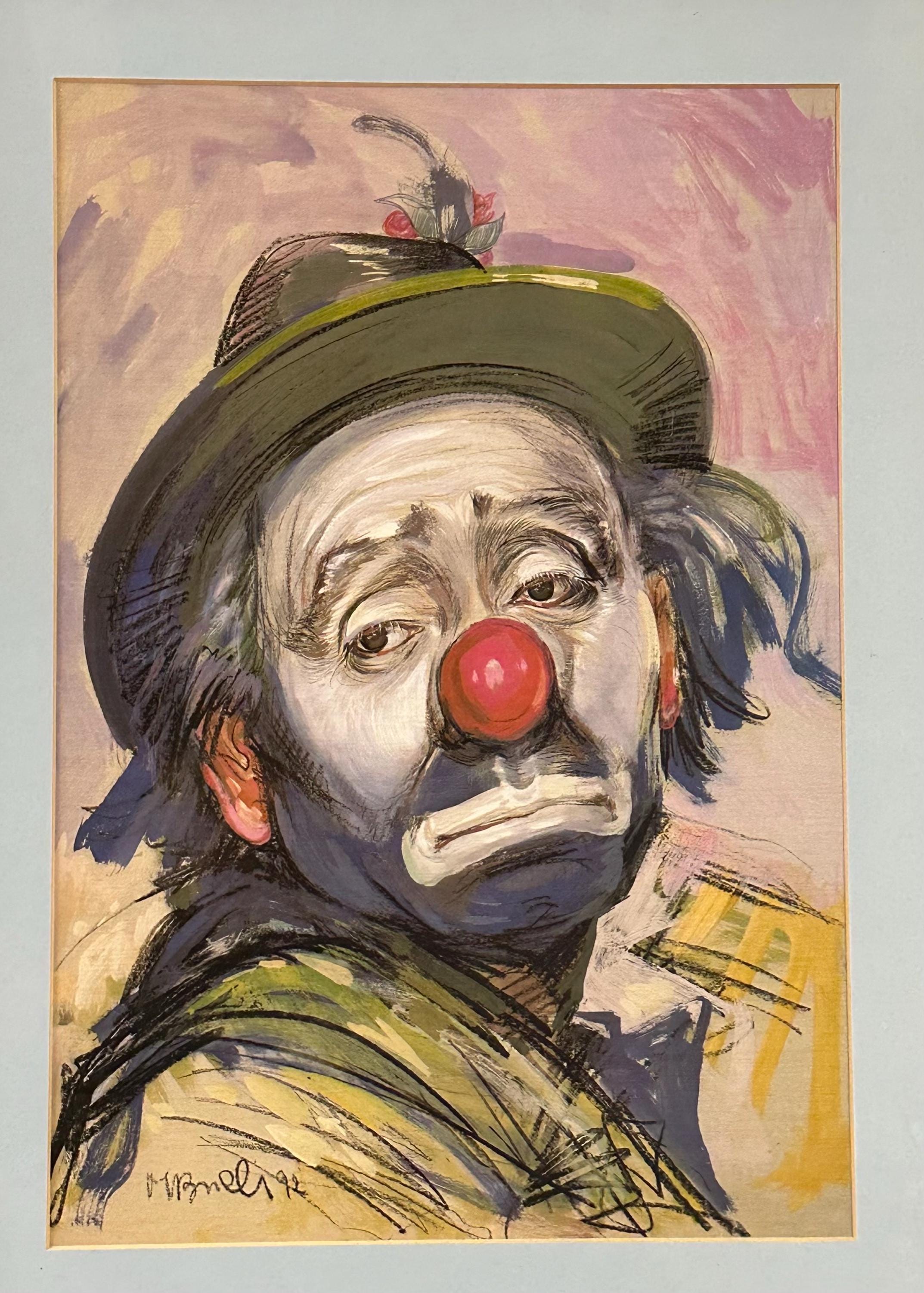 otion, using soft brushwork and a muted yet atmospheric colour palette. The faces of her clowns are typically introspective—sometimes joyful, but more often tinged with sadness—reflecting the traditional “Pierrot” influence seen in classic Italian and French art.