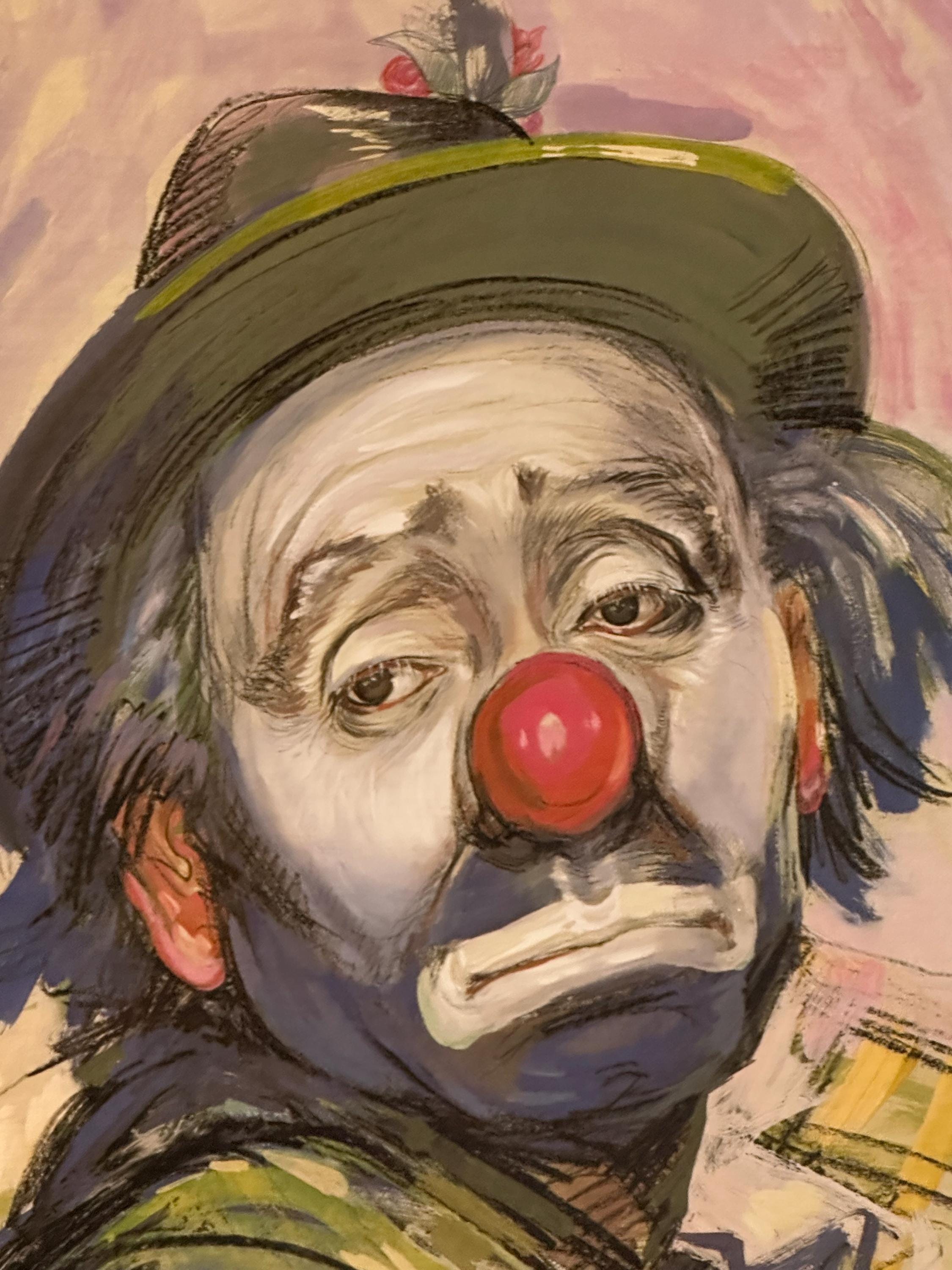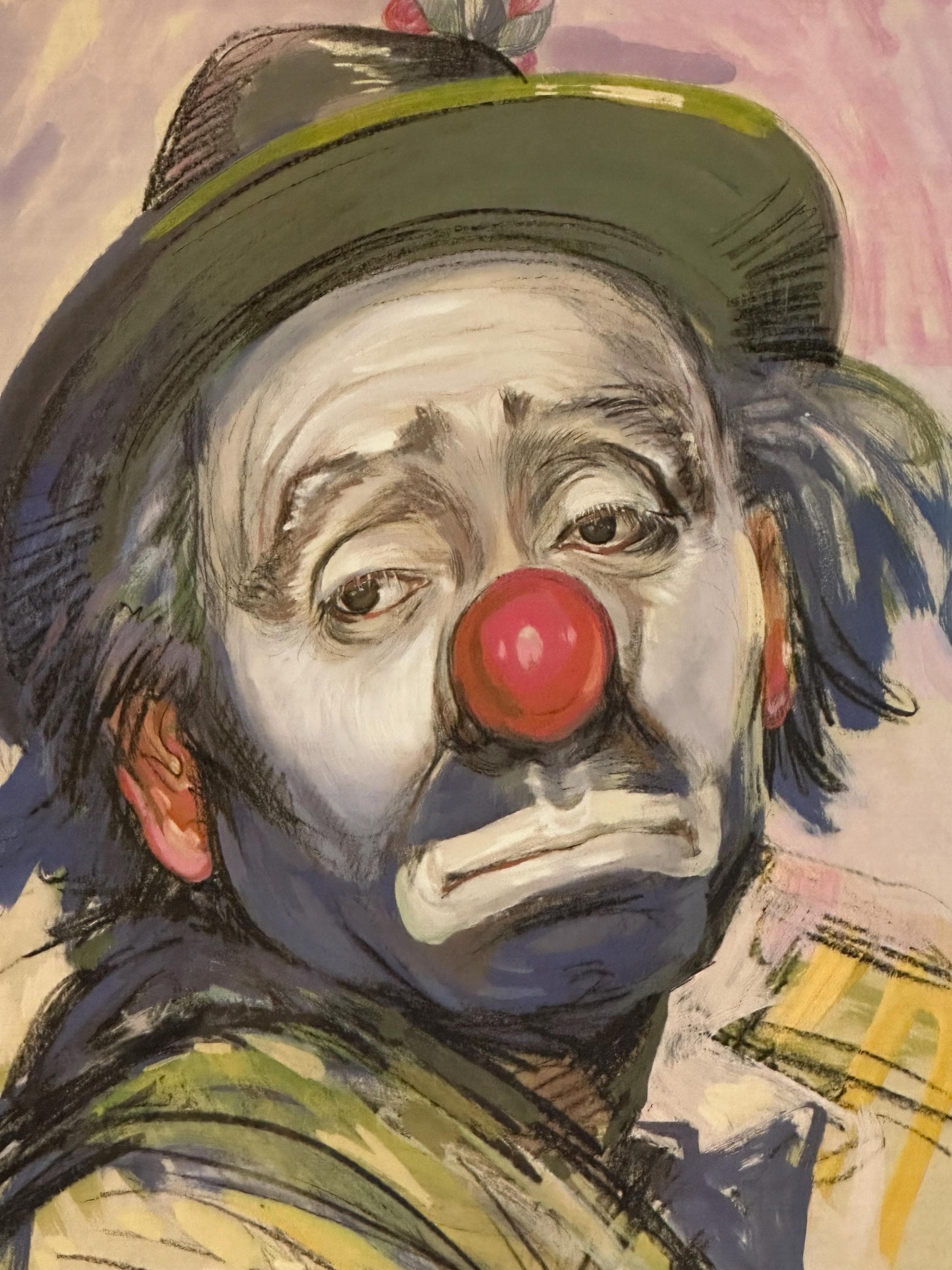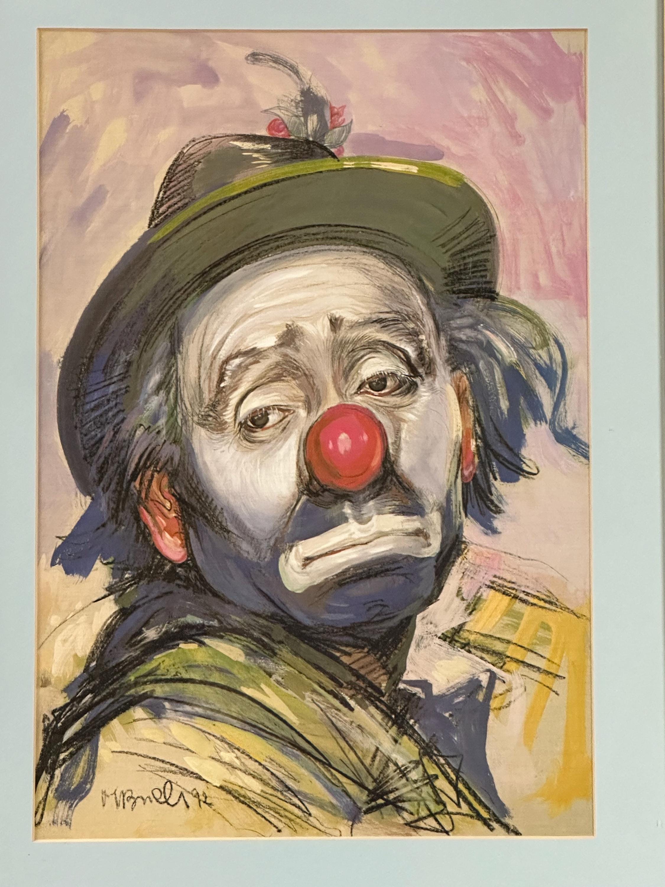 otion, using soft brushwork and a muted yet atmospheric colour palette. The faces of her clowns are typically introspective—sometimes joyful, but more often tinged with sadness—reflecting the traditional “Pierrot” influence seen in classic Italian and French art.