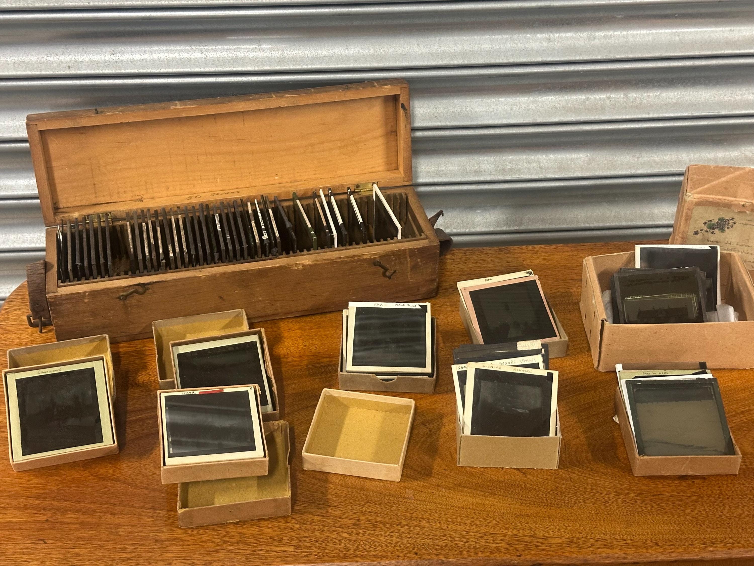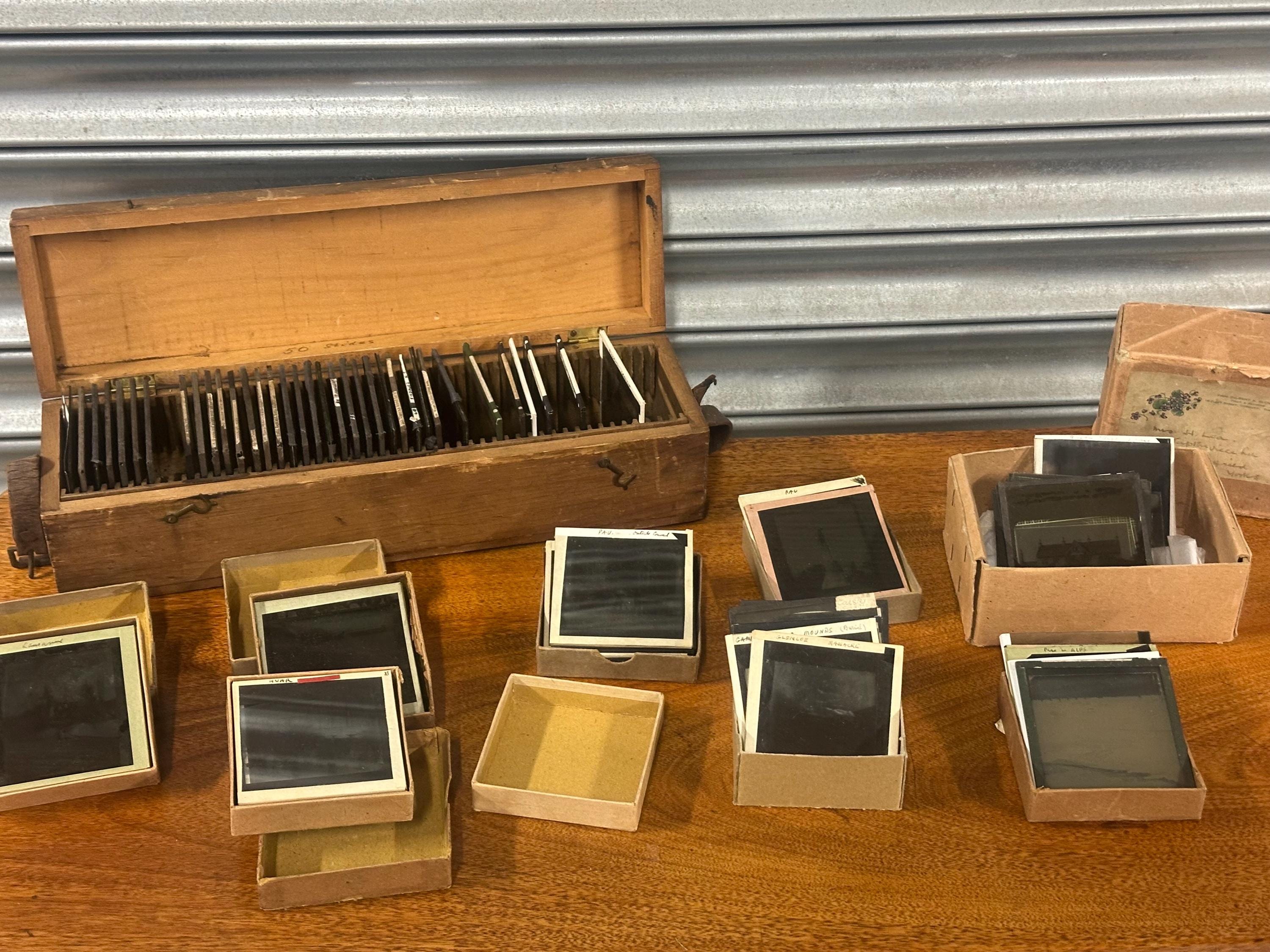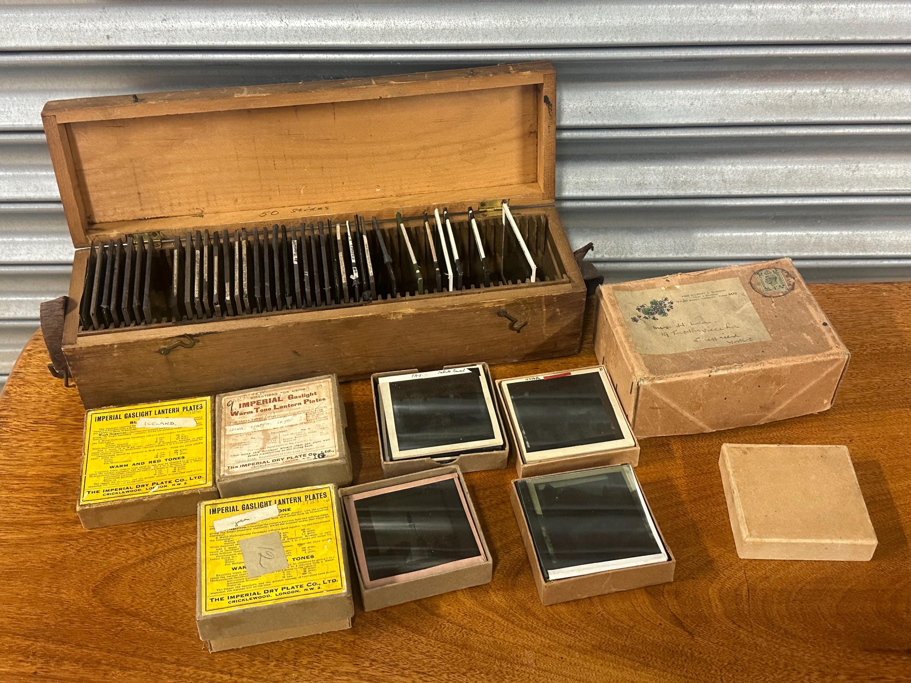 A rare and highly collectible collection of antique gaslight / magic lantern slides, dating to the 19th century / early photographic era, comprising 100+ glass slides housed in an original wooden storage box along with additional boxed examples.
