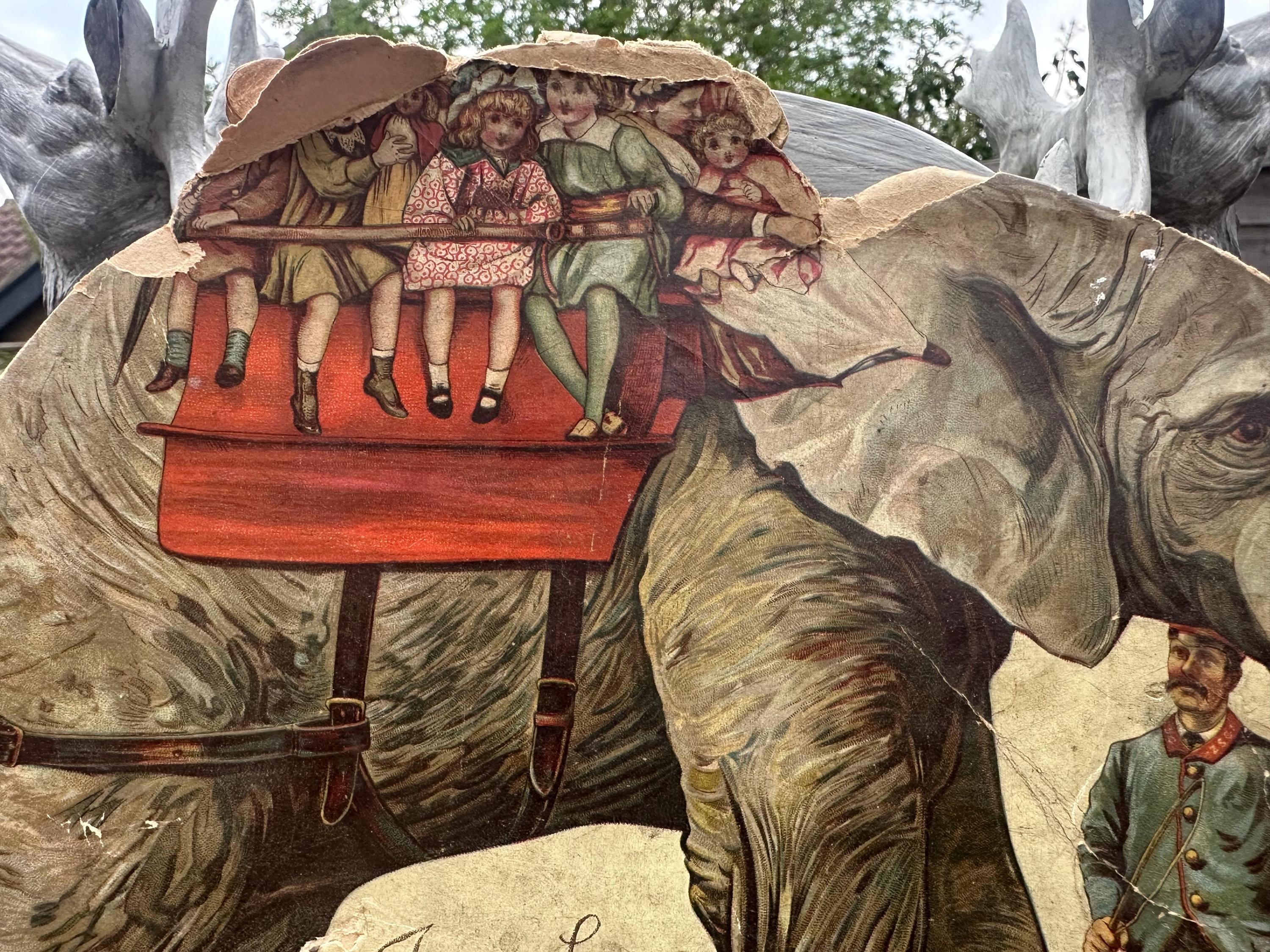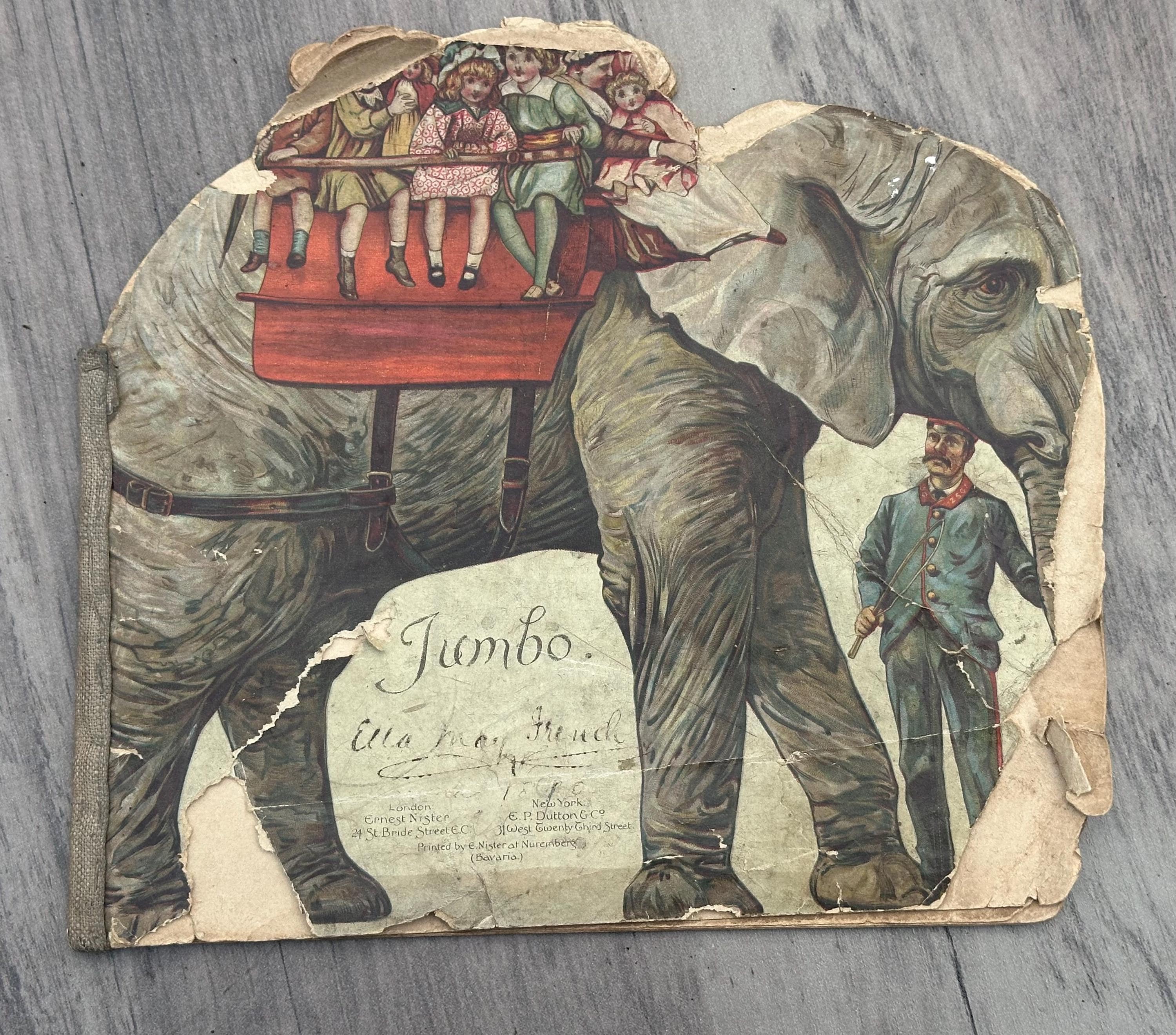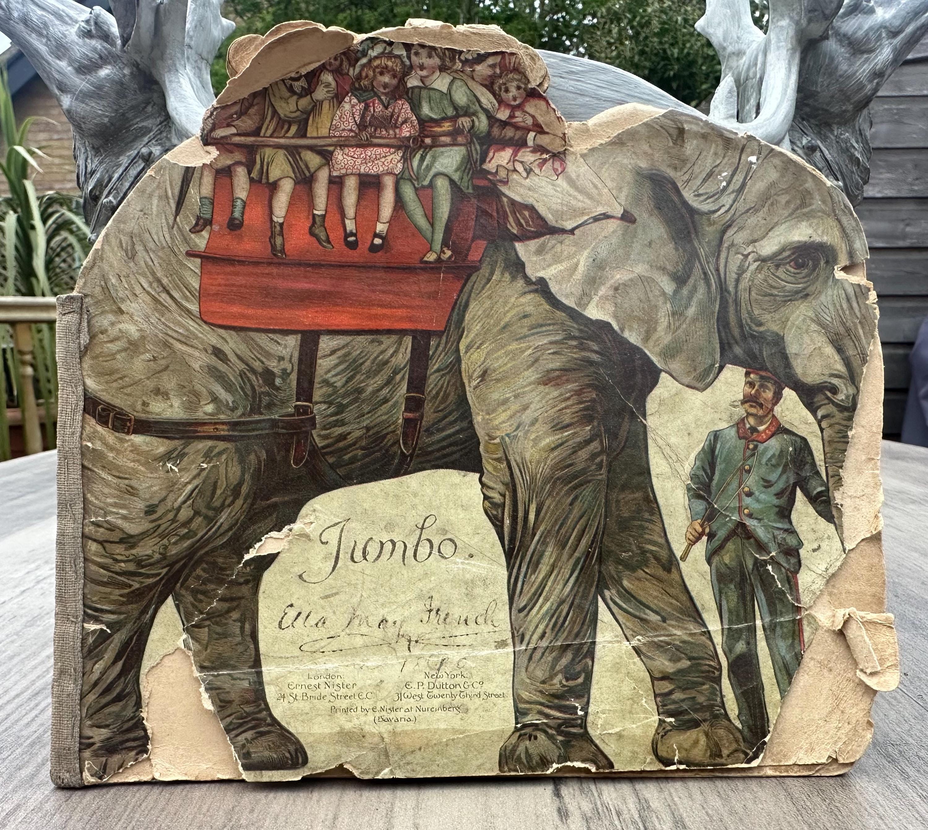A charming and rare antique children’s illustrated piece published by the renowned Ernest Nister, featuring the much-loved character “Jumbo” the elephant.