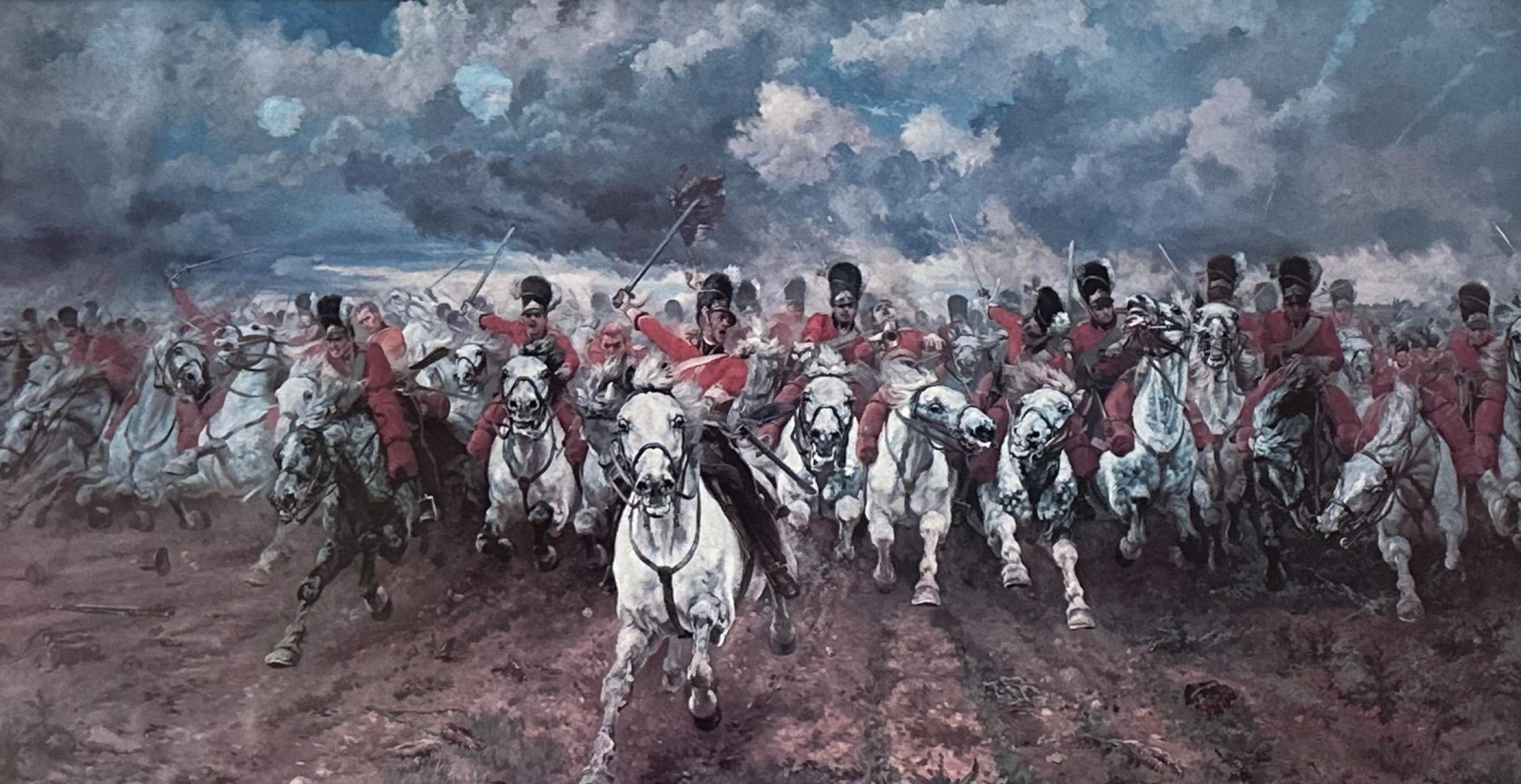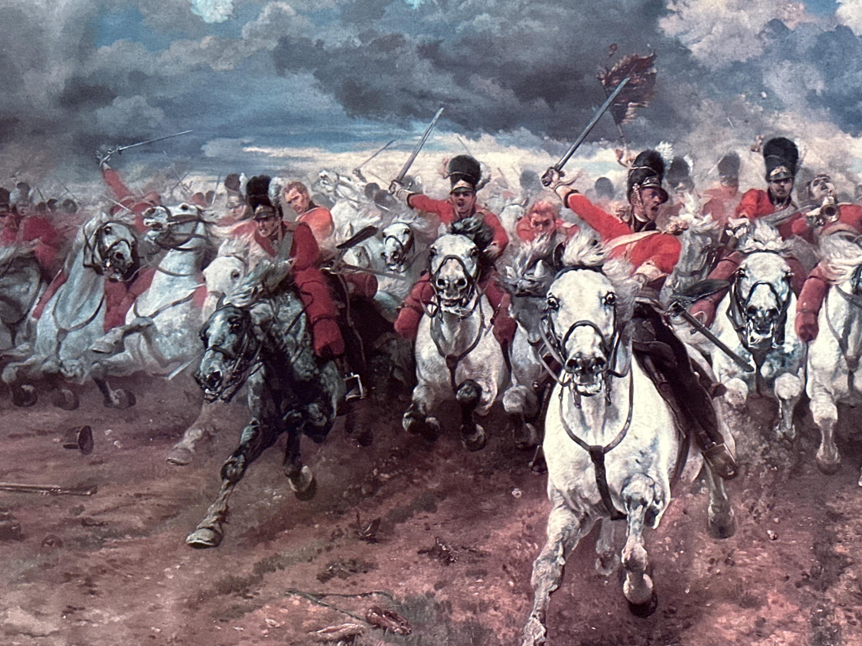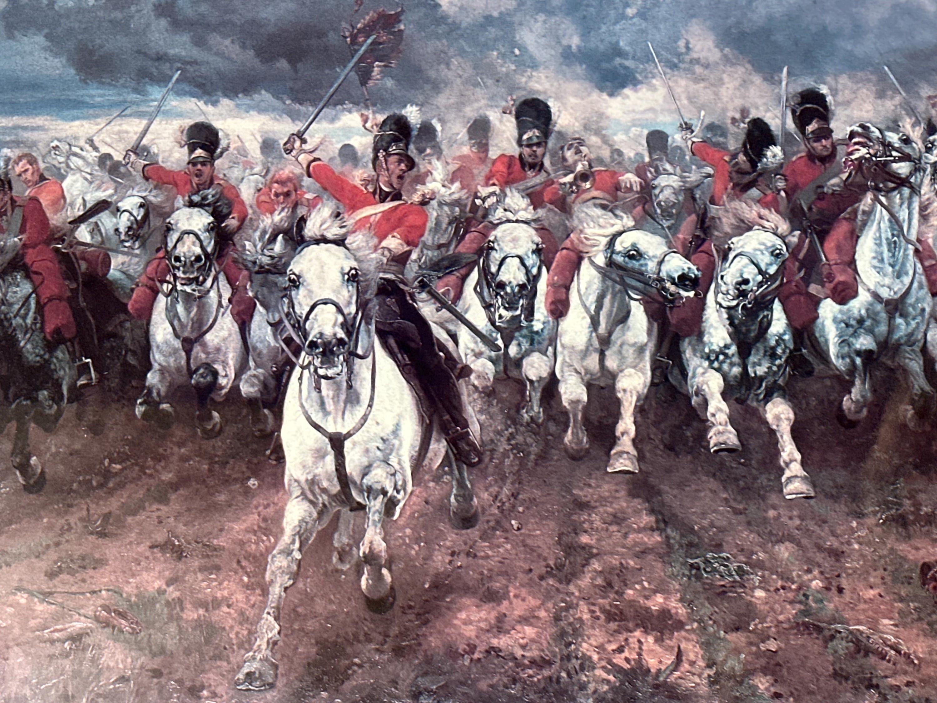 The powerful perspective—horses charging directly toward the viewer—creates a sense of immediacy and intensity, making this one of the most celebrated military images ever produced. The original oil painting is widely regarded as an iconic representation of courage and heroism in battle