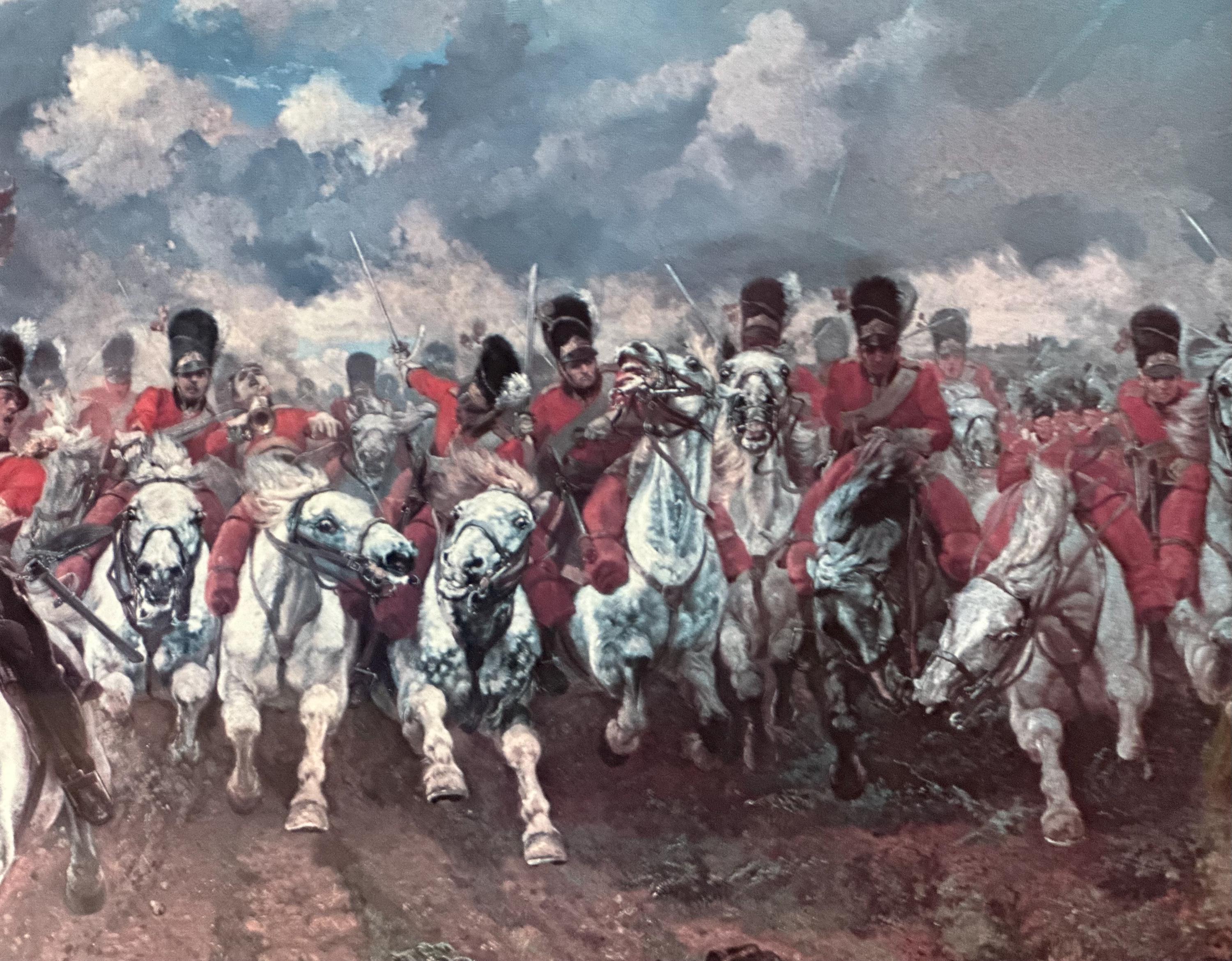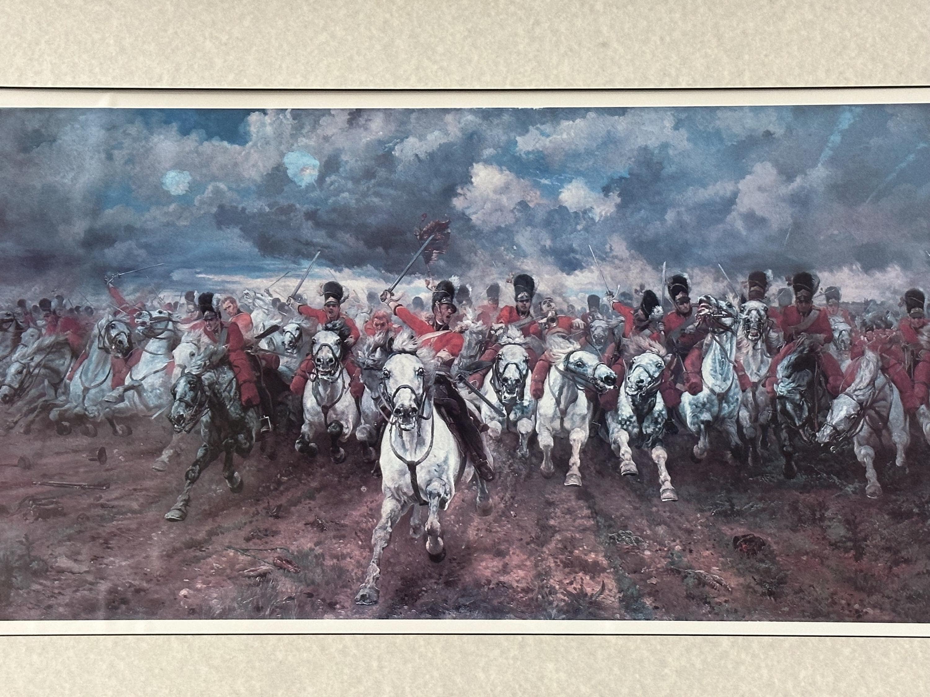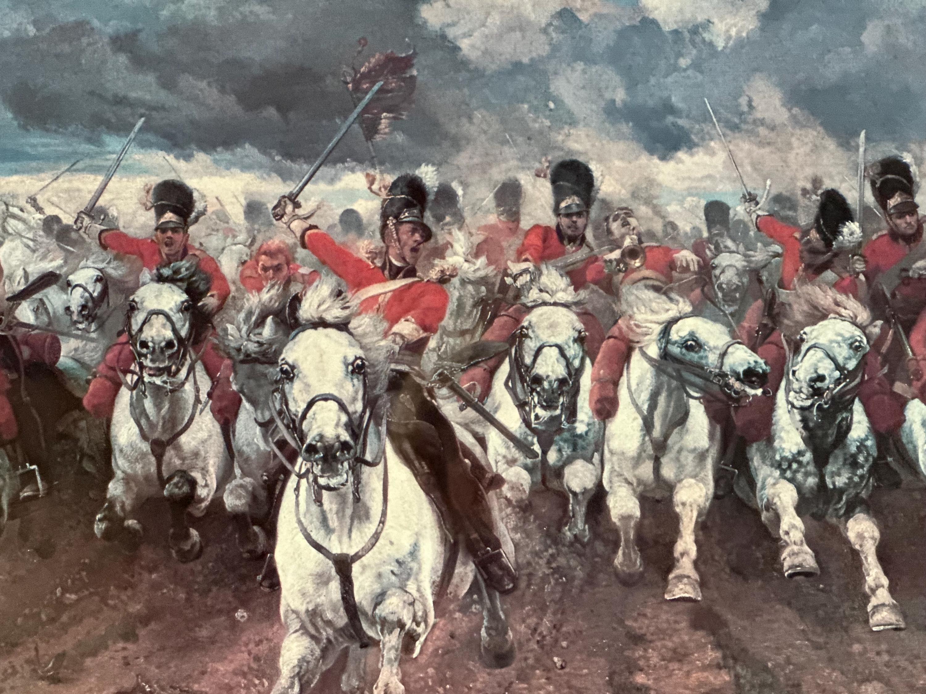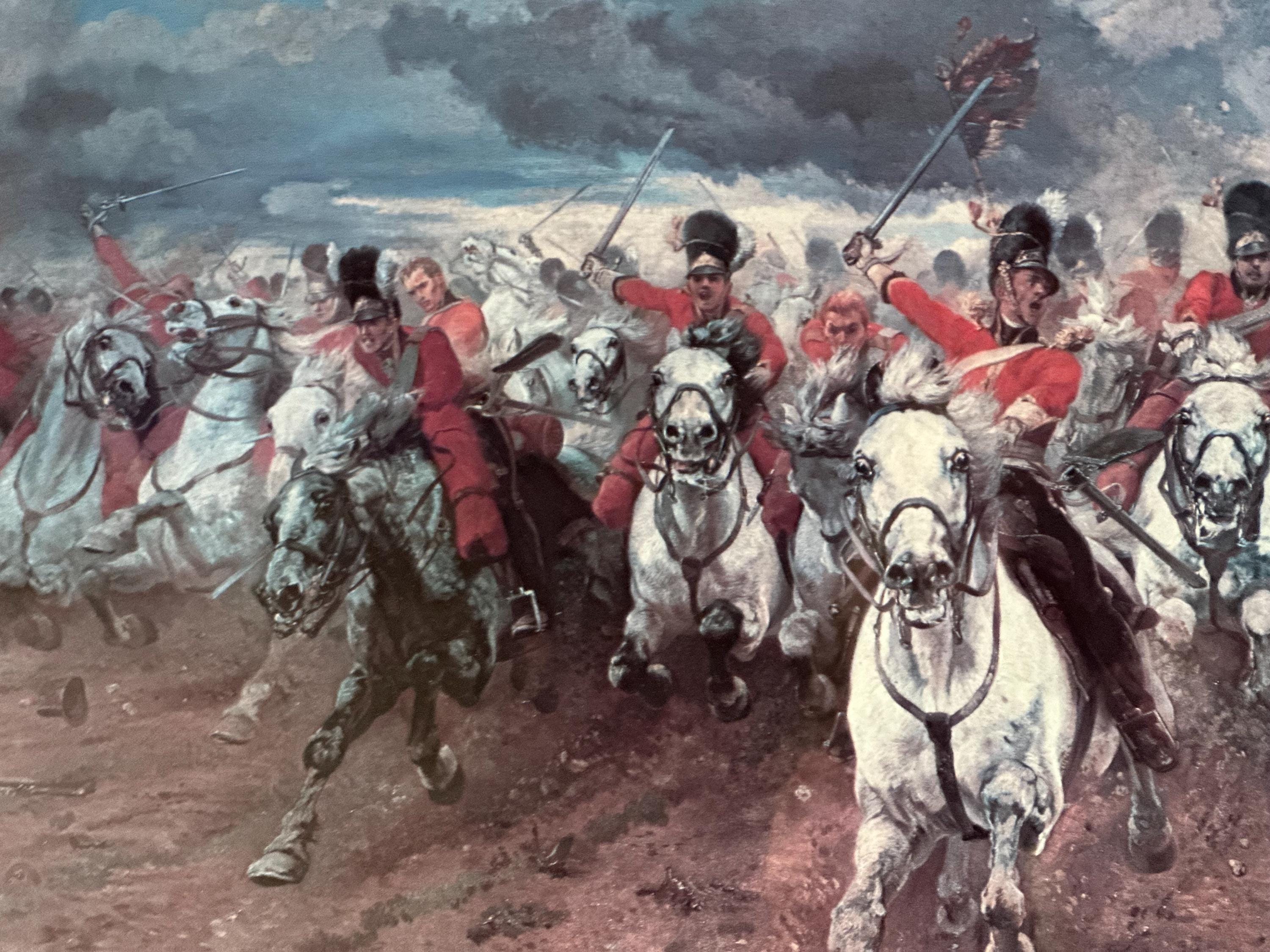 The powerful perspective—horses charging directly toward the viewer—creates a sense of immediacy and intensity, making this one of the most celebrated military images ever produced. The original oil painting is widely regarded as an iconic representation of courage and heroism in battle