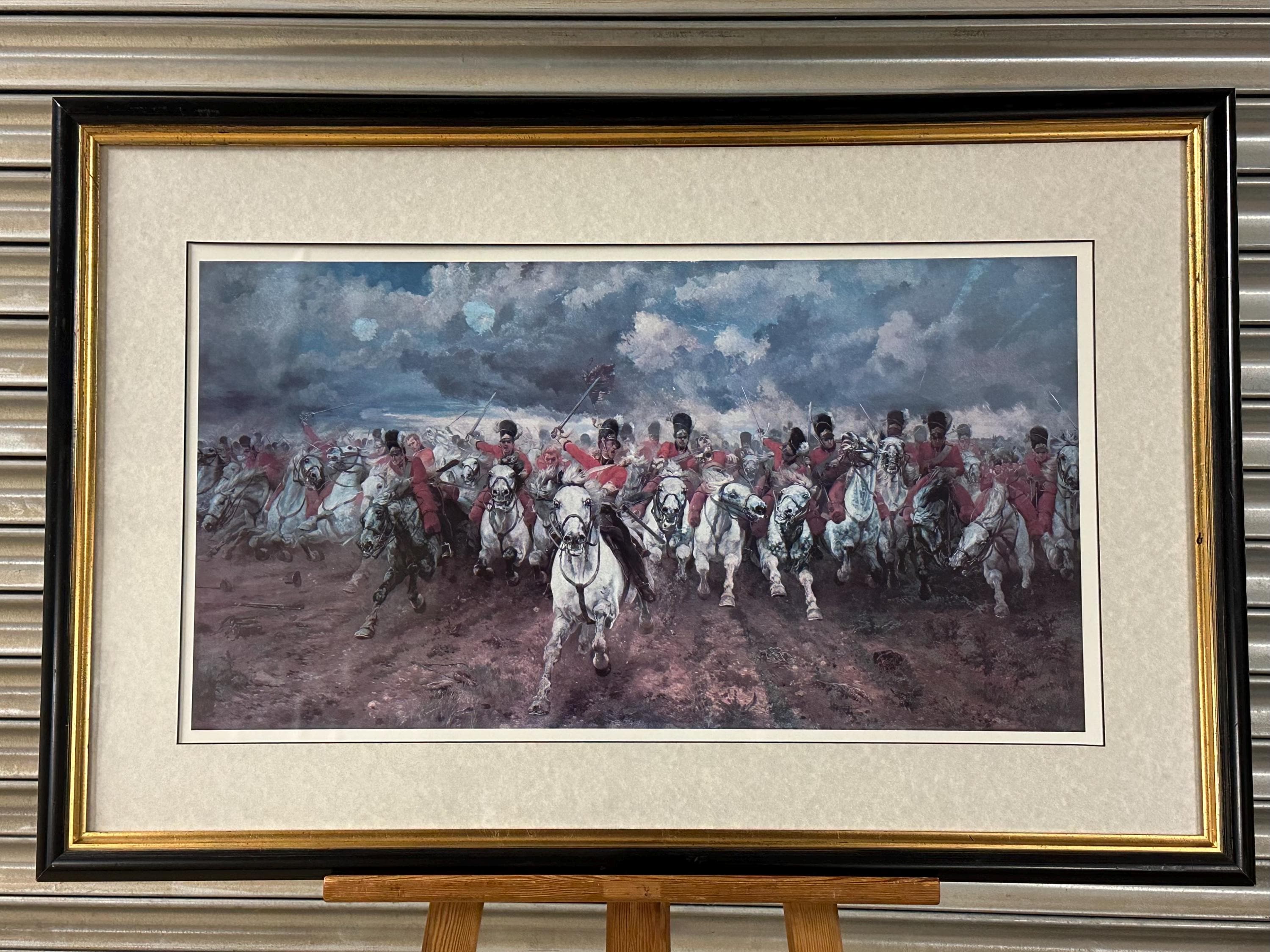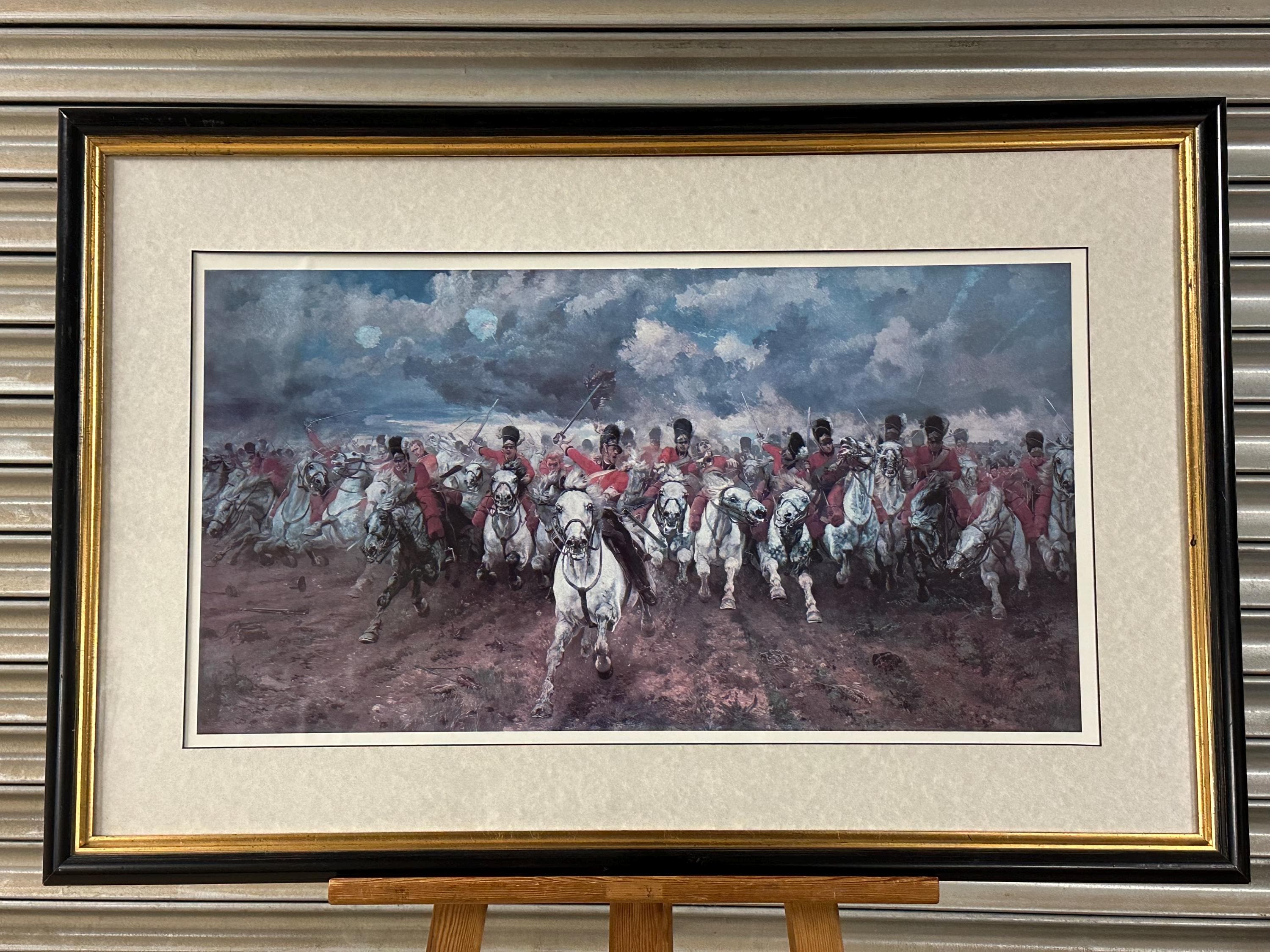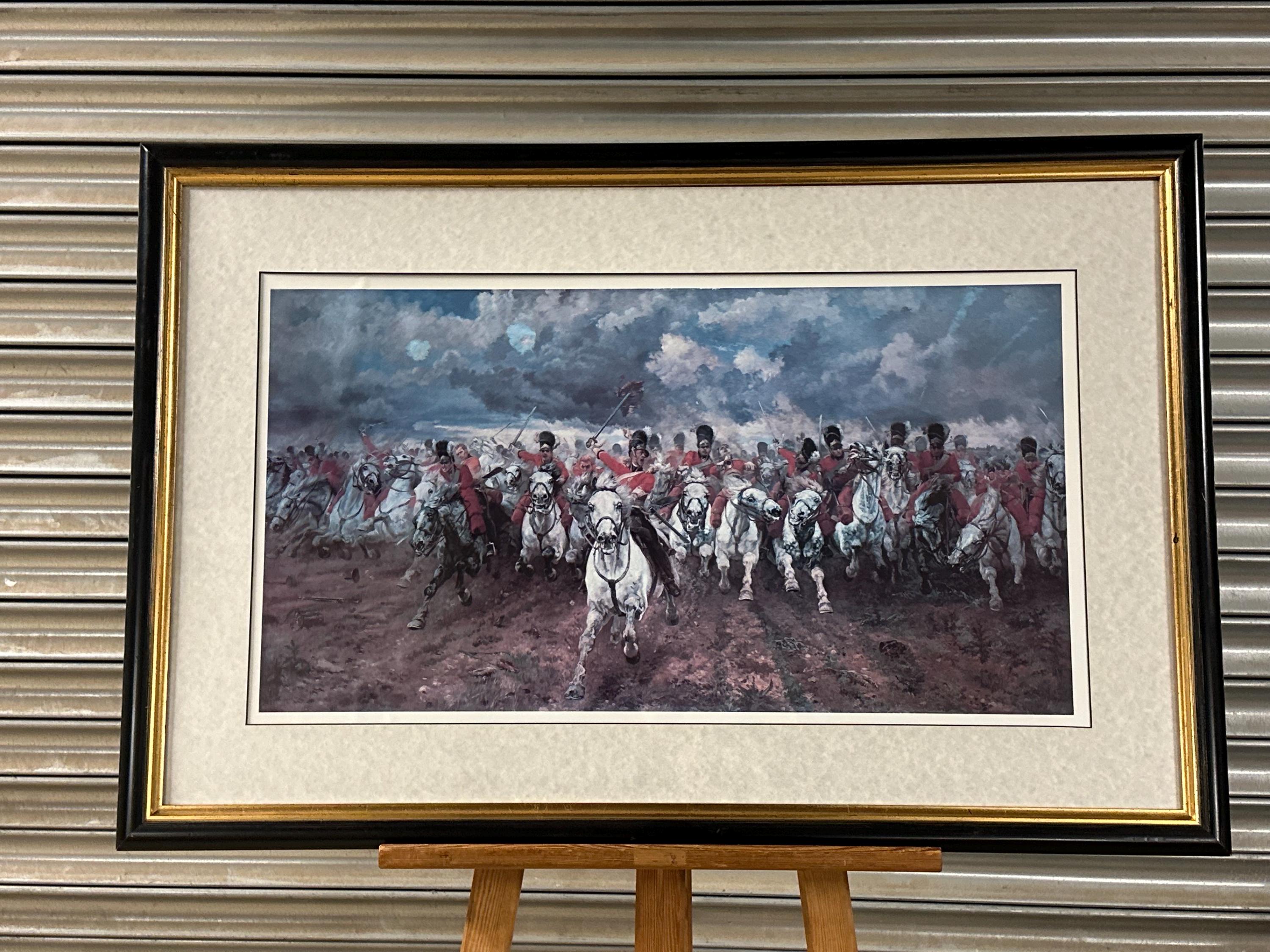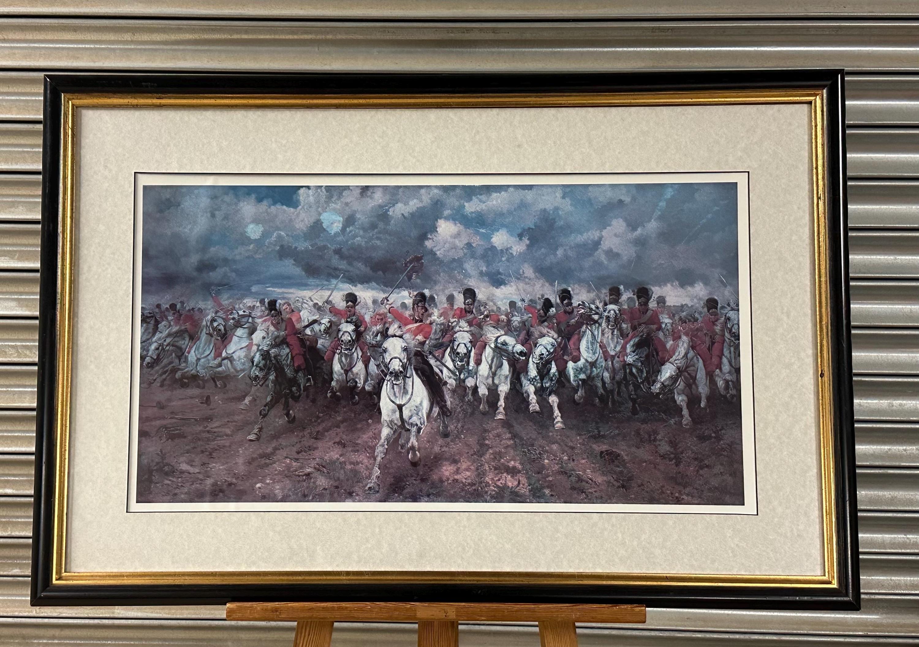 A striking and iconic military artwork, this framed and glazed print depicts “Scotland Forever!”, originally painted in 1881 by Lady Elizabeth Thompson (later Lady Butler).