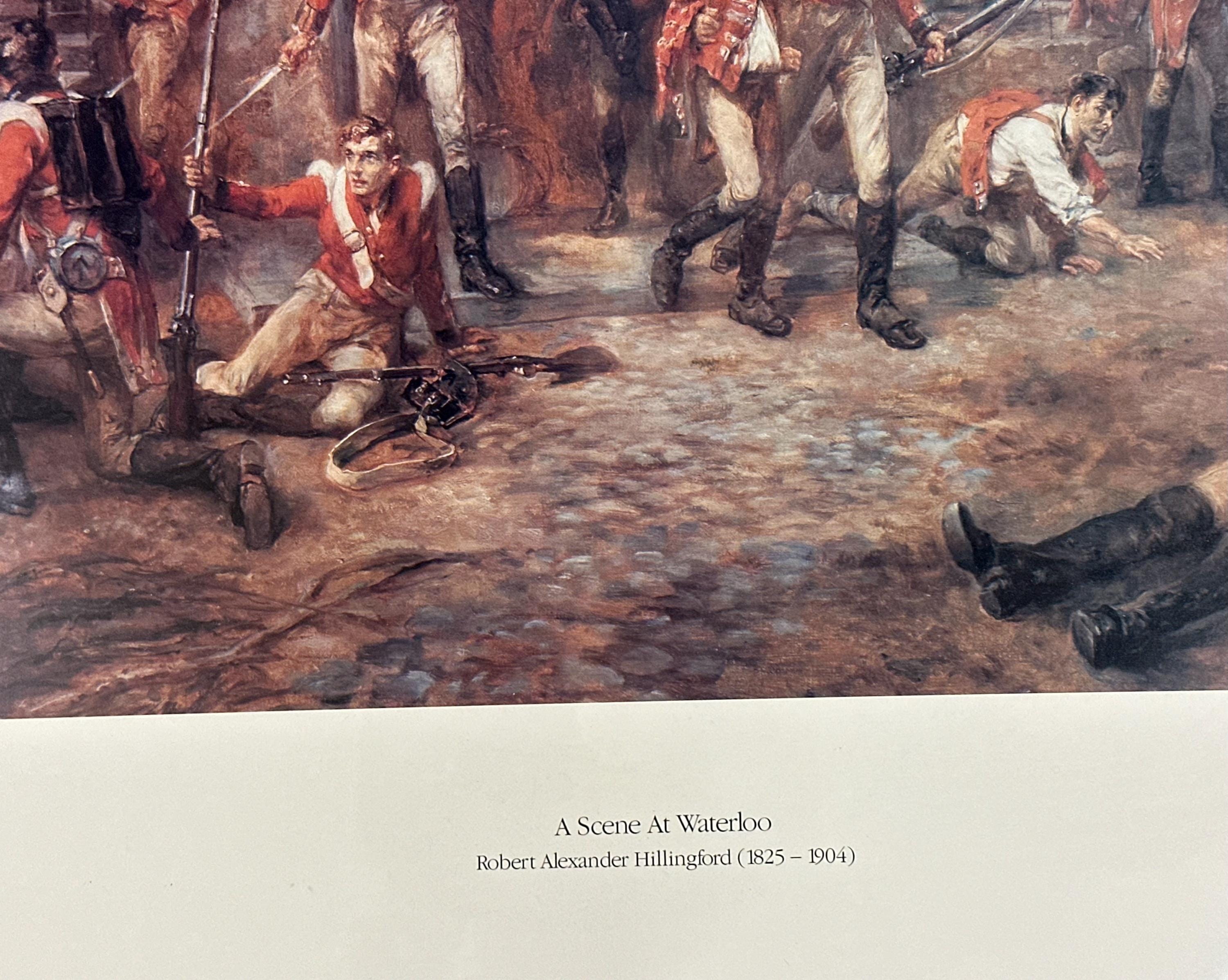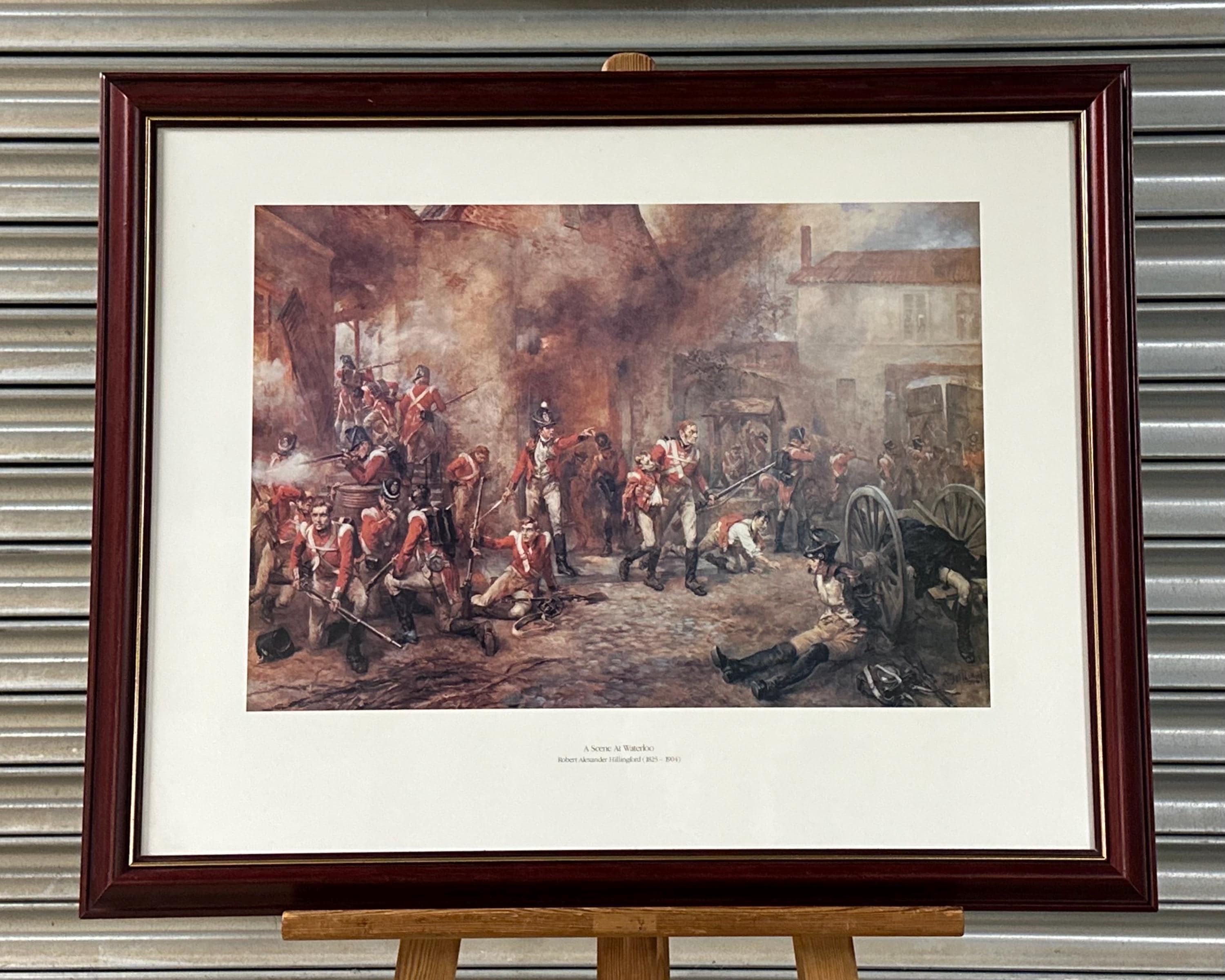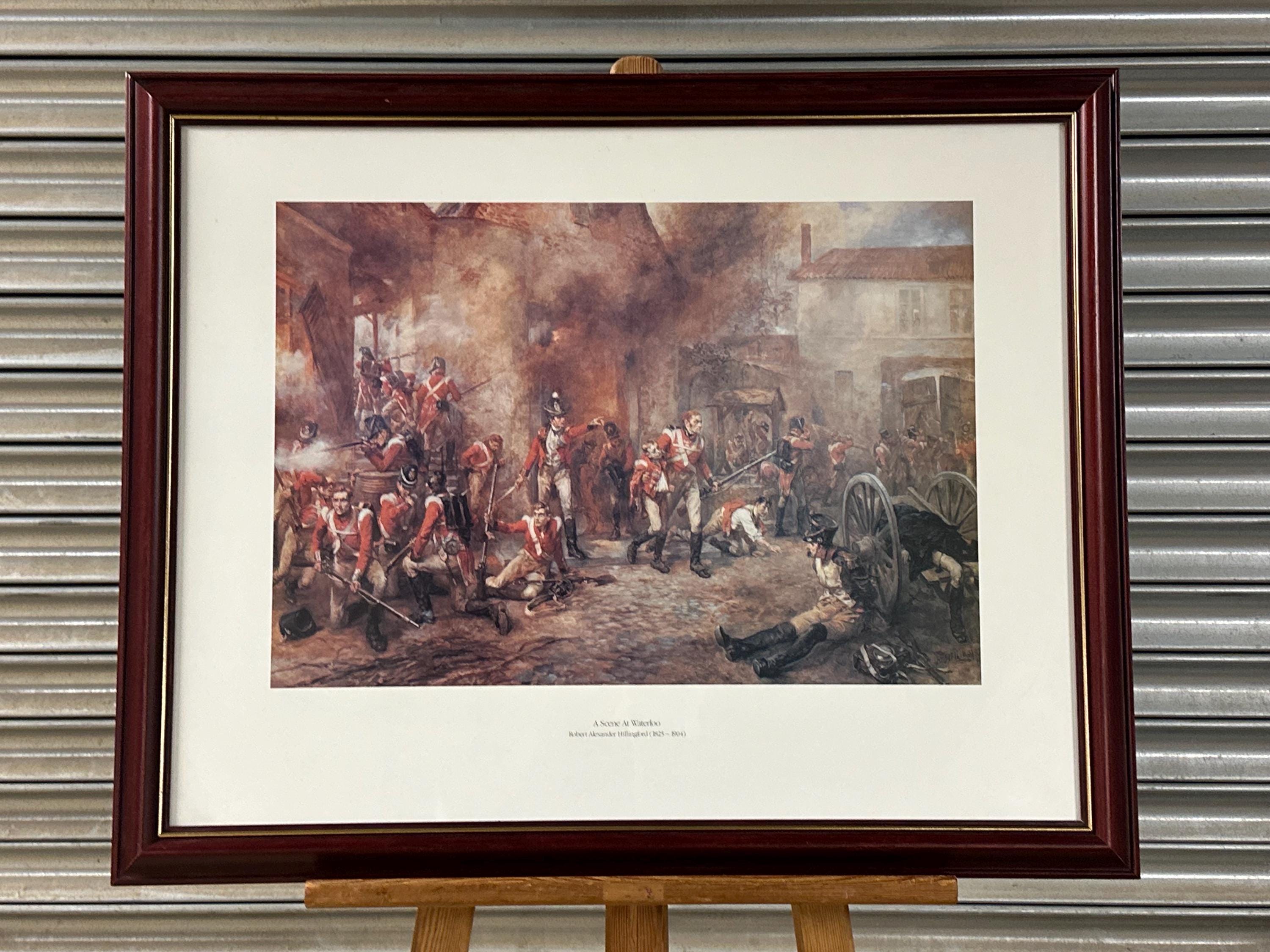 Striking framed print titled “A Scene at Waterloo” after the work of noted British military artist Robert Alexander Hillingford (1825–1904).