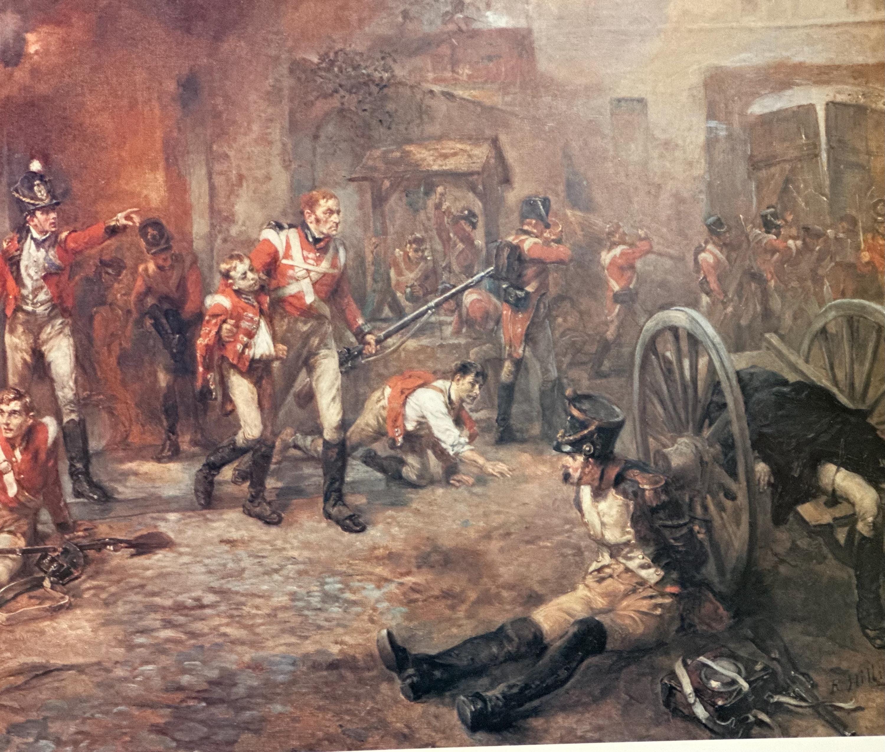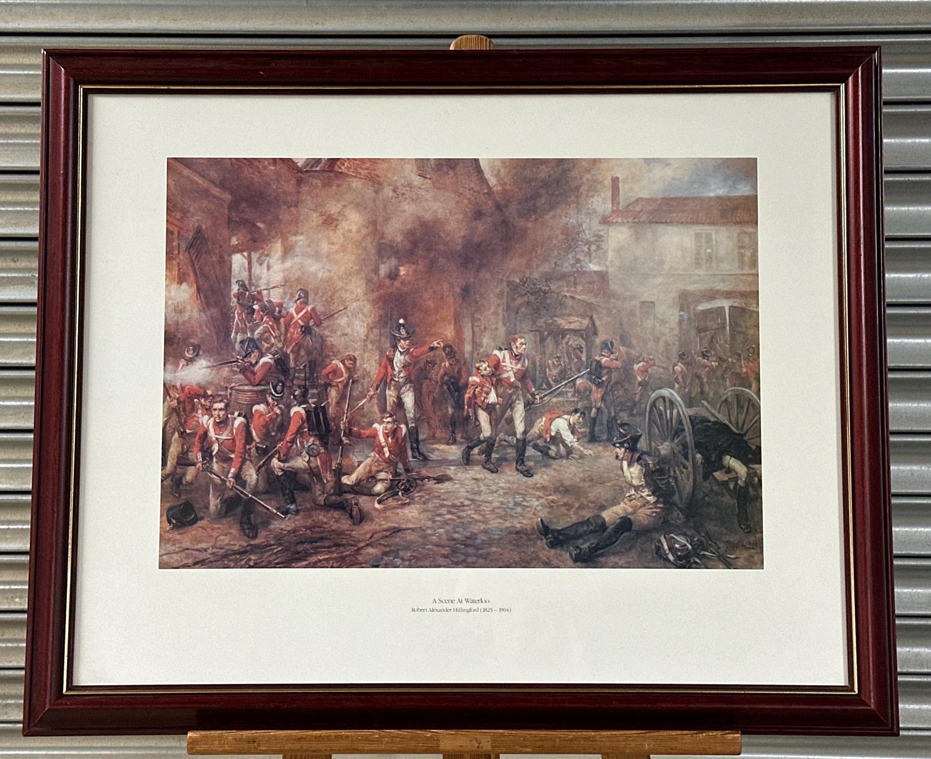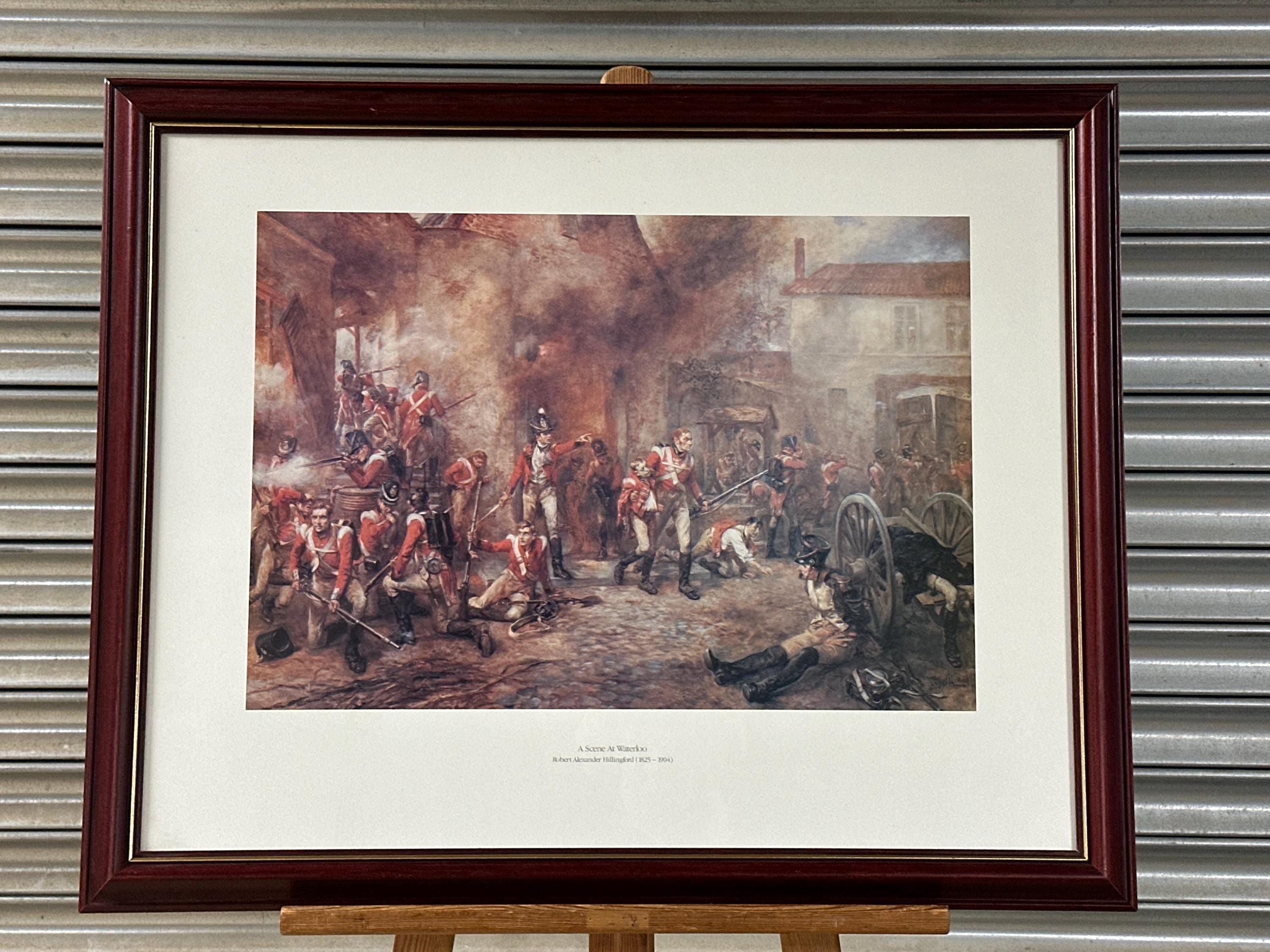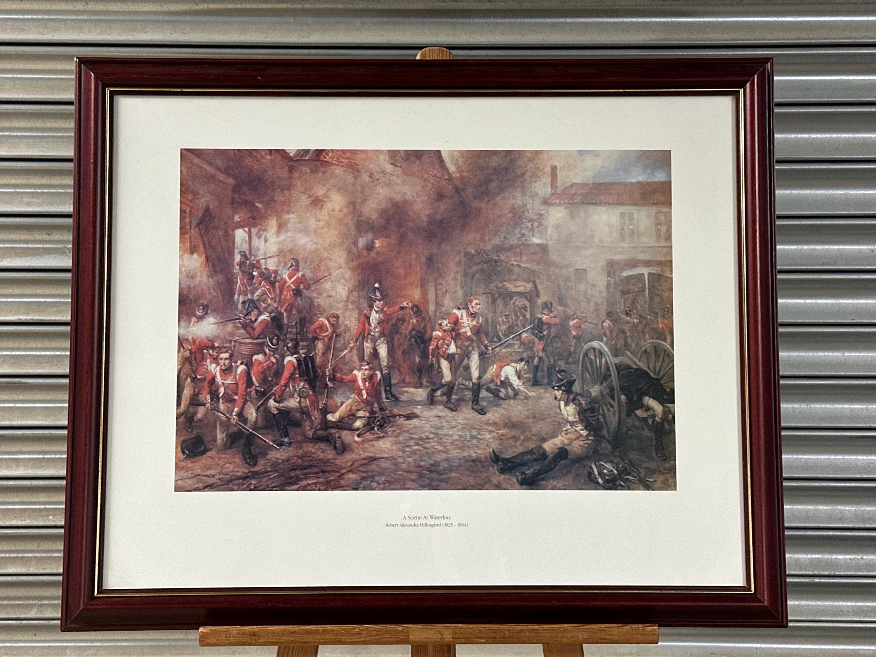 Striking framed print titled “A Scene at Waterloo” after the work of noted British military artist Robert Alexander Hillingford (1825–1904).
