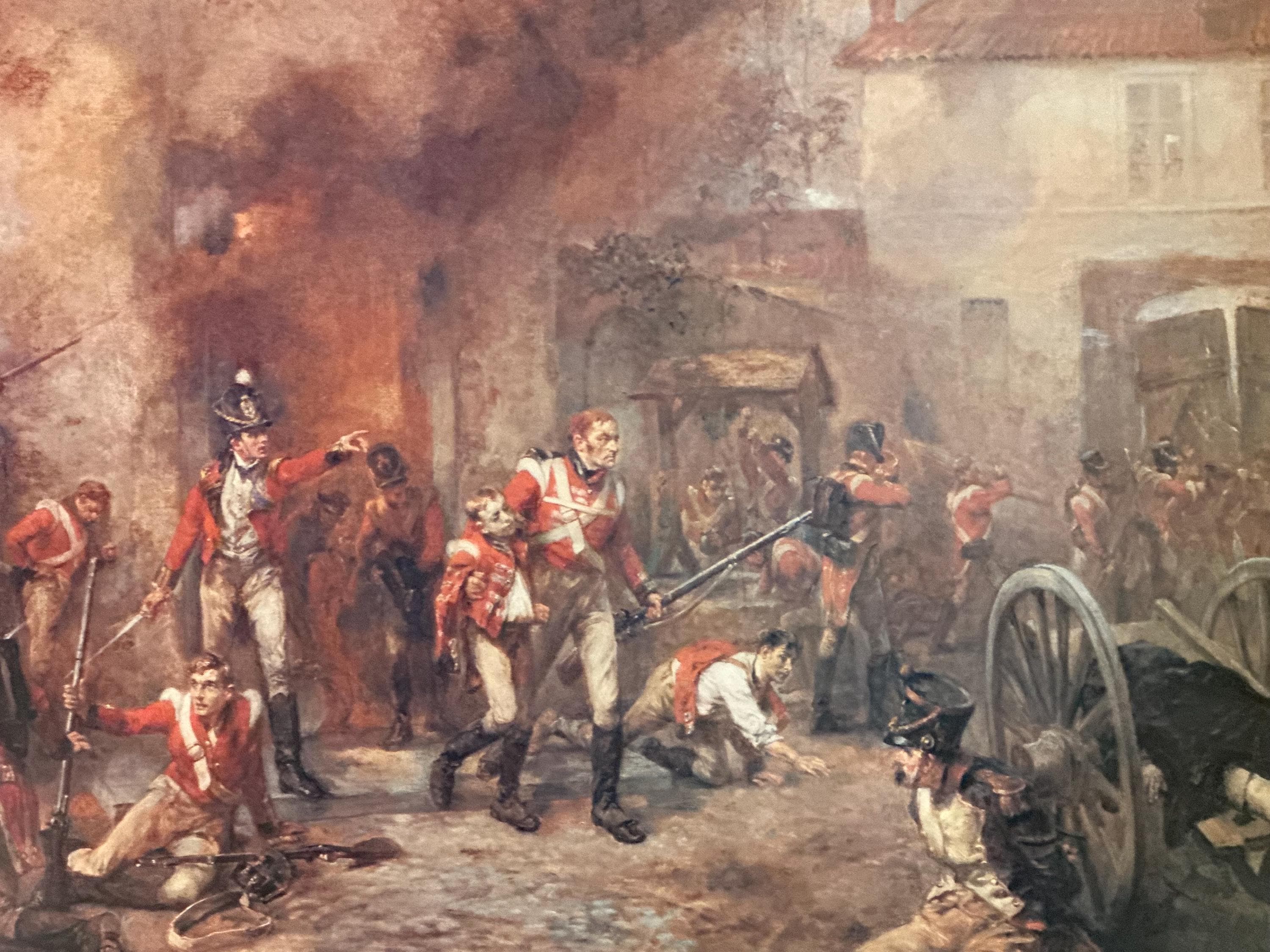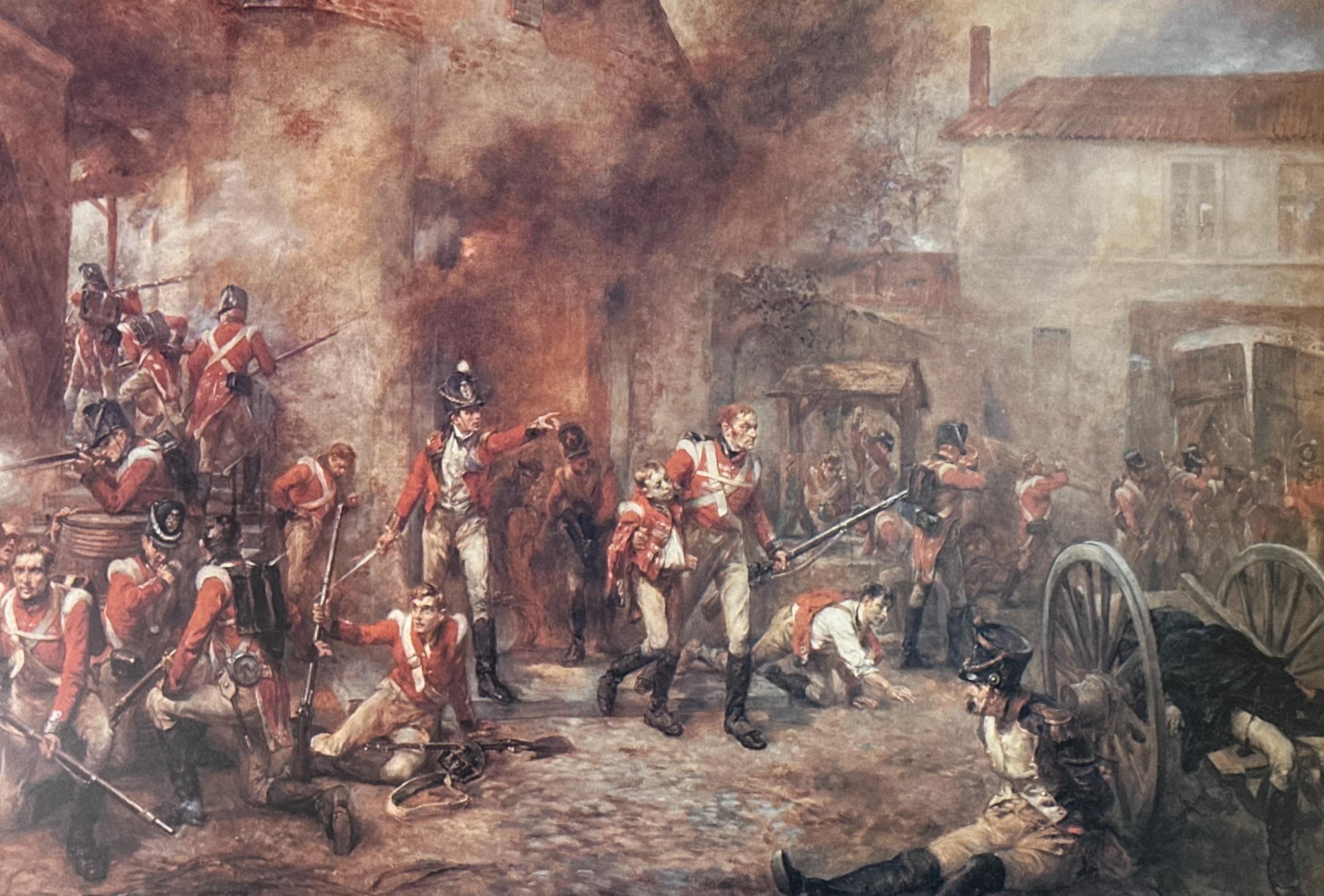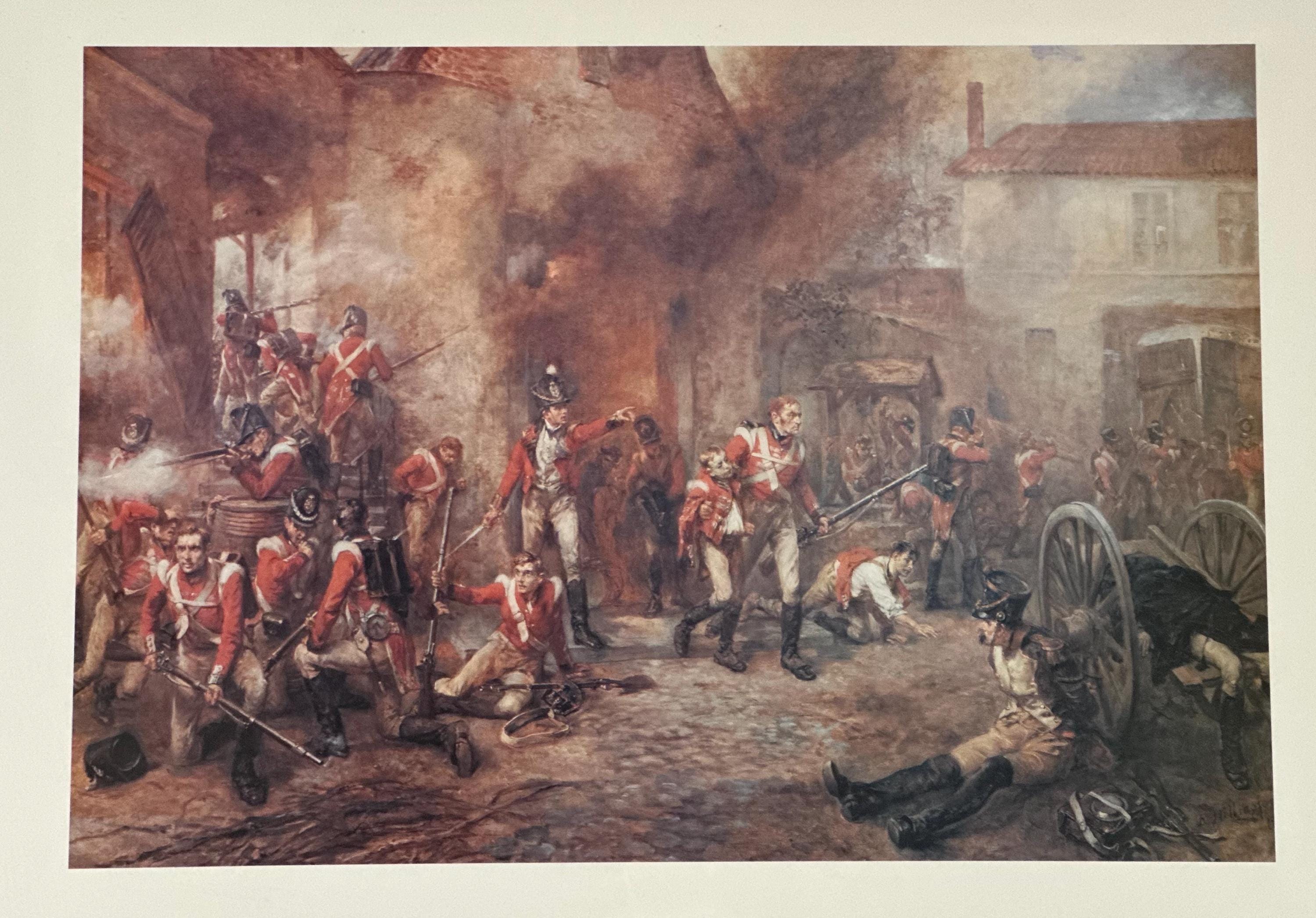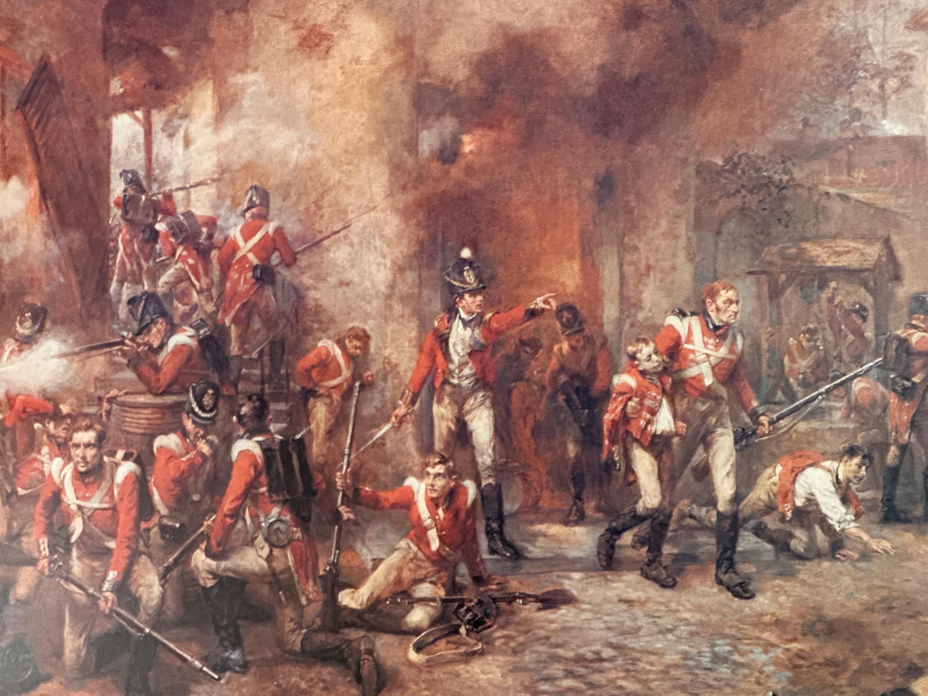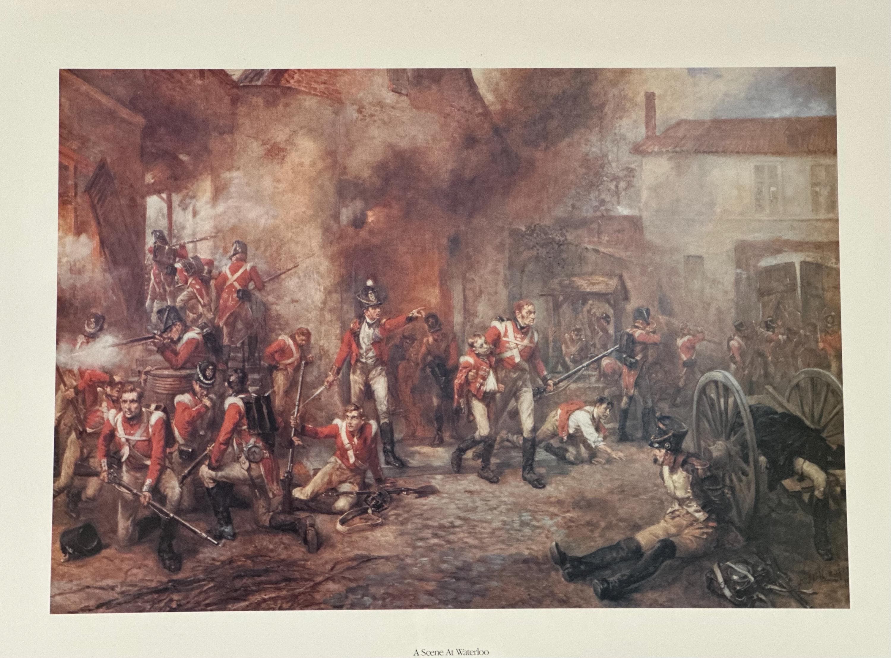 The composition vividly depicts the chaos and drama of the Battle of Waterloo, with red-coated British soldiers engaged in intense combat amid smoke, fire, and fallen figures. A classic and highly decorative piece of historical military art.