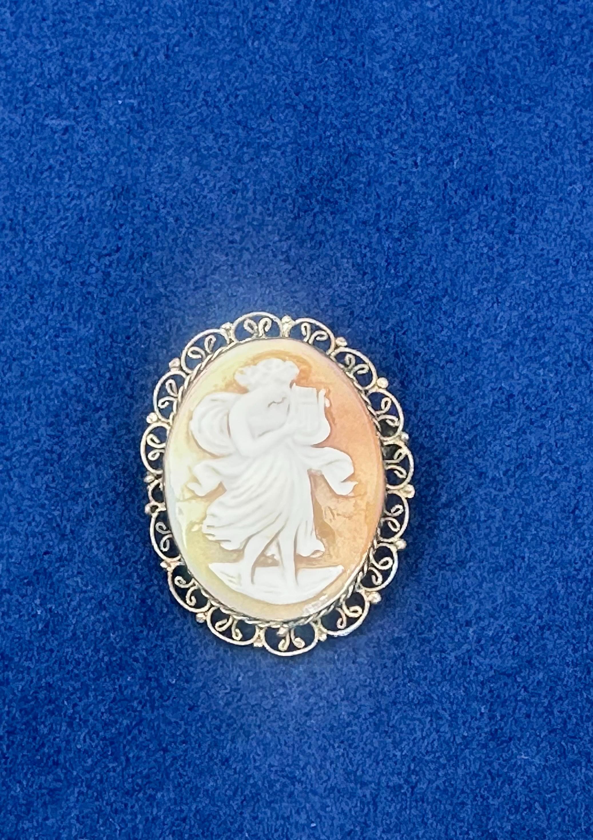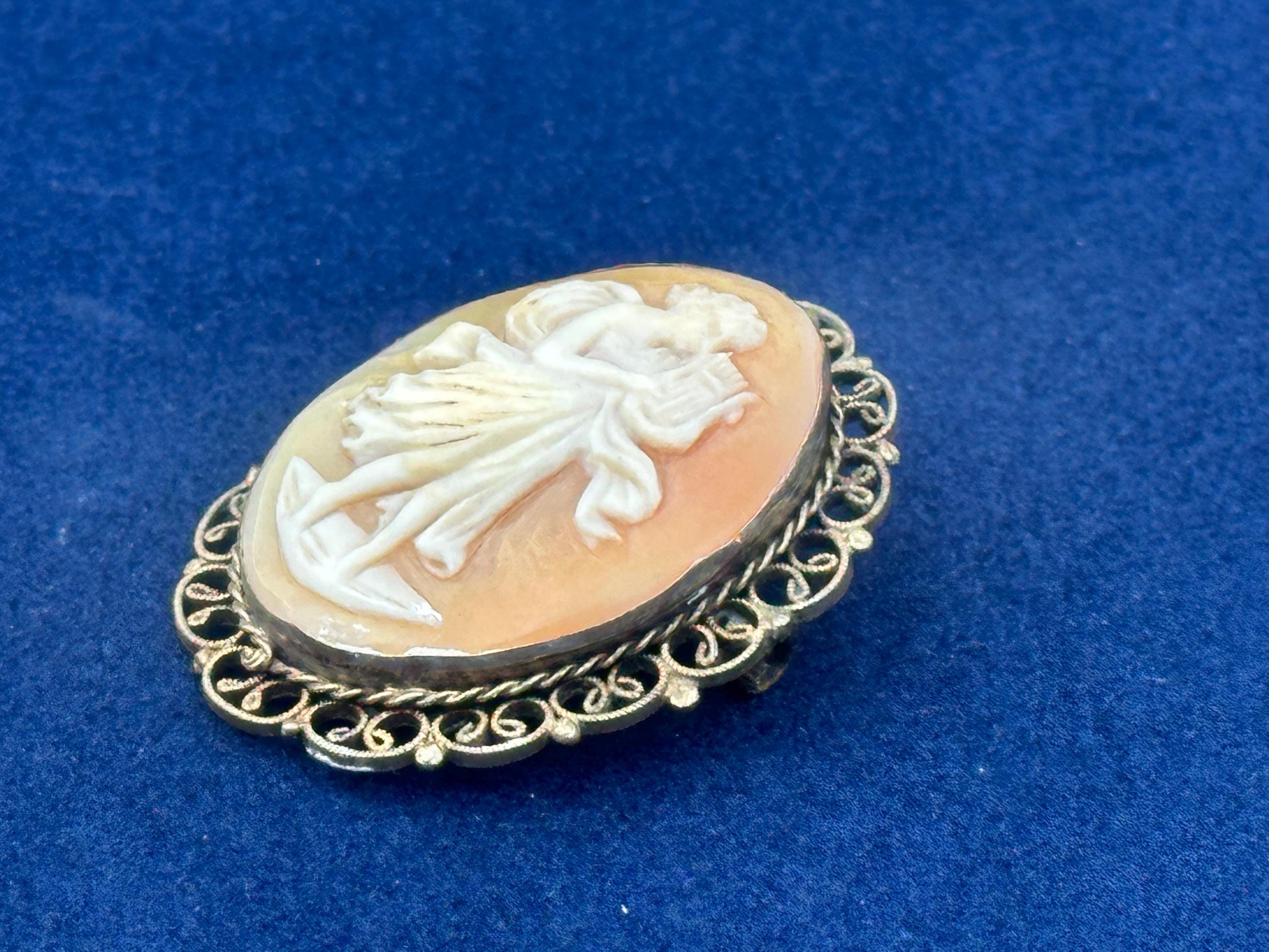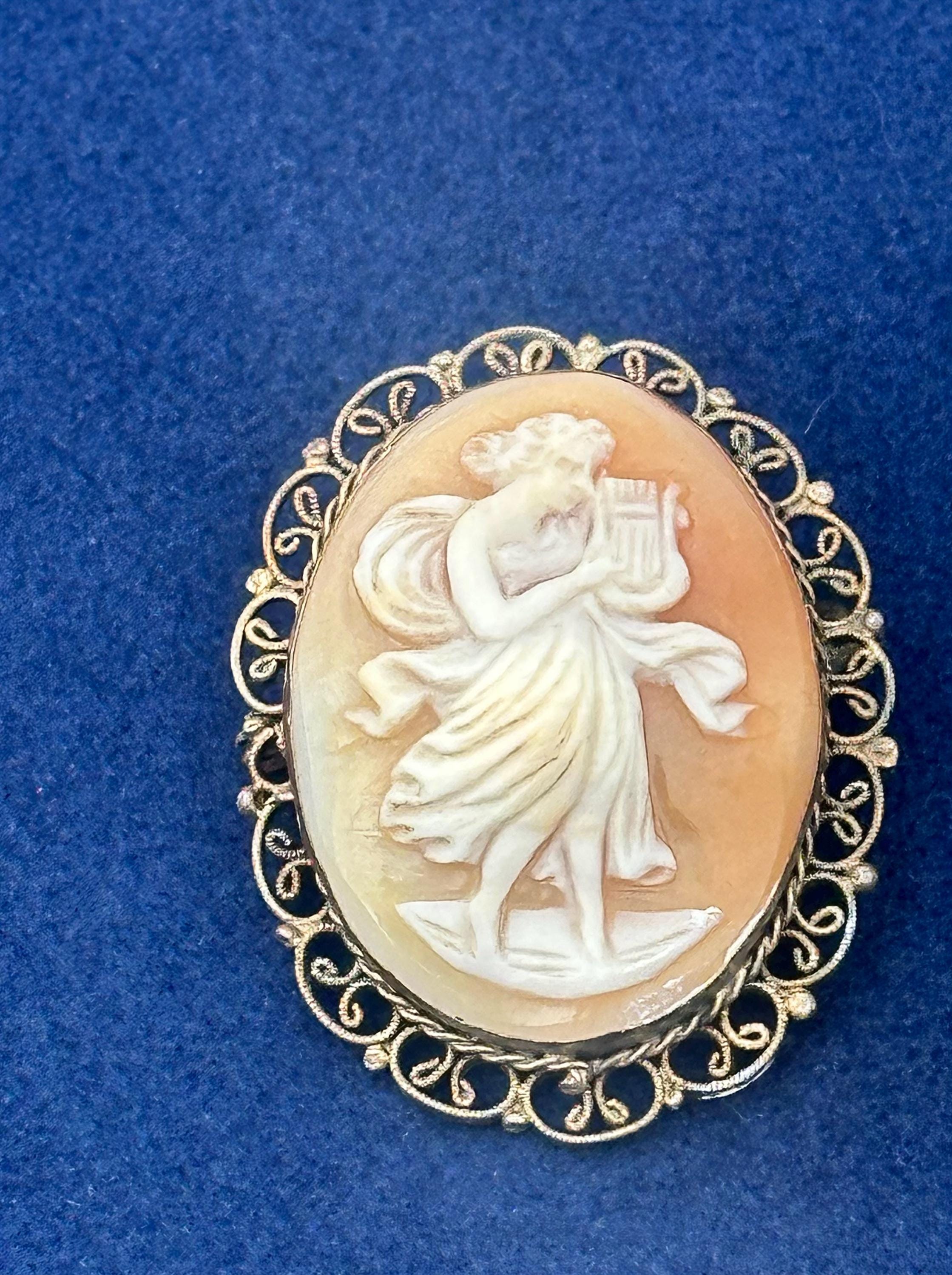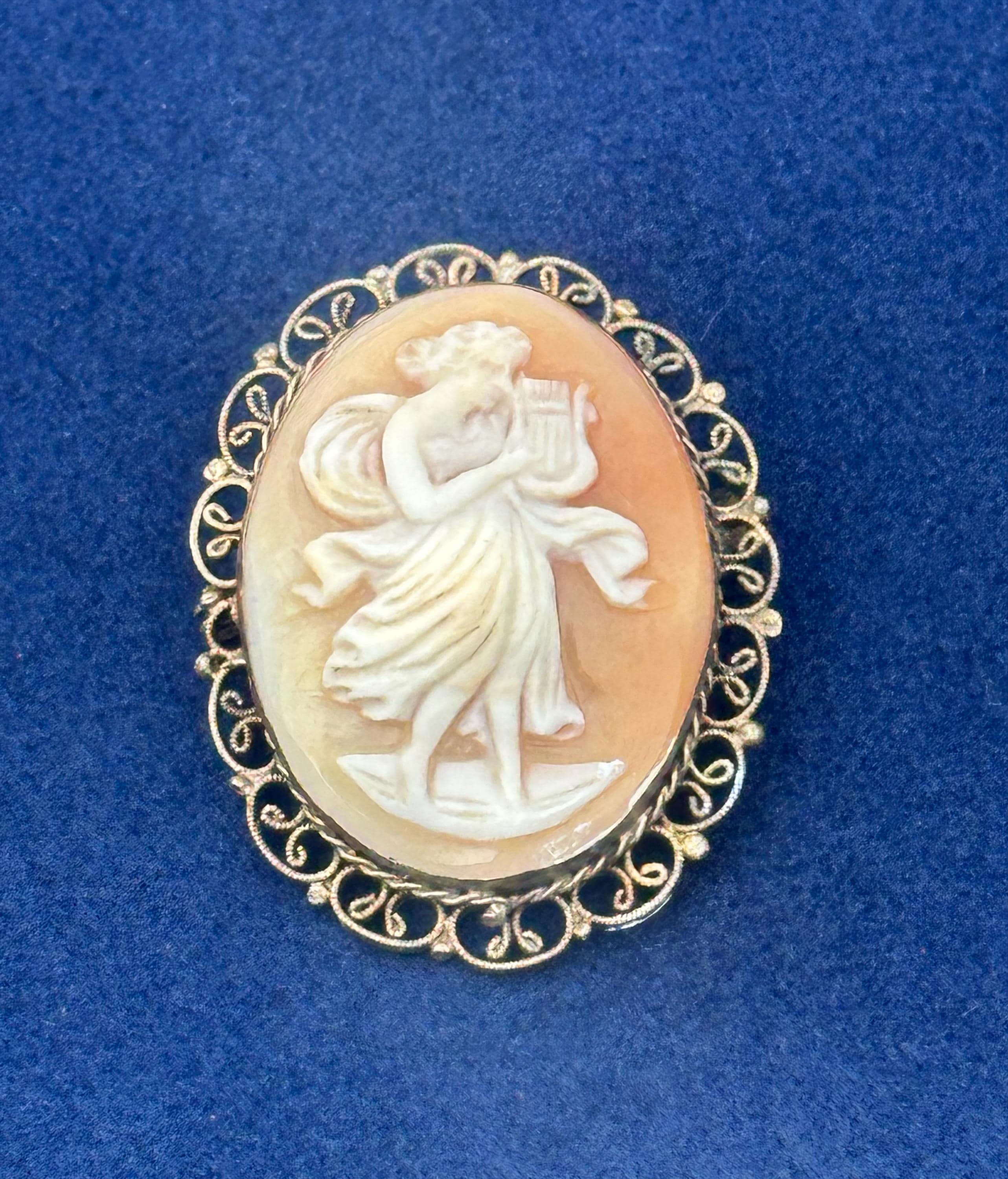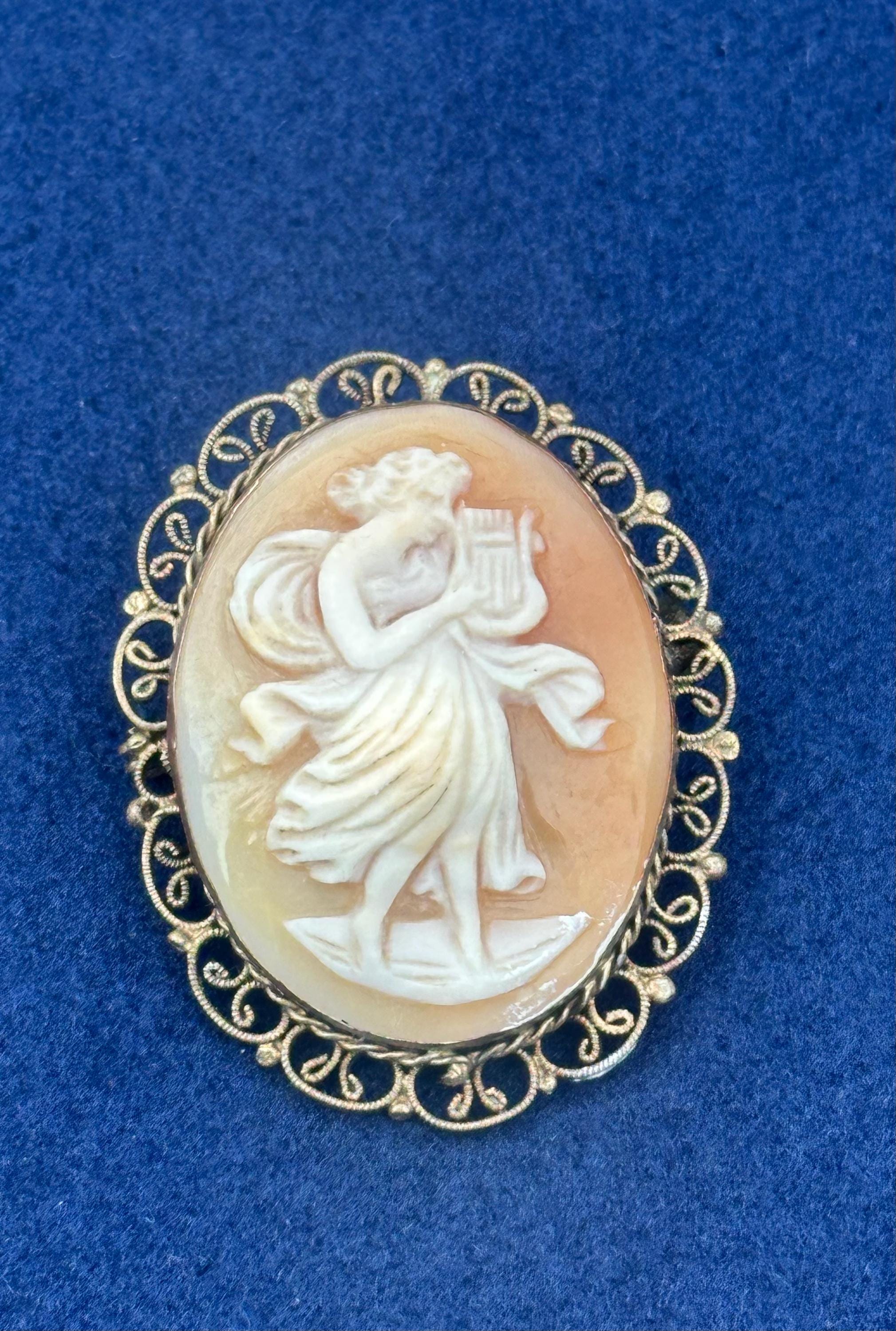 Antique Shell Cameo Brooch Dancing Muse Lady Gold Tone Filigree Frame Vintage