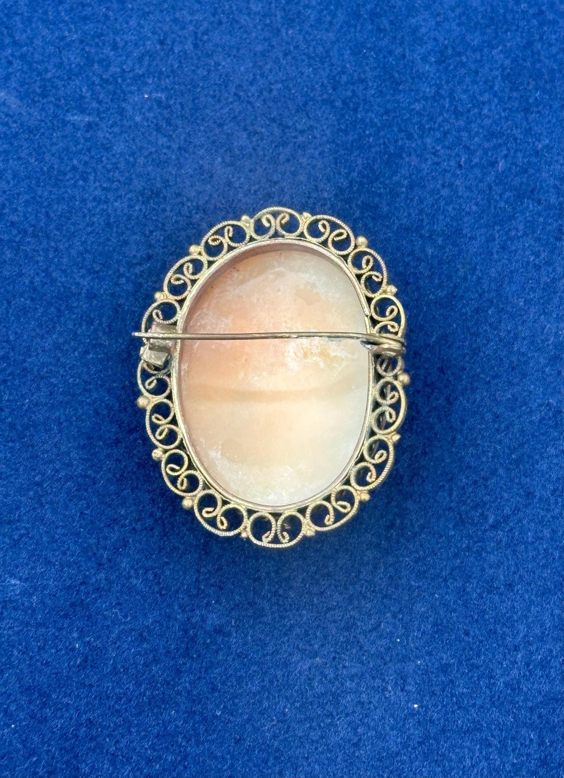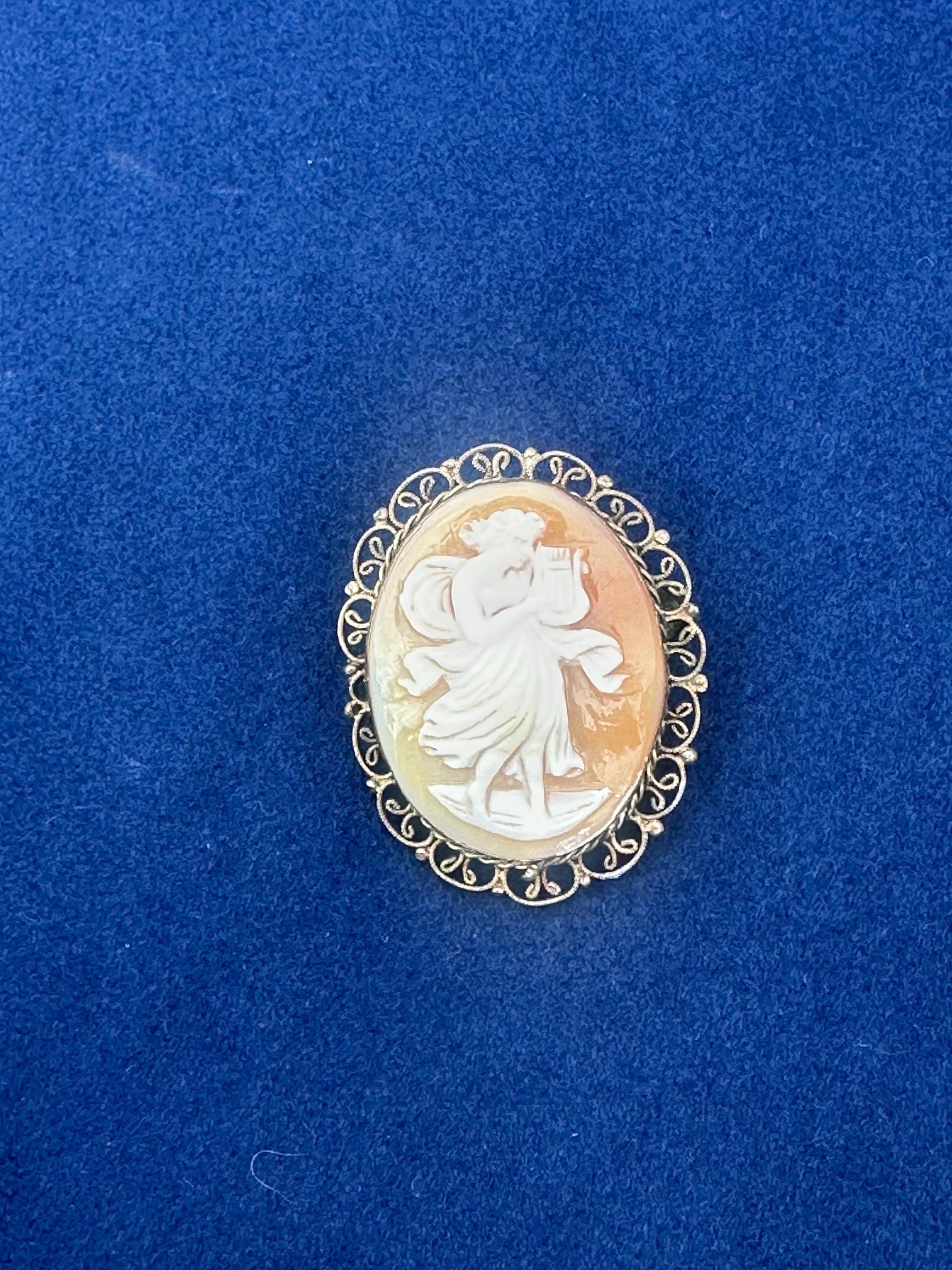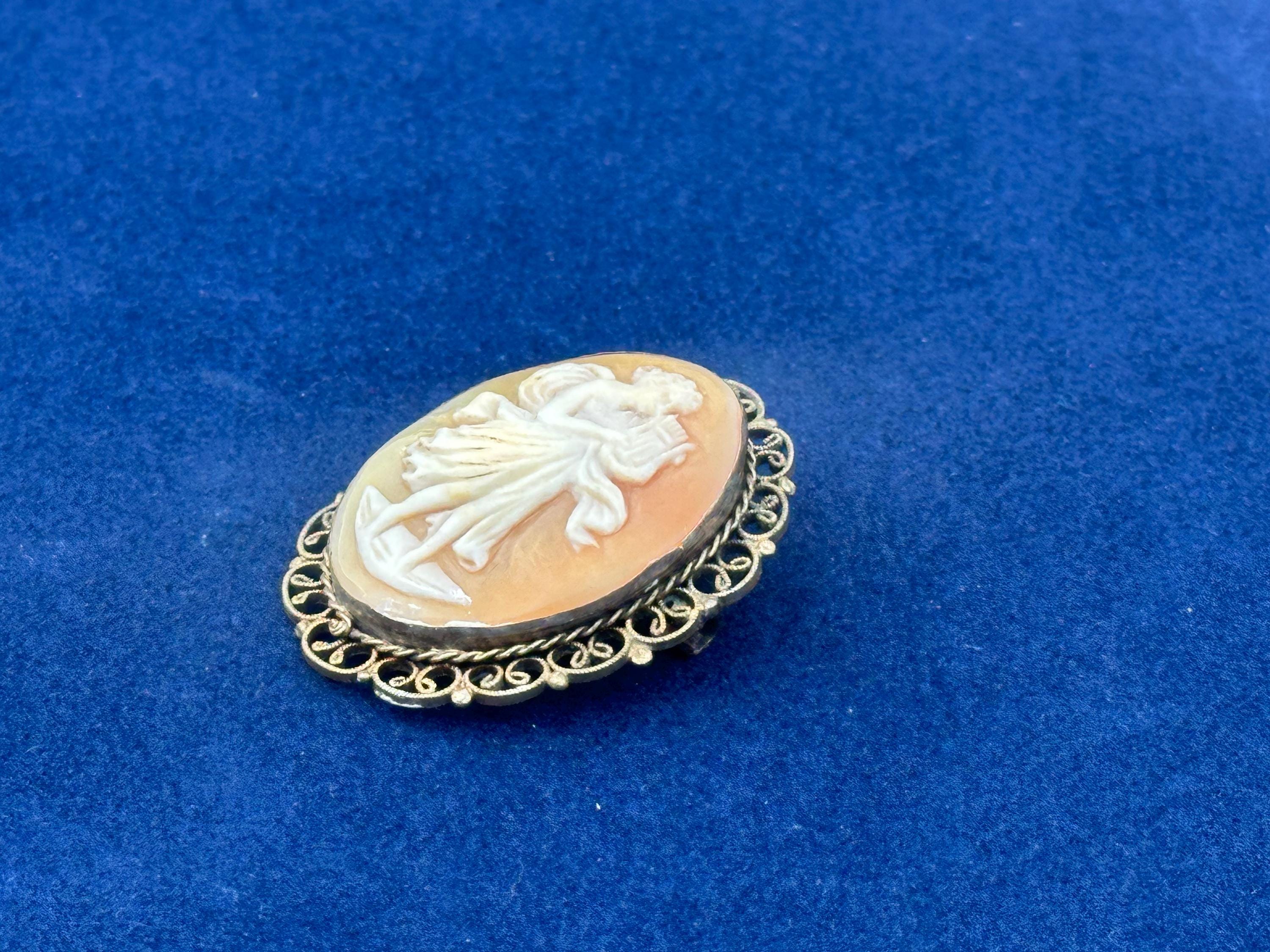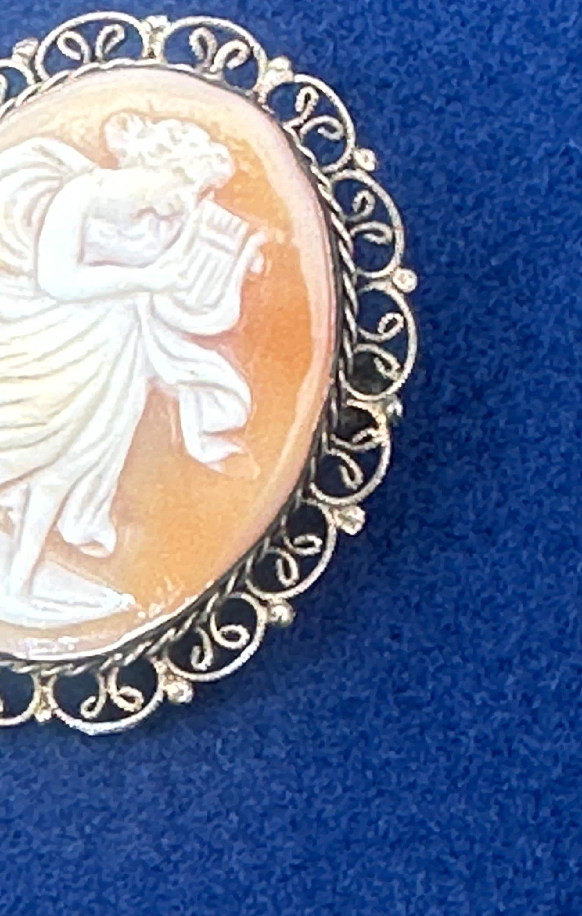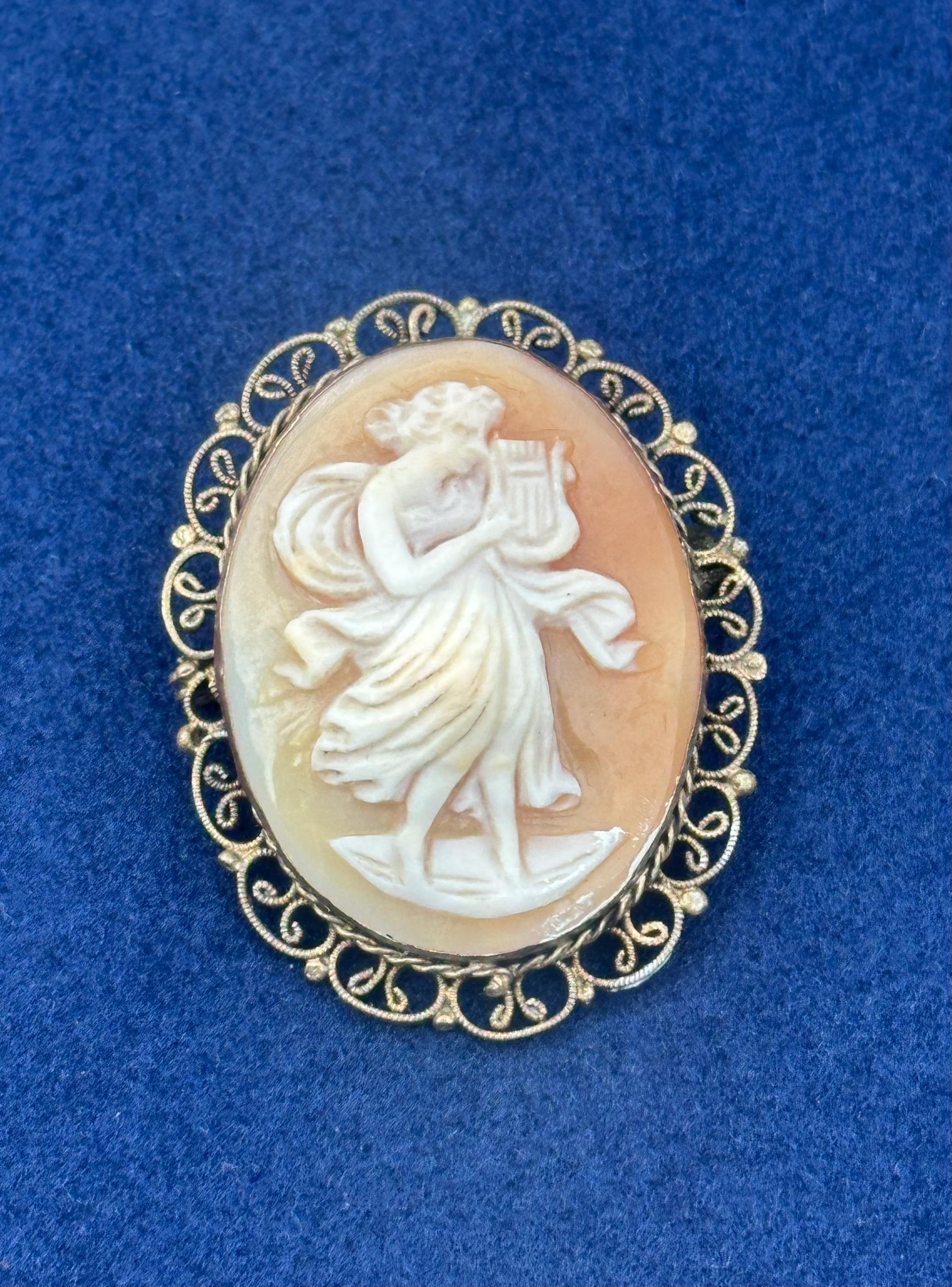 Antique Shell Cameo Brooch Dancing Muse Lady Gold Tone Filigree Frame Vintage