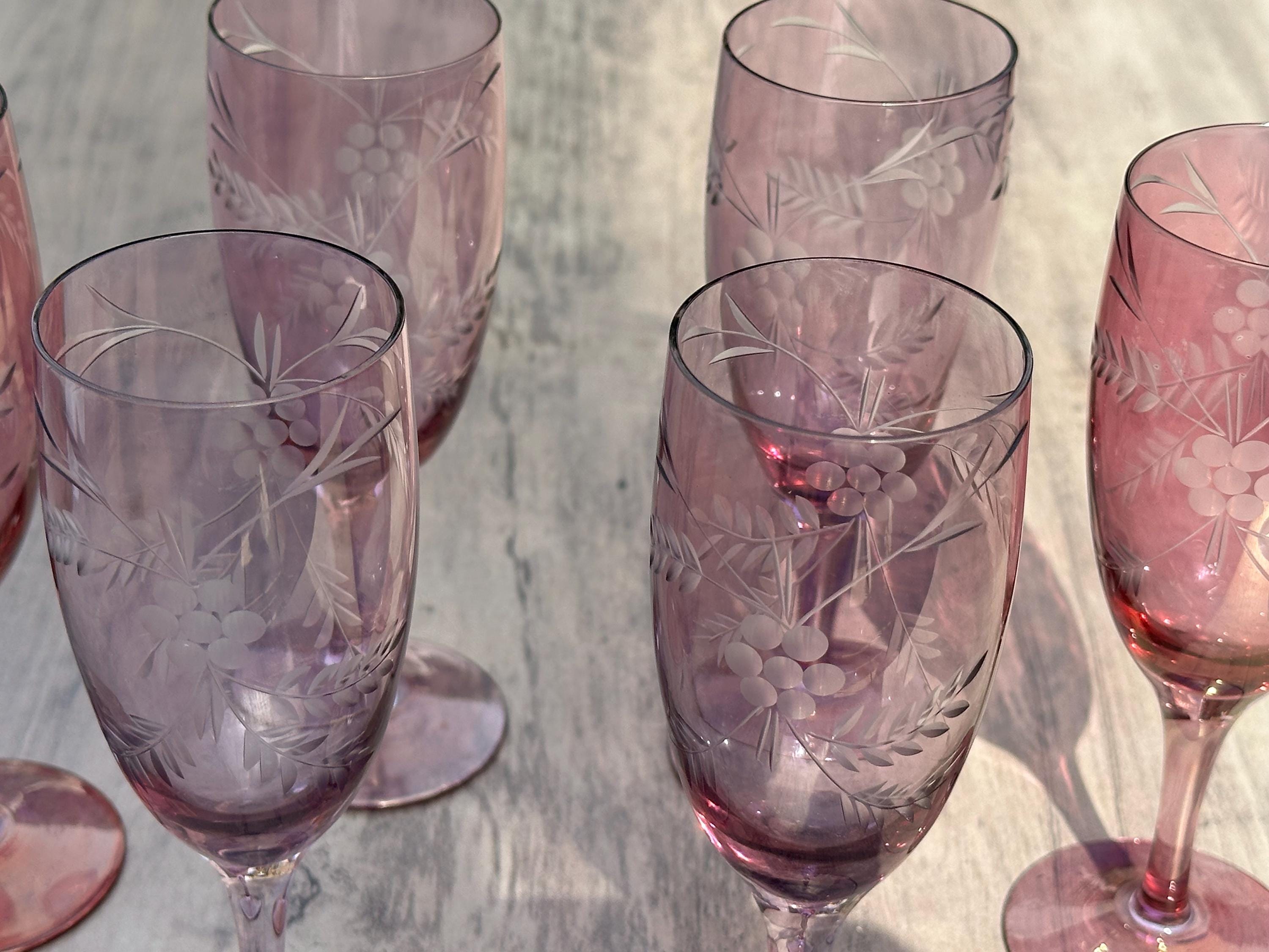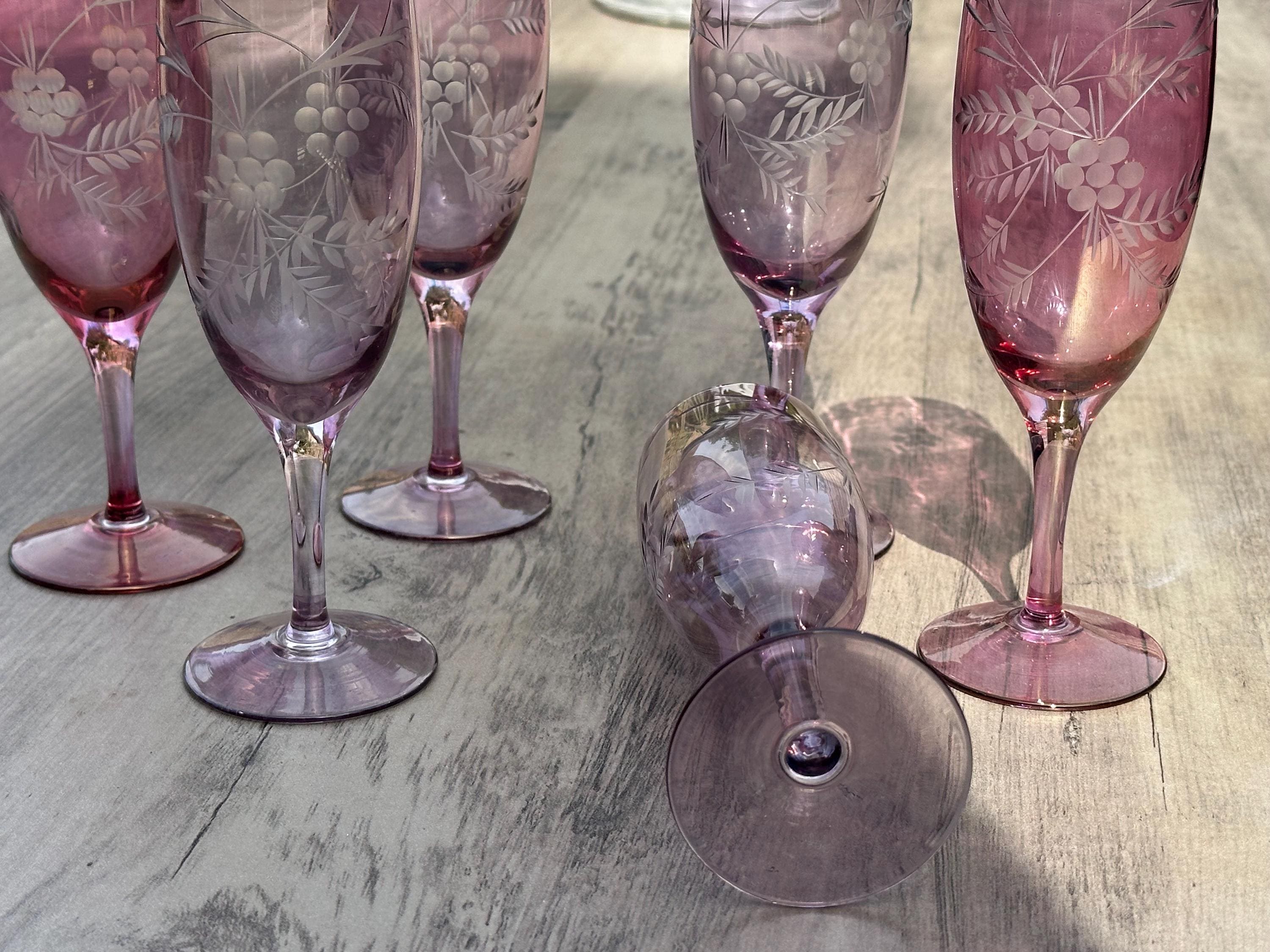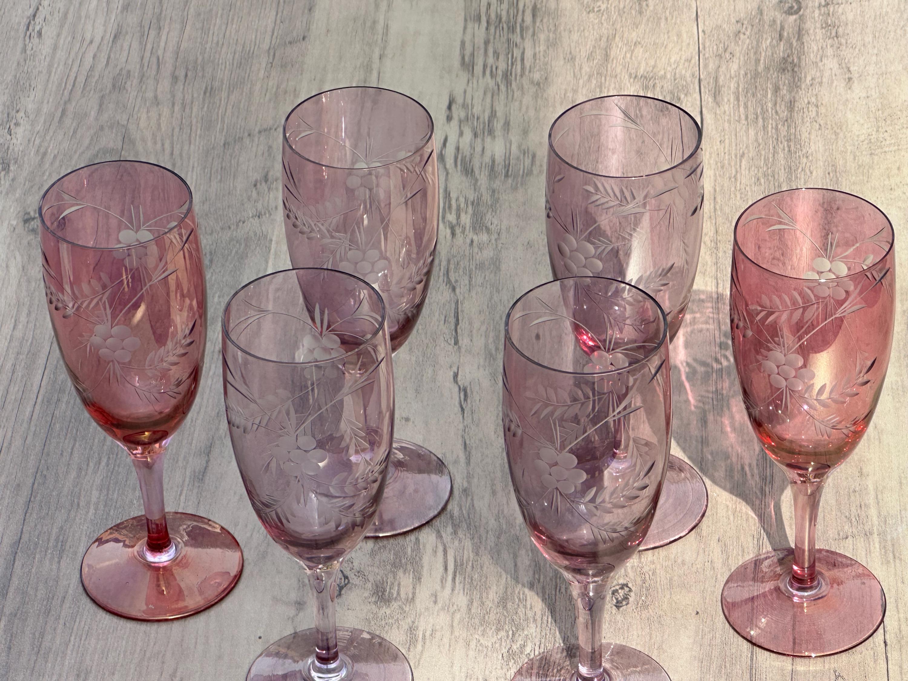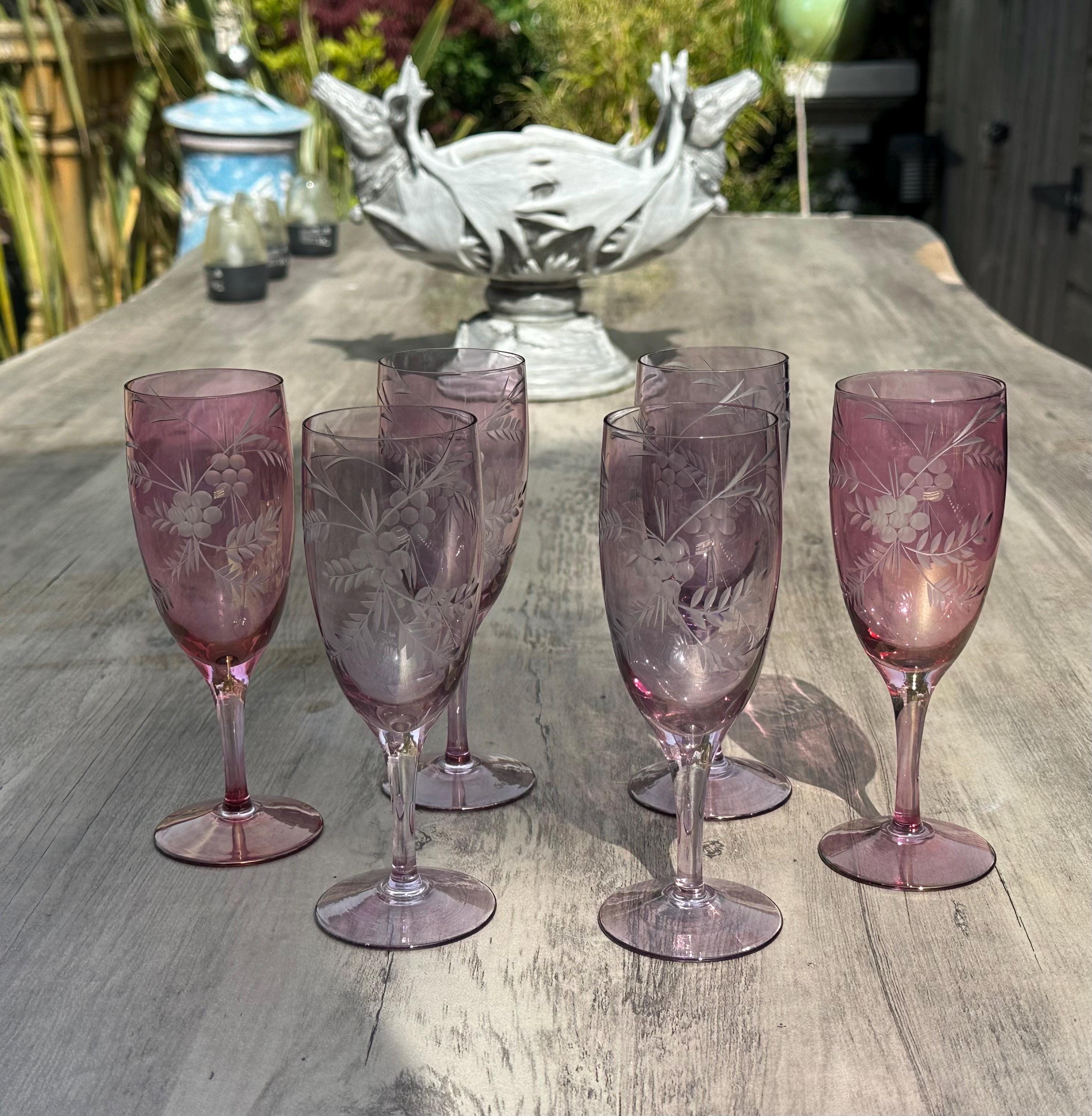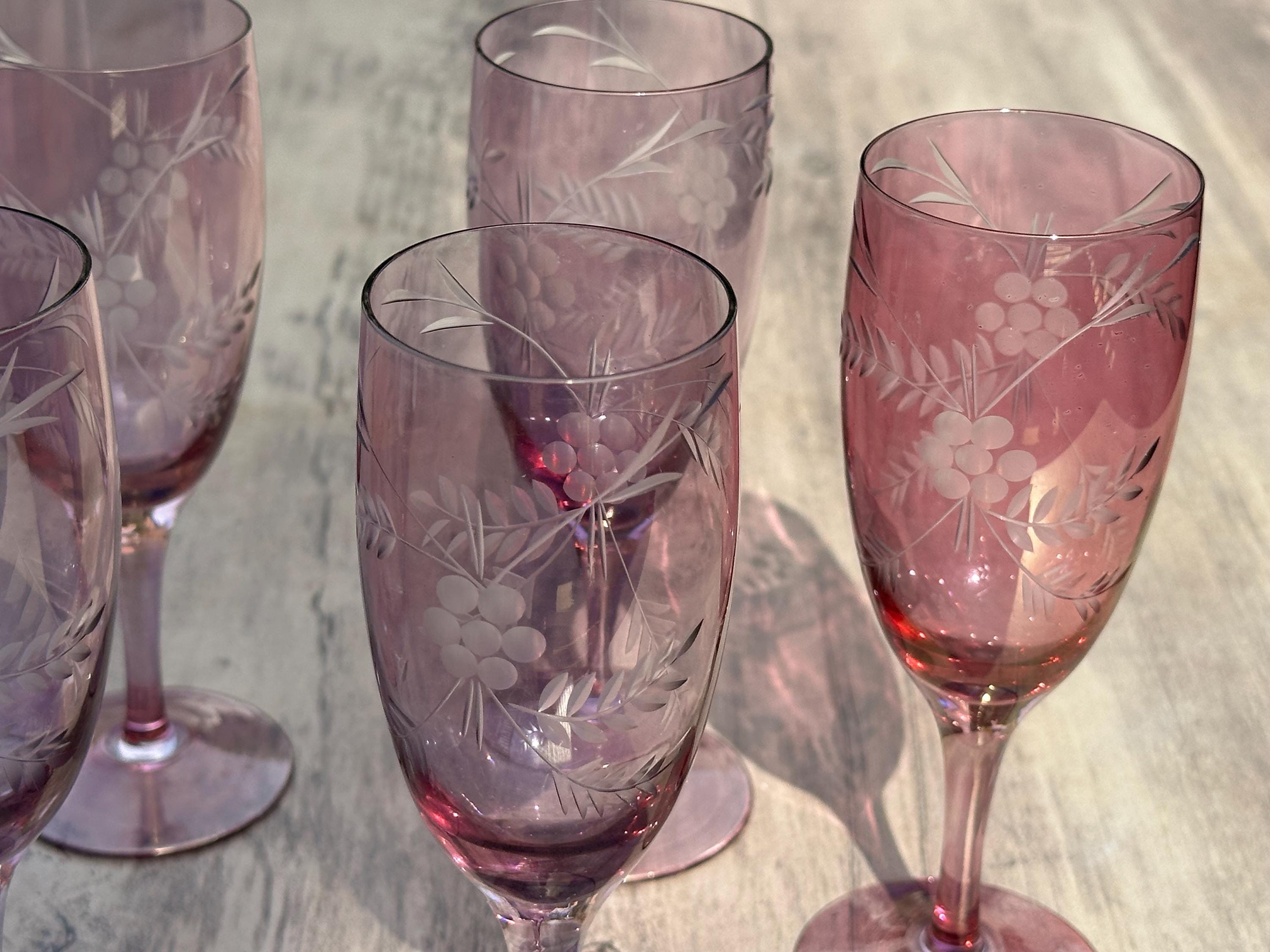 Six Vintage Bohemian Etched Cranberry Glass Flutes / Goblets