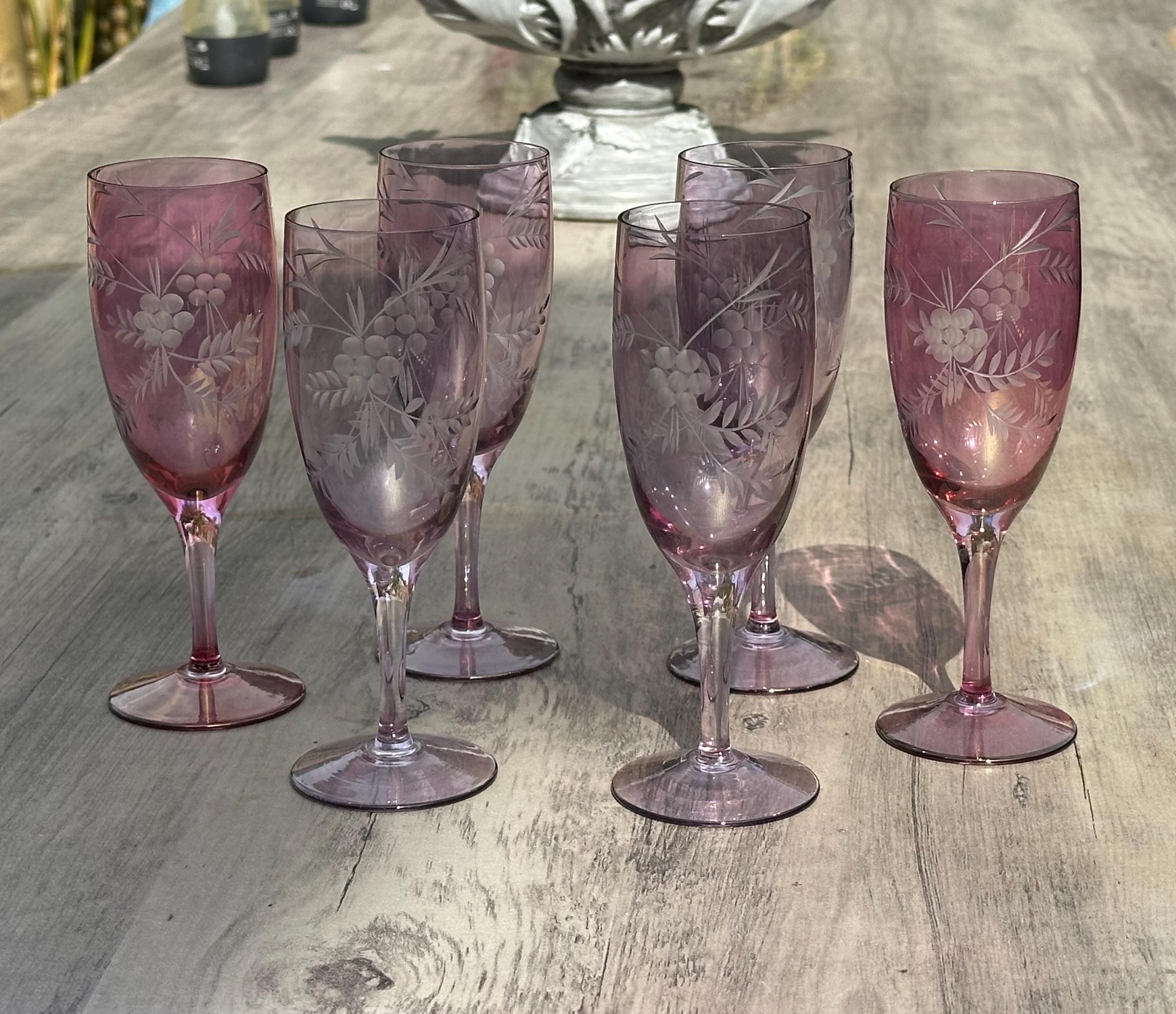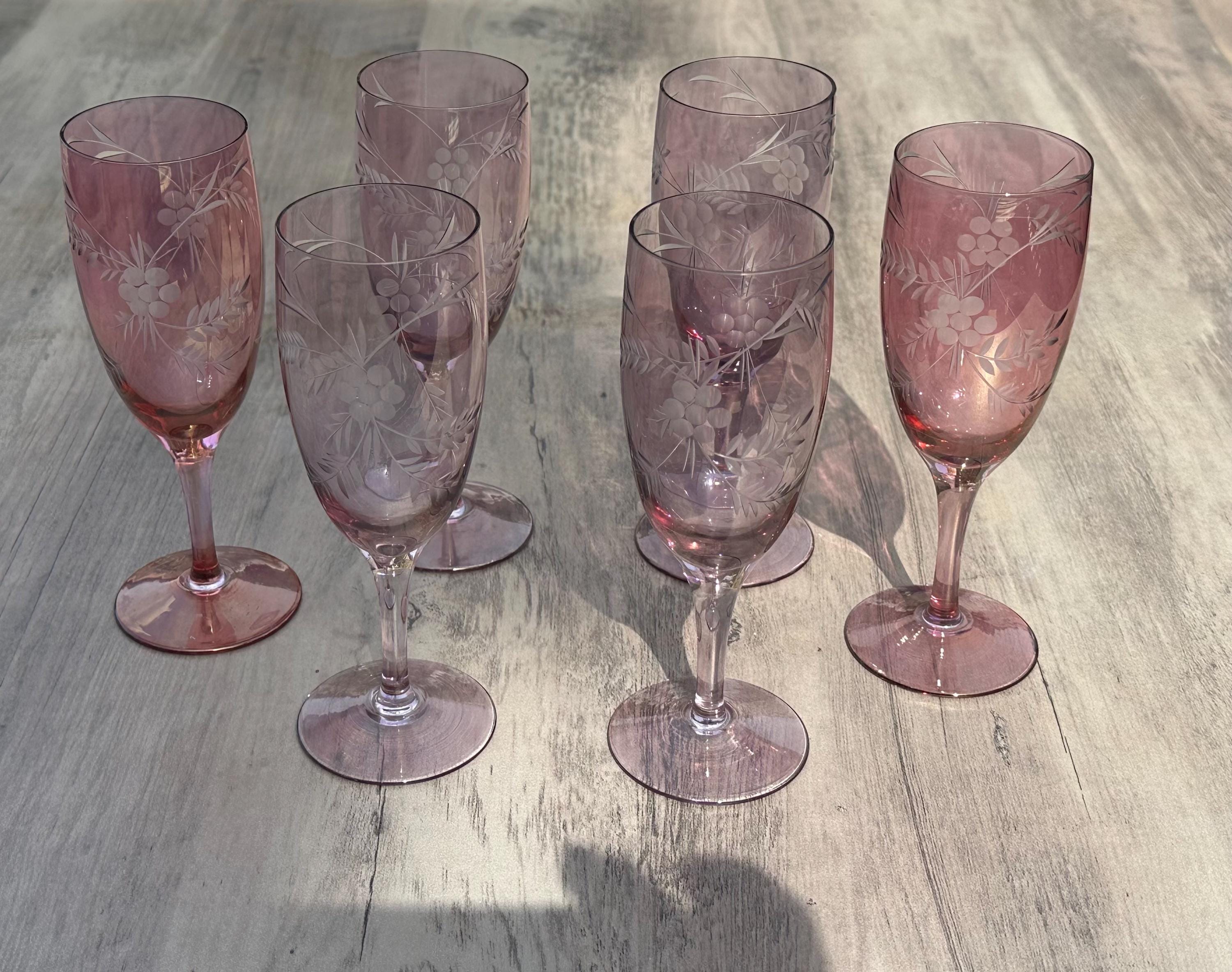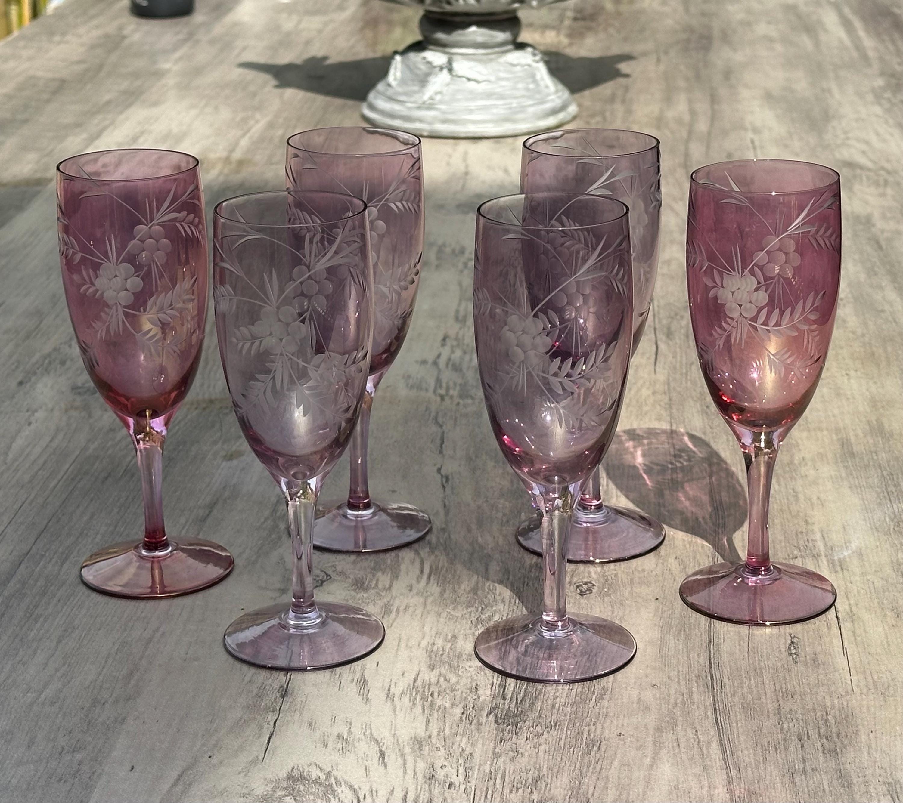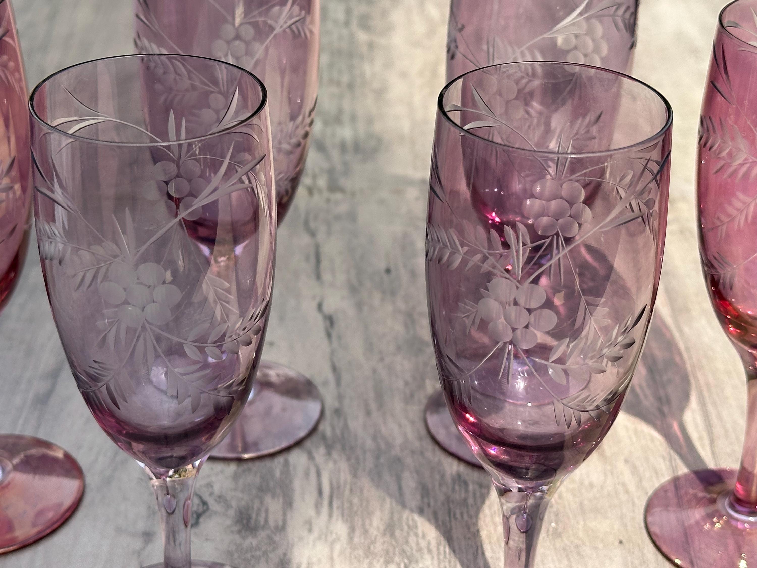 Six Vintage Bohemian Etched Cranberry Glass Flutes / Goblets