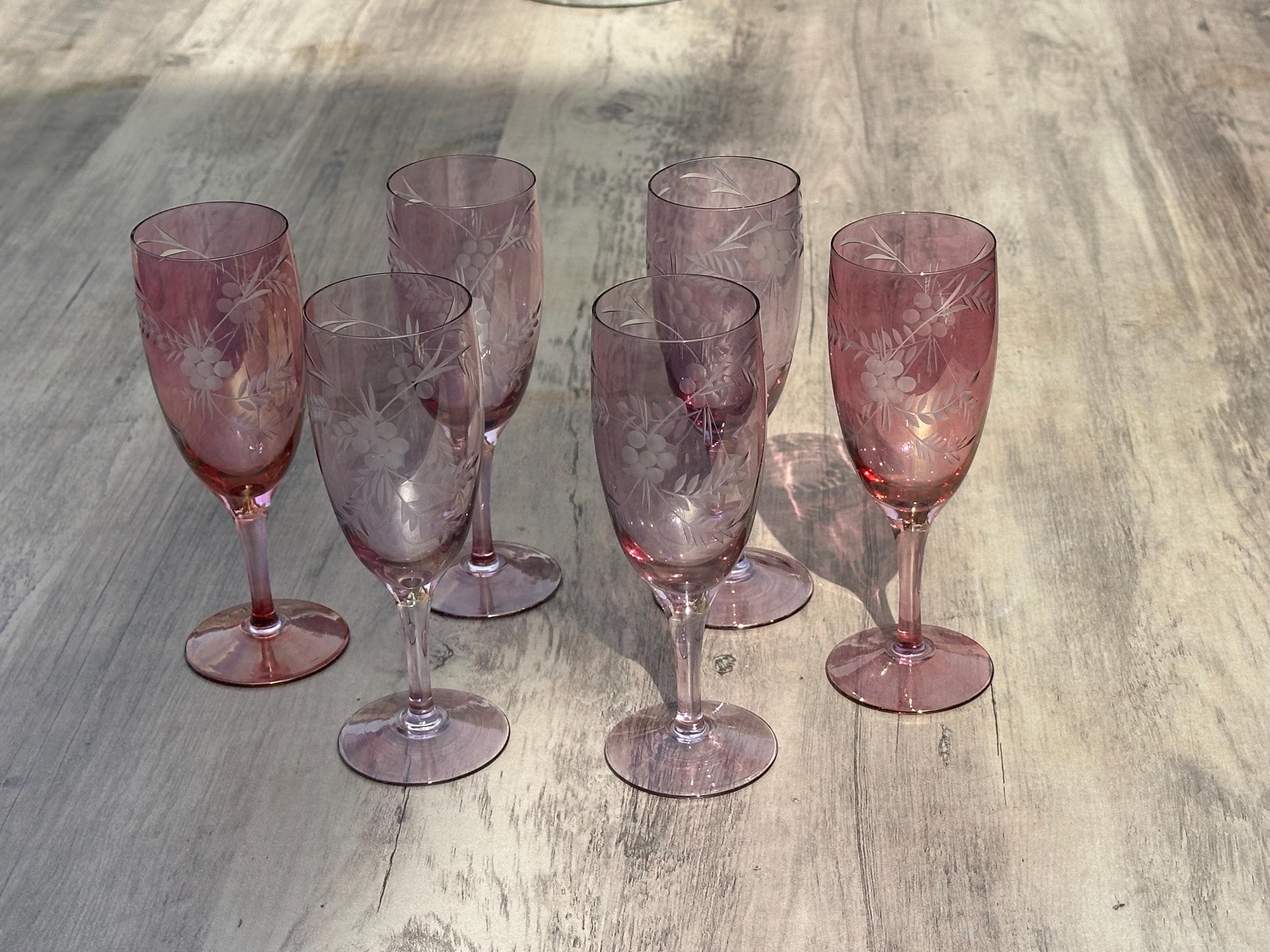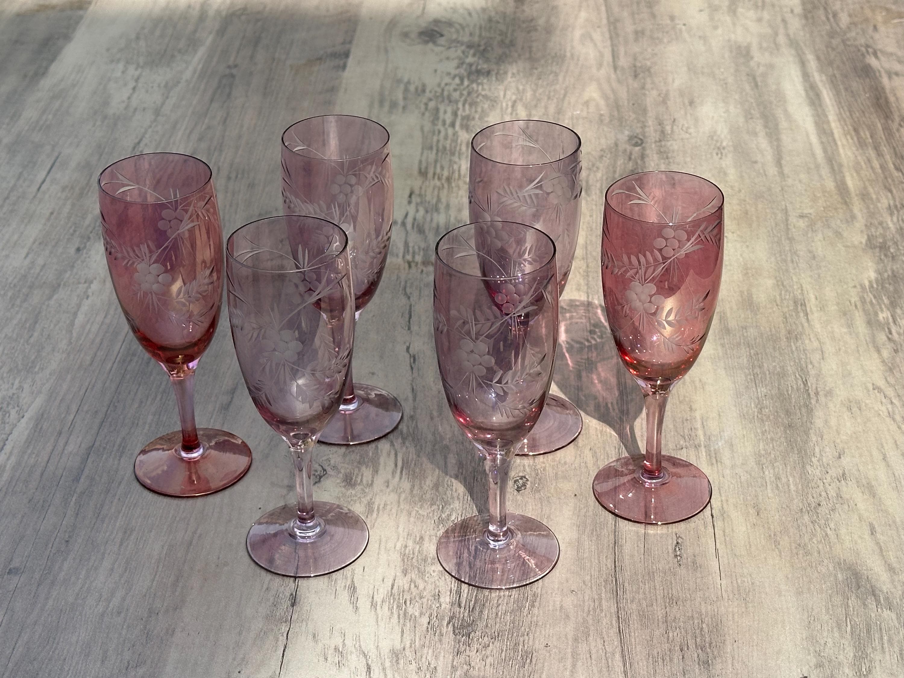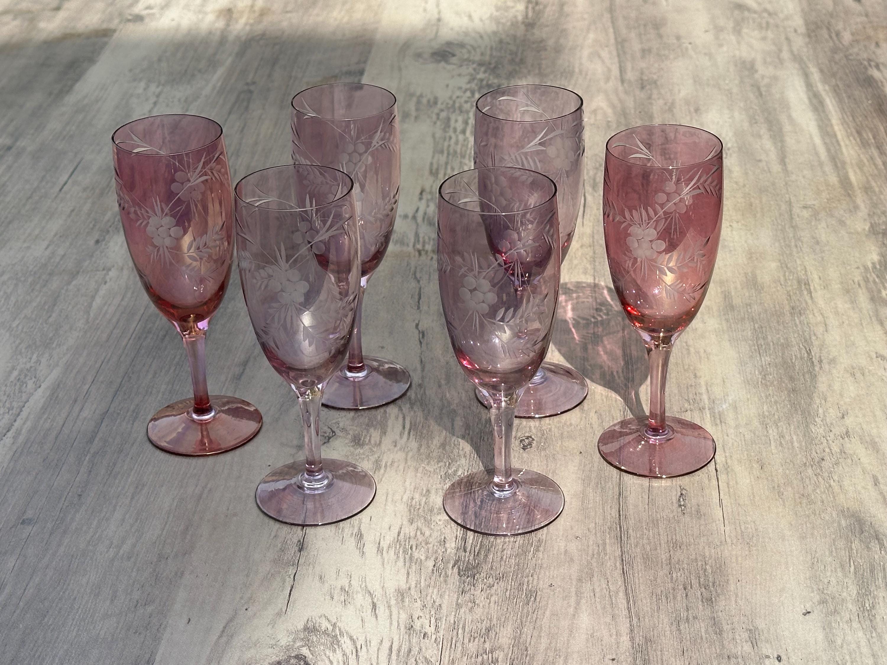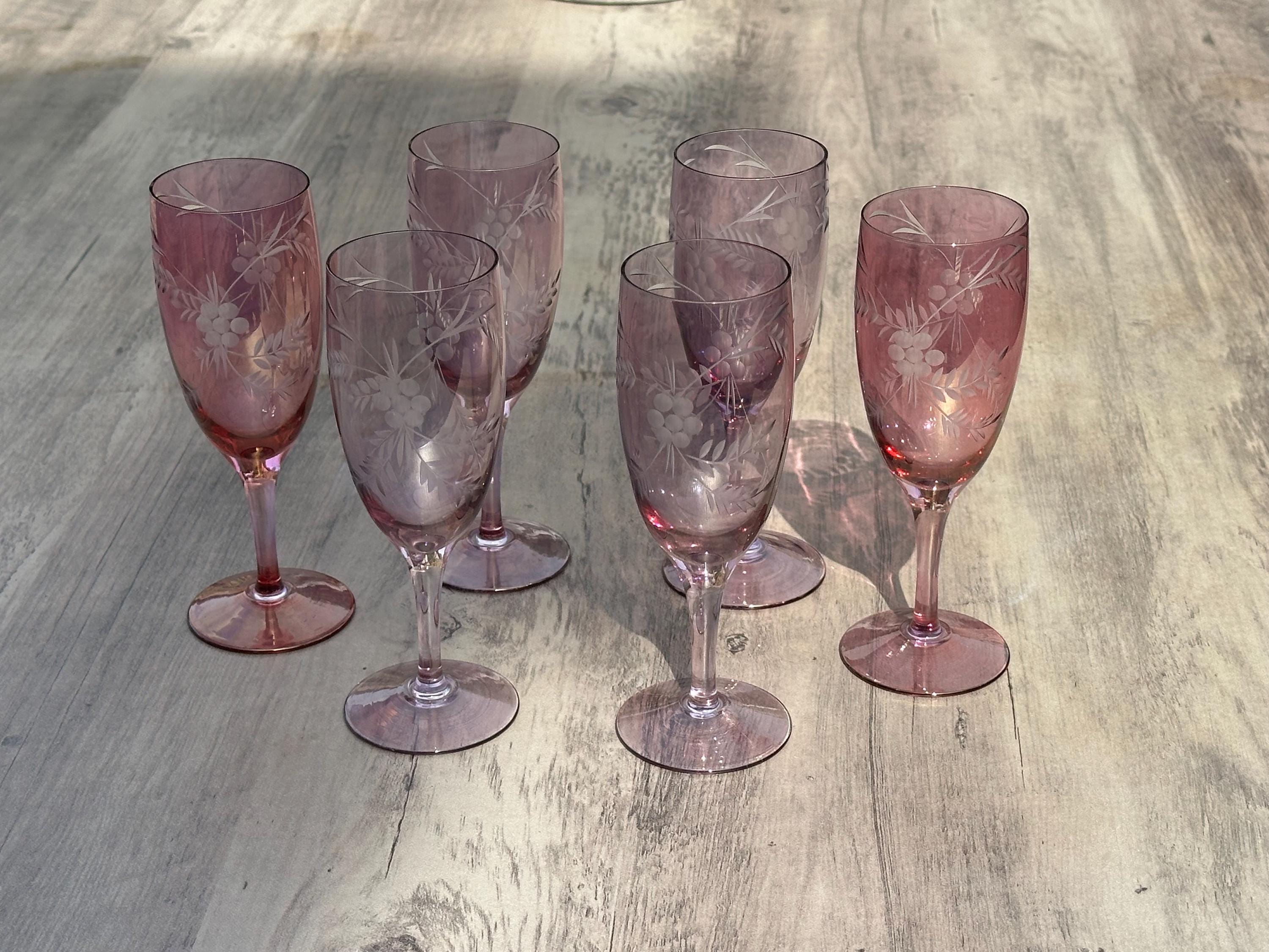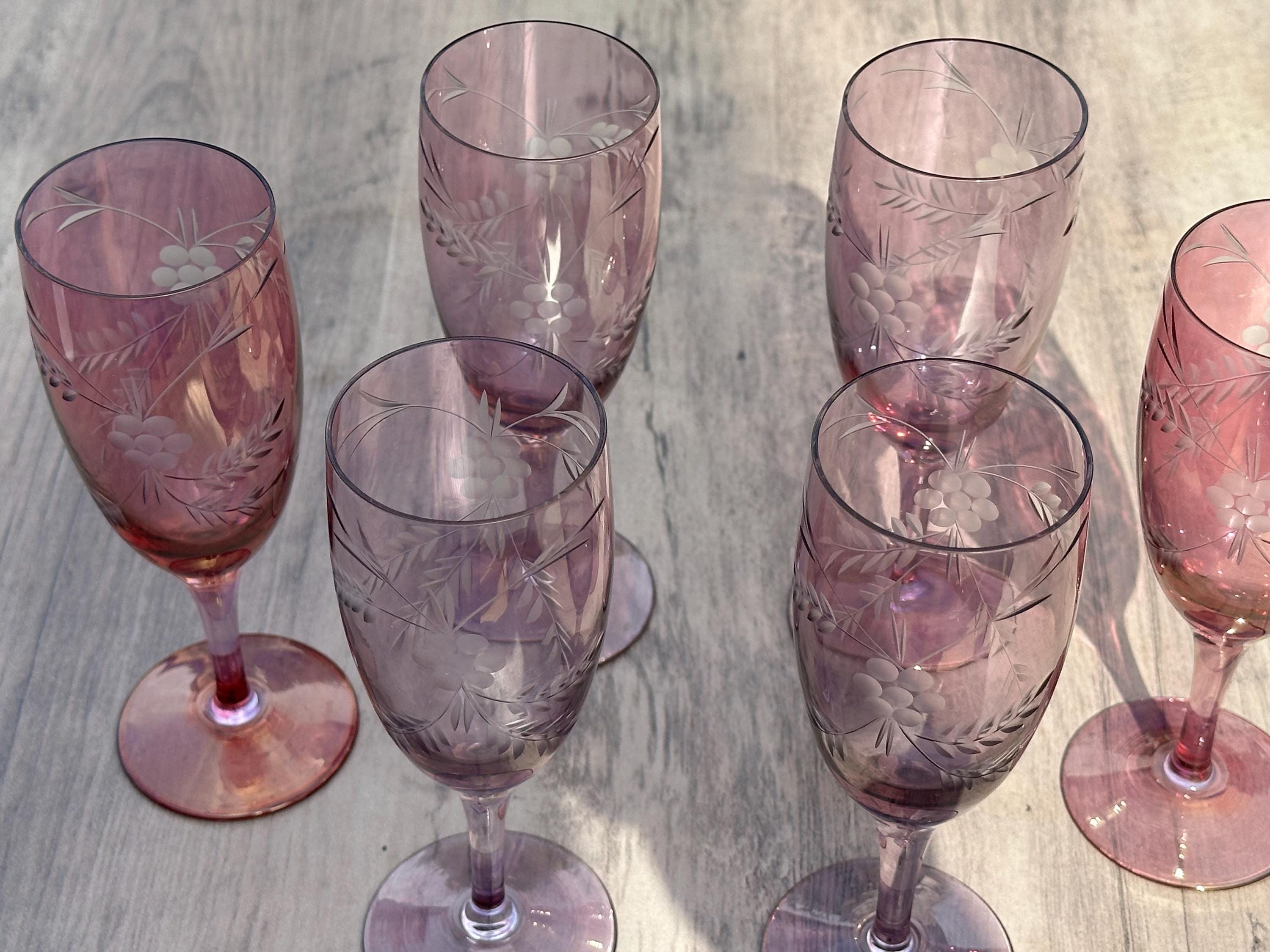 Six Vintage Bohemian Etched Cranberry Glass Flutes / Goblets