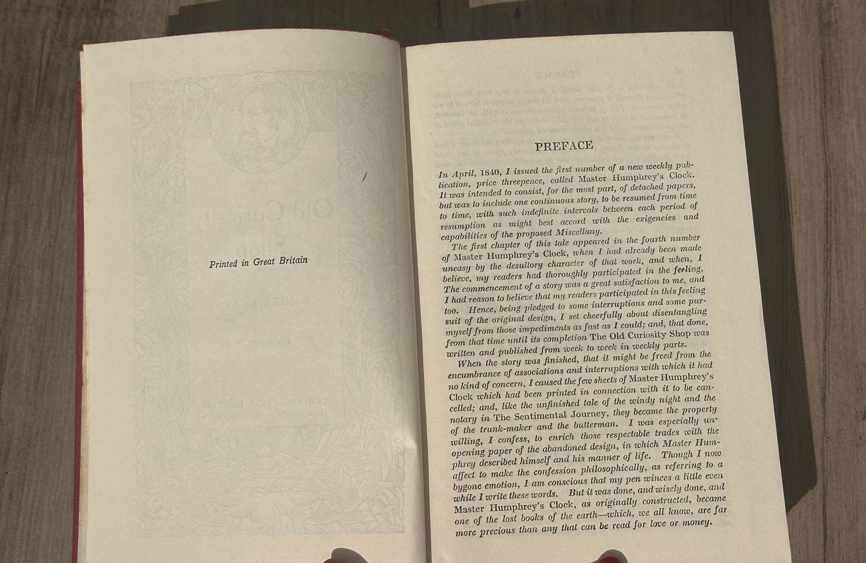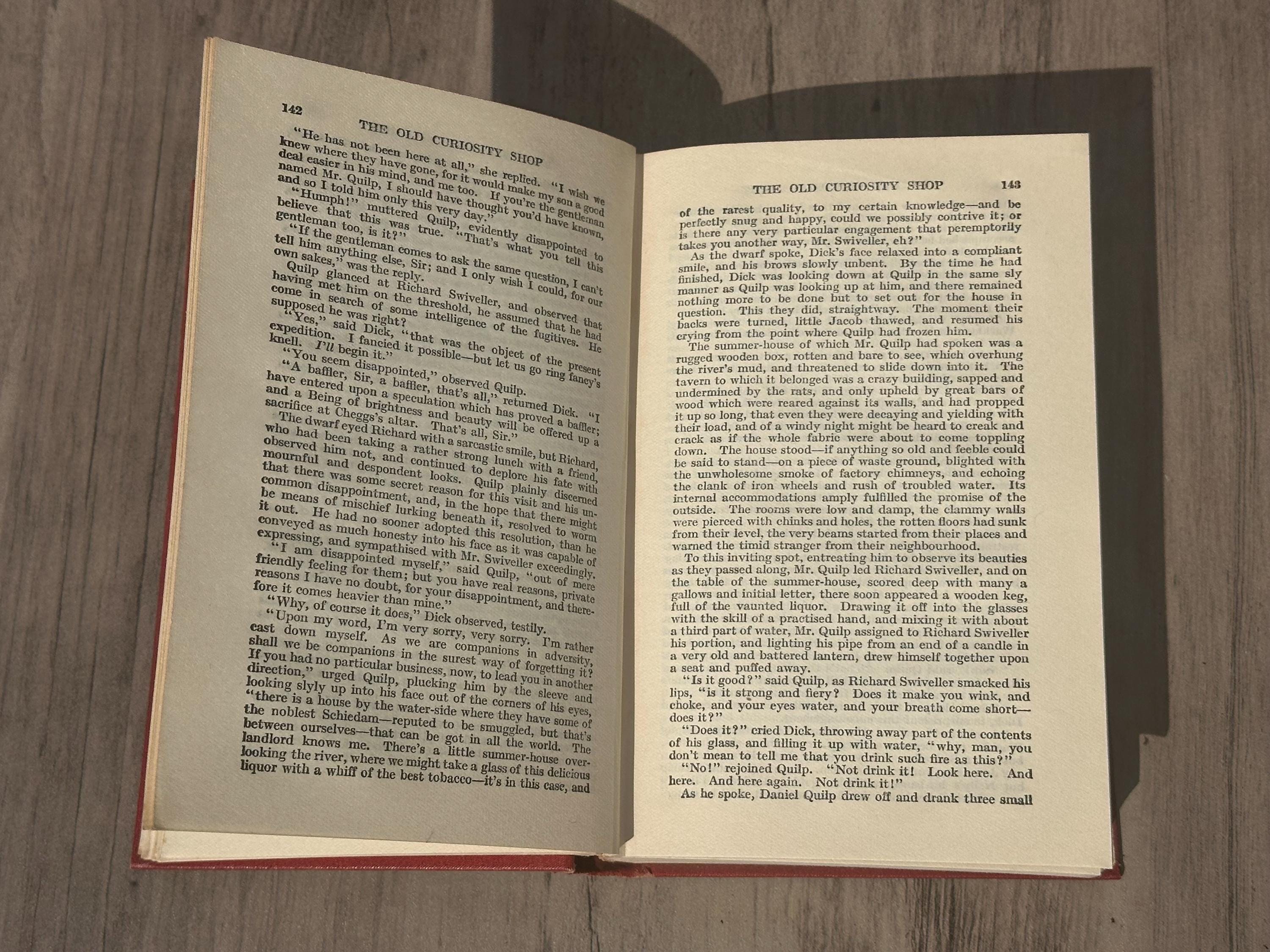 A charming vintage copy of The Old Curiosity Shop by Charles Dickens, presented in an attractive red cloth binding with gilt lettering to the spine and decorative blind-stamped detail to the front cover.