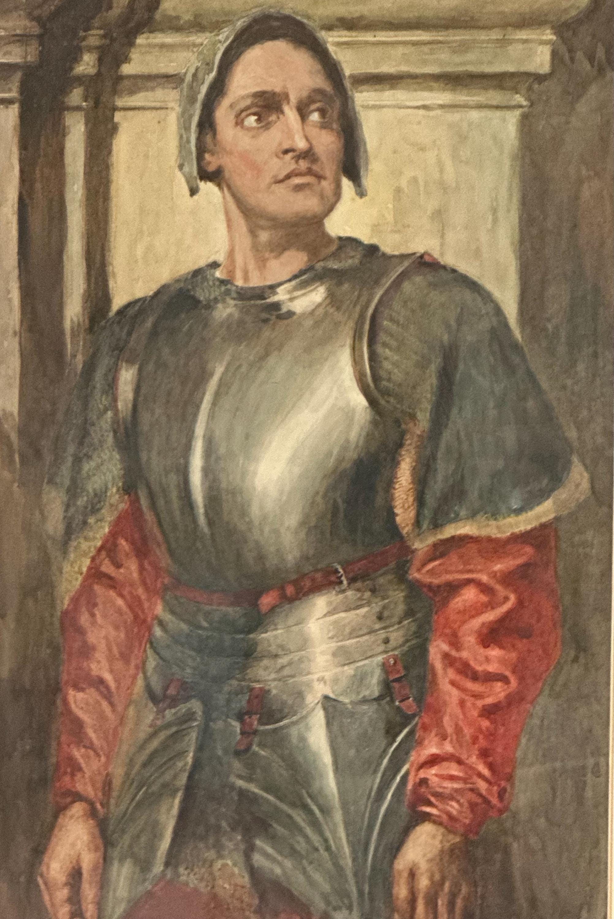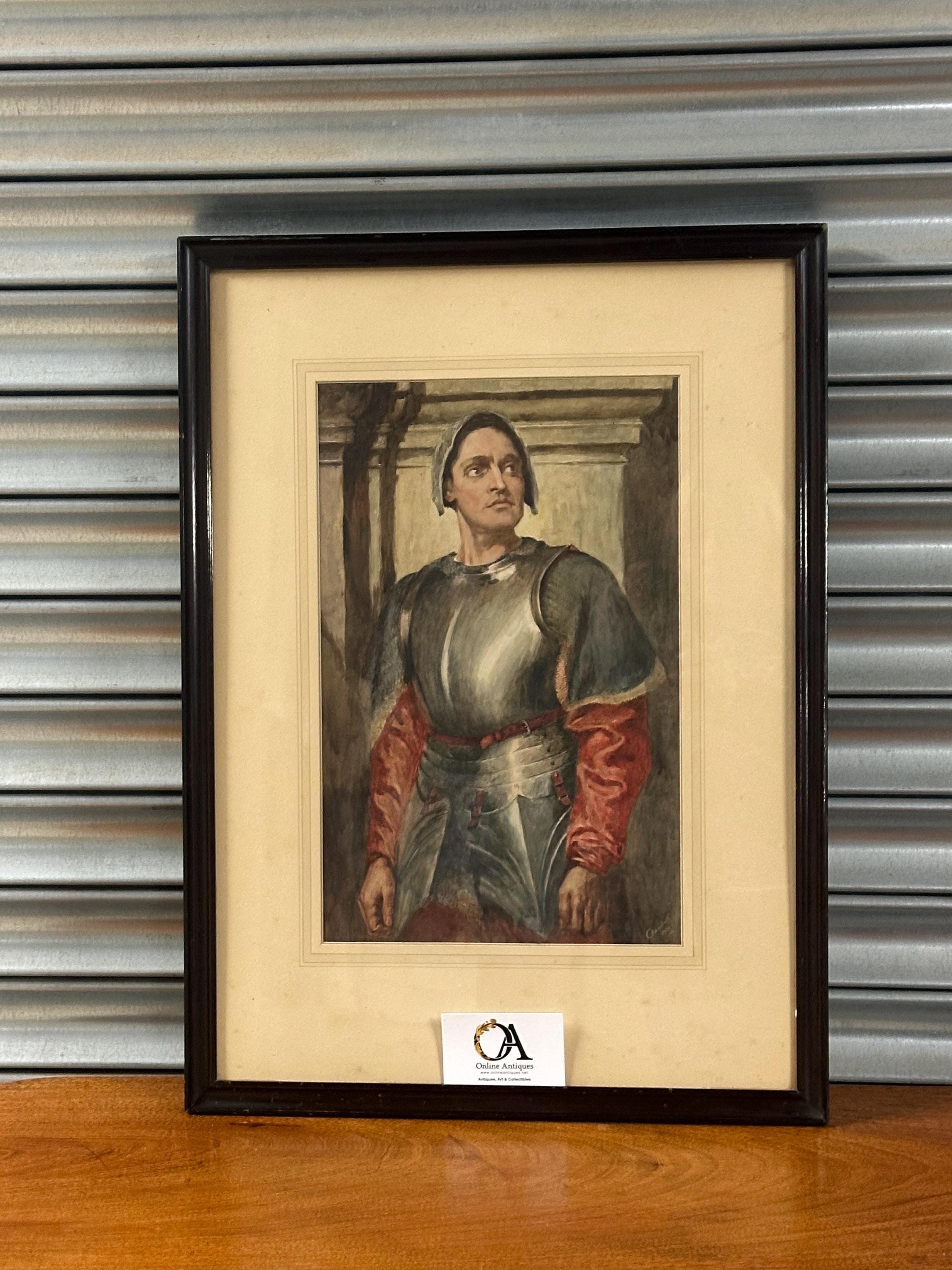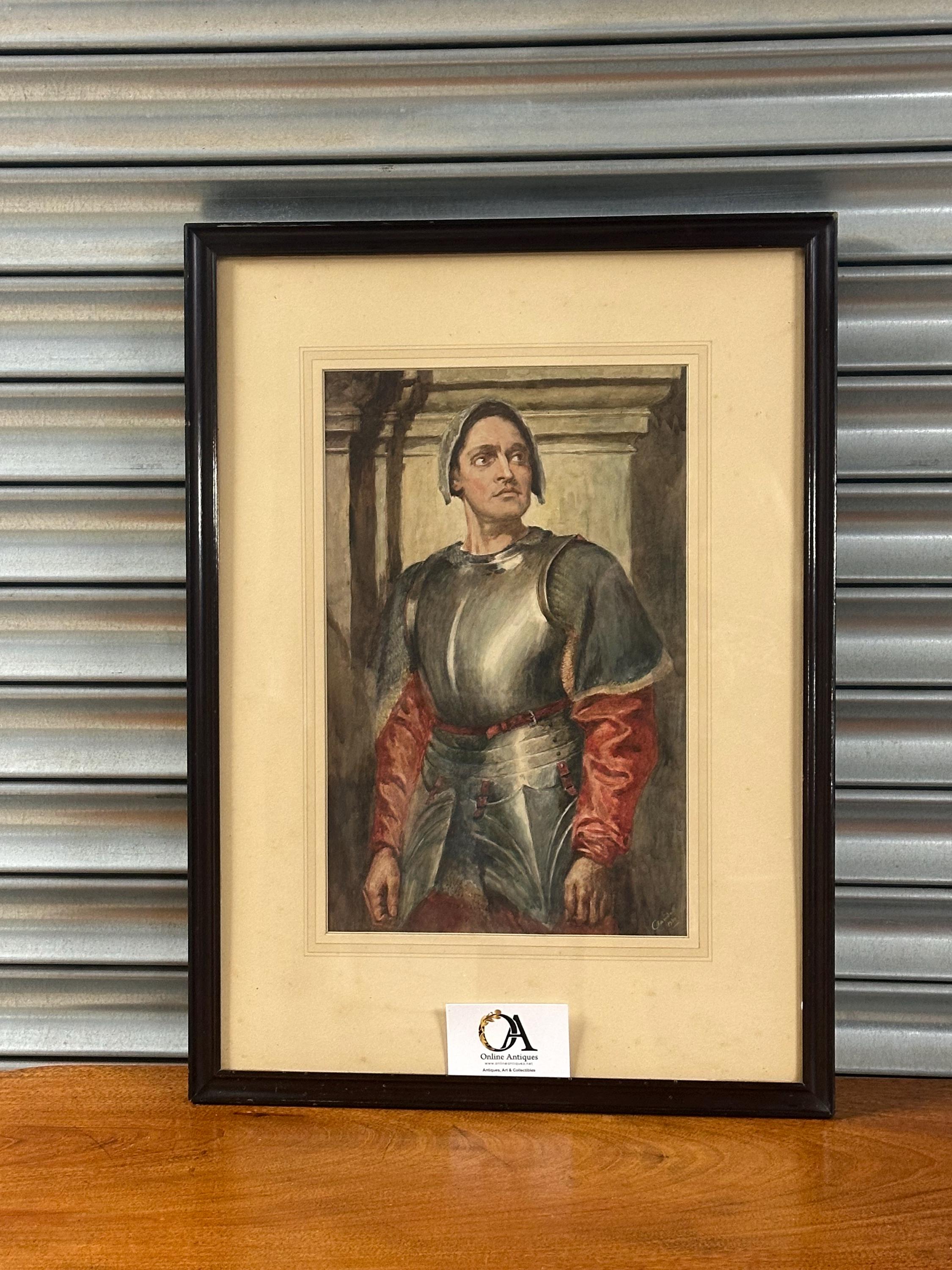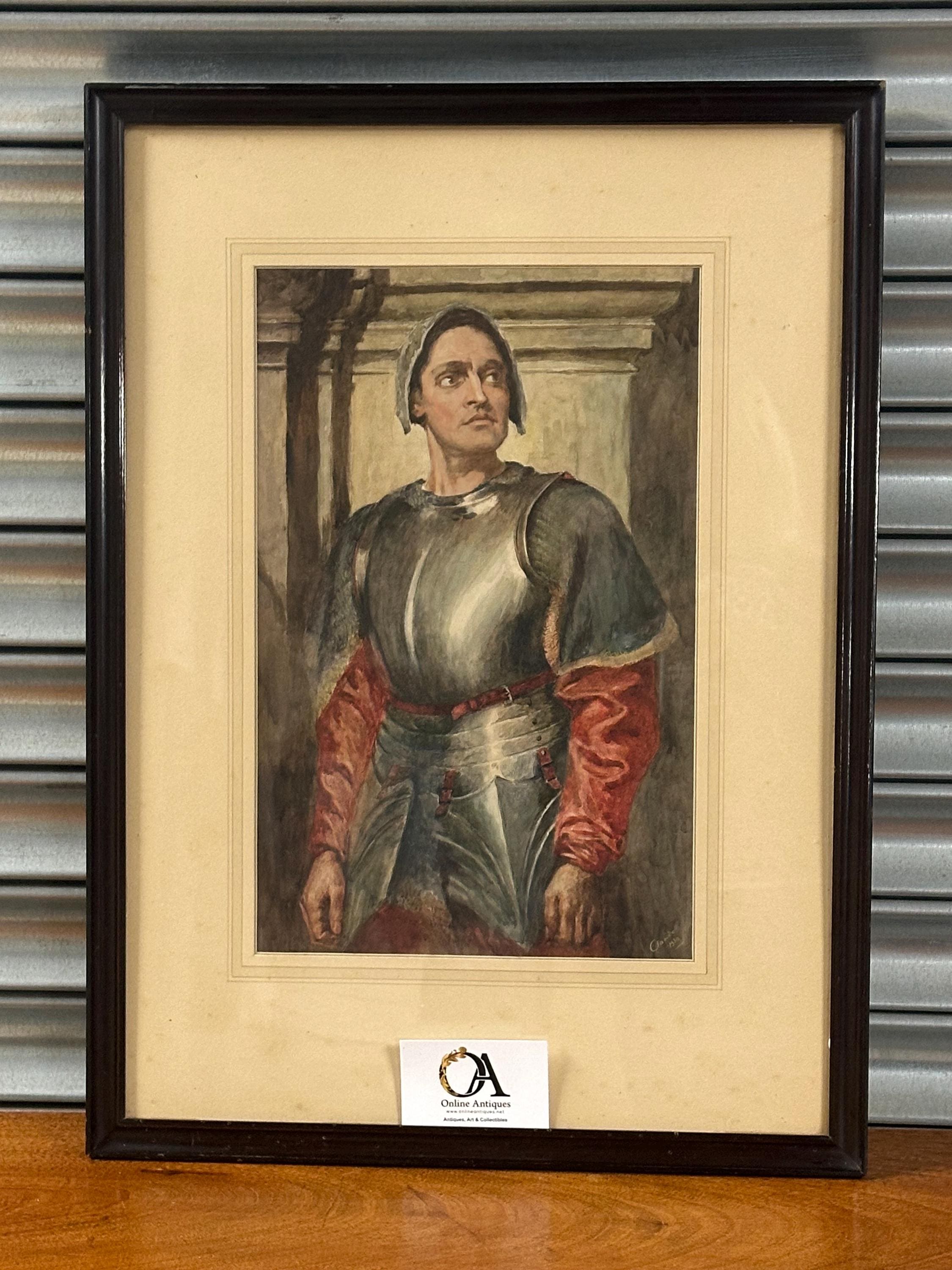 A striking original watercolour depicting “A Condottiere”, after the famous work by Victorian master Frederic Leighton. This finely executed piece captures the strong, noble presence of a Renaissance soldier in armour, with excellent attention to detail in the metallic tones and facial expression.