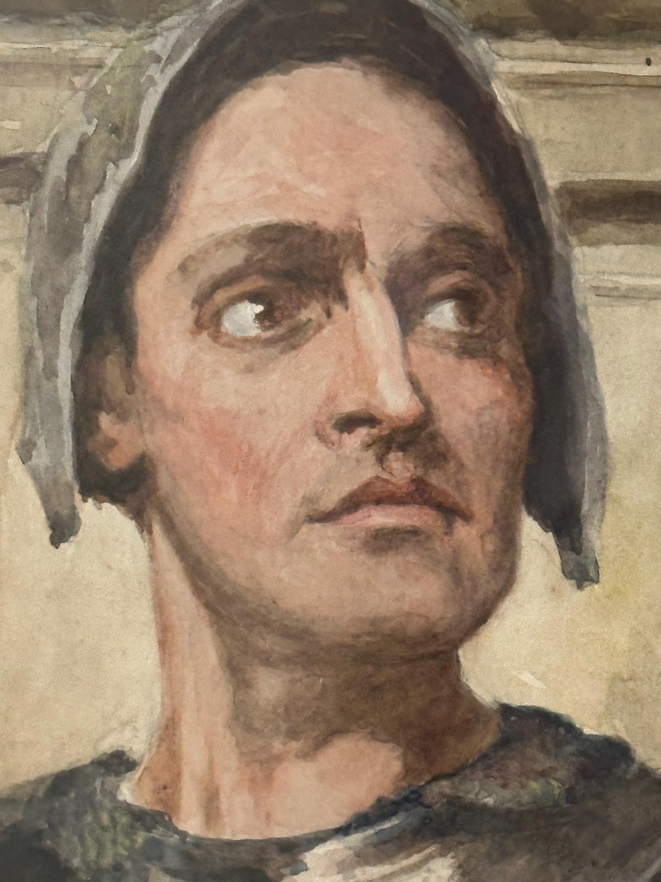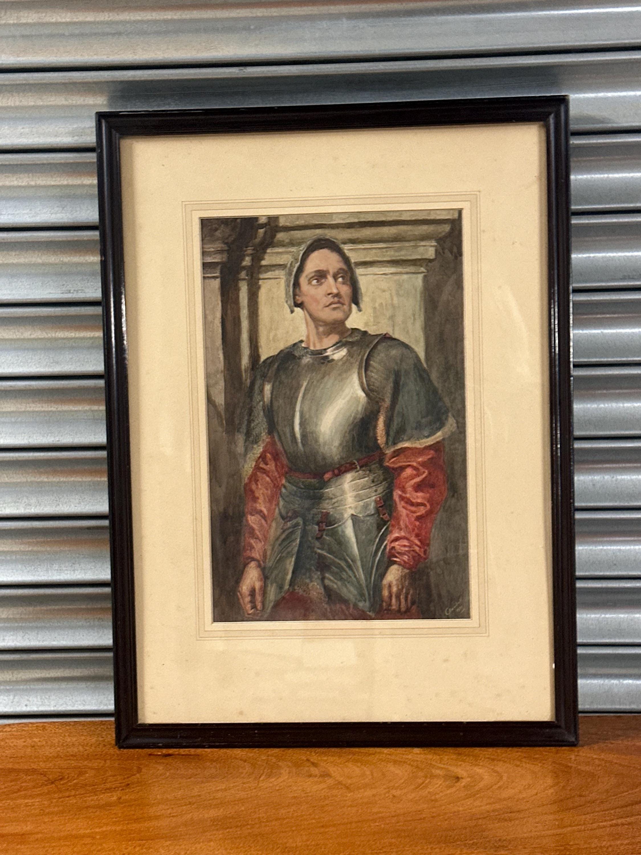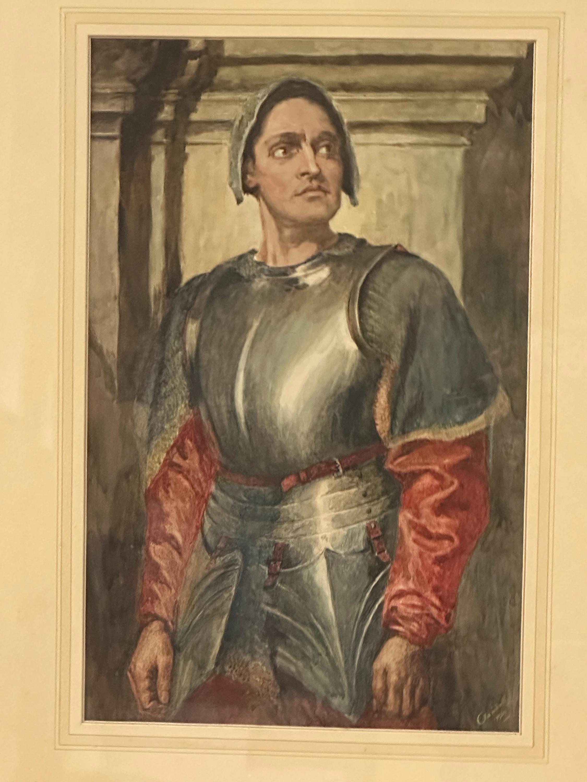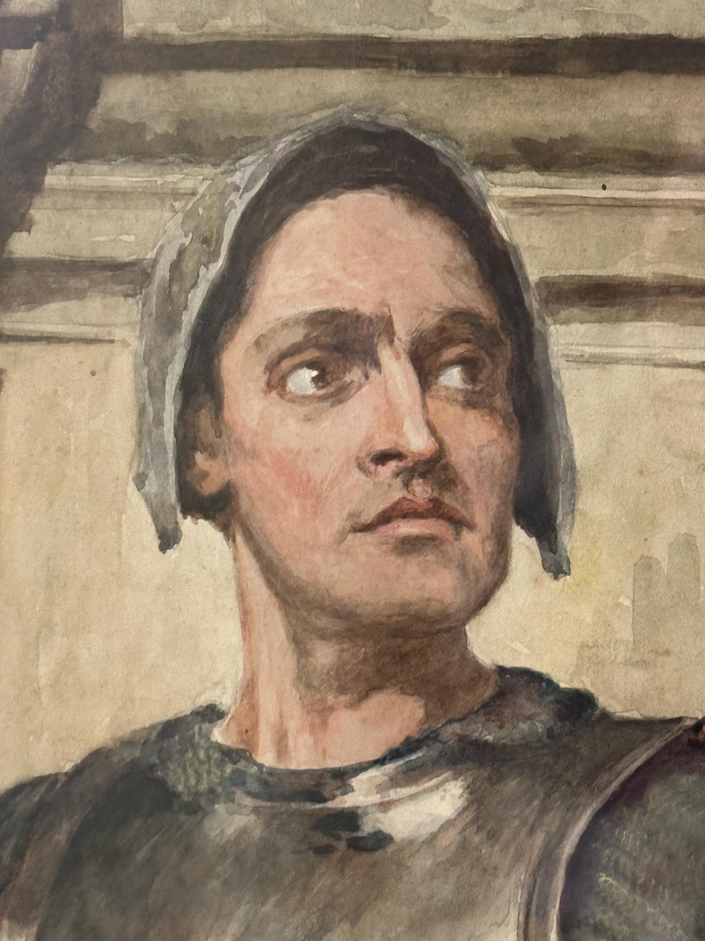 A striking original watercolour depicting “A Condottiere”, after the famous work by Victorian master Frederic Leighton. This finely executed piece captures the strong, noble presence of a Renaissance soldier in armour, with excellent attention to detail in the metallic tones and facial expression.