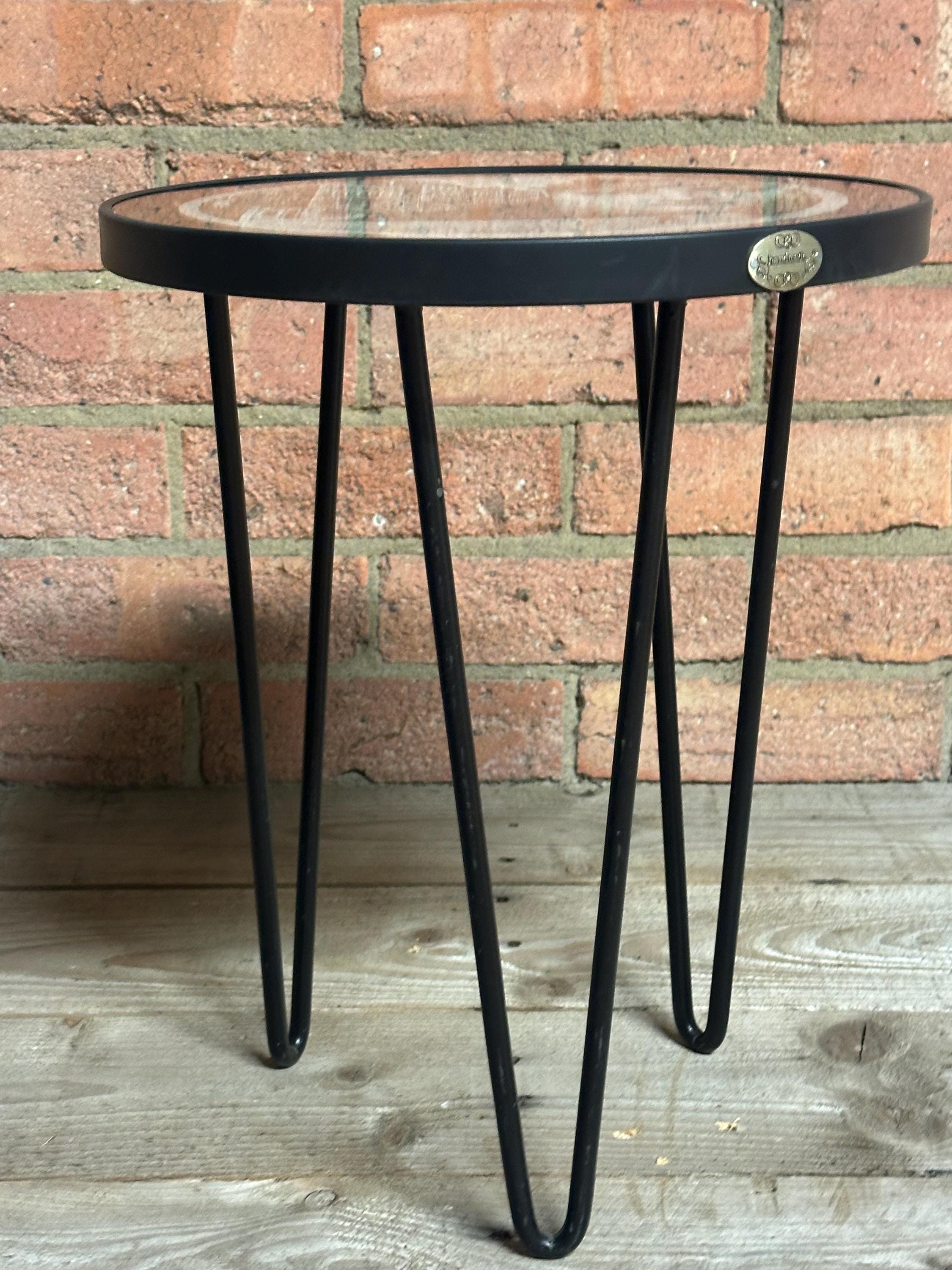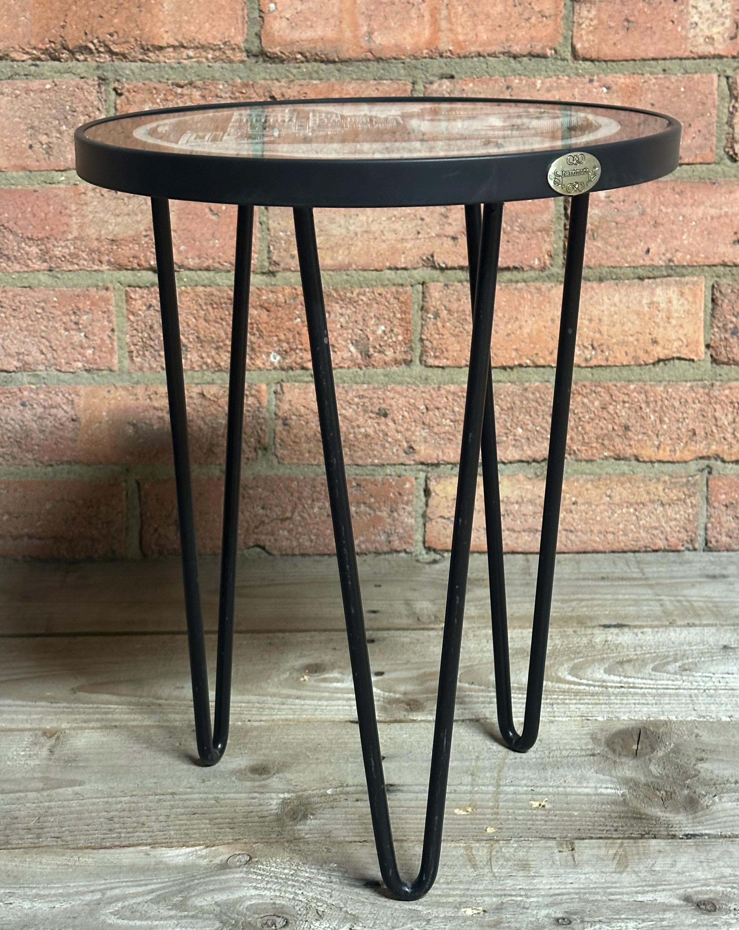 The circular top displays a beautifully detailed monochrome cityscape with the enigmatic female face—believed to be inspired by opera singer Lina Cavalieri—creating a bold visual statement. Set within a black surround and raised on sleek black hairpin-style legs, this piece blends mid-century modern design with timeless artistic flair.