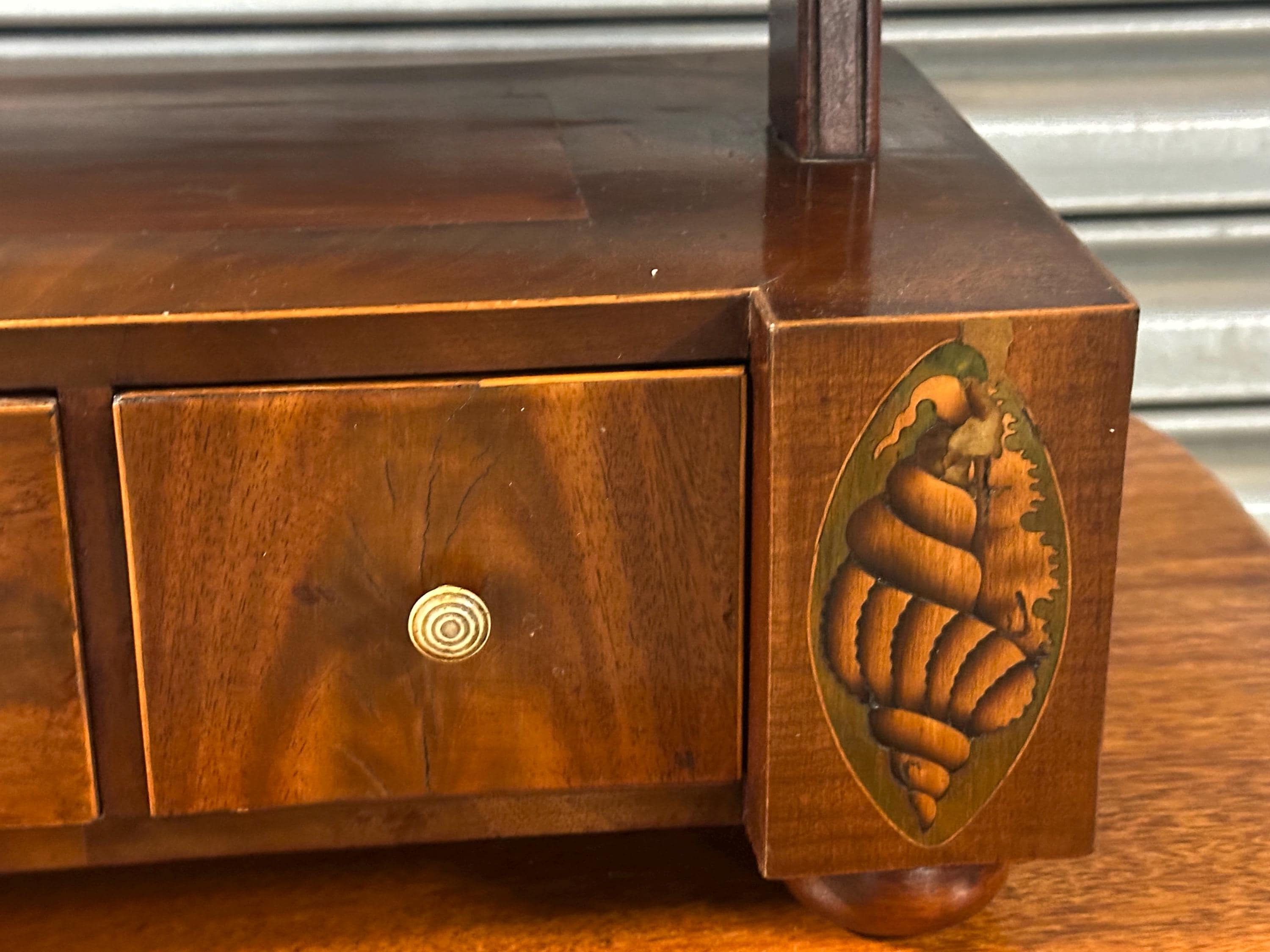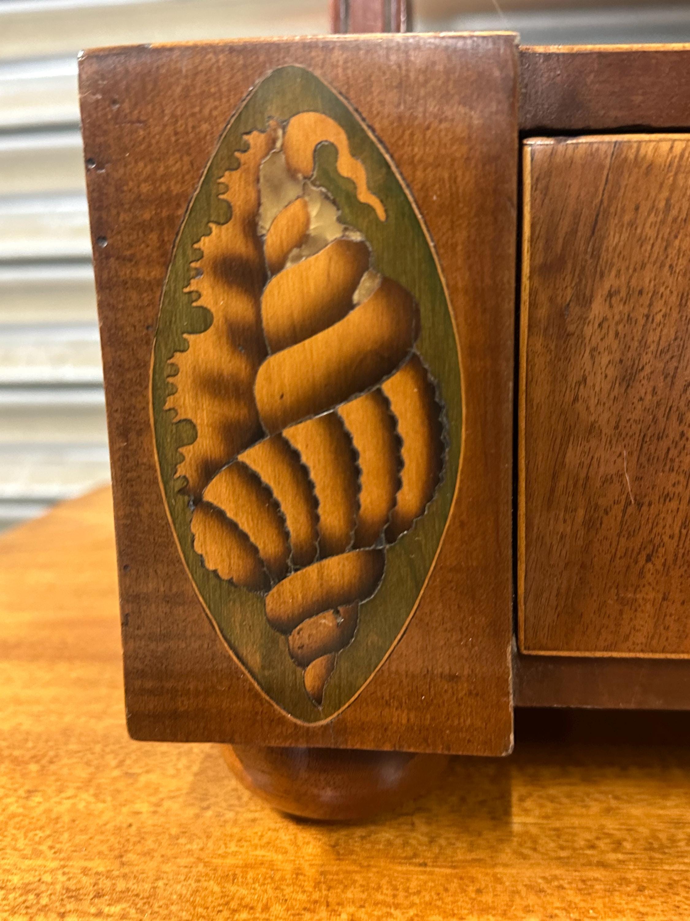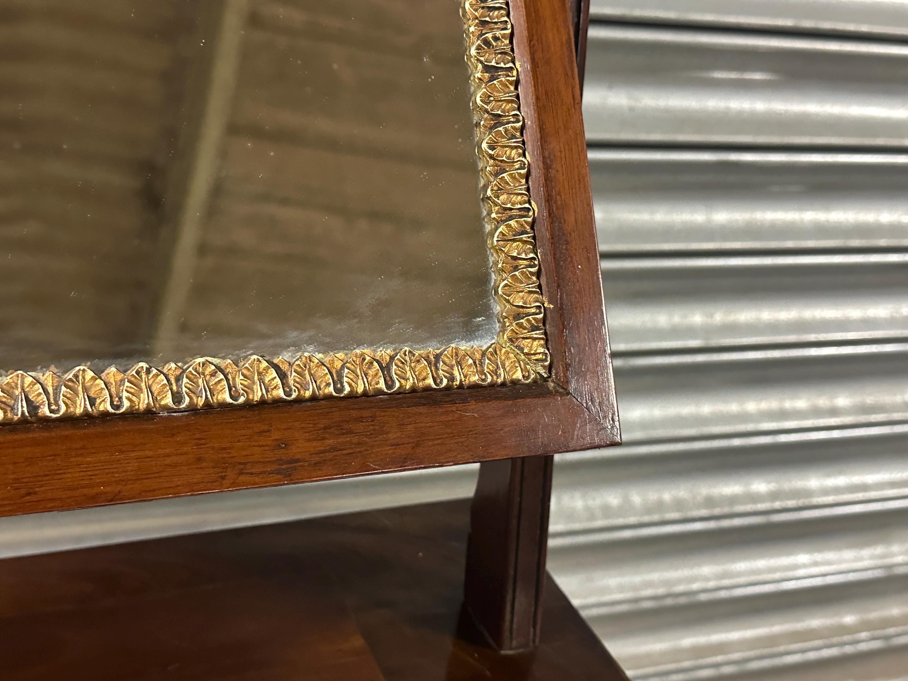In good antique condition overall. The mirror plate shows some age-relating marks consistent with age and adding authentic character. Light wear to the polish and minor marks as expected from use. Some loss to shell inlay, see close up photos. Structurally sound and displays beautifully.