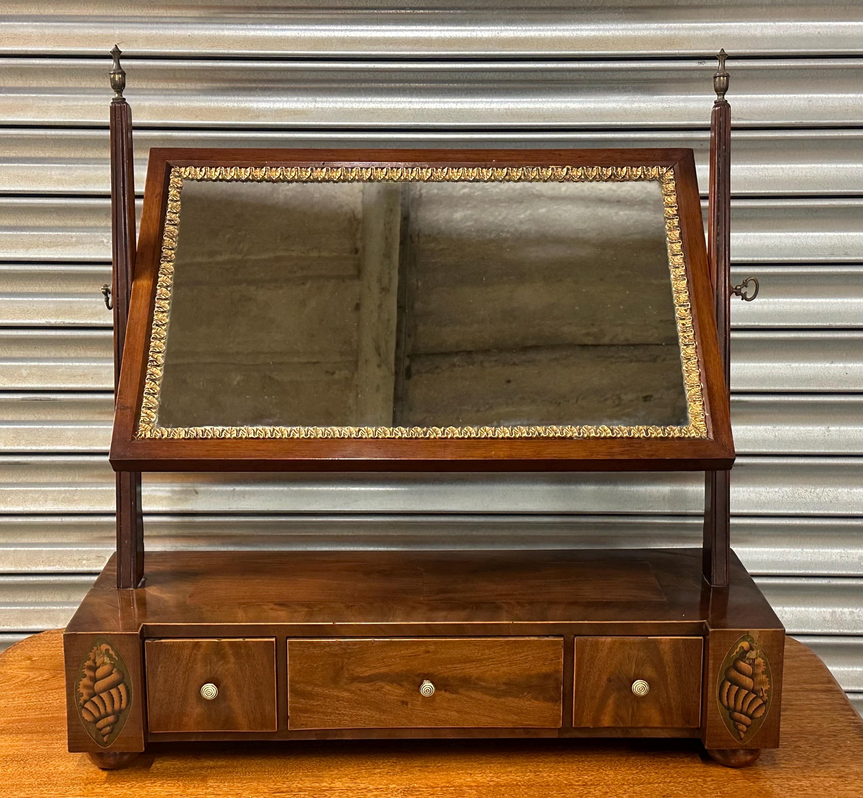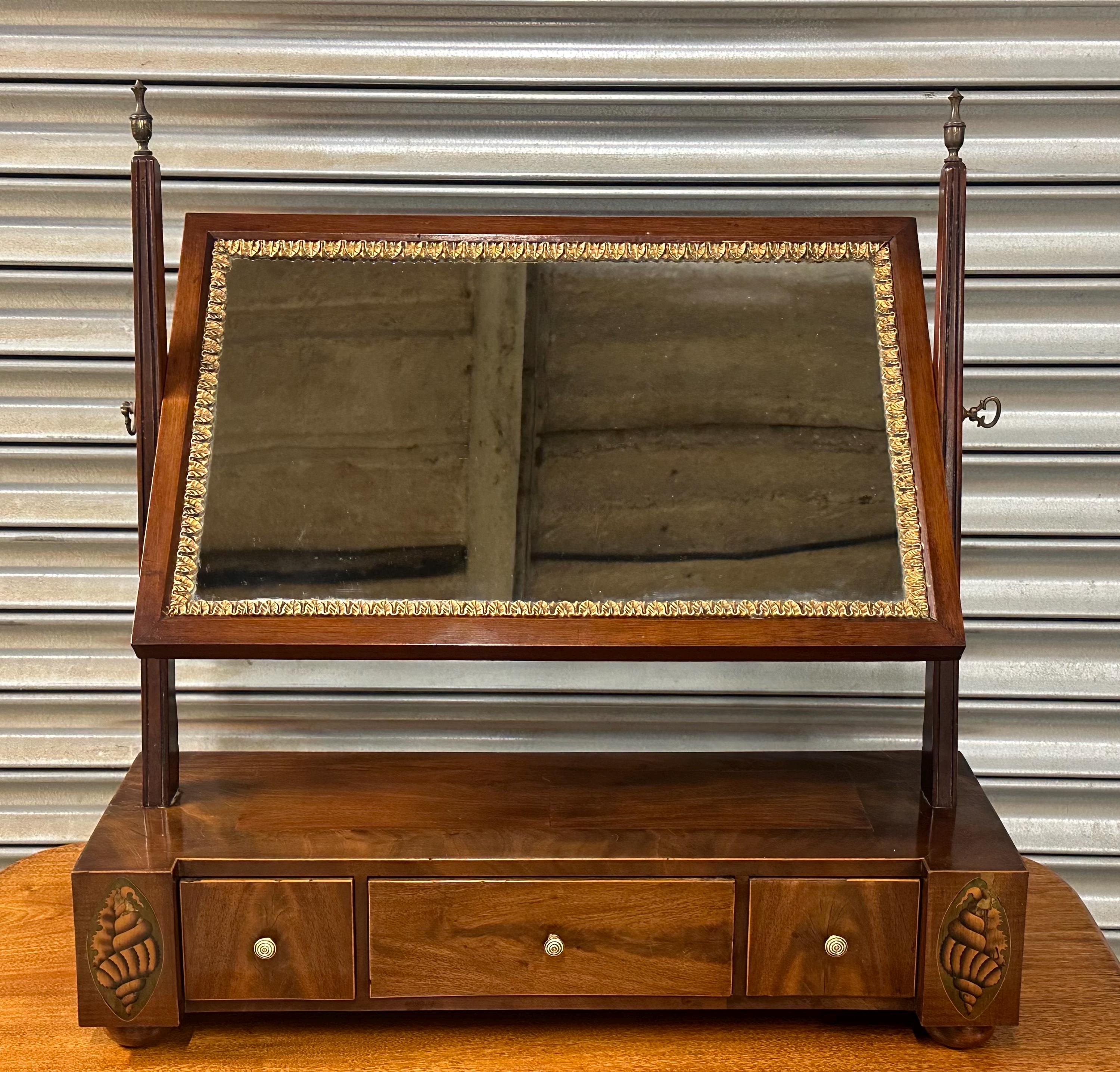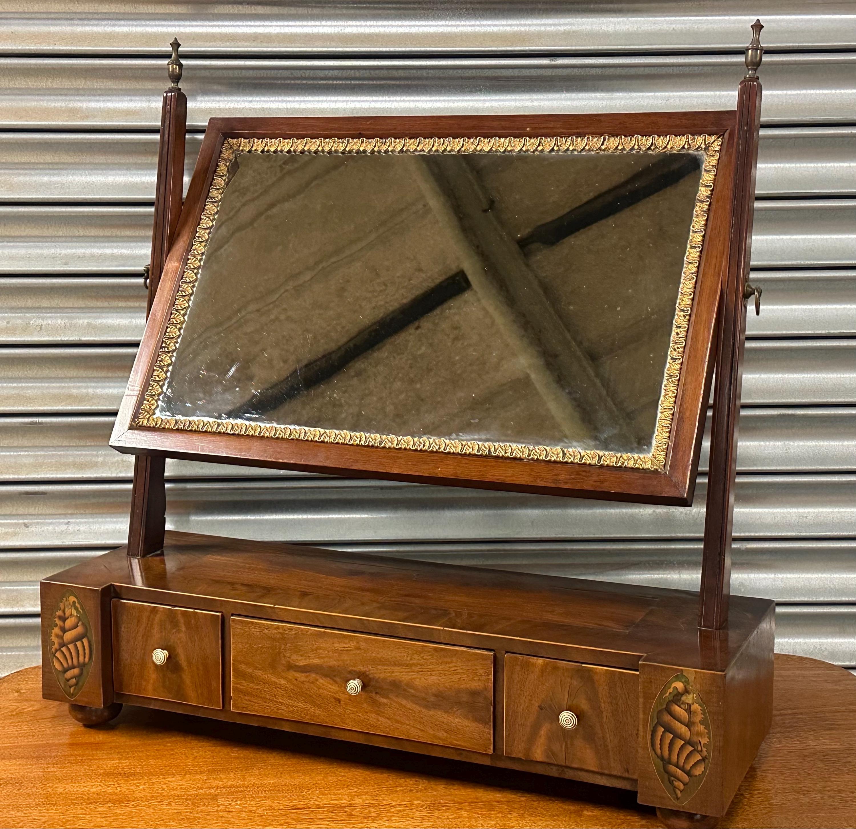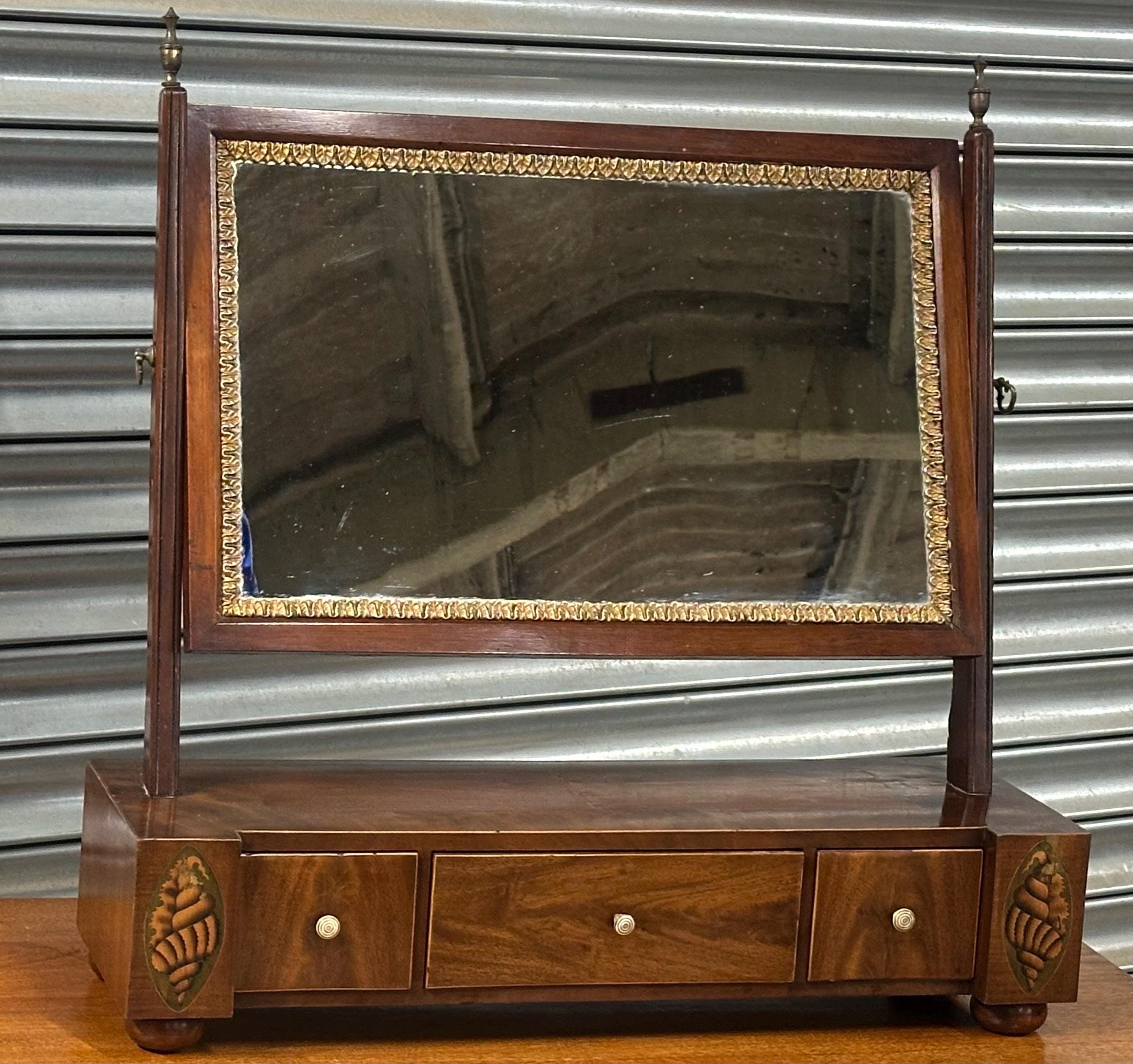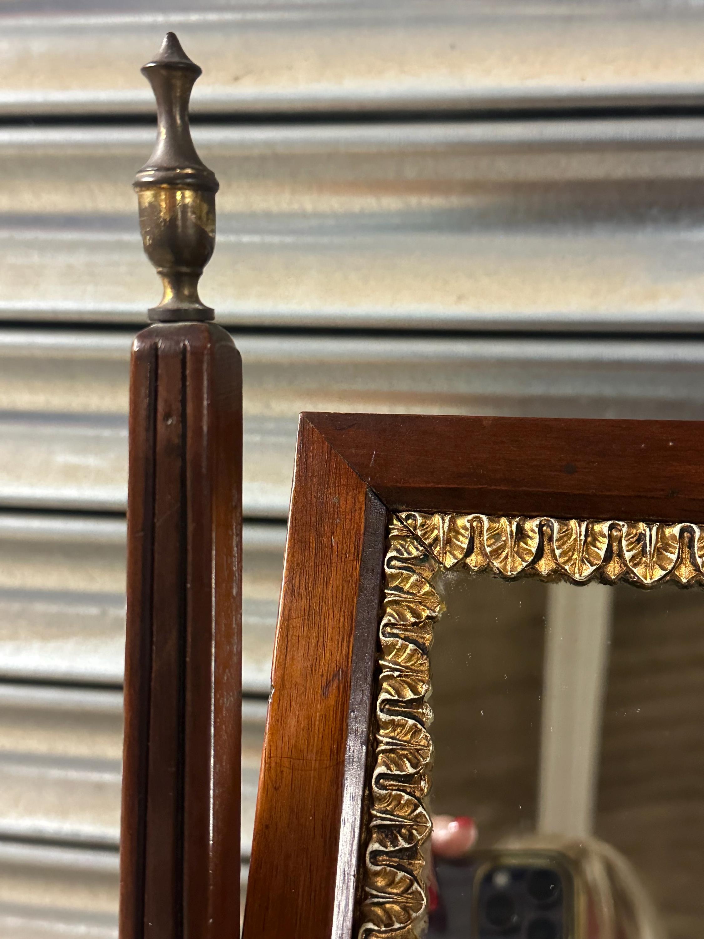 This is a classic toilet mirror form, featuring a rectangular gilt edge decorated mirror plate set within a finely crafted mahogany frame. The mirror is supported by elegant uprights with turned finials, and retains its original tilting mechanism with brass side adjusters.