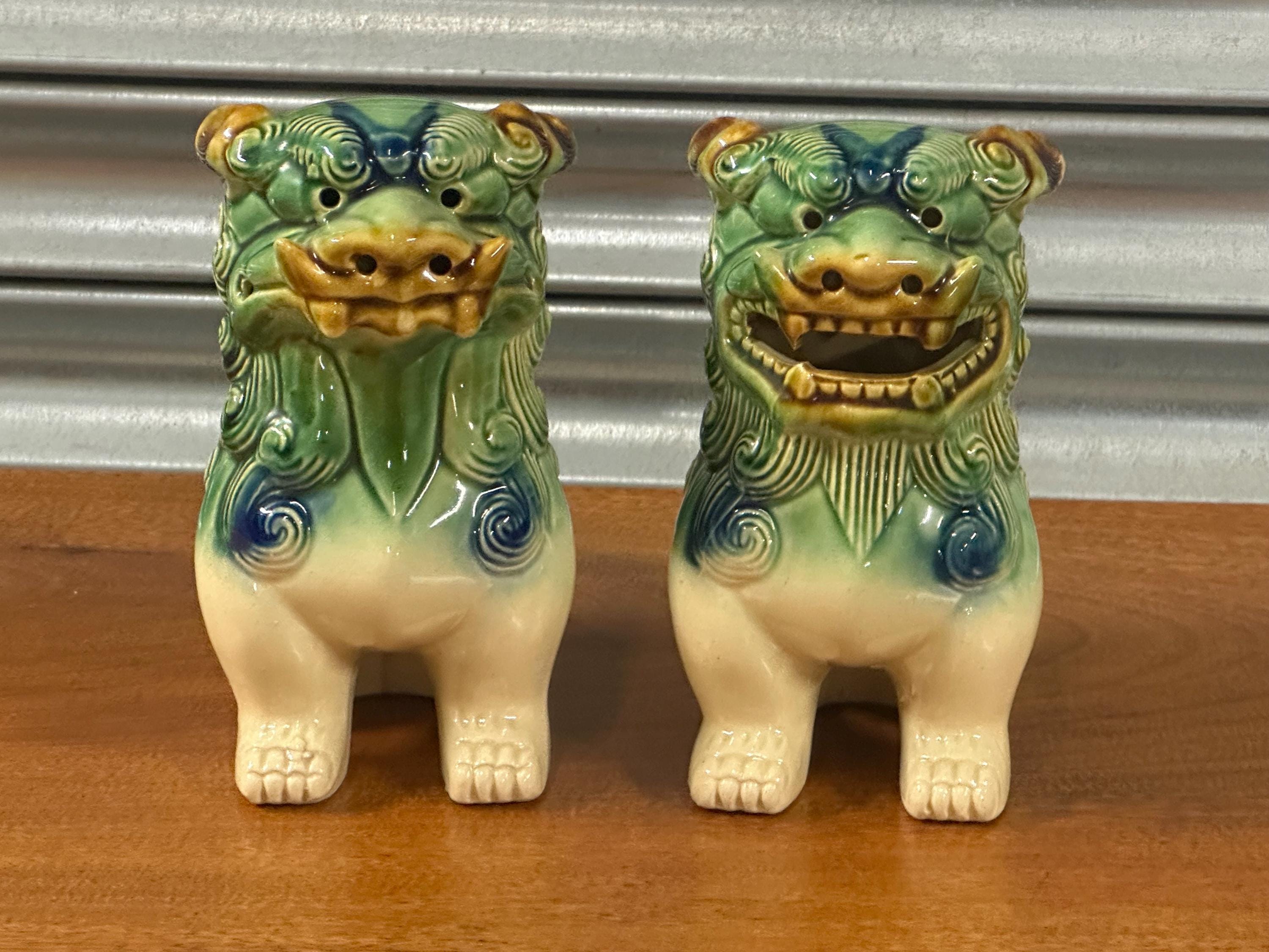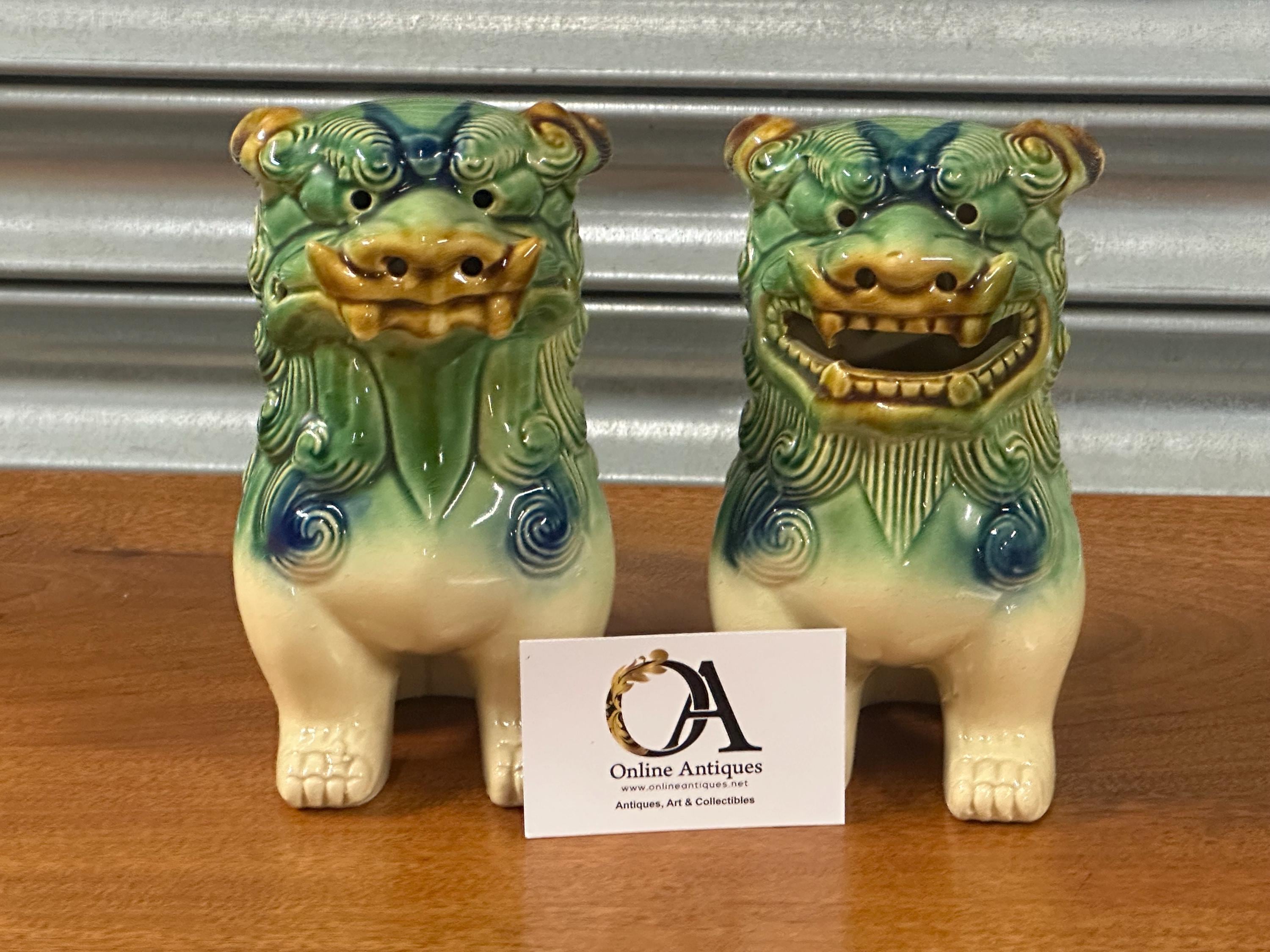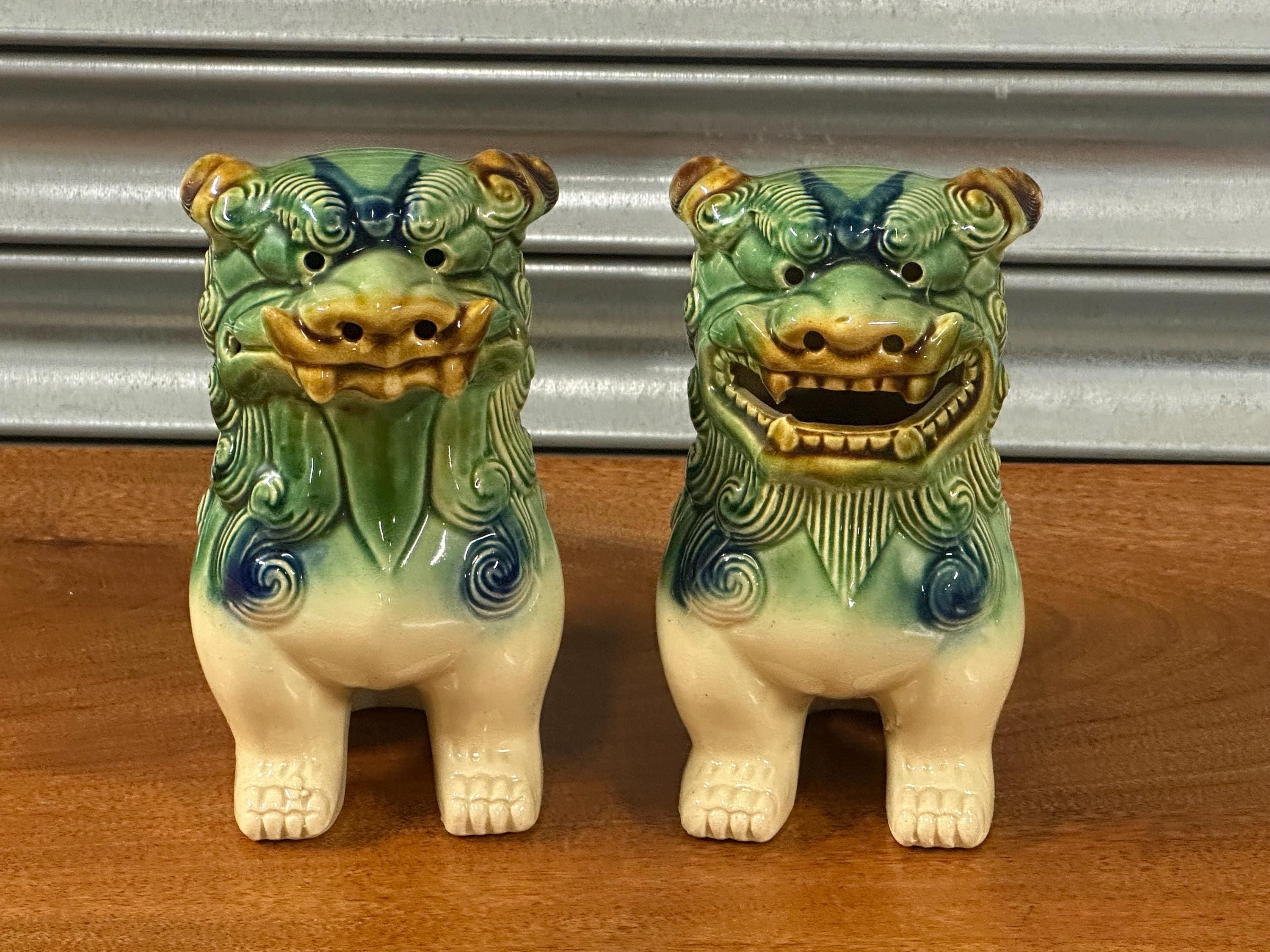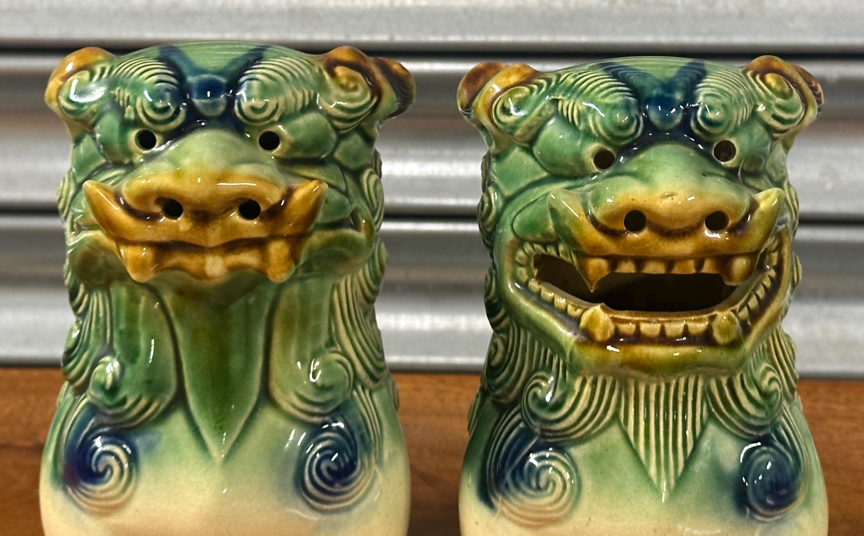 A striking vintage pair of Chinese Foo Dogs (Guardian Lions), dating to the mid-20th century, circa 1950s–60s. These beautifully modelled decorative figures are finished in a vibrant green glaze with darker blue accents and warm ochre highlights to the facial features, giving them a bold and characterful presence.