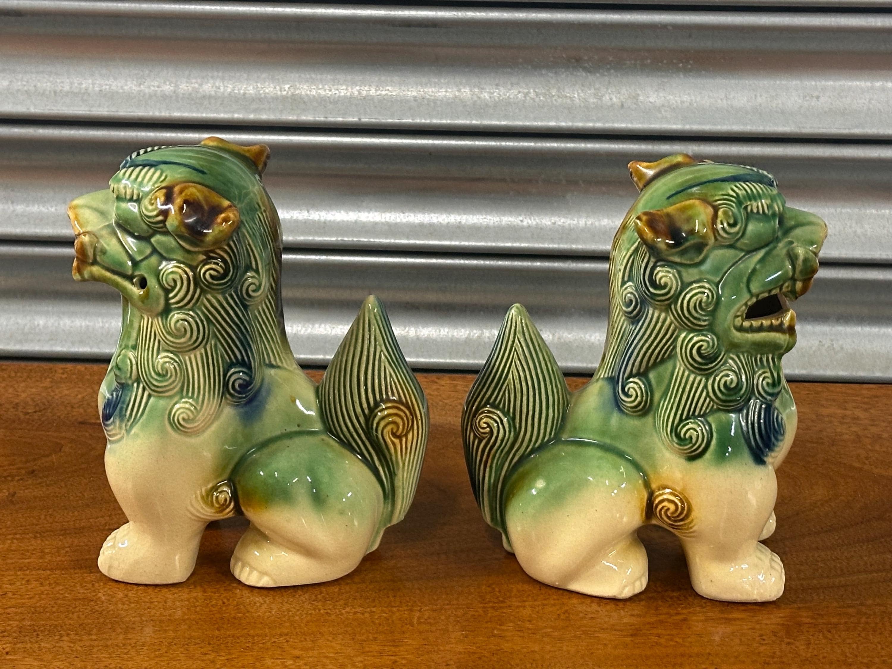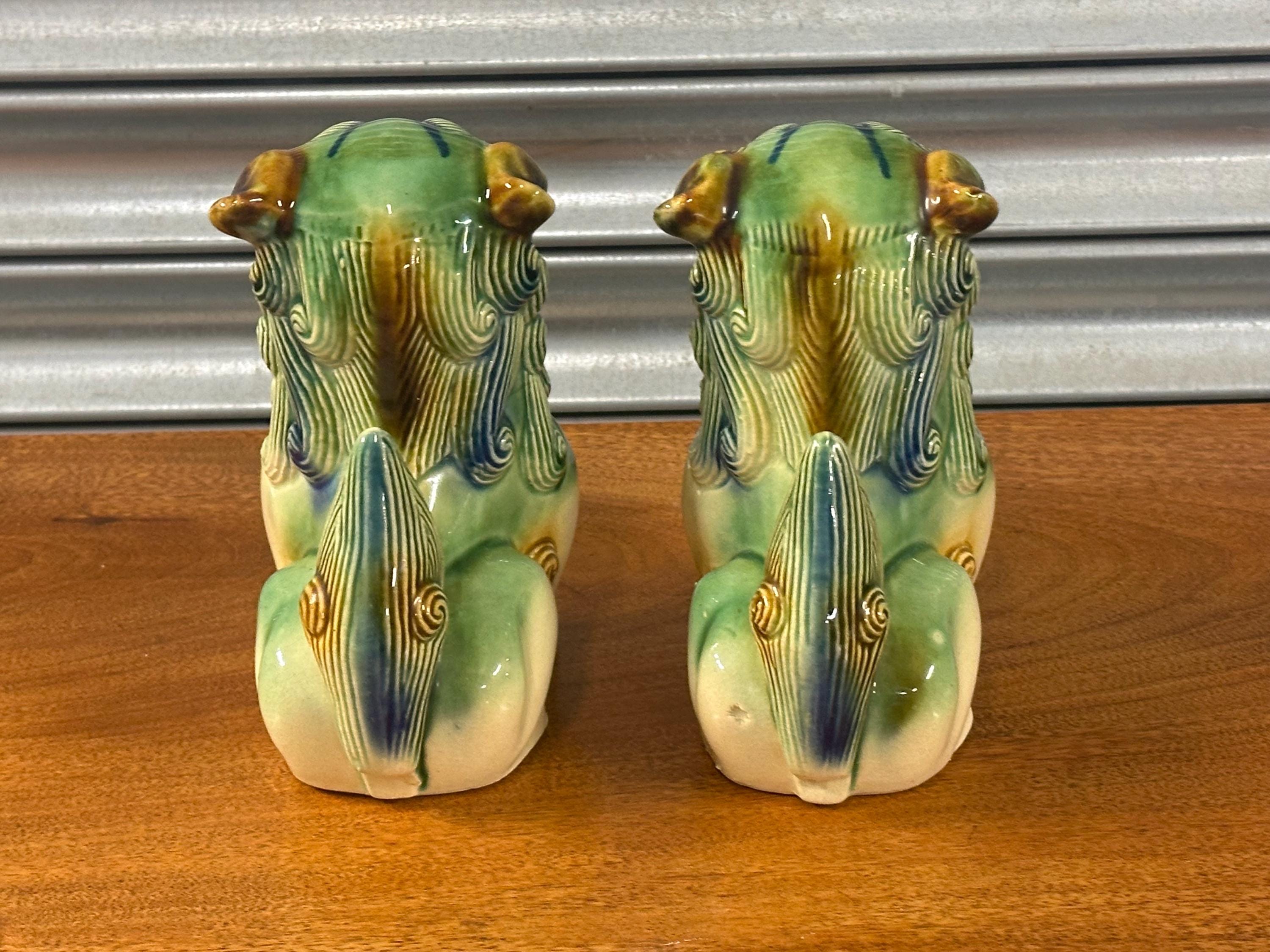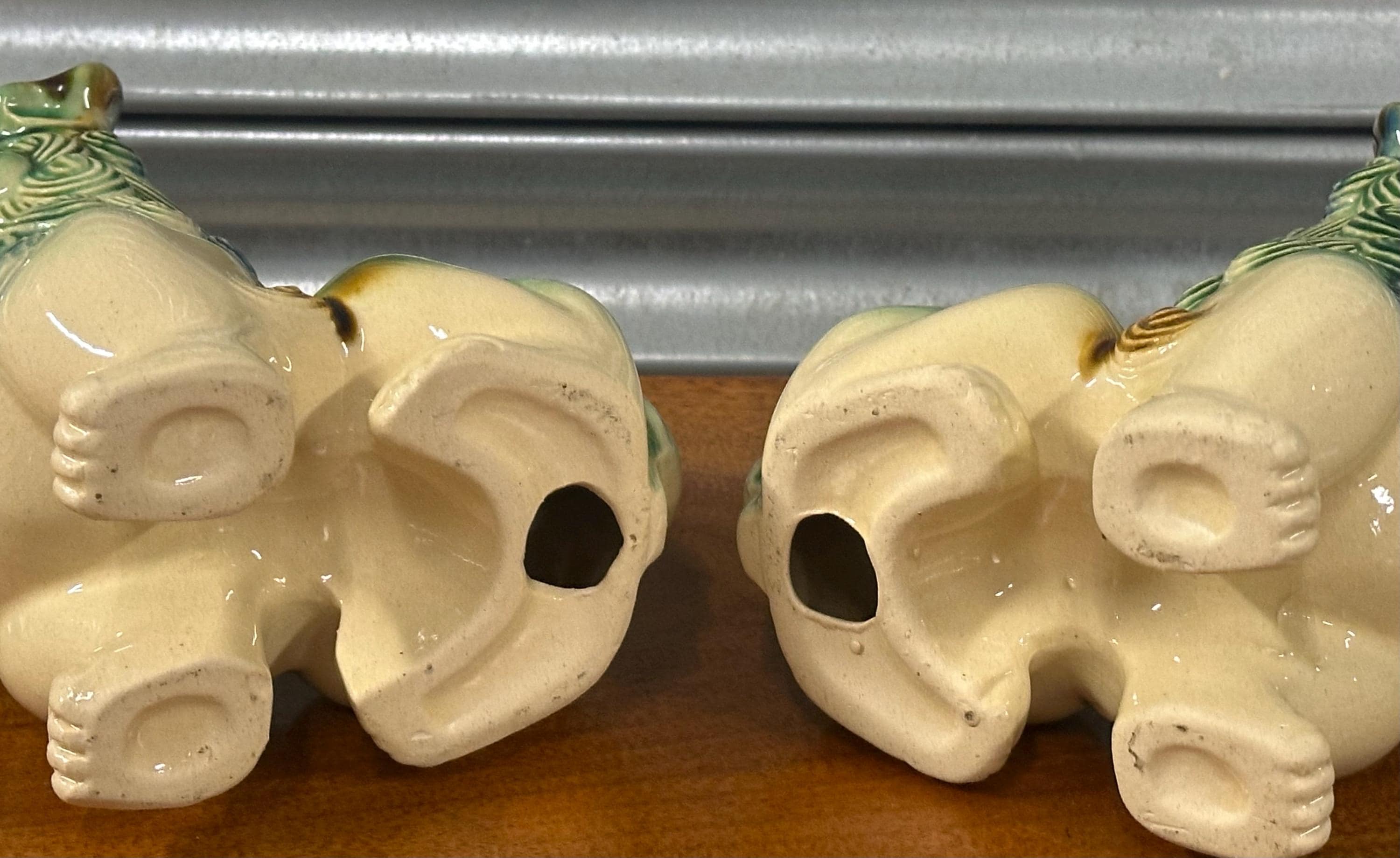 A striking vintage pair of Chinese Foo Dogs (Guardian Lions), dating to the mid-20th century, circa 1950s–60s. These beautifully modelled decorative figures are finished in a vibrant green glaze with darker blue accents and warm ochre highlights to the facial features, giving them a bold and characterful presence.