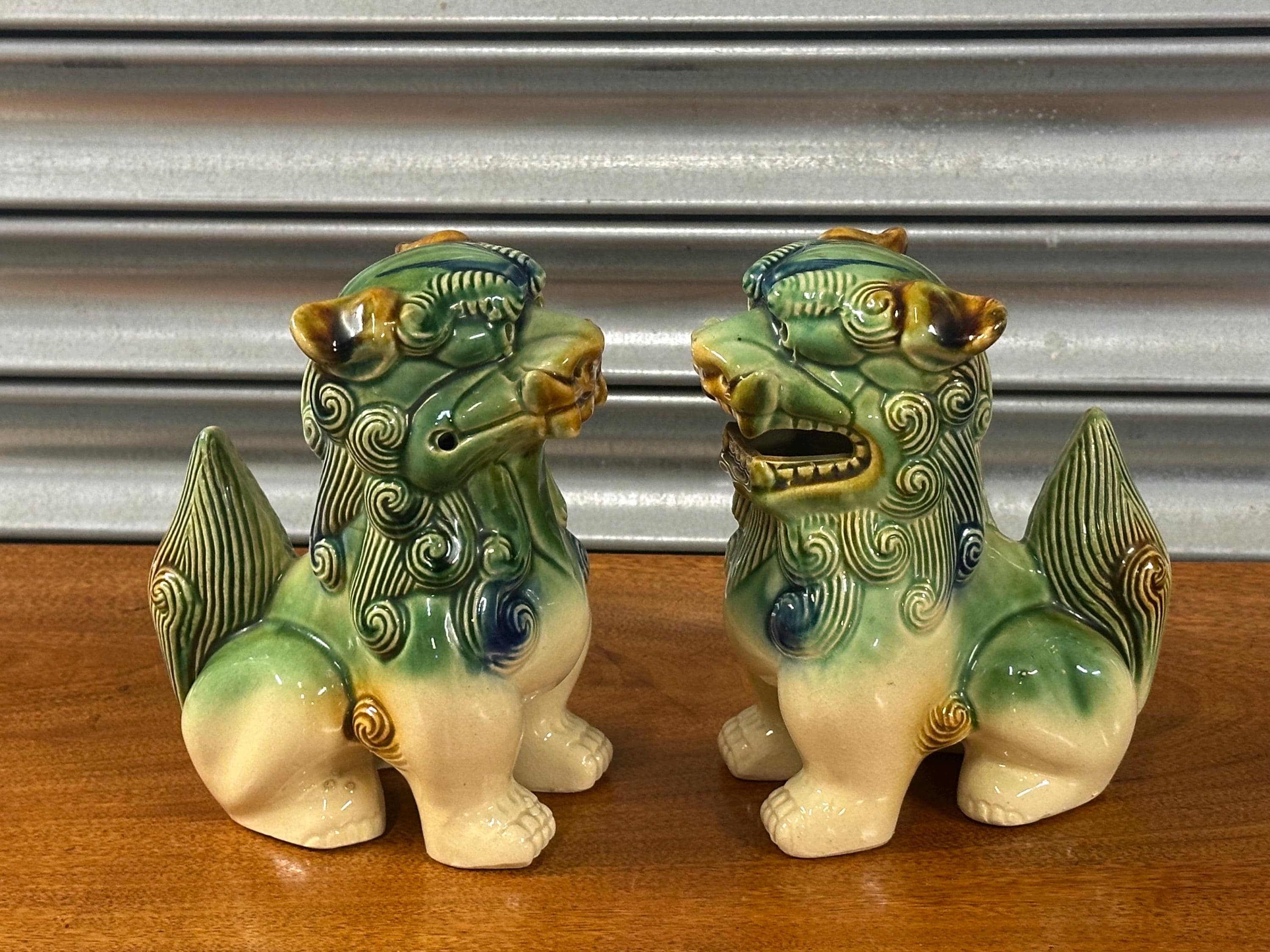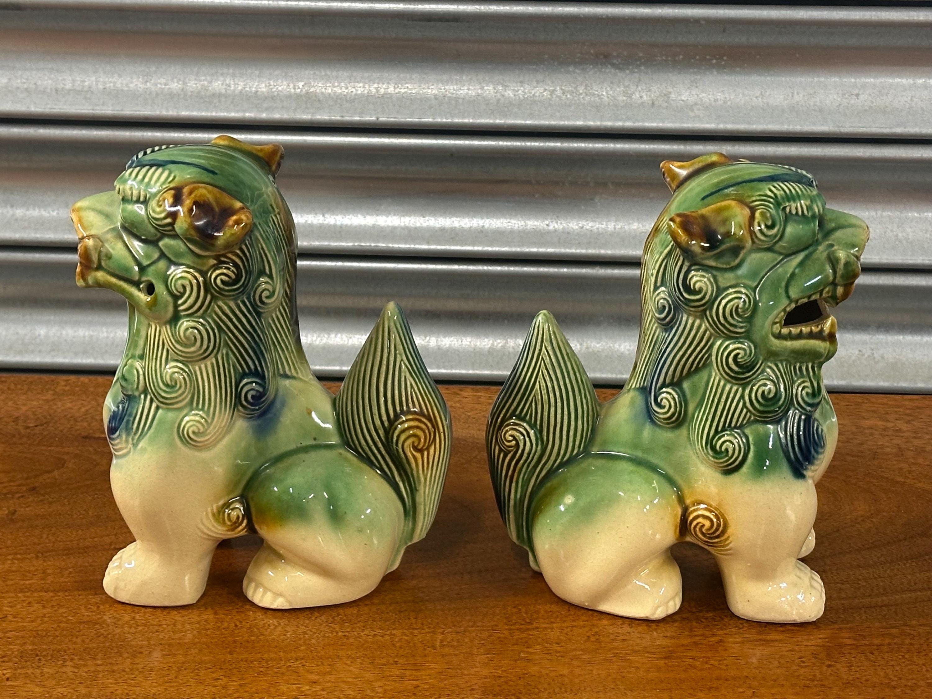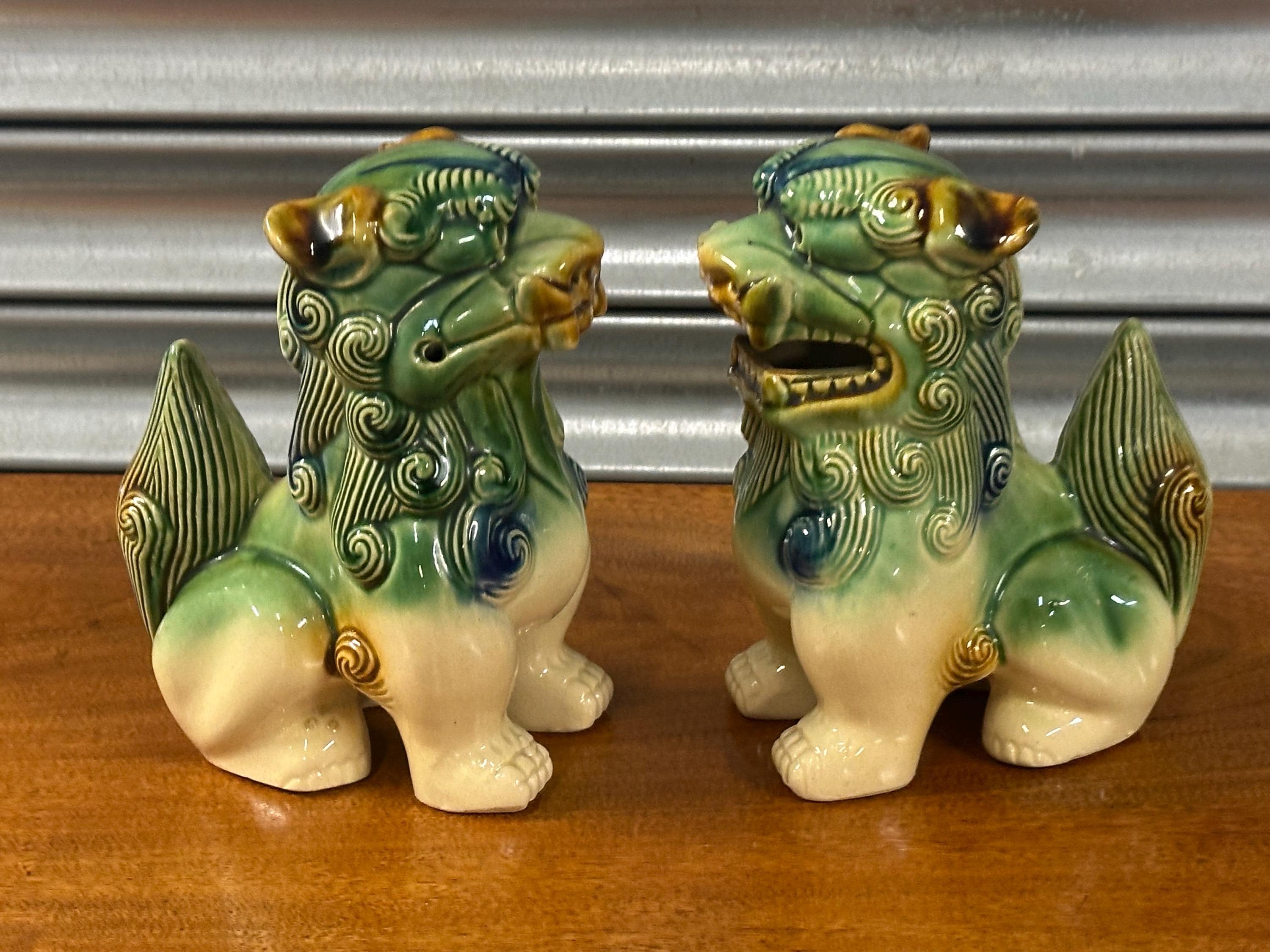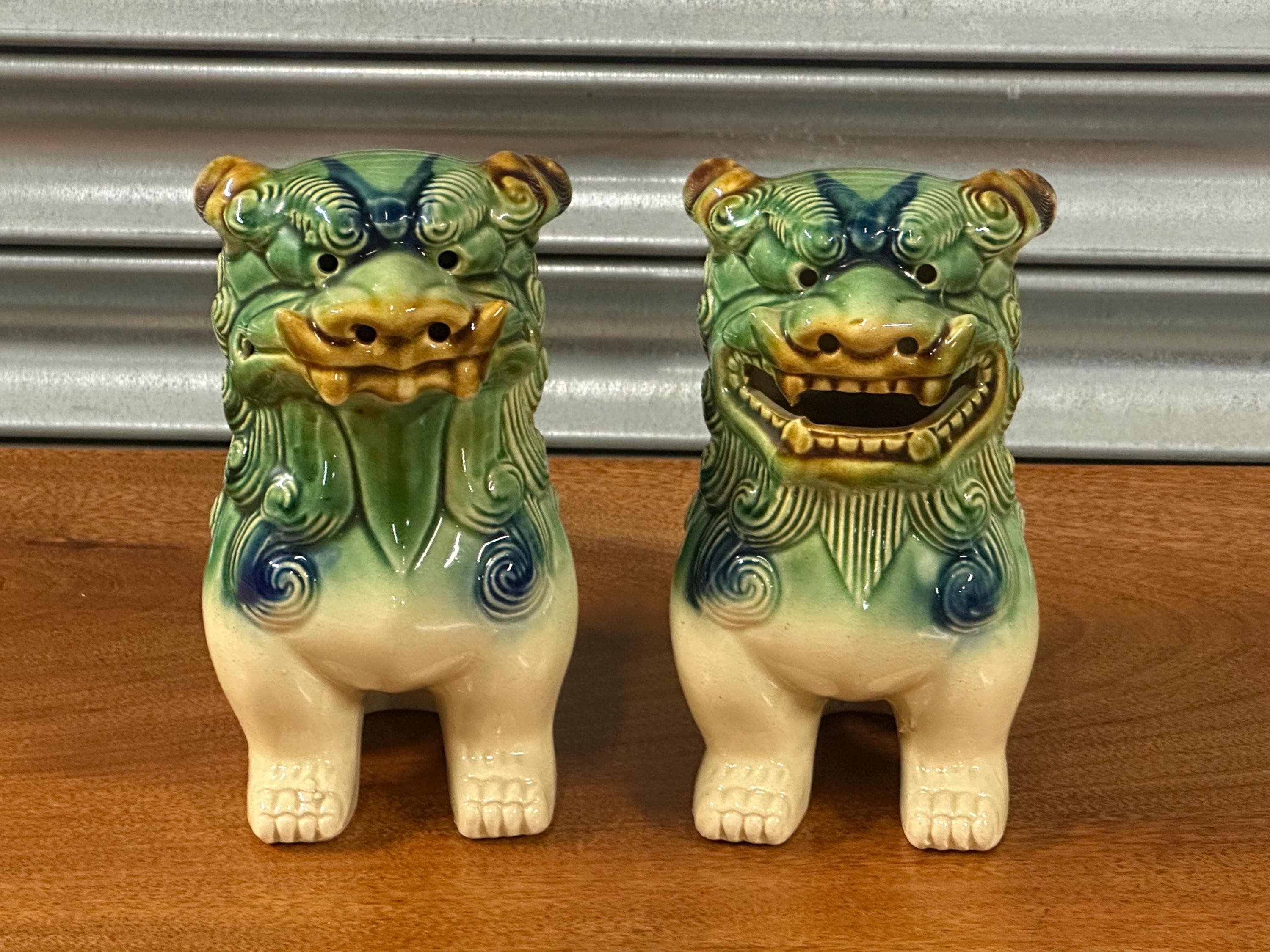 A striking vintage pair of Chinese Foo Dogs (Guardian Lions), dating to the mid-20th century, circa 1950s–60s. These beautifully modelled decorative figures are finished in a vibrant green glaze with darker blue accents and warm ochre highlights to the facial features, giving them a bold and characterful presence.