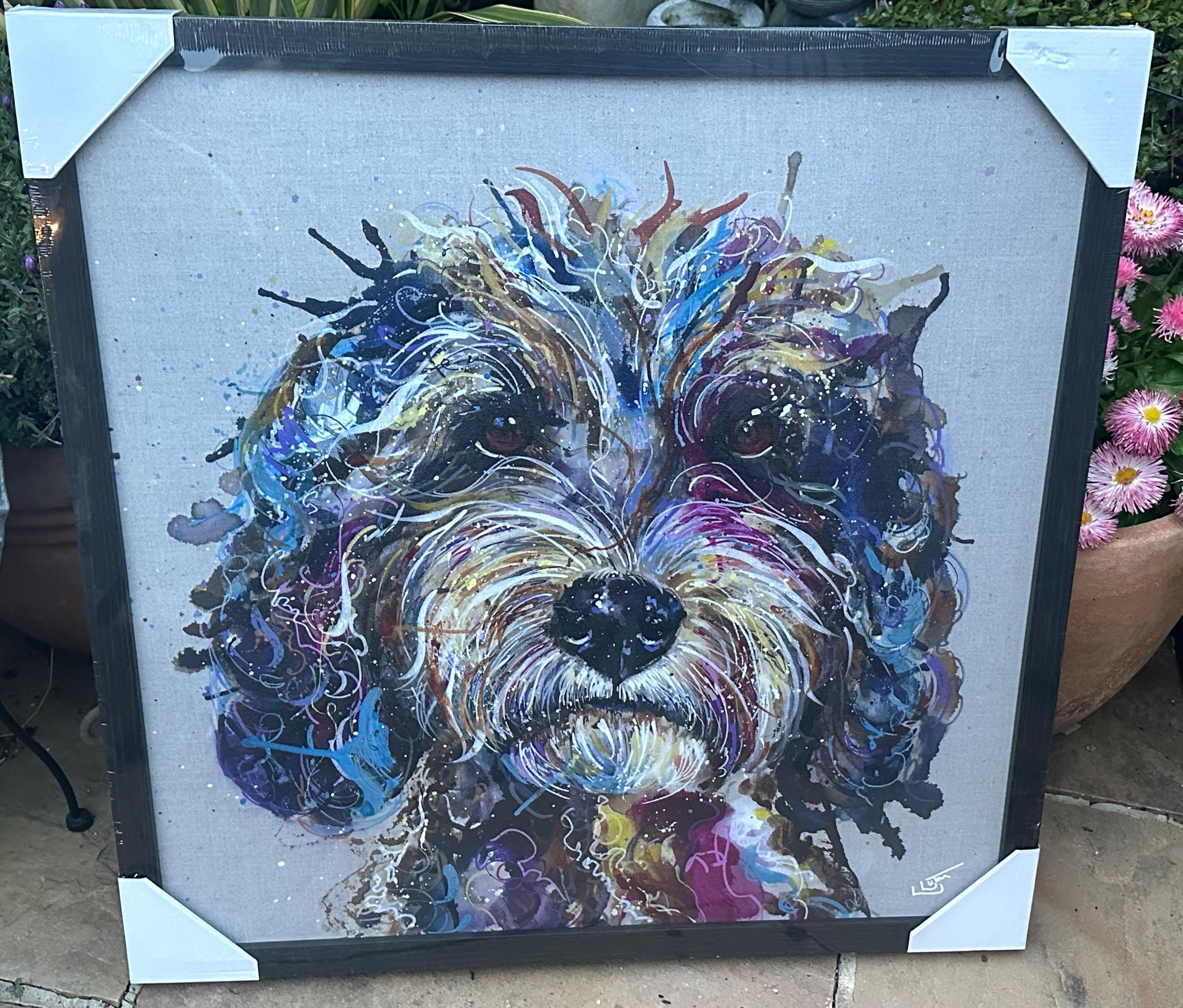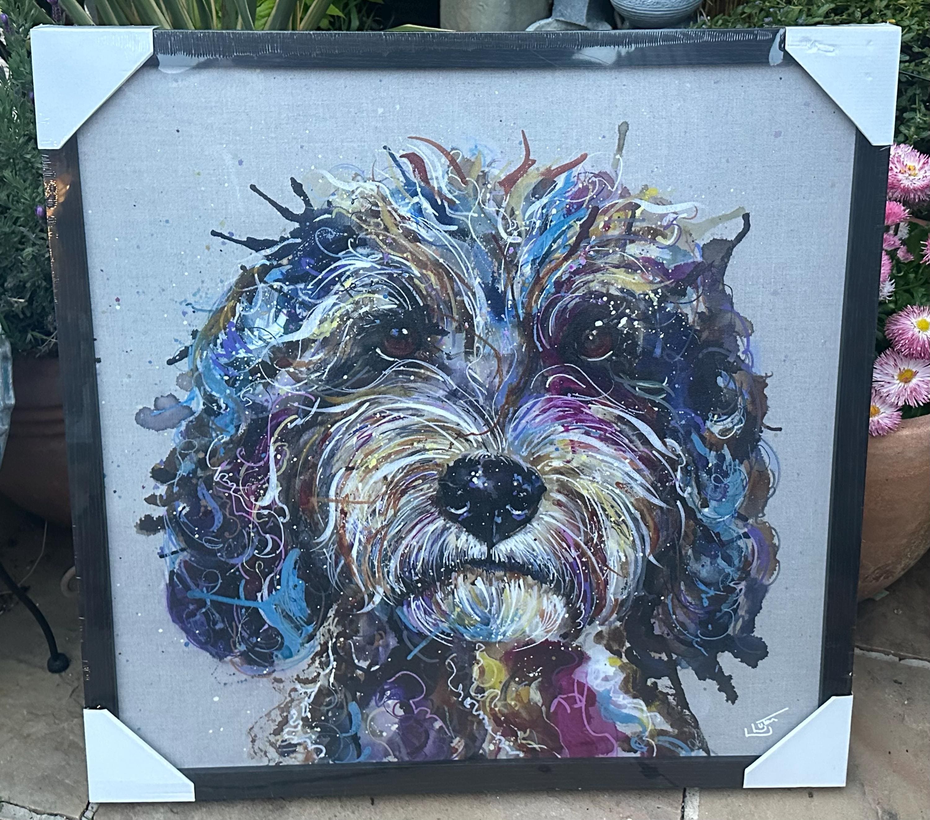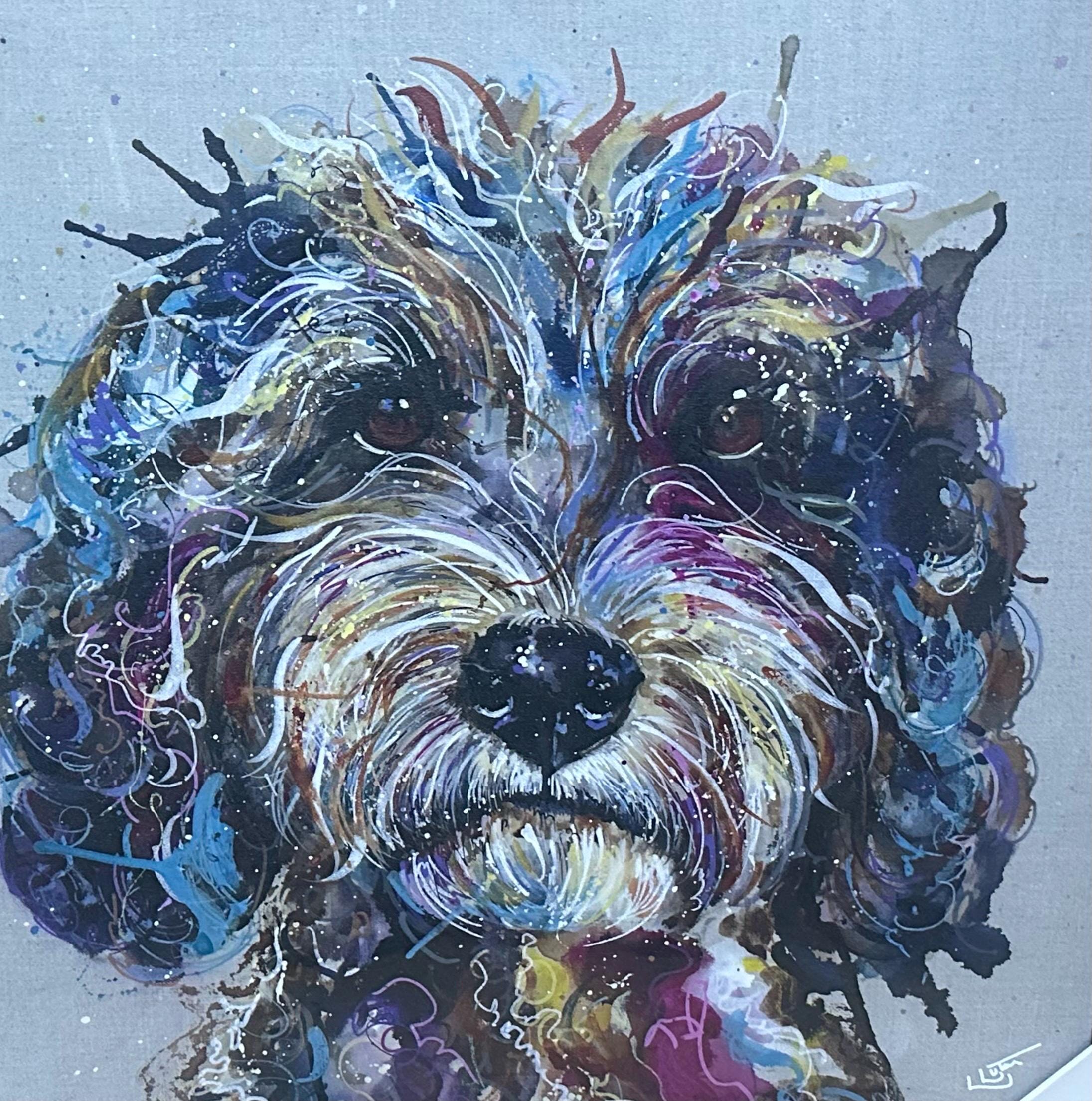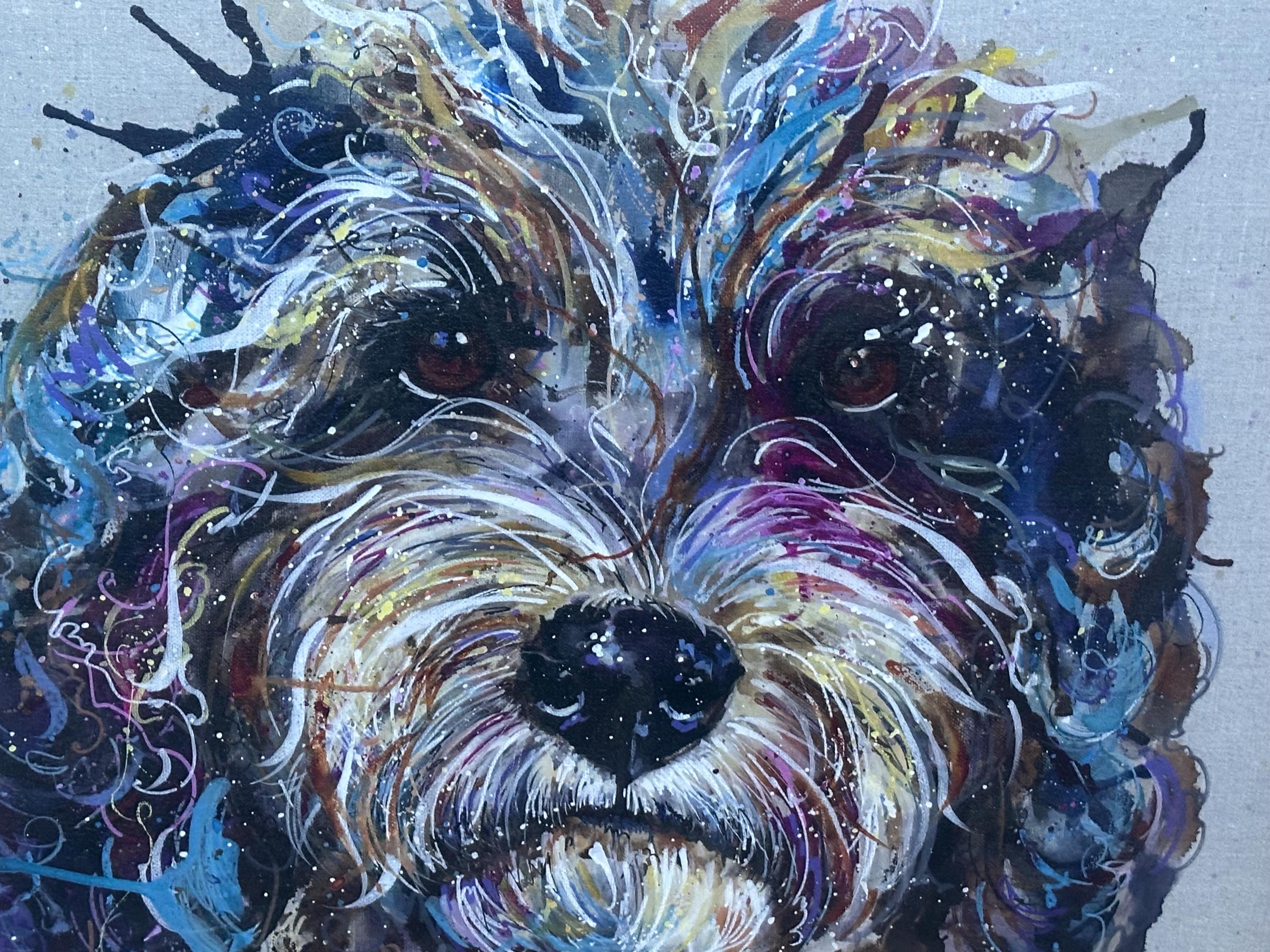 This eye-catching piece features a charming cockapoo portrait, beautifully rendered in a vibrant, contemporary style with expressive brushwork and splashes of colour. The artwork is enhanced with subtle flecks of highlight, giving it depth and a slightly textured, almost hand-finished feel.