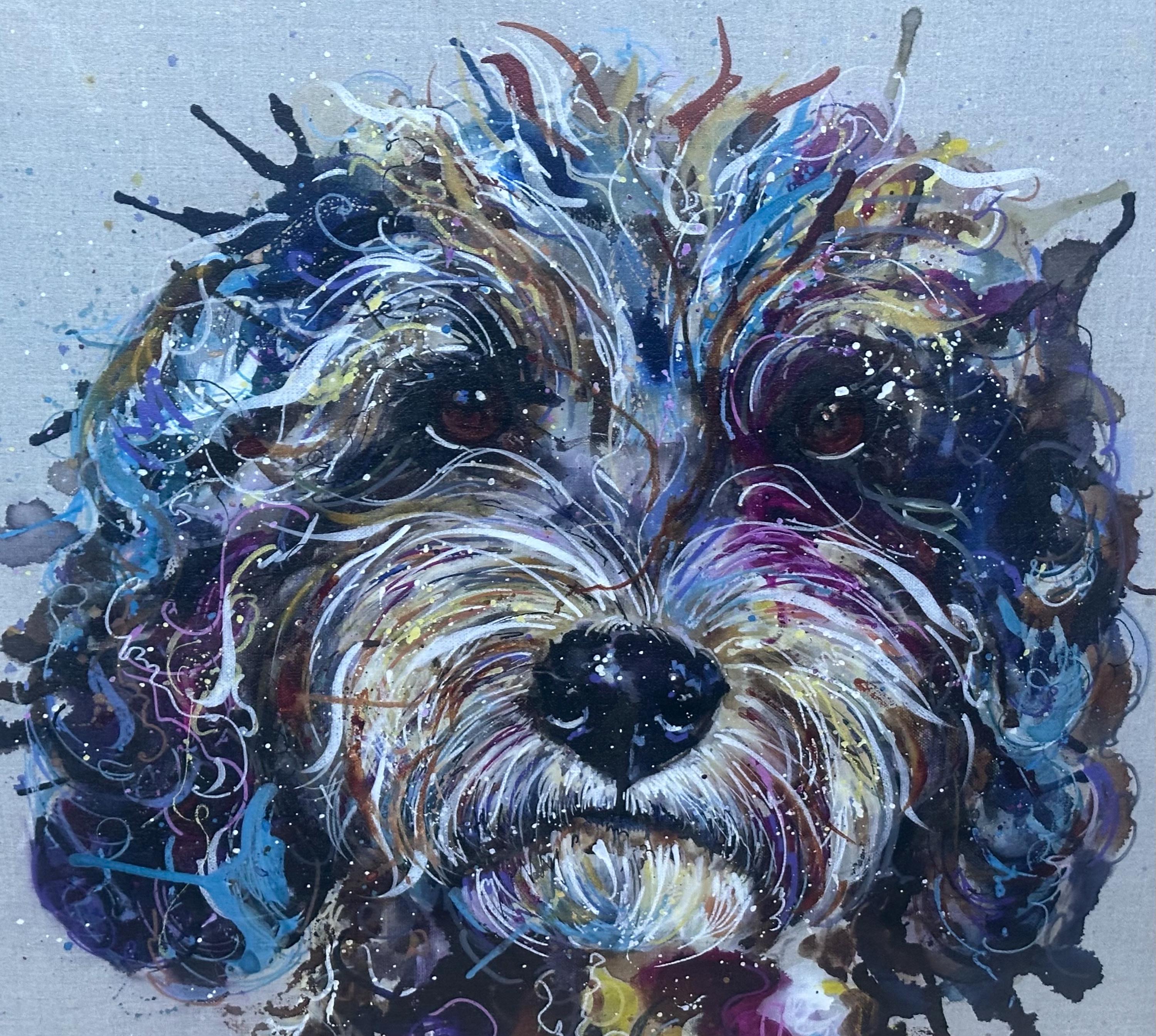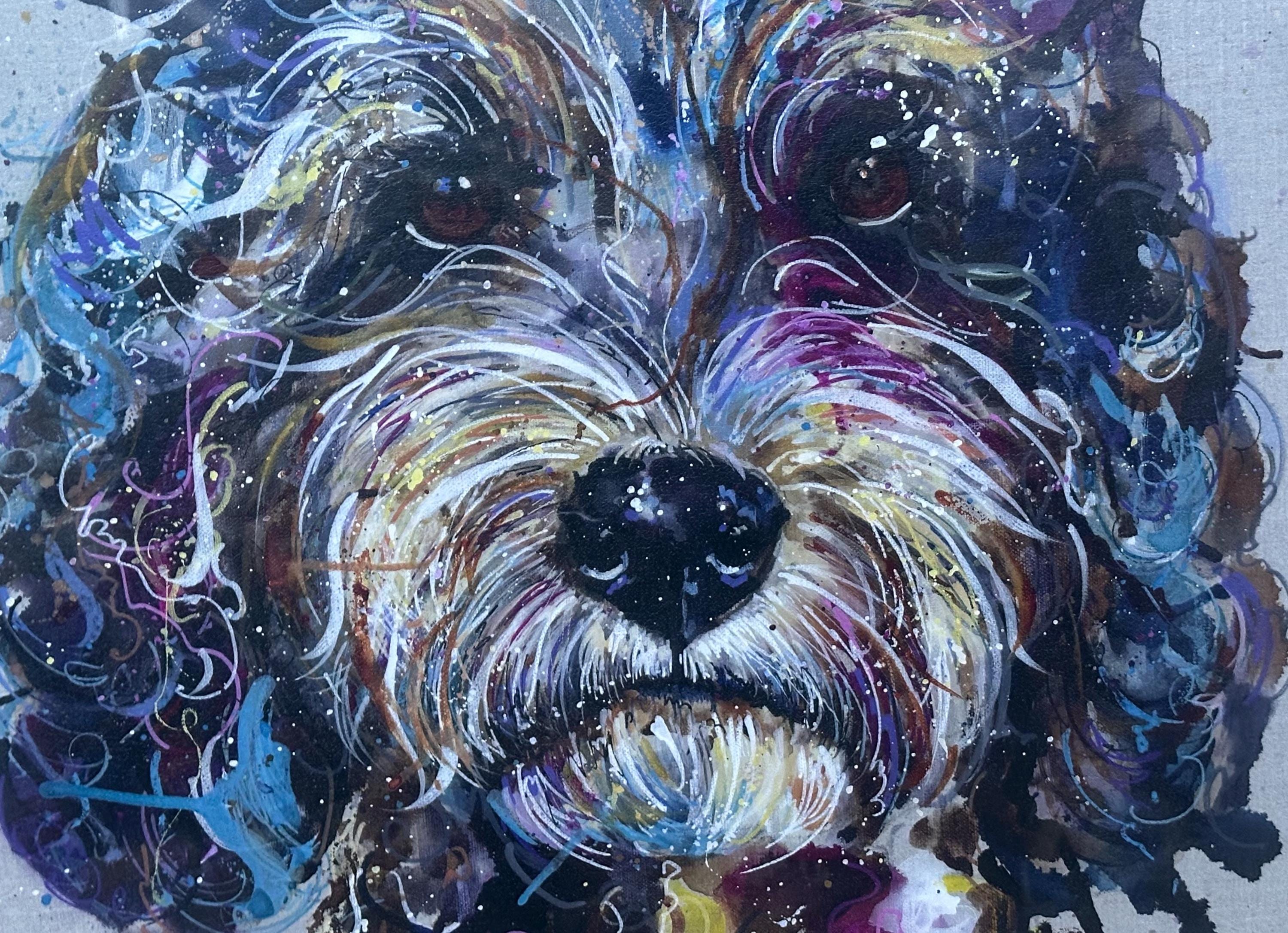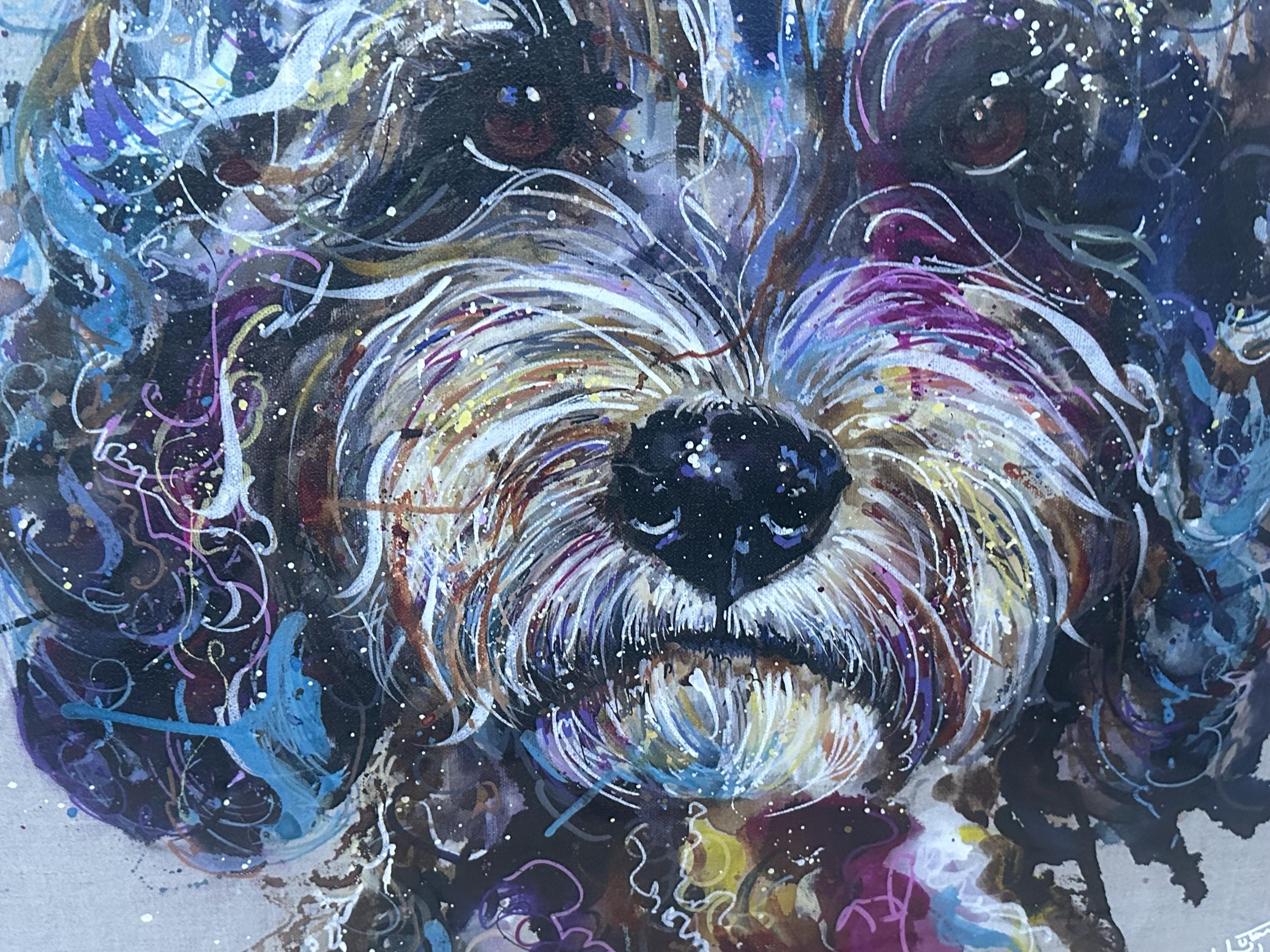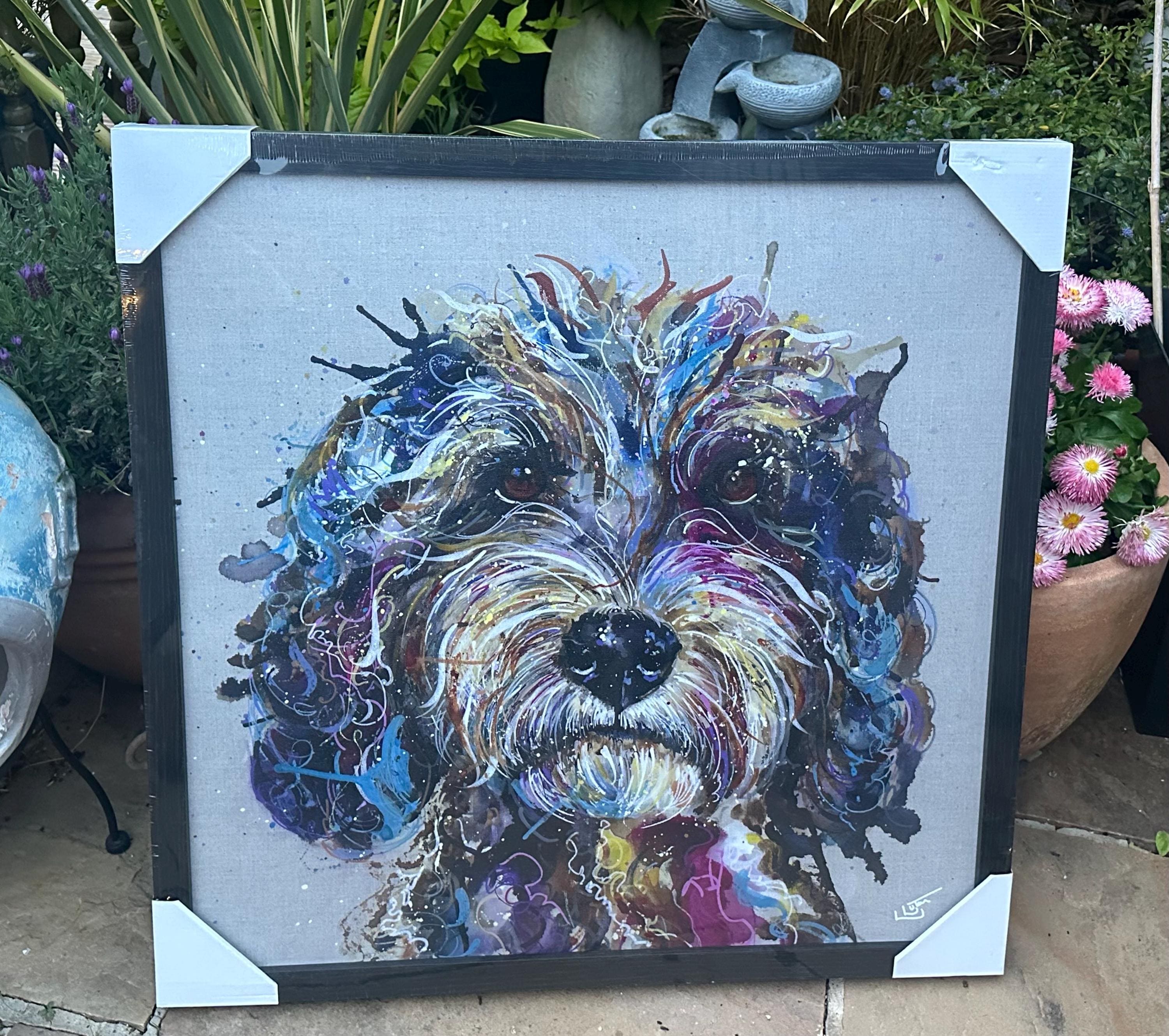 This eye-catching piece features a charming cockapoo portrait, beautifully rendered in a vibrant, contemporary style with expressive brushwork and splashes of colour. The artwork is enhanced with subtle flecks of highlight, giving it depth and a slightly textured, almost hand-finished feel.