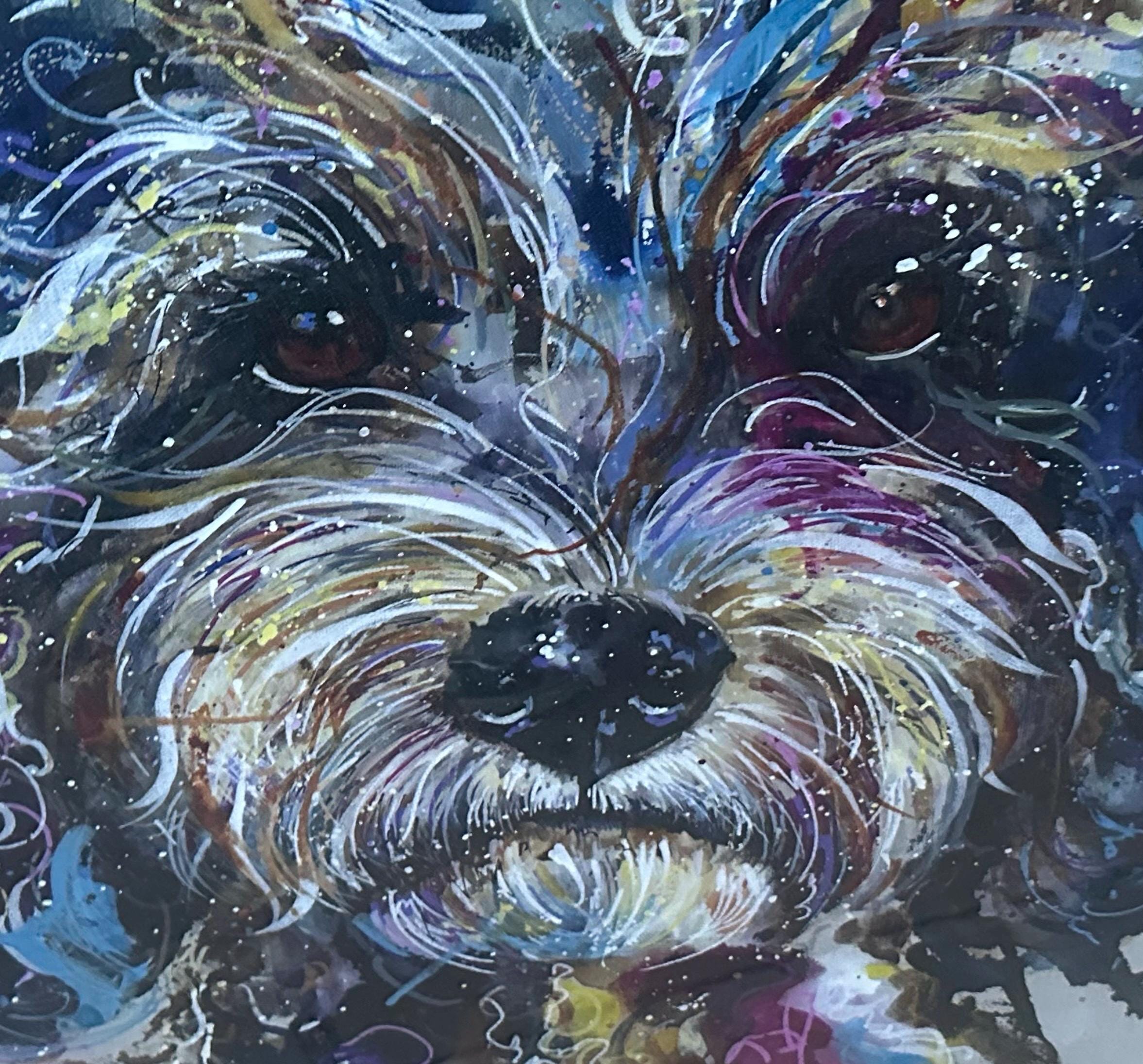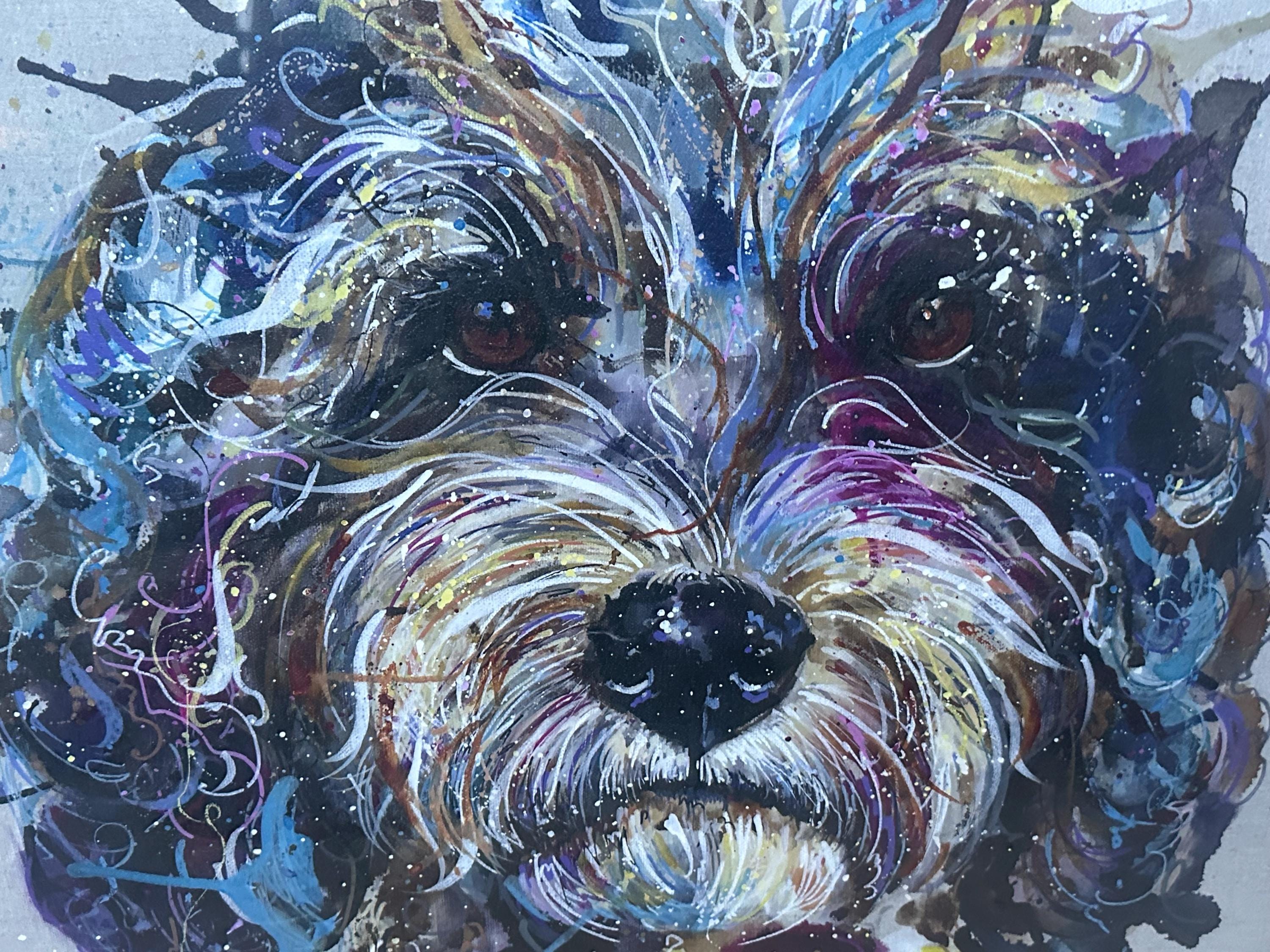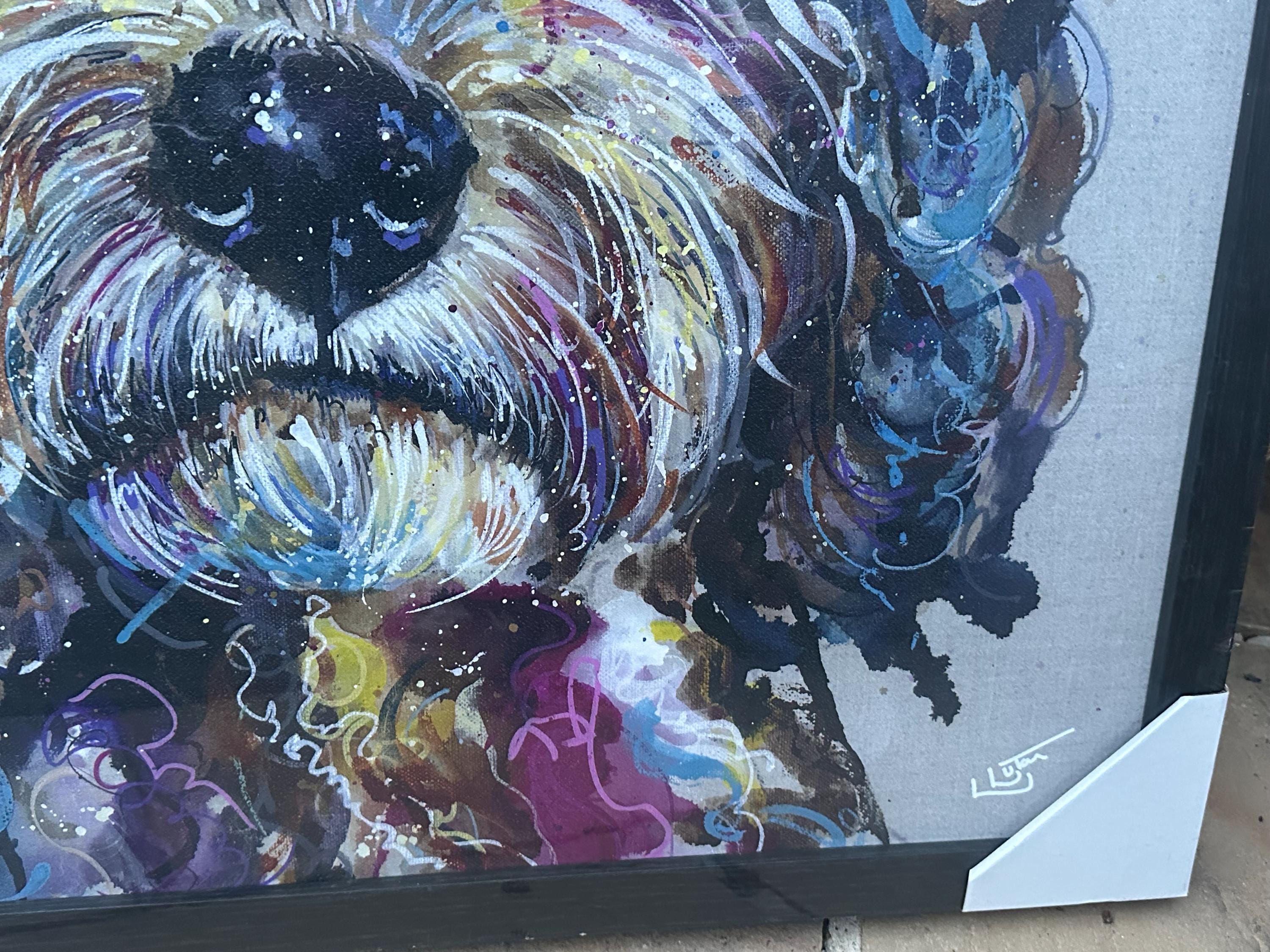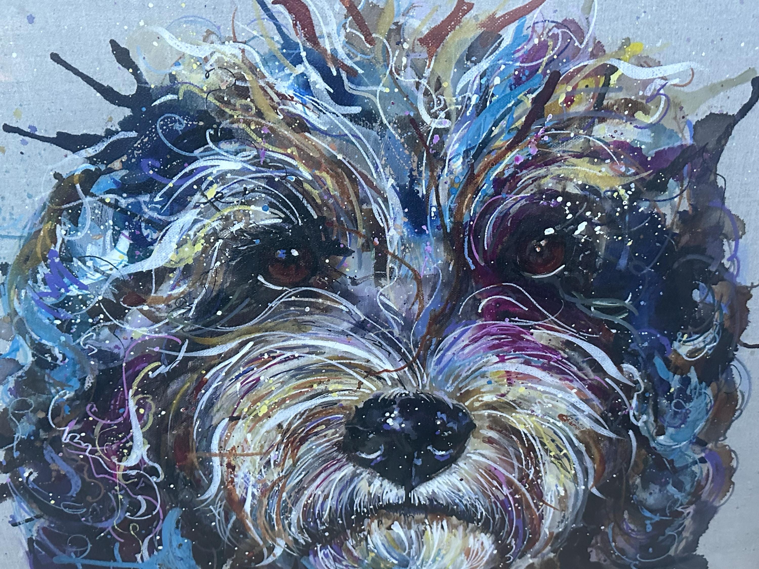This eye-catching piece features a charming cockapoo portrait, beautifully rendered in a vibrant, contemporary style with expressive brushwork and splashes of colour. The artwork is enhanced with subtle flecks of highlight, giving it depth and a slightly textured, almost hand-finished feel.