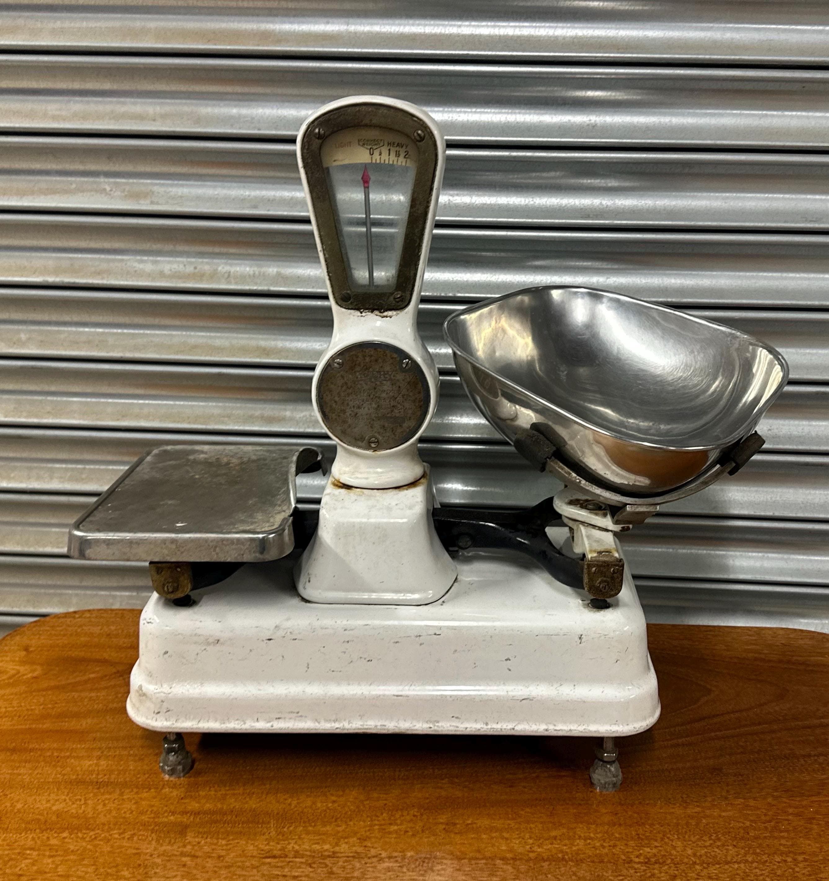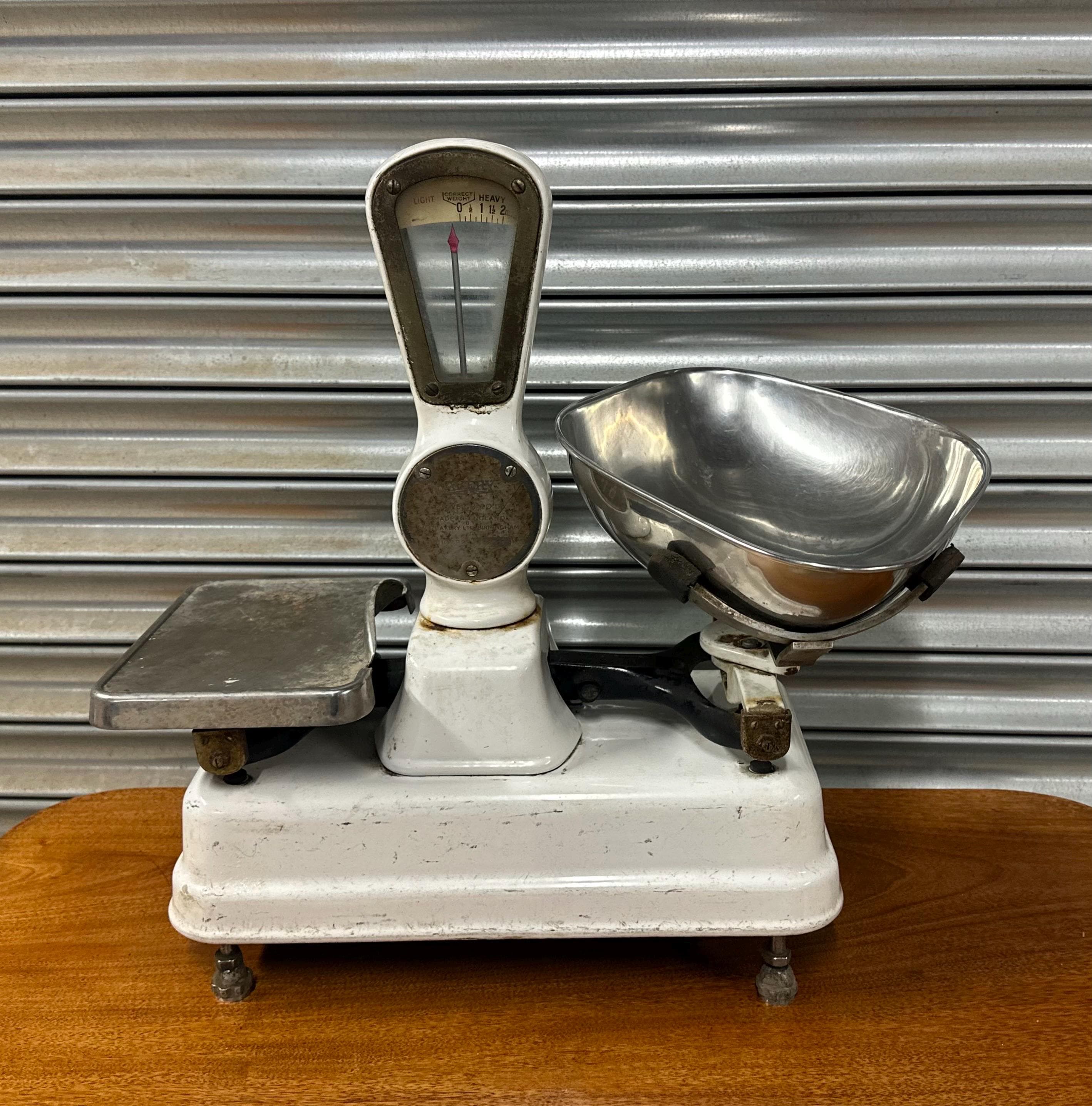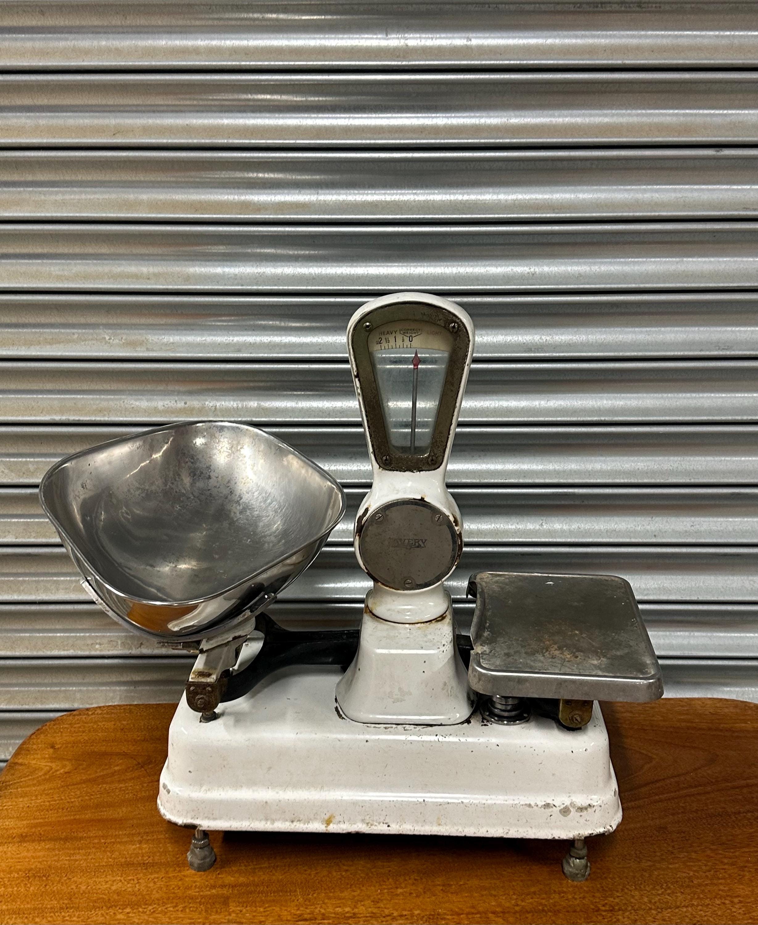 These traditional counter scales were widely used in grocers, sweet shops, and general stores throughout the mid-20th century and are now highly sought after as both functional pieces and decorative retail/display props.