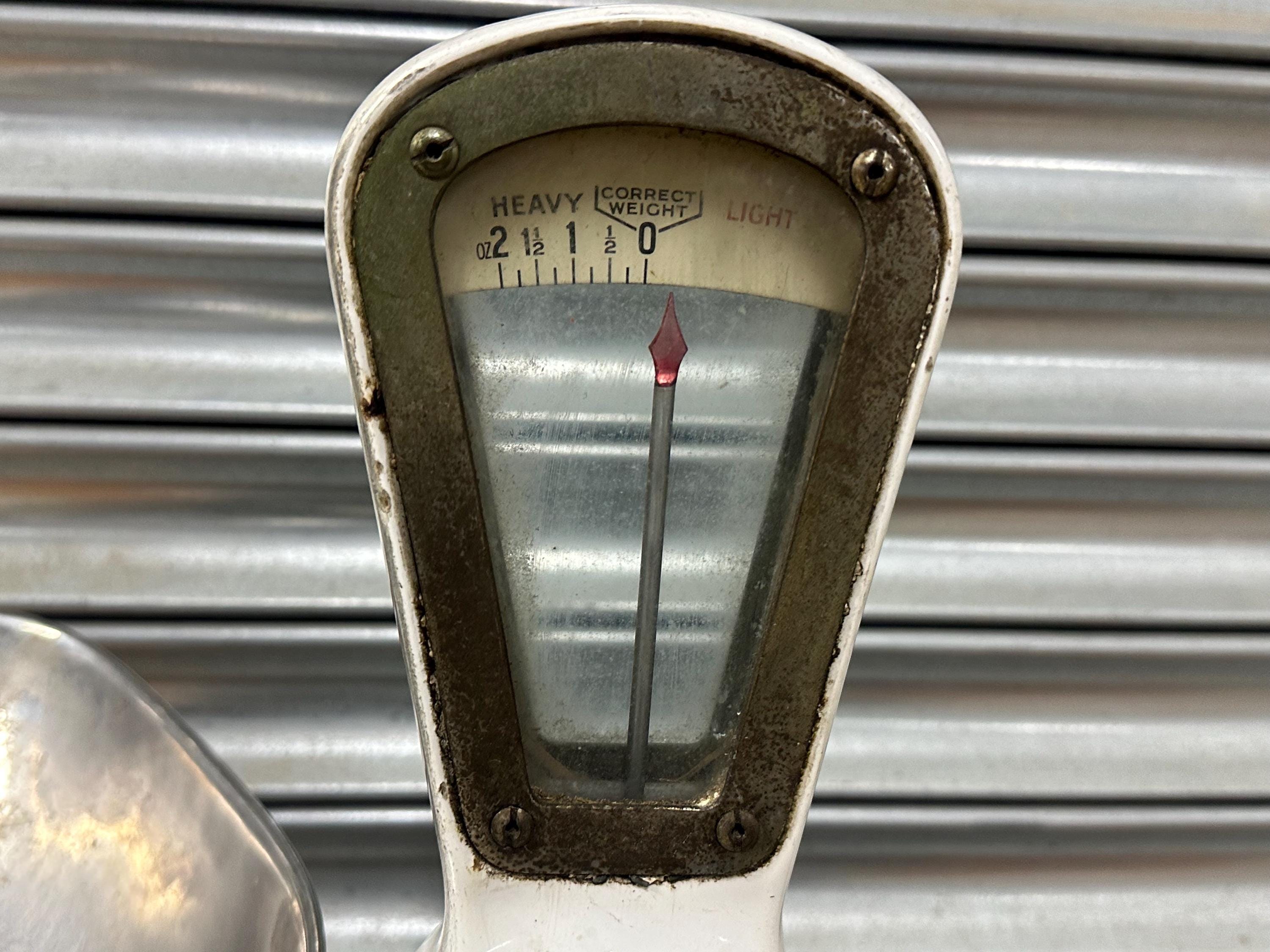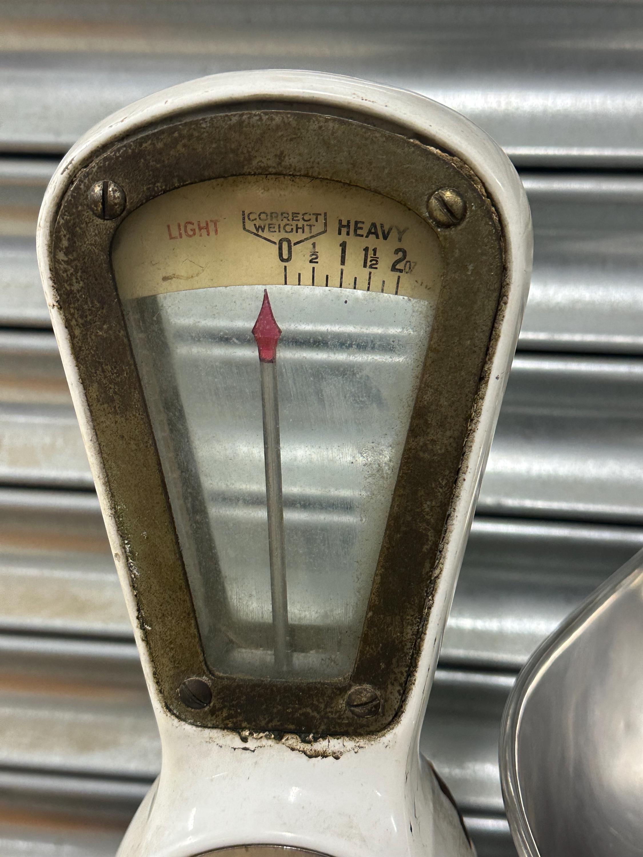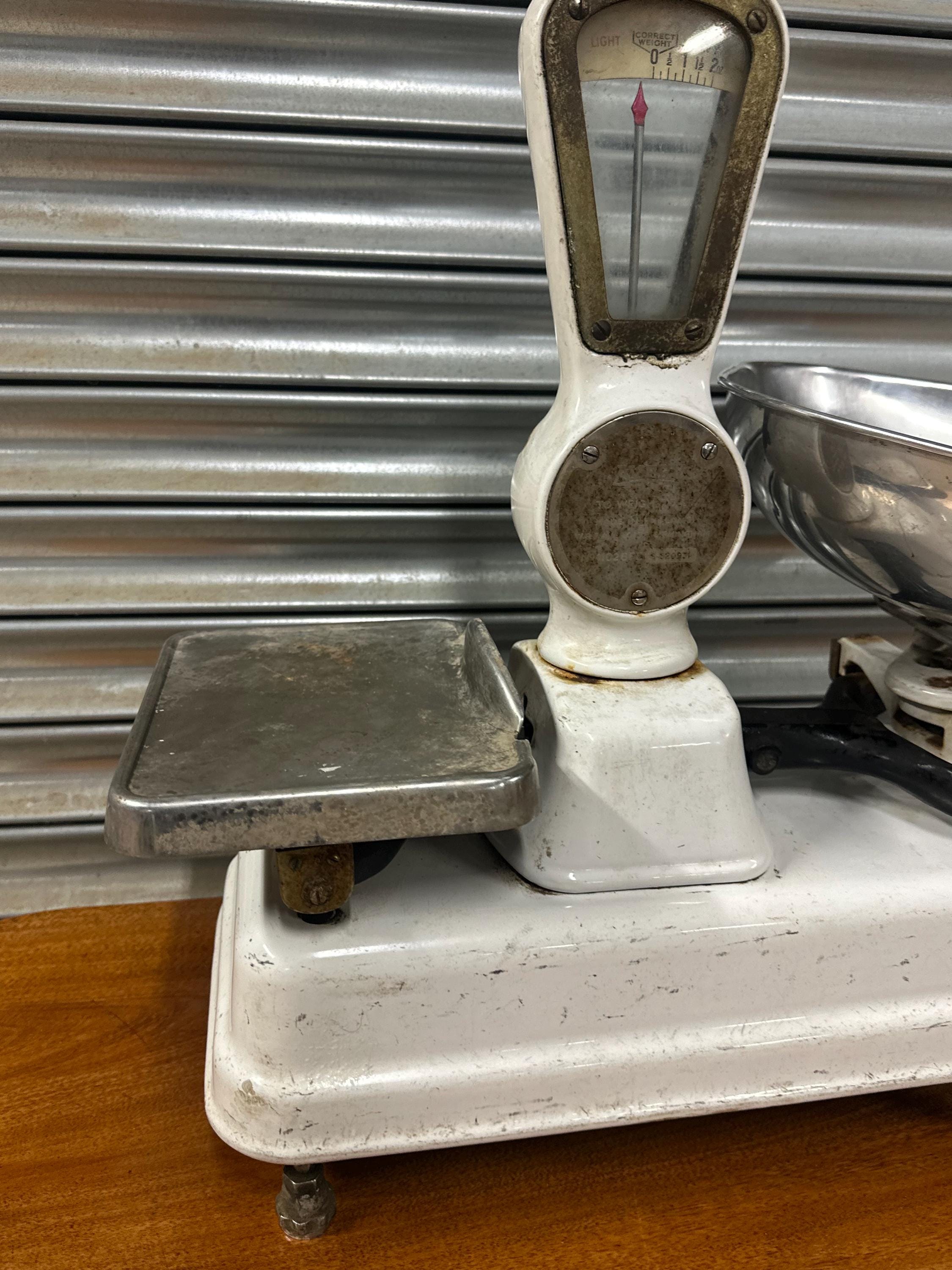 These traditional counter scales were widely used in grocers, sweet shops, and general stores throughout the mid-20th century and are now highly sought after as both functional pieces and decorative retail/display props.