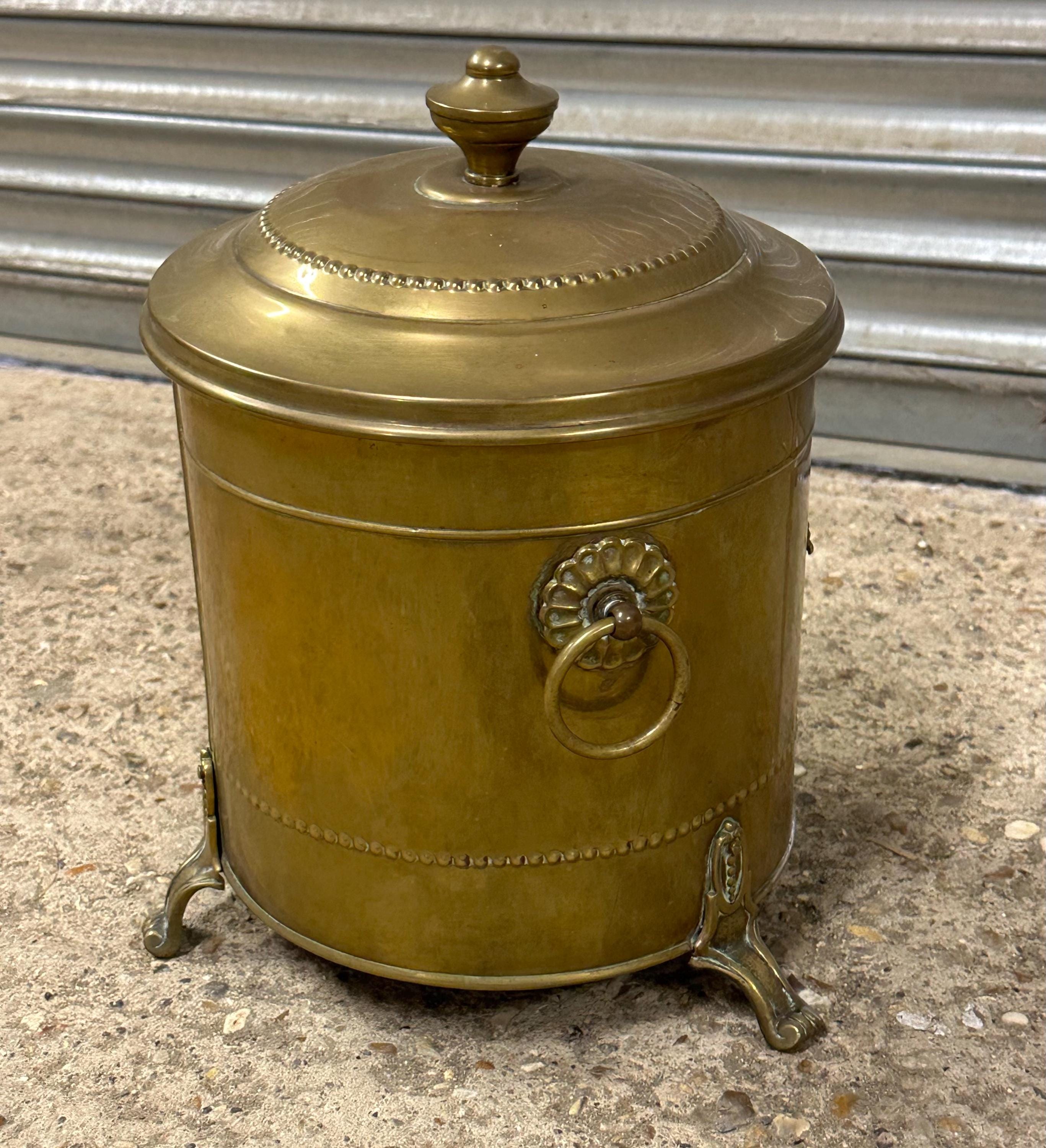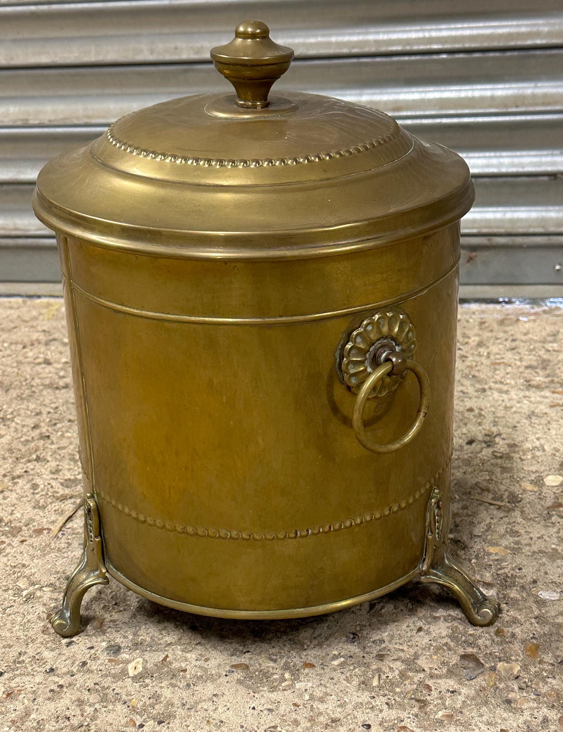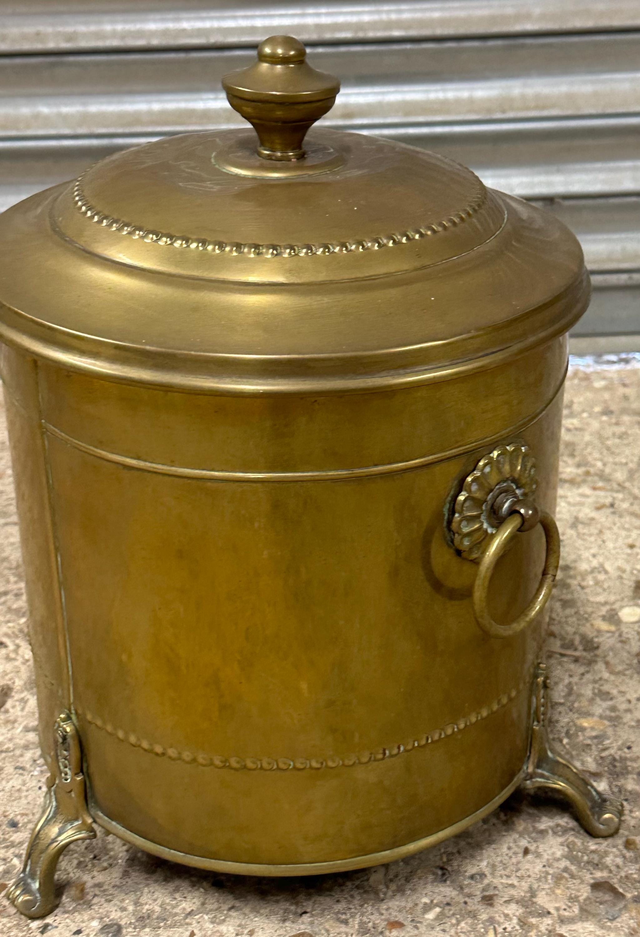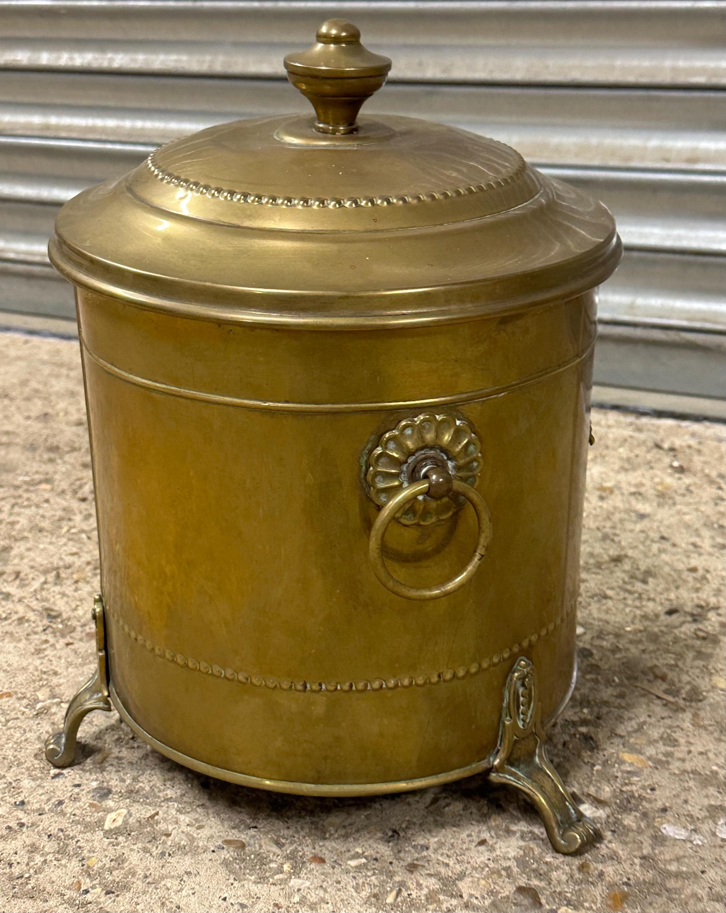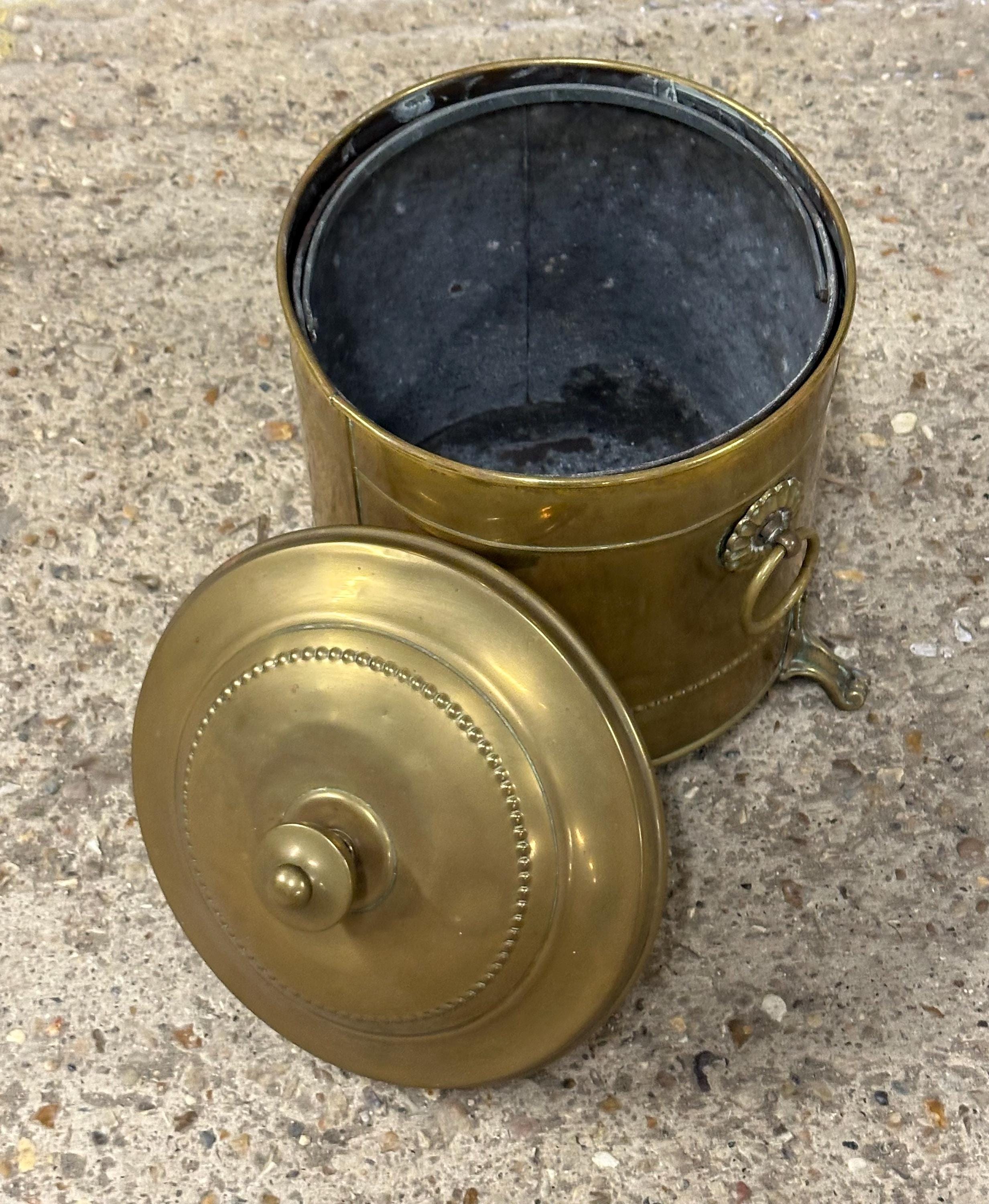 Antique Brass Coal Scuttle / Log Bin with Liner & Lid – Victorian, On Lion Paw Feet