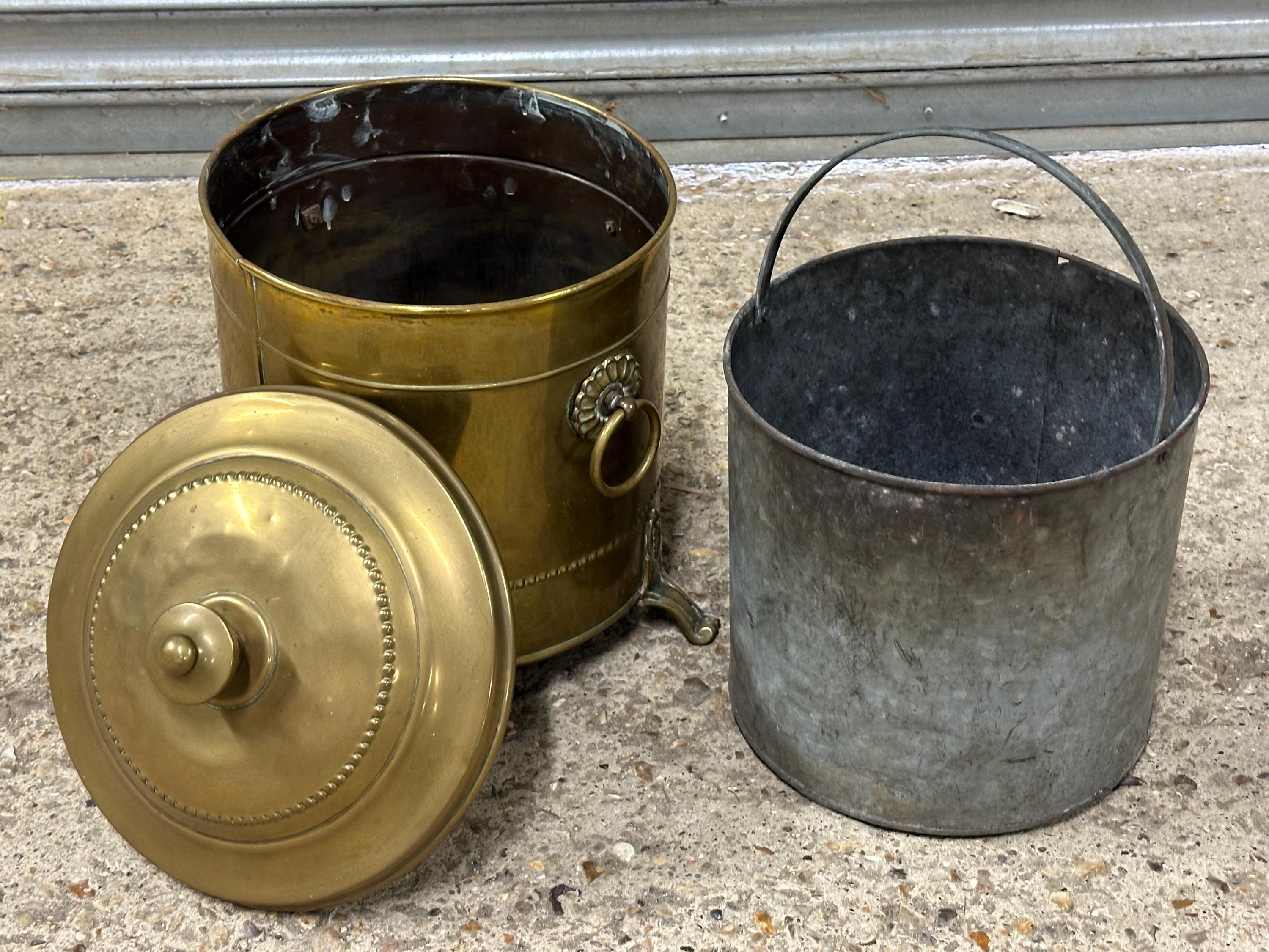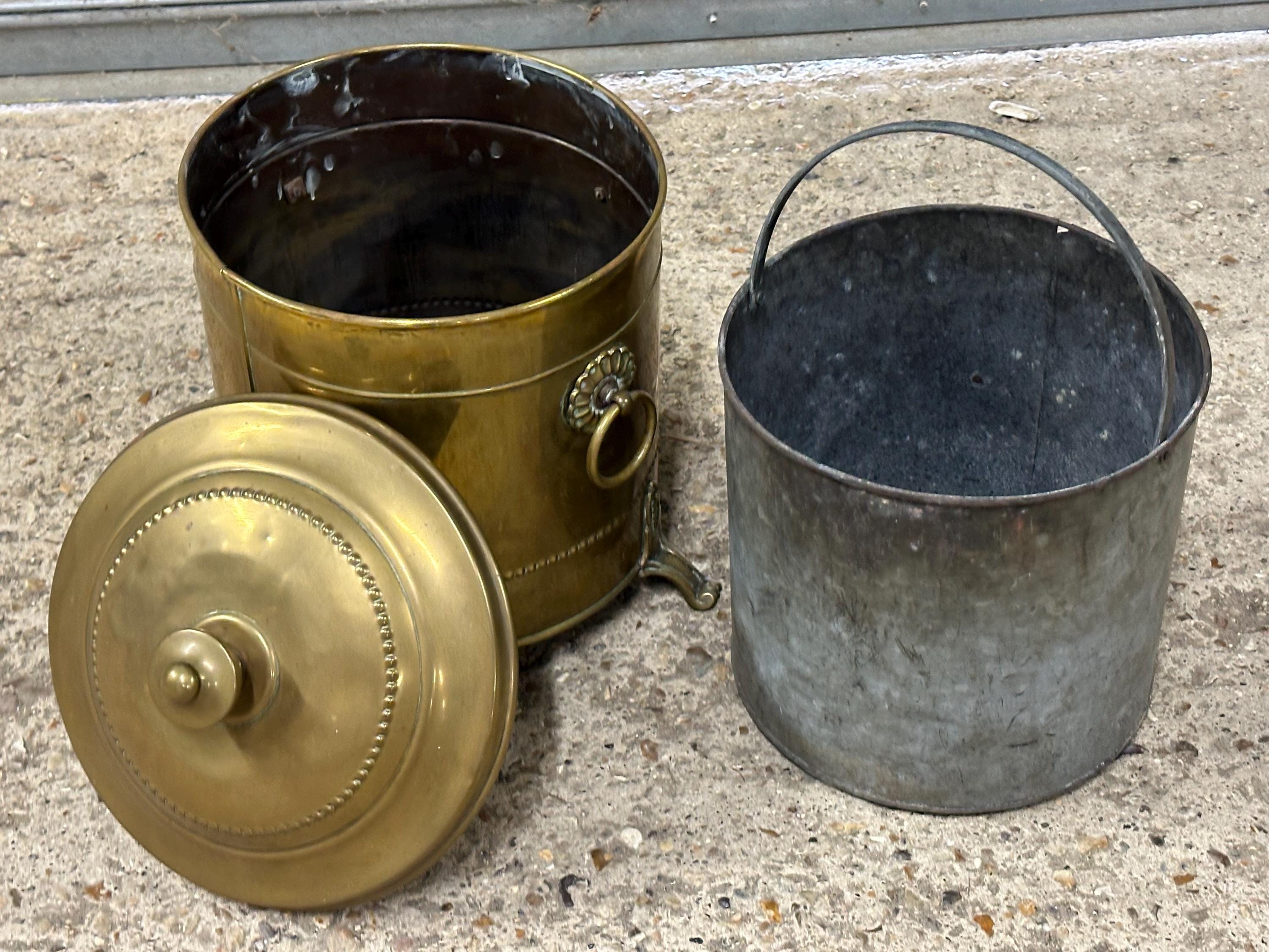 A beautiful antique brass coal scuttle / log bin, complete with its original removable galvanised liner and matching lid, making it both decorative and practical for fireside use.