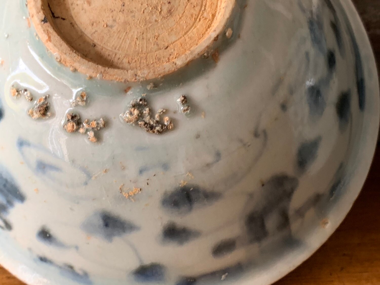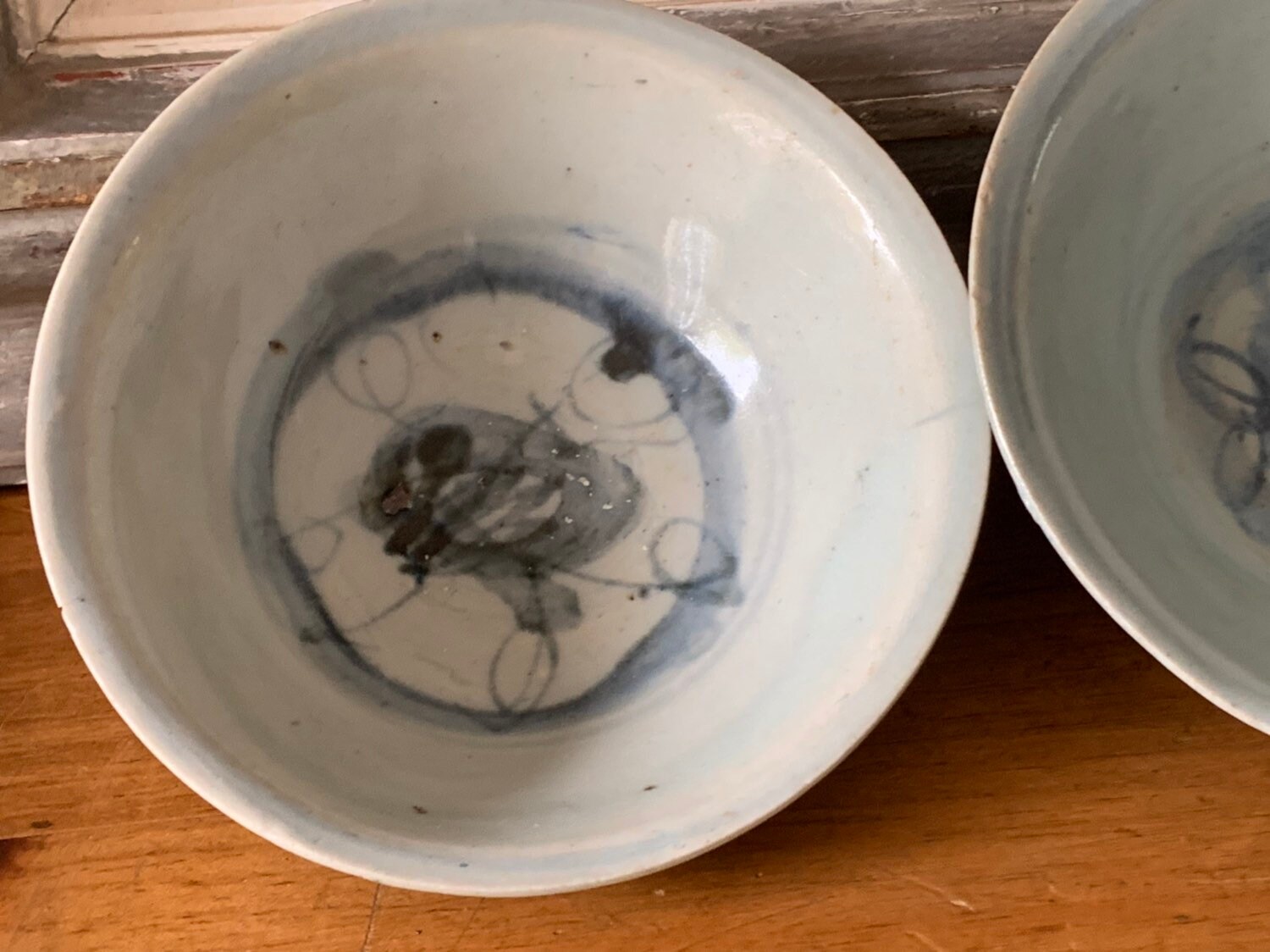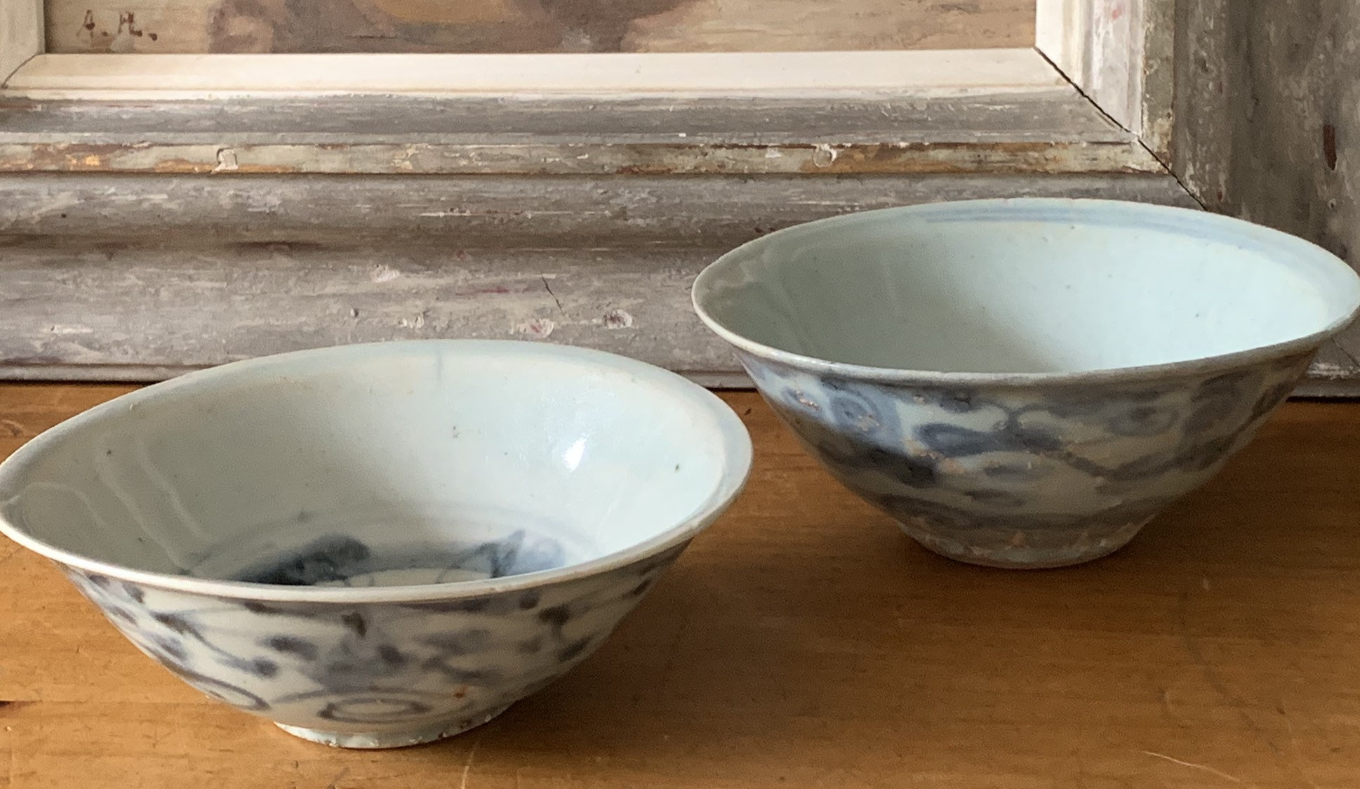 Two Chinese Ming Dynasty (1368-1644 A.D) pale blue glazed porcelain bowls with hand painted decoration