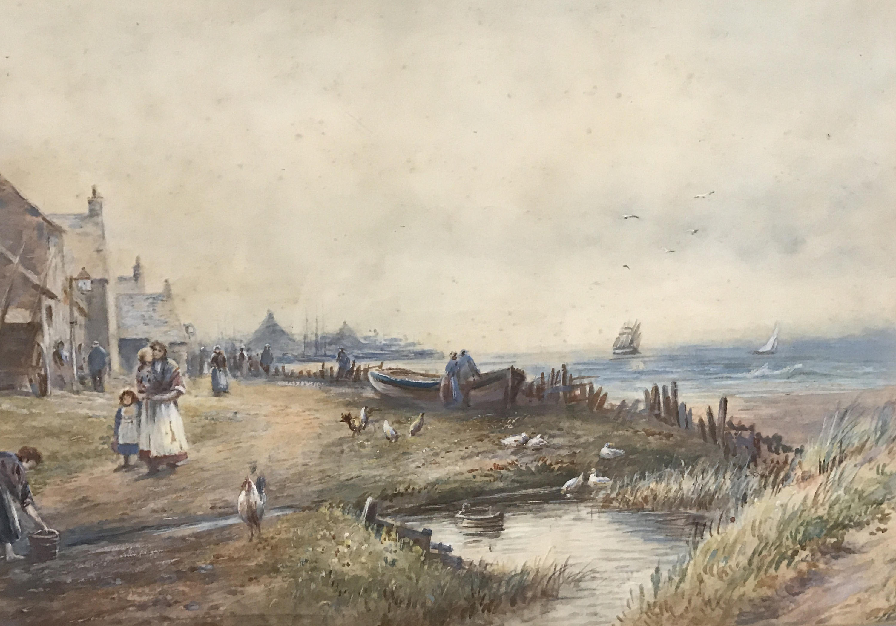 Depicts a coastal village with women in the foreground as well as chickens and ships out to sea