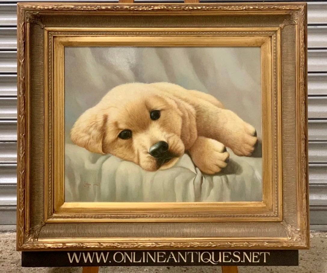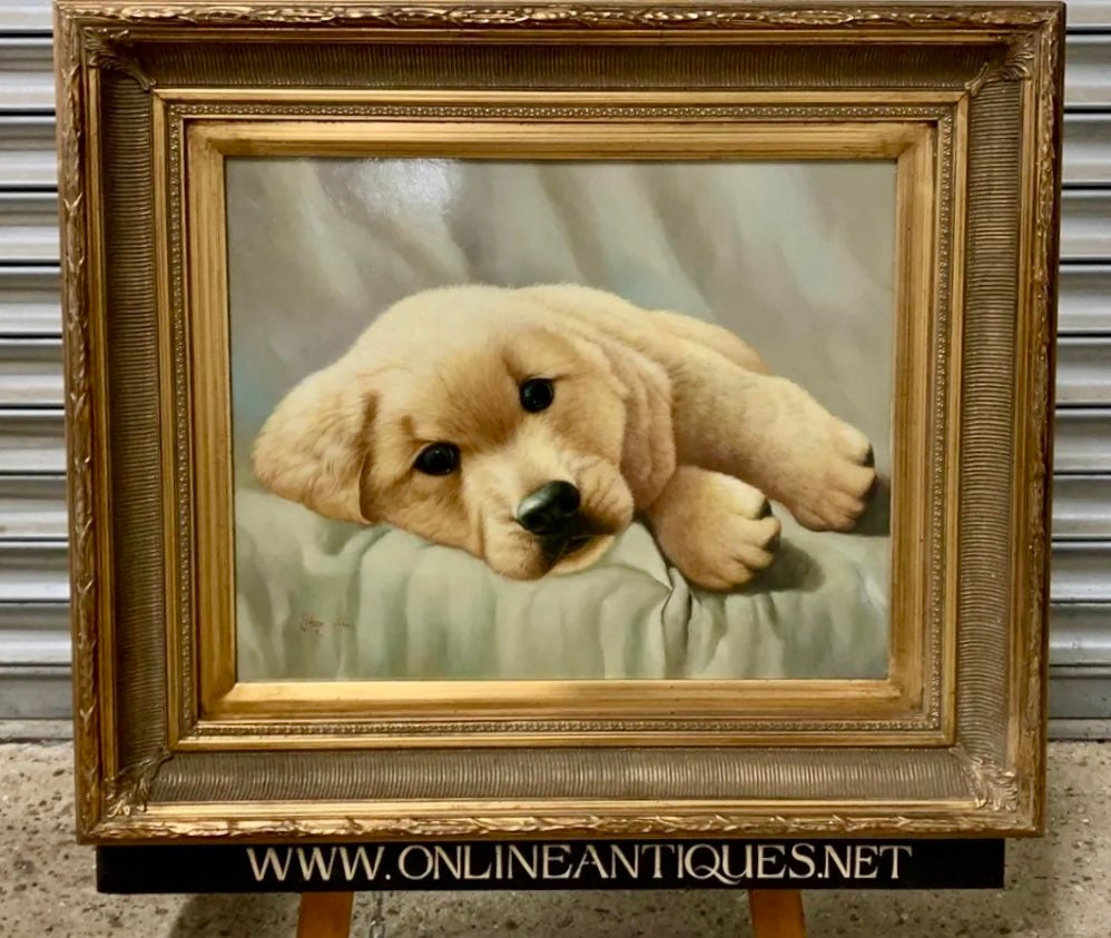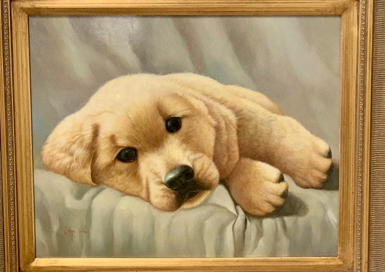 Superb Large Gilt Framed Original Oil Painting Art Work Of A Golden Labrador Puppy By Johnny Gaston, born in Glasgow in 1955