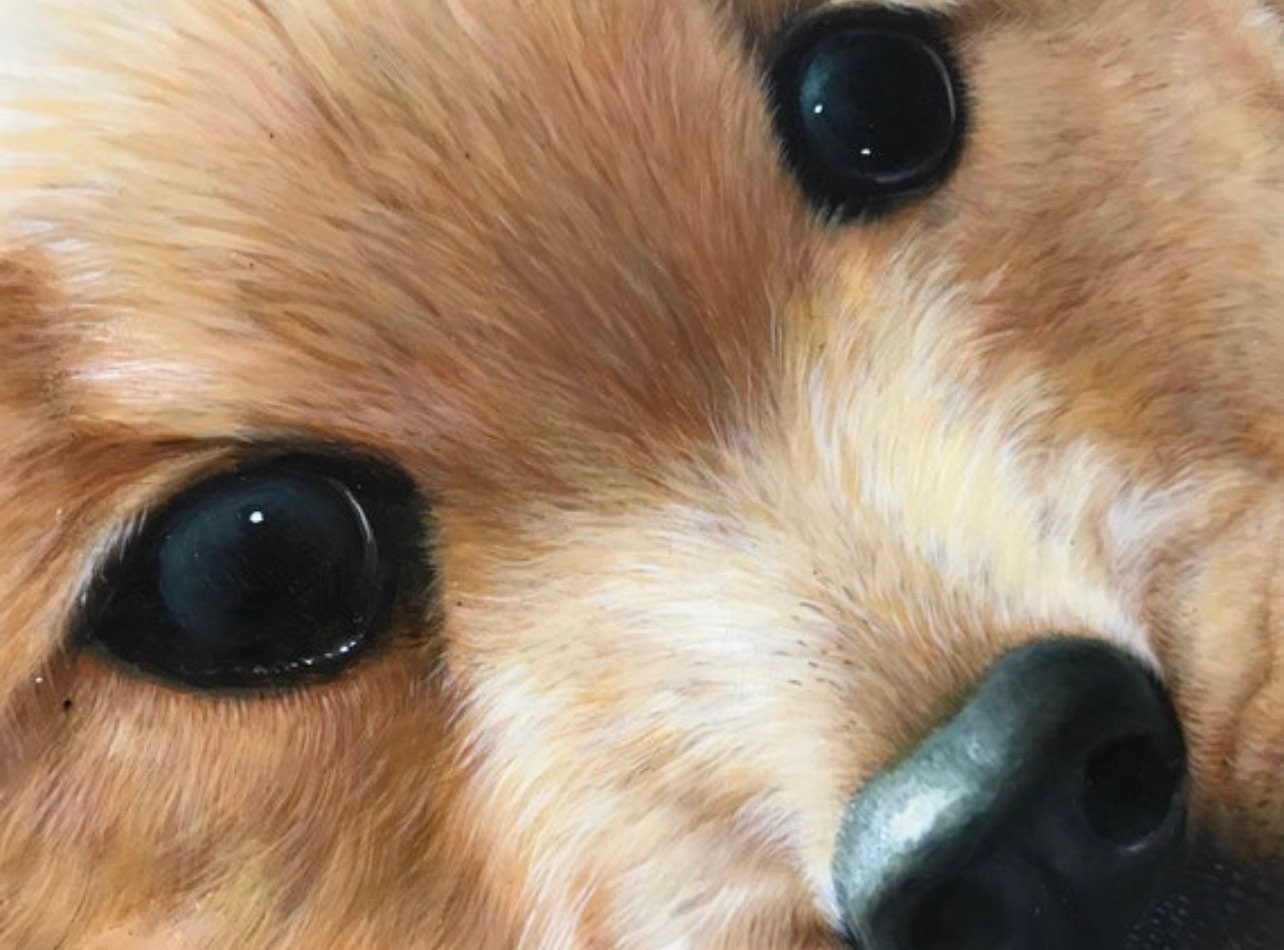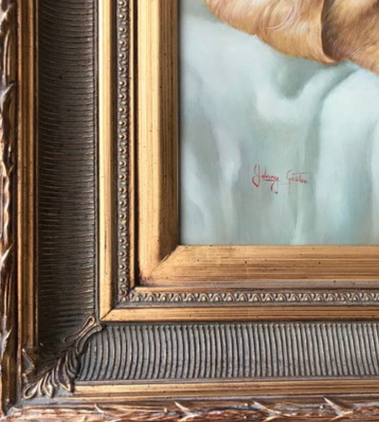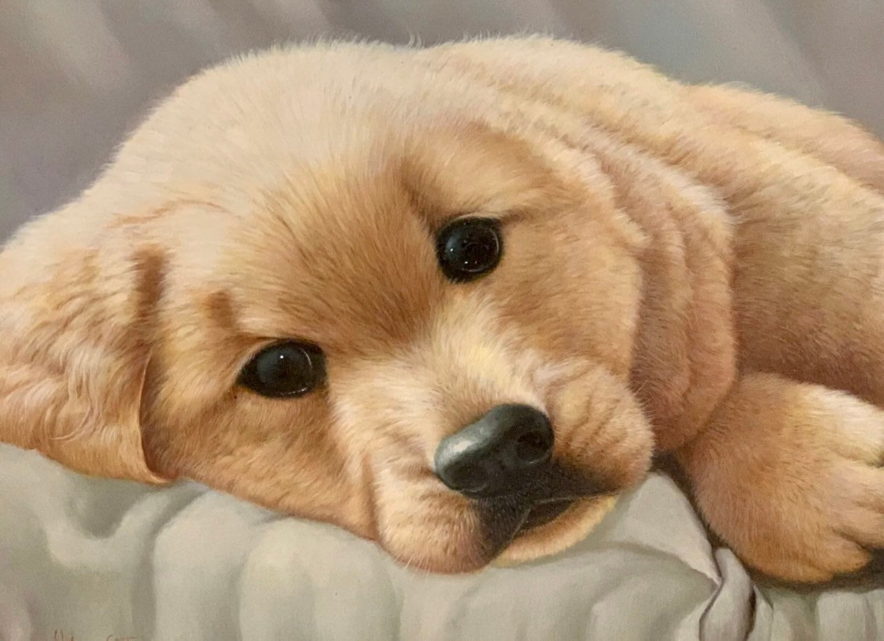 Superb Large Gilt Framed Original Oil Painting Art Work Of A Golden Labrador Puppy By Johnny Gaston, born in Glasgow in 1955