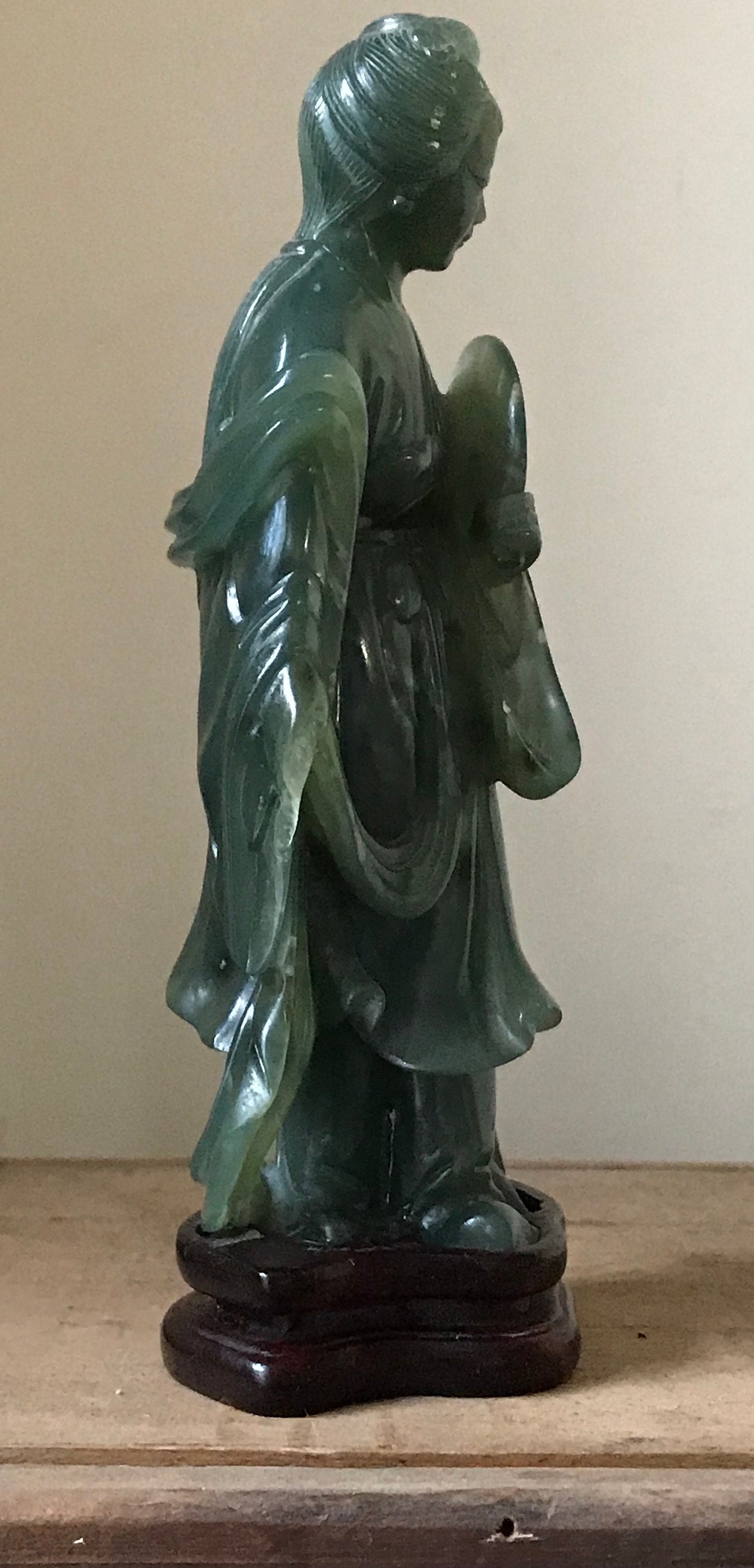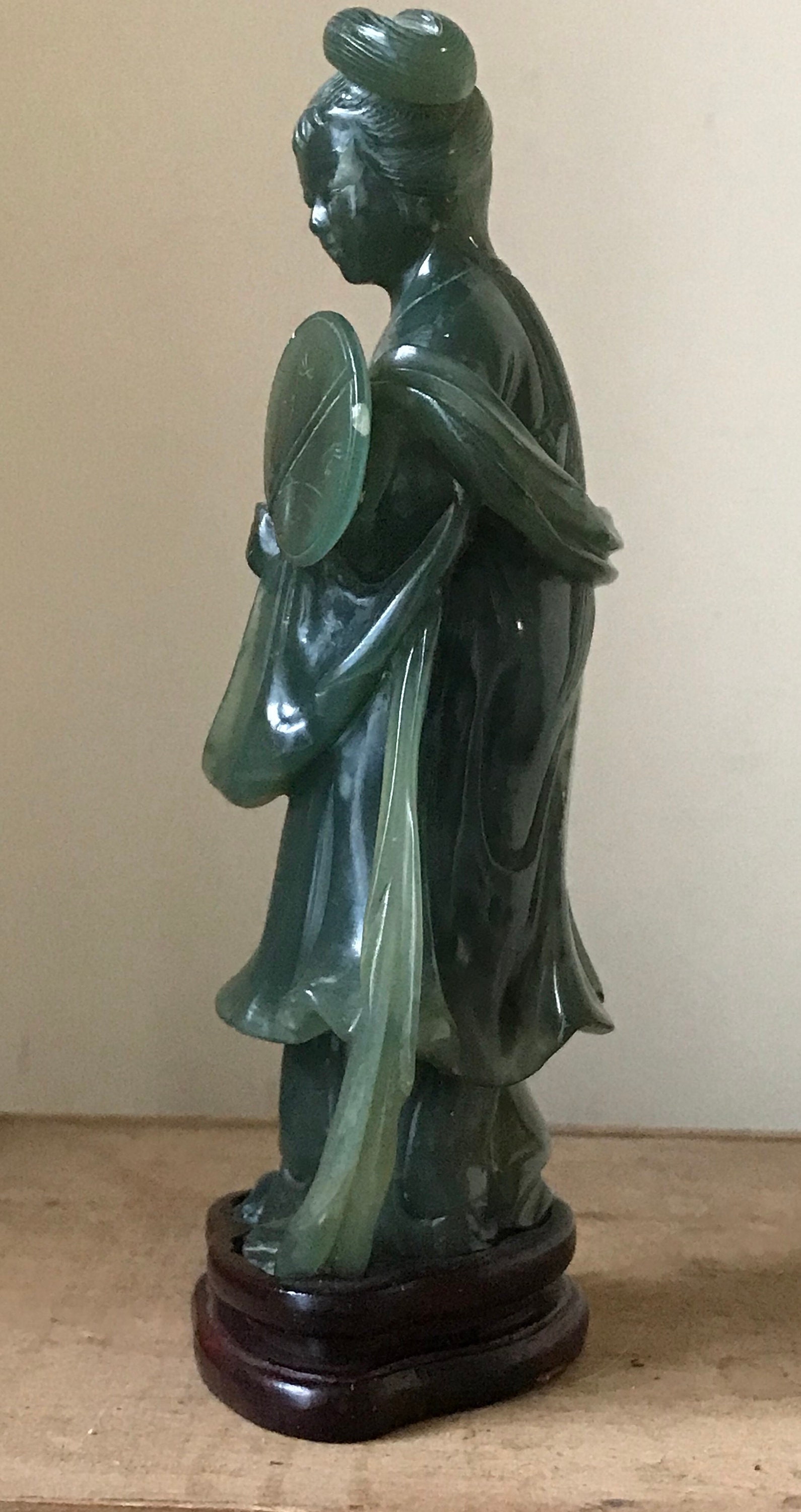 Antique Chinese Carved Green Jade Figurine Of A Tang Lady mounted on a wooden plinth
