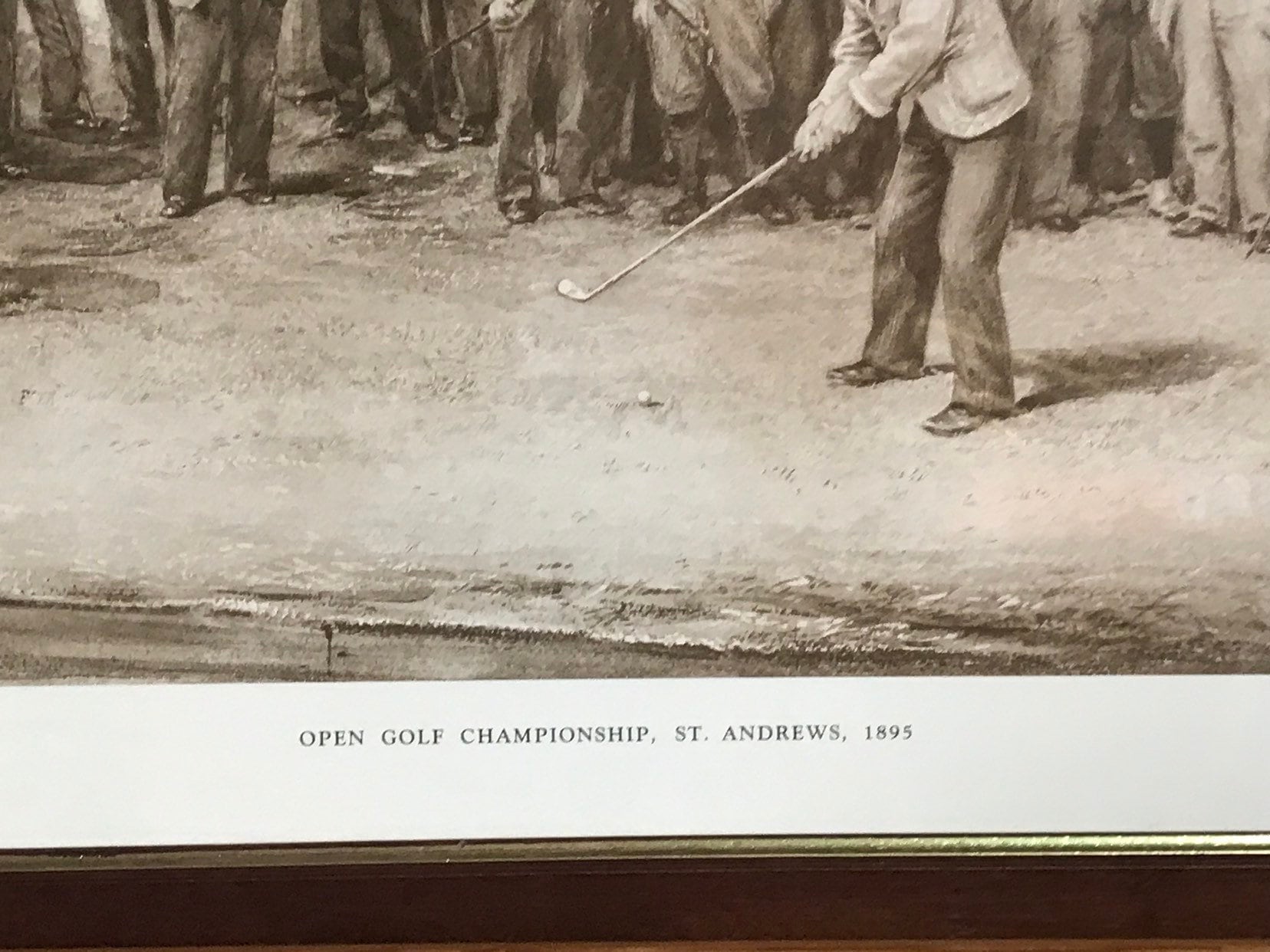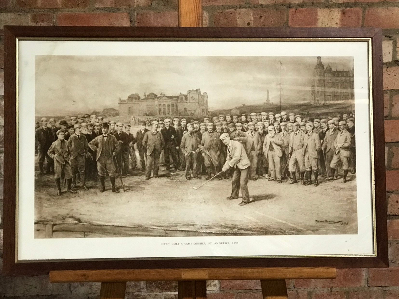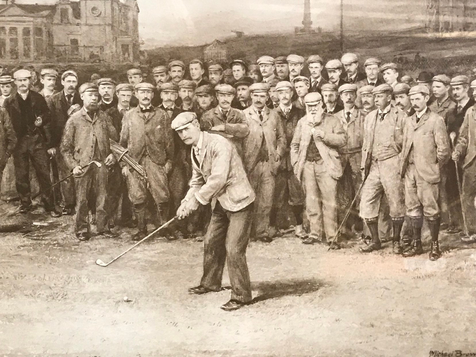 Depicts all the top golfers of the late 19th century assembled on the course at St Andrews, the Clubhouse in the background, watching J H Taylor about to play his approach shot over the Swilken Burn to the first green. He went on to win the championship and was the first Englishman to win the Open in Scotland.