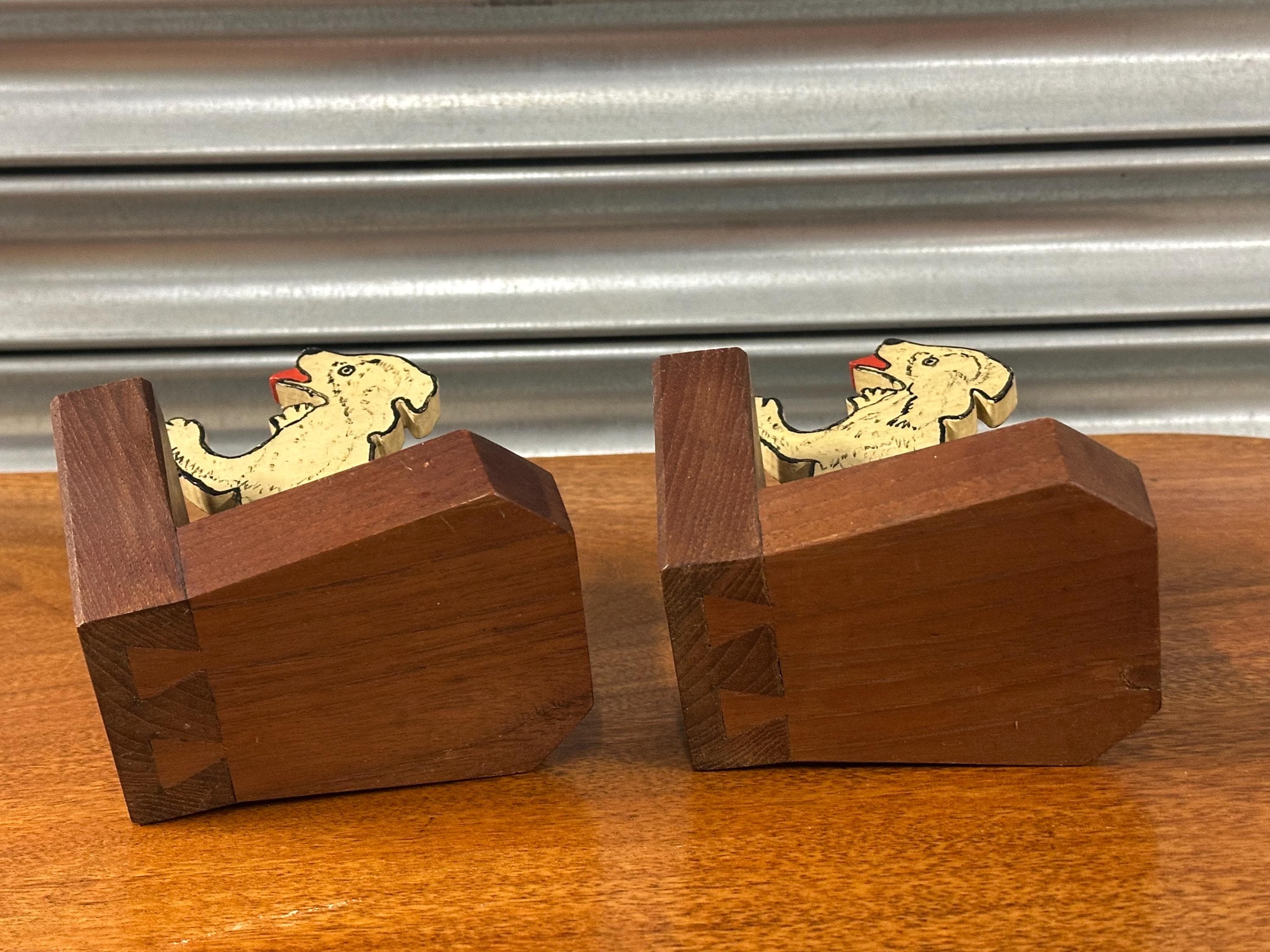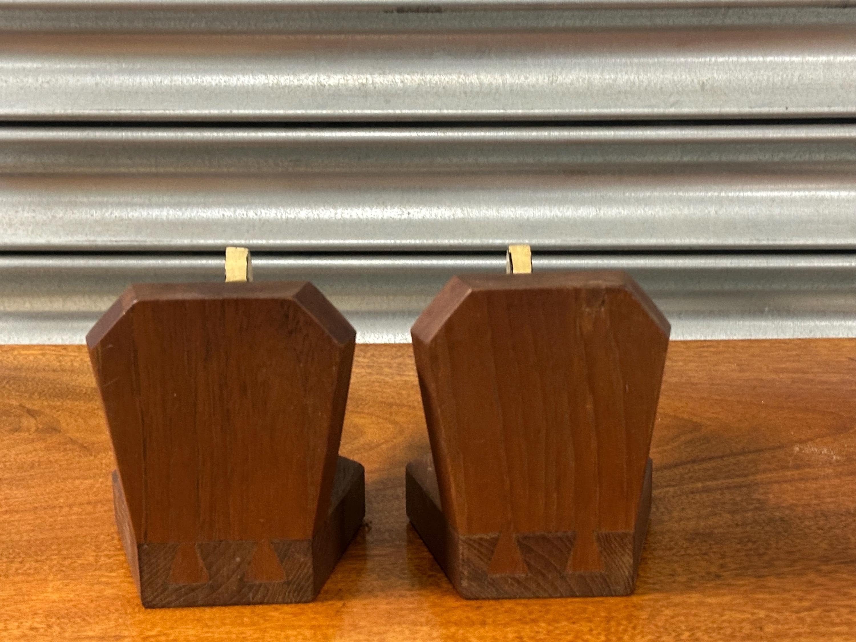The bases are made from warm-toned teak wood with a classic mid-century modern design, providing both stability and attractive natural grain. Wooden bookends like these became popular in the mid-20th century as functional decorative accessories for home libraries and desks.