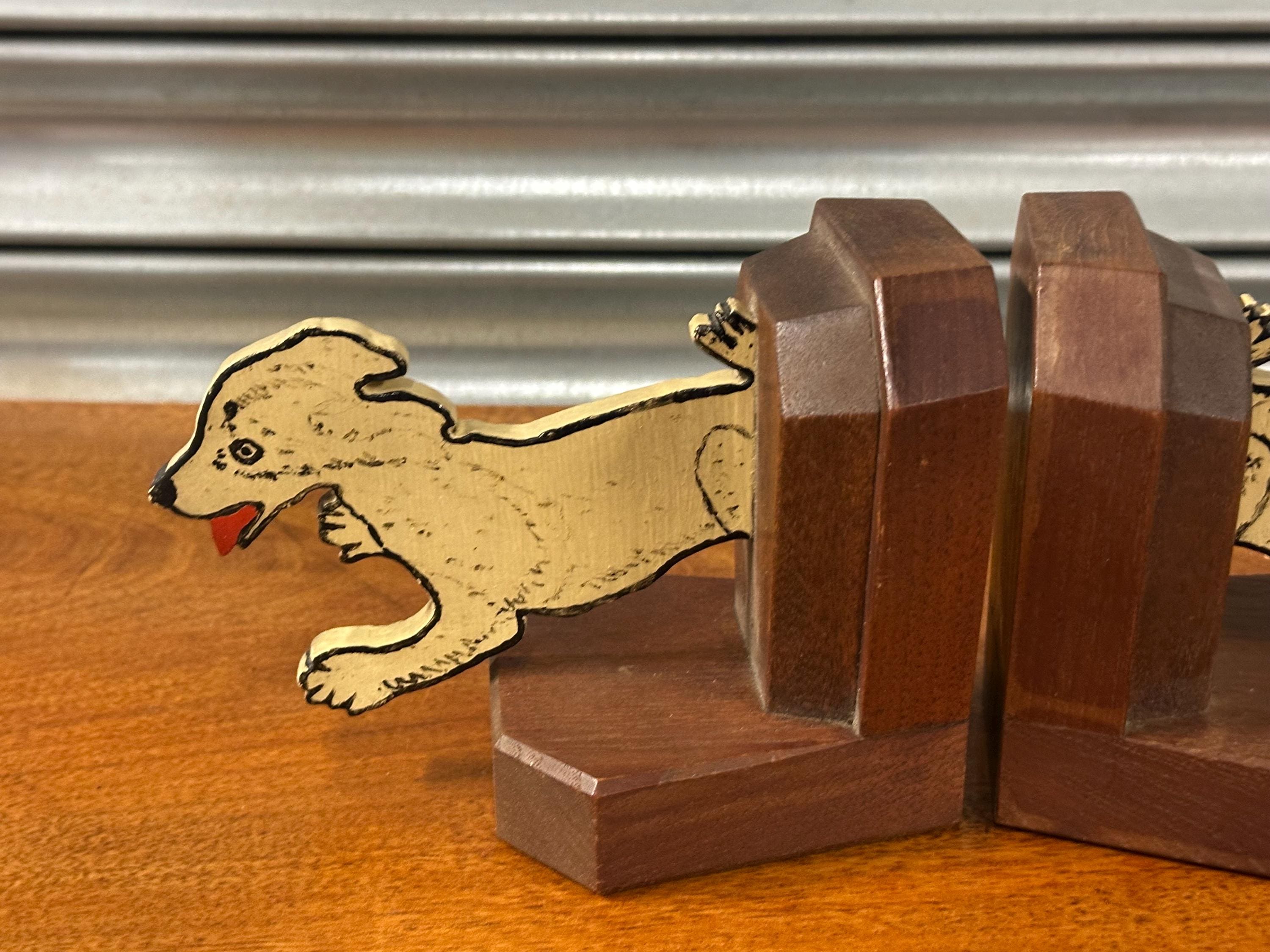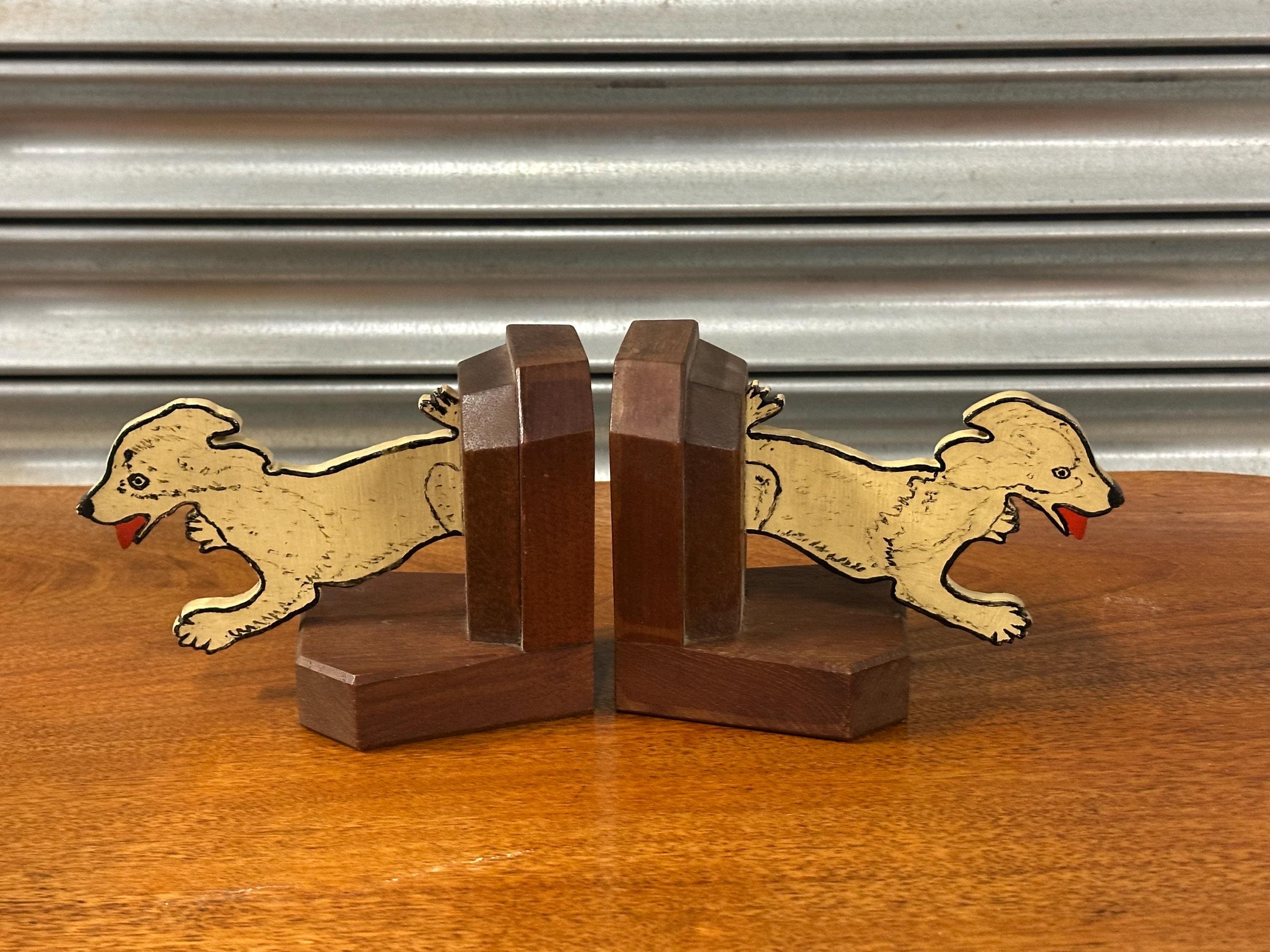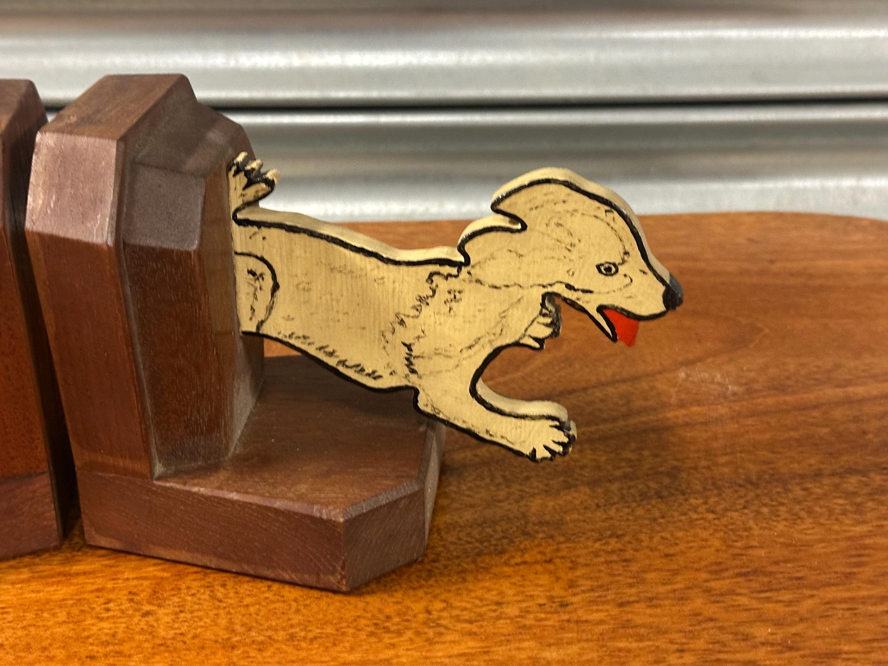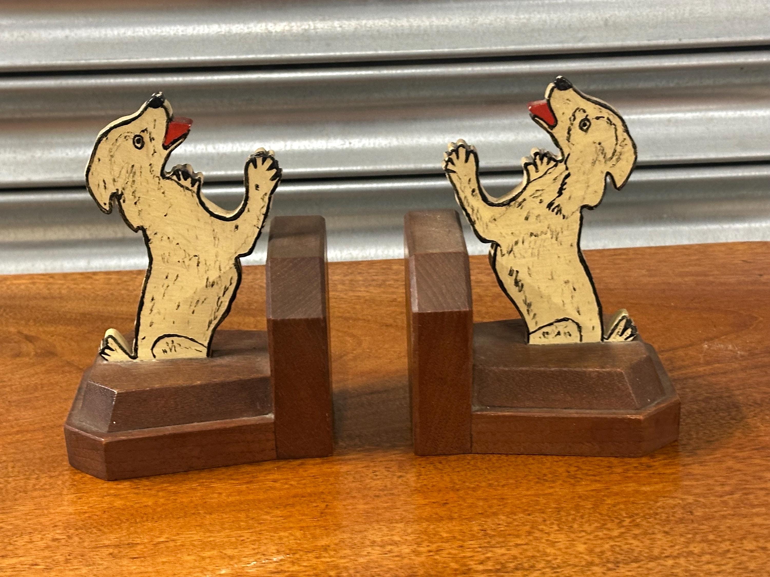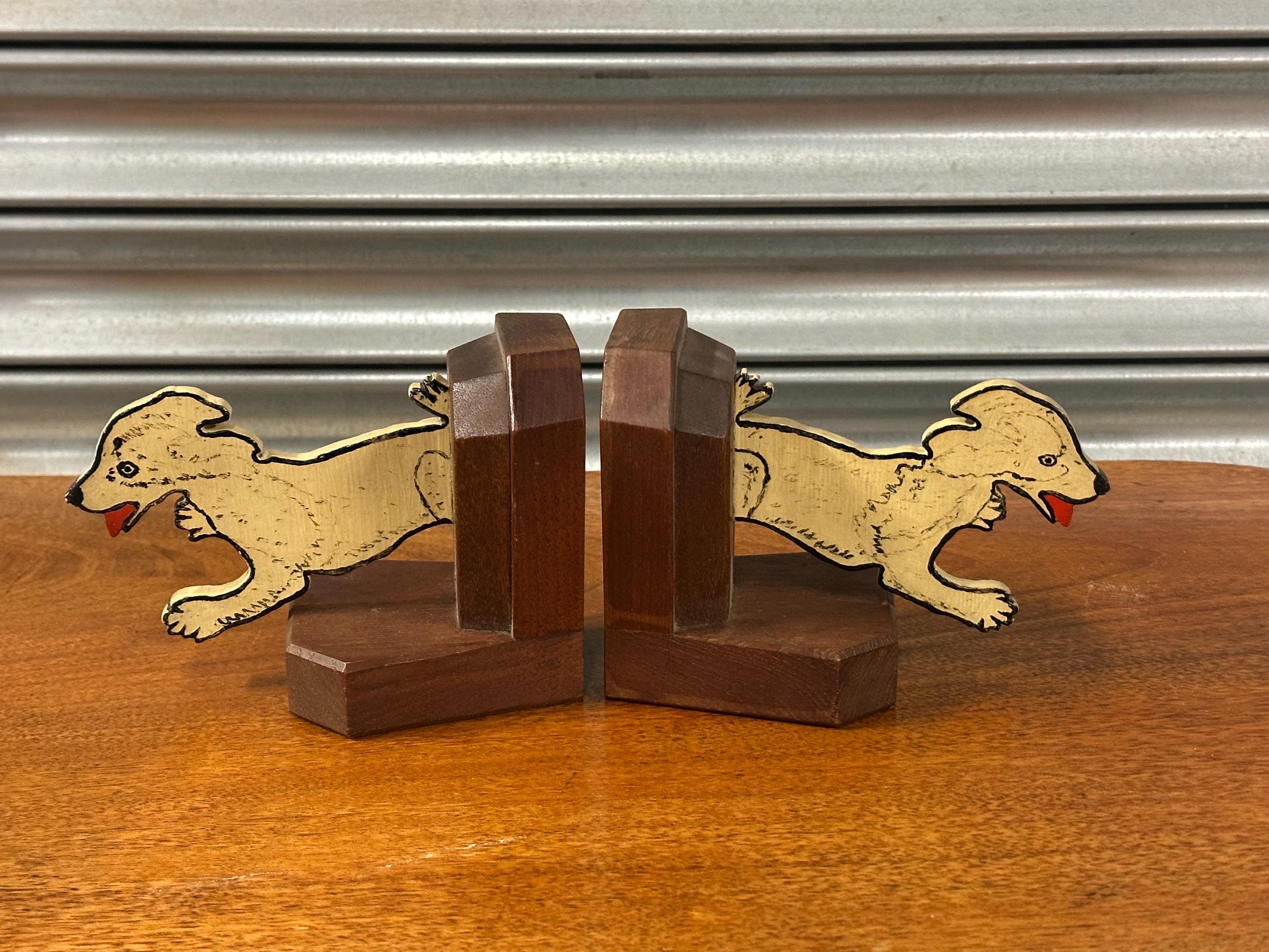 A delightful pair of vintage mid-century bookends crafted from solid teak and featuring charming painted dog figures. These characterful bookends depict playful cartoon-style dogs standing upright with raised paws and open red mouths, adding a whimsical touch to any bookshelf, desk, or study.