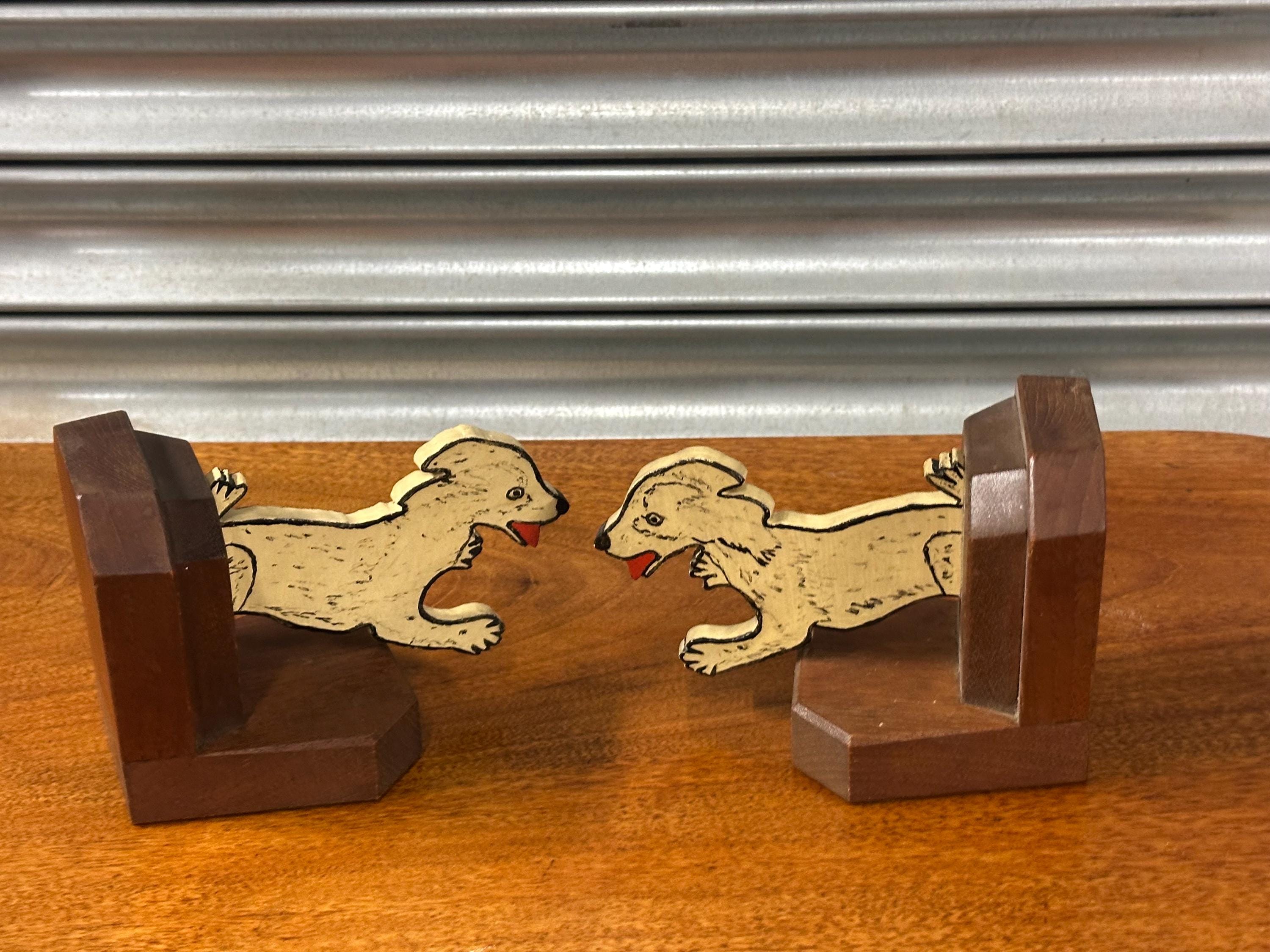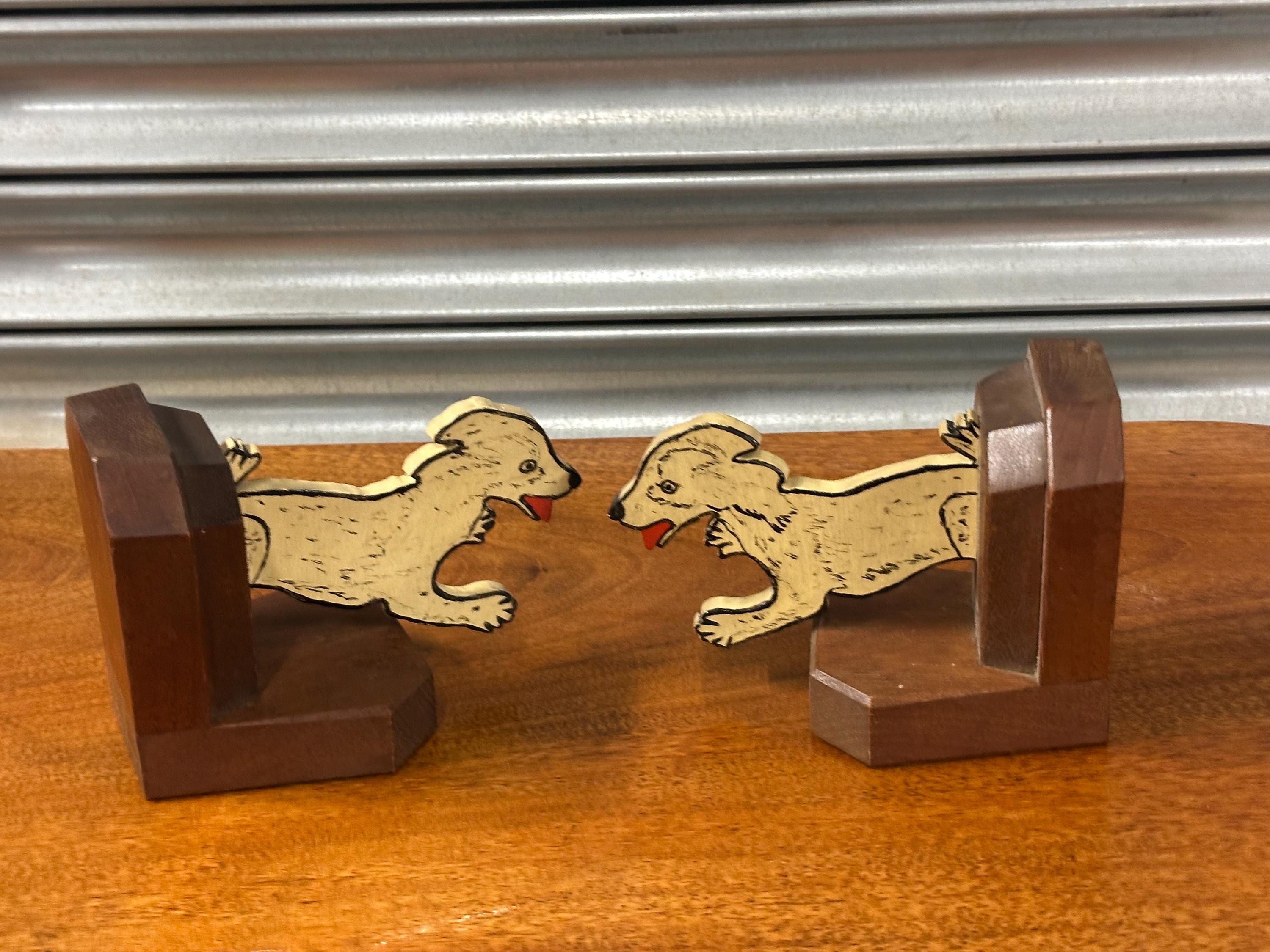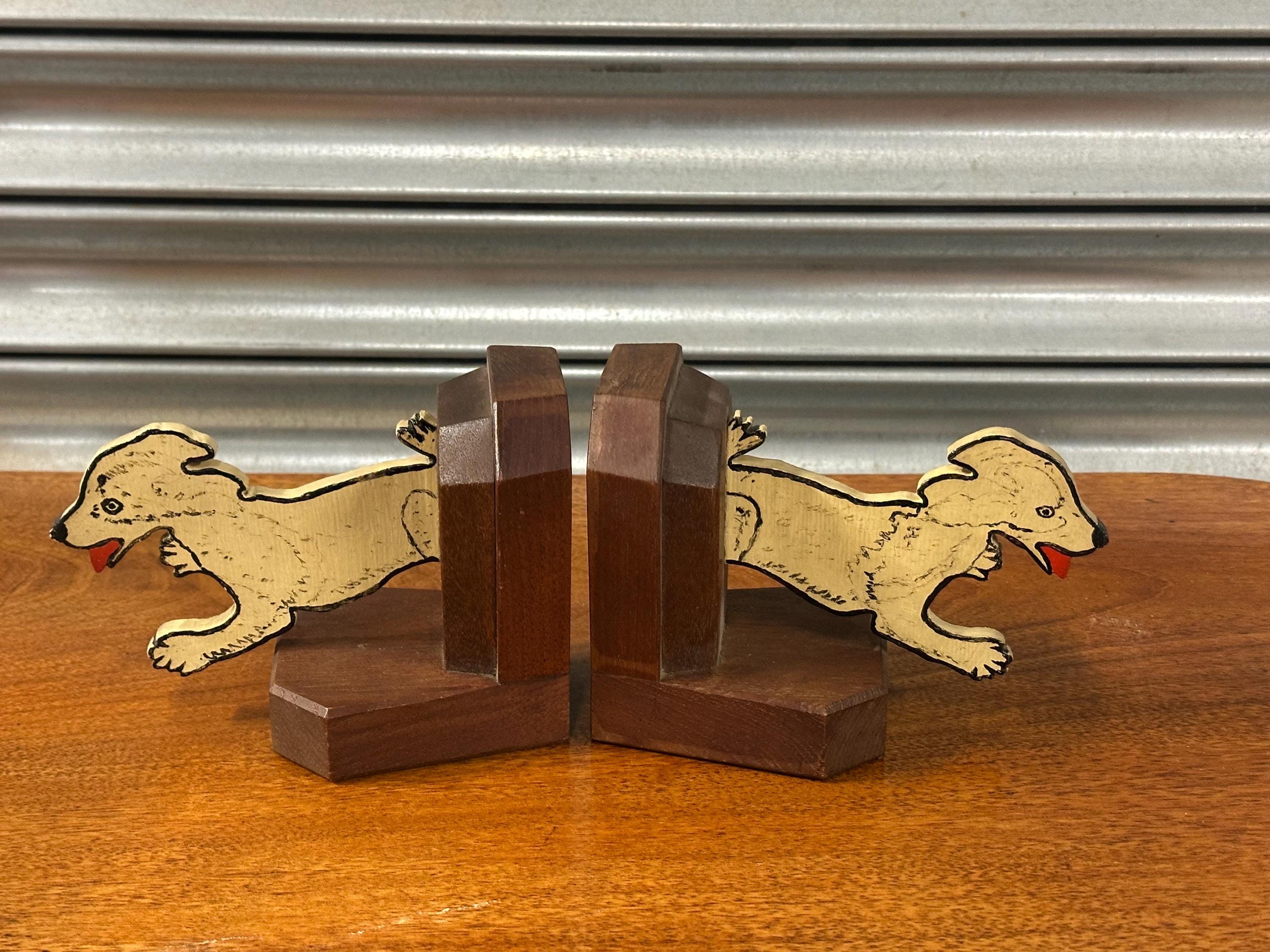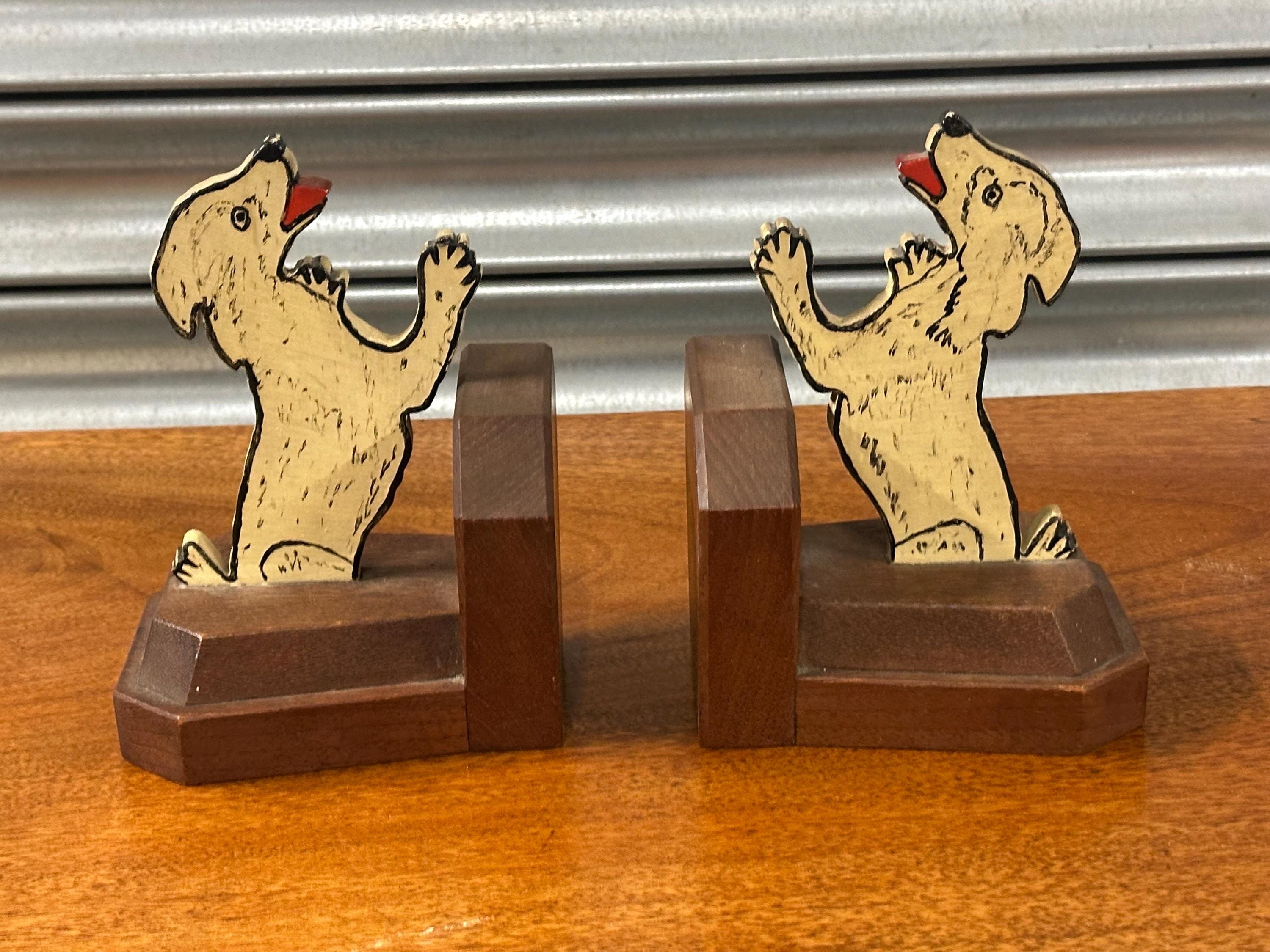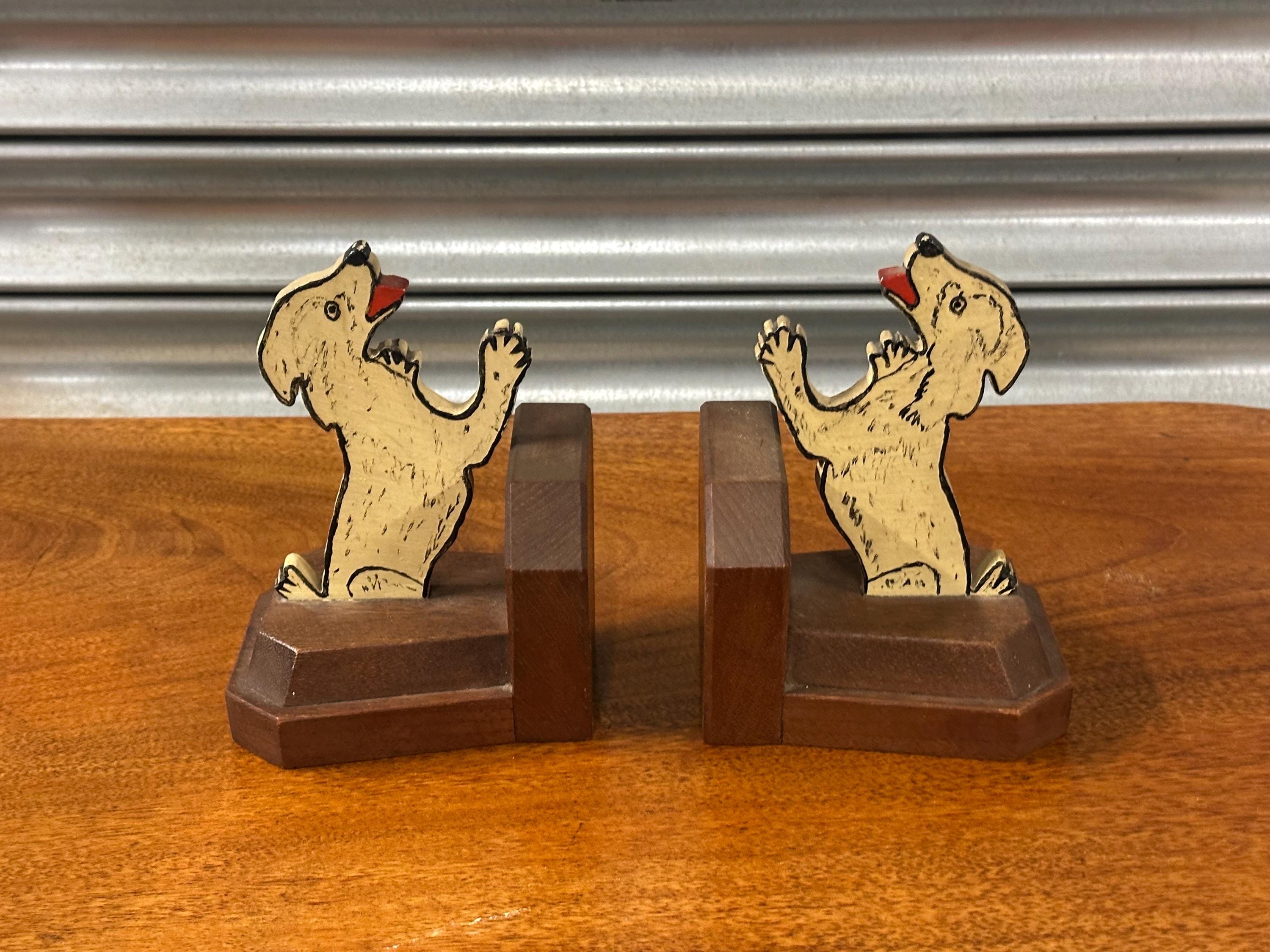 A delightful pair of vintage mid-century bookends crafted from solid teak and featuring charming painted dog figures. These characterful bookends depict playful cartoon-style dogs standing upright with raised paws and open red mouths, adding a whimsical touch to any bookshelf, desk, or study.